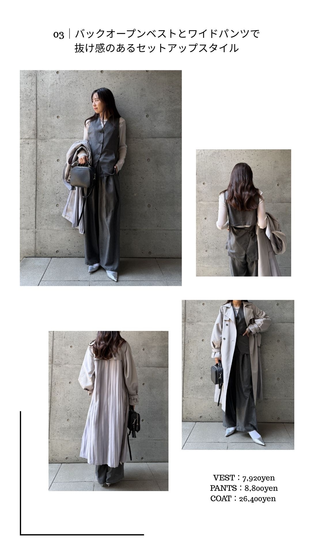 動くたびに美しく揺れるバックプリーツが印象的なロングトレンチコートを合わせれば、