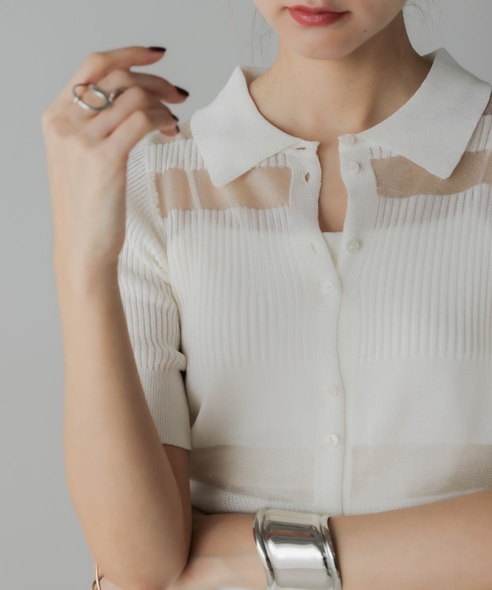表情の異なる糸で仕立てたシアーポロニット。コンパクトなサイズ感が女性らしい印象に。透け感があるので、インナーを合わせていただくことをおすすめします。上品なルックスでオフィスからOFFの日まで使いまわせます。