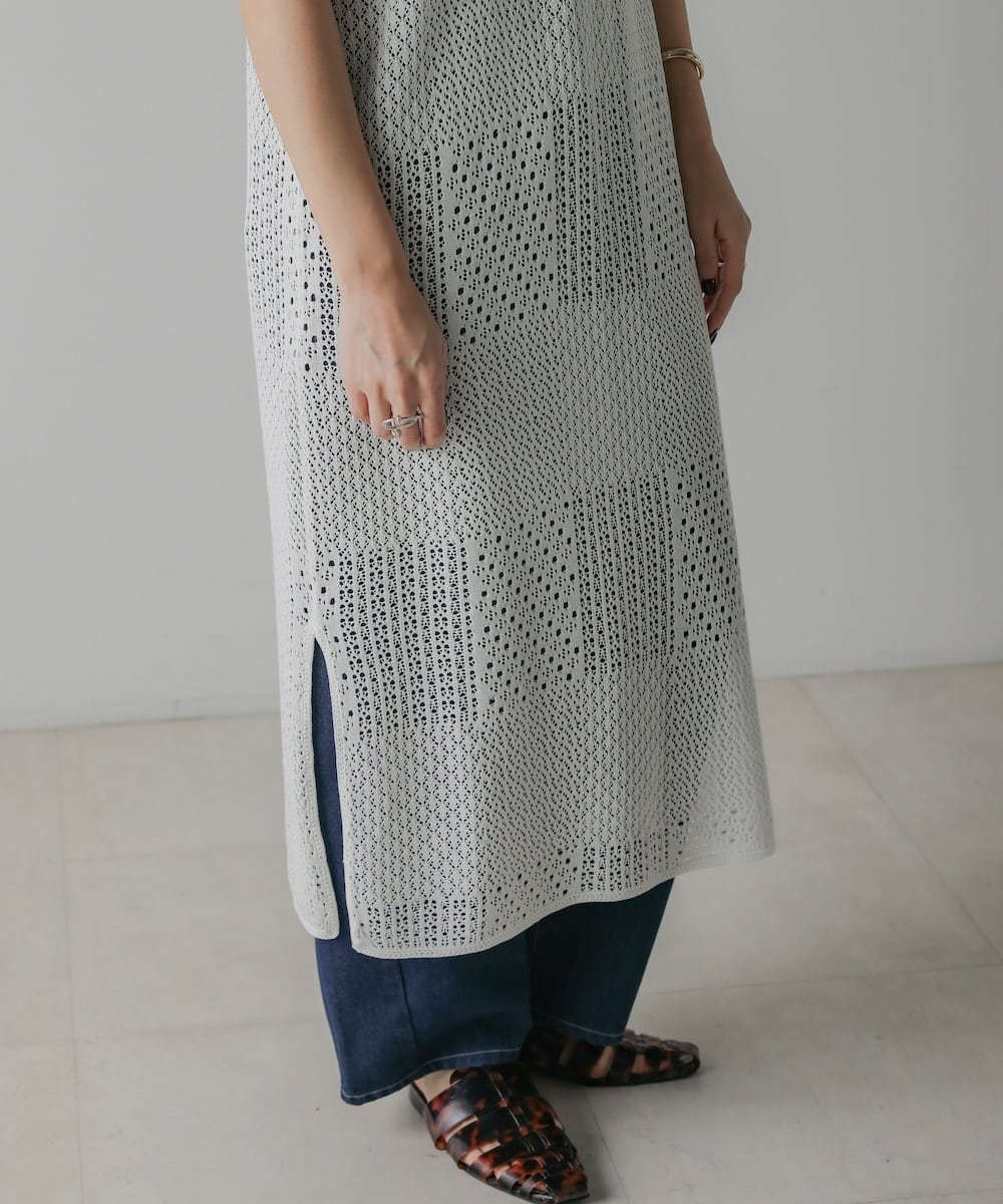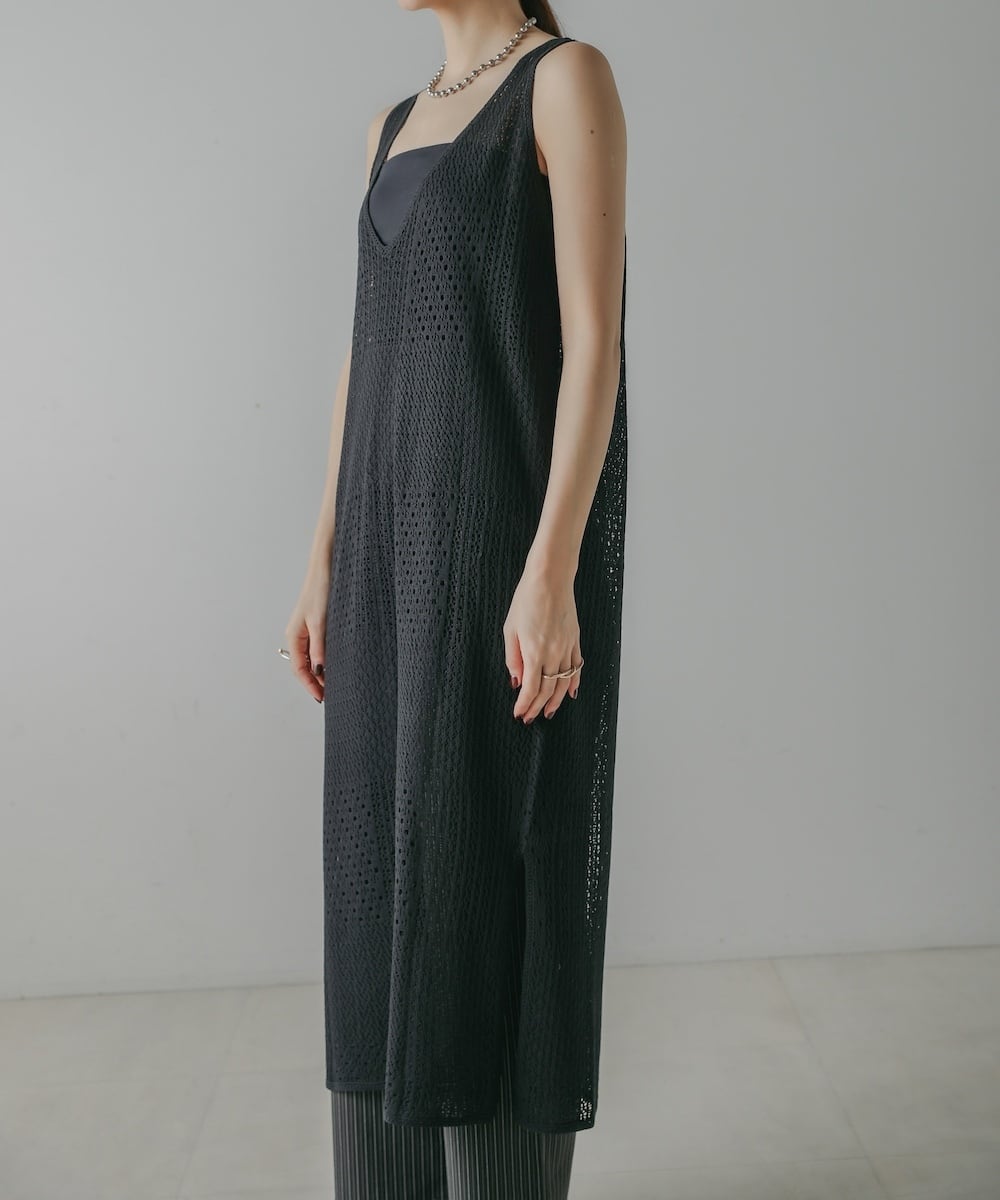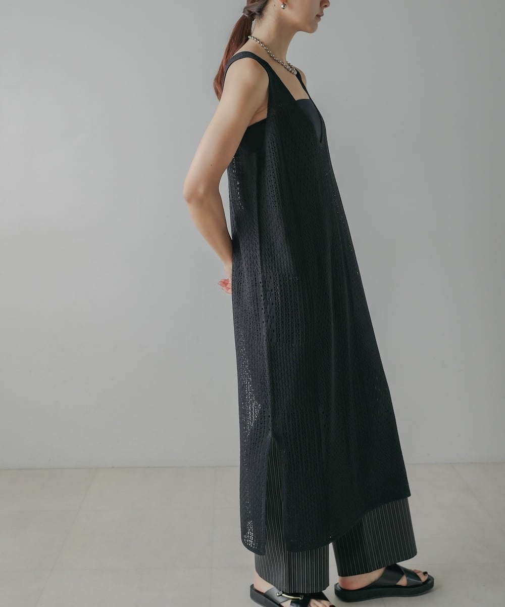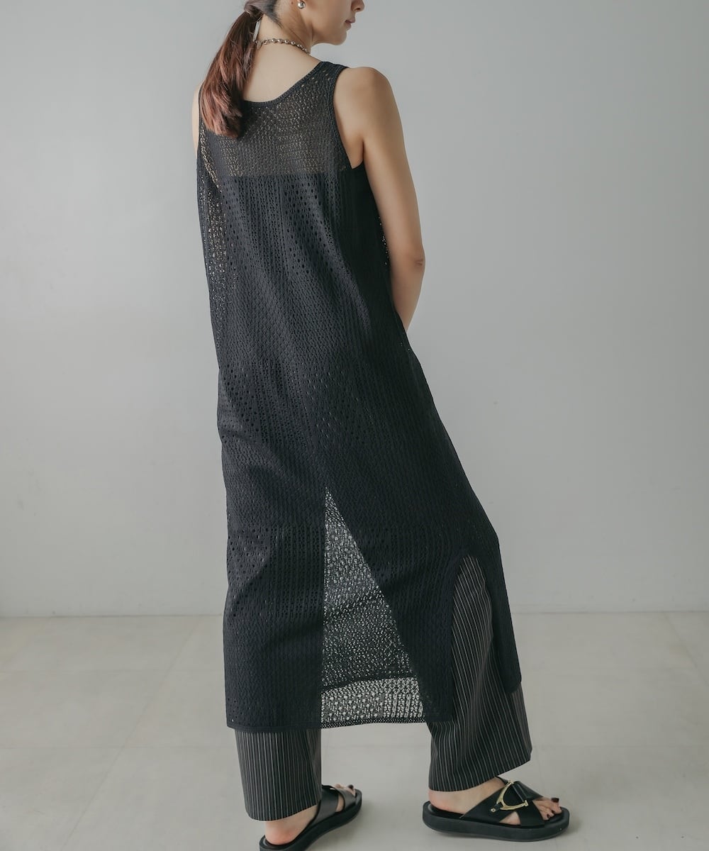 前後2WAYでお使いいただけるワンピース。ブロック型で入ったシアーの素材がラフな印象もありつつ、ボディラインを綺麗に見せ女度を上げてくれる1枚。ストレッチ&サイドスリットデザインで足捌きもしやすく楽ちんな着心地です。透け感を活かした様々なレイヤードスタイルをお楽しみいただけます。