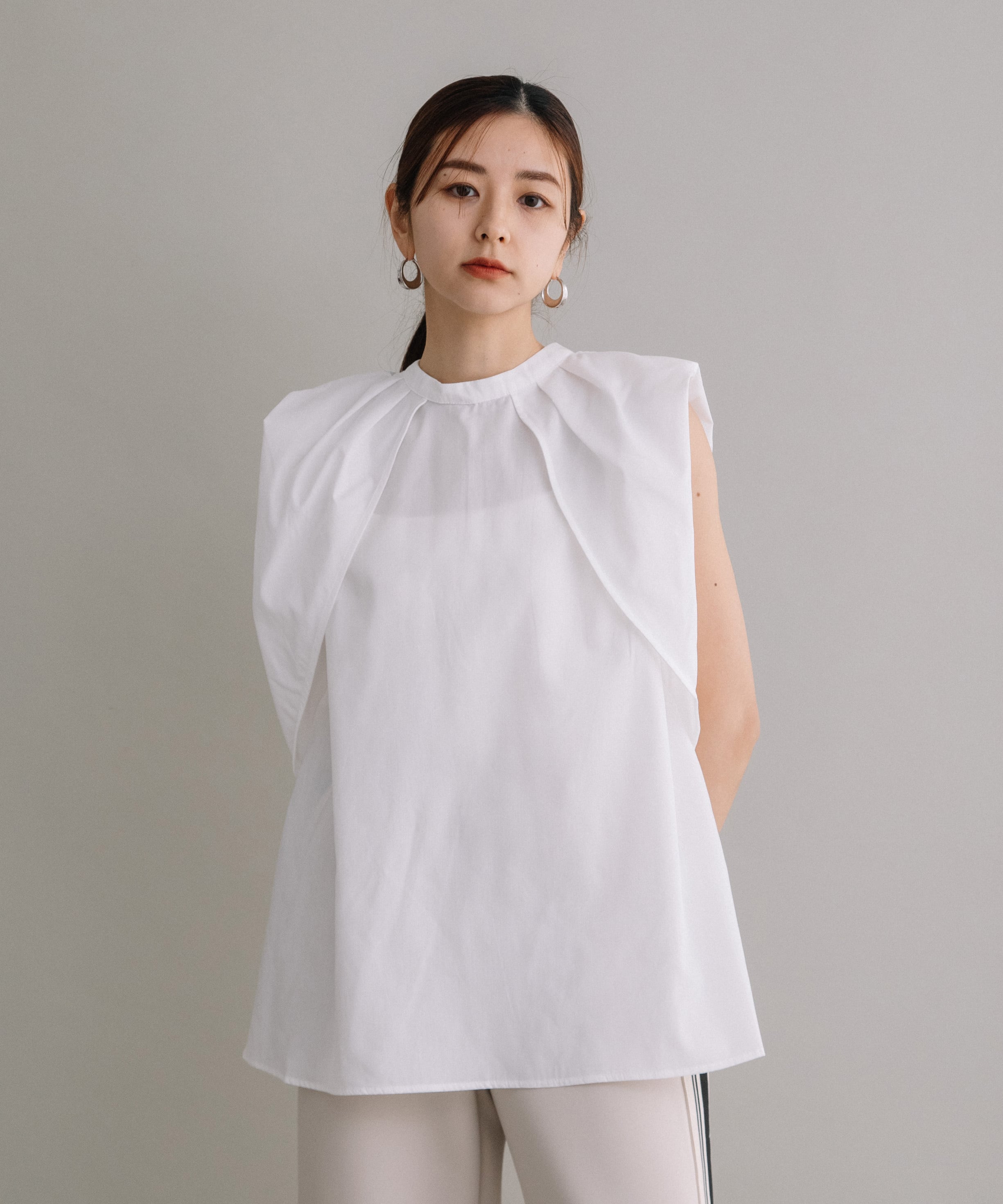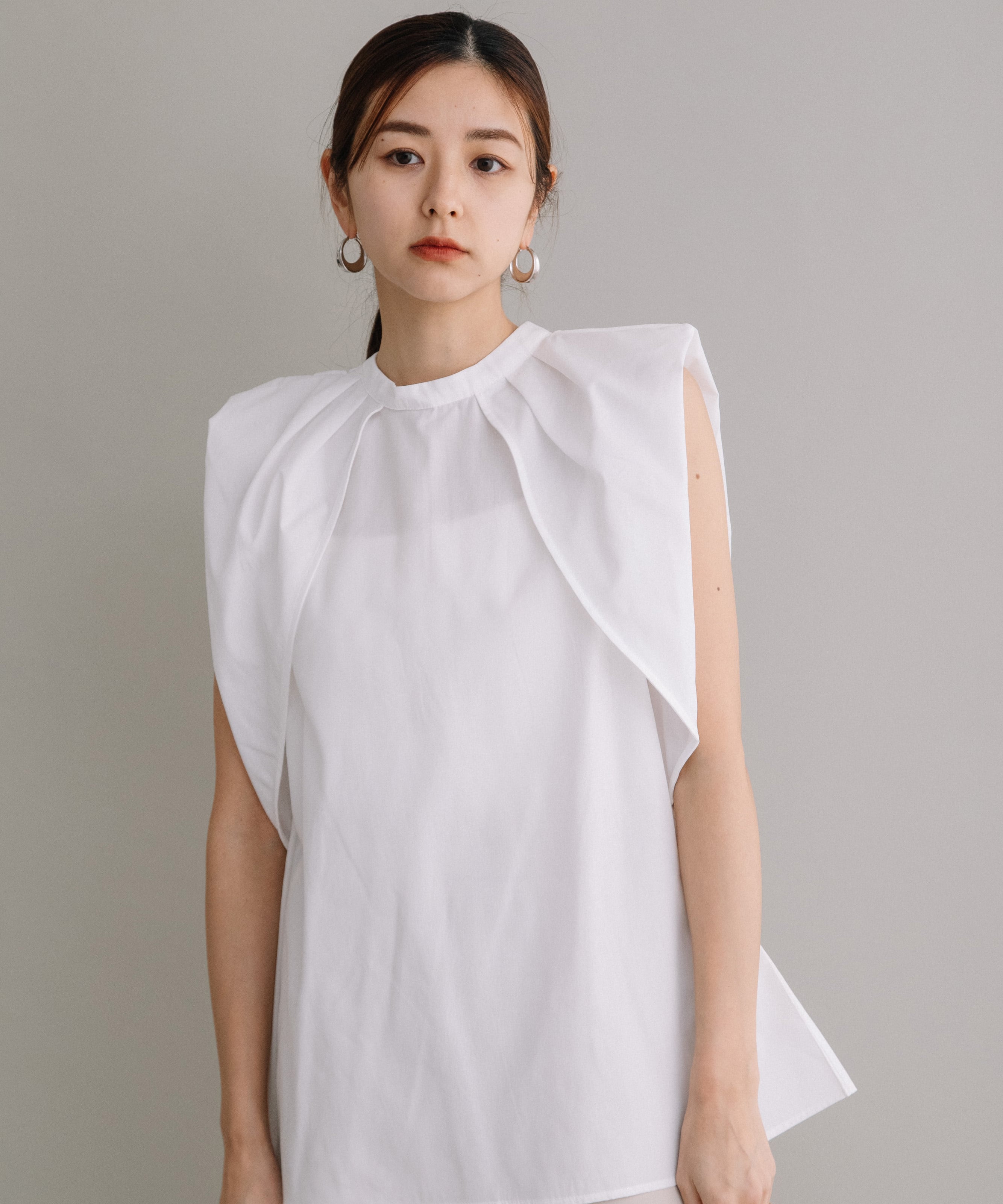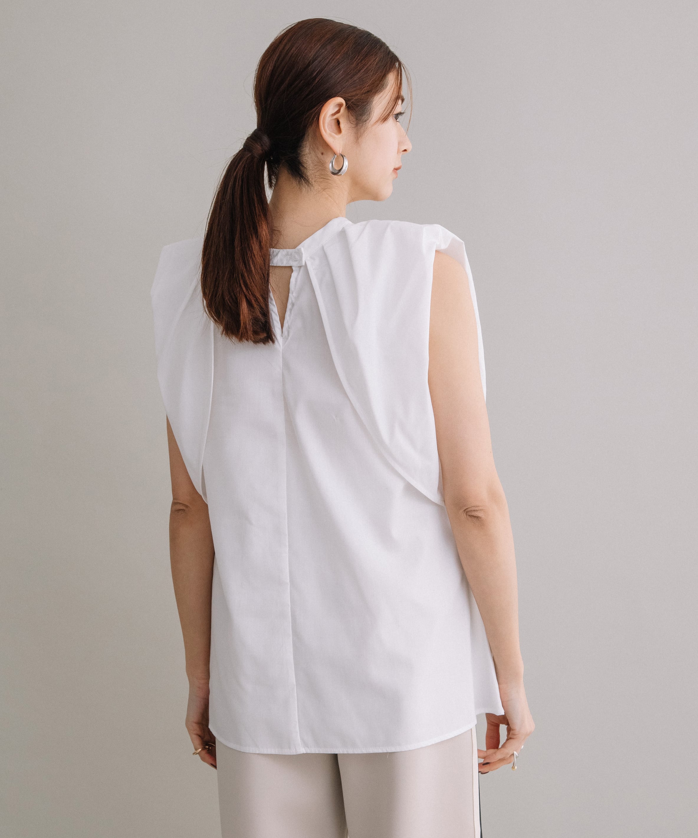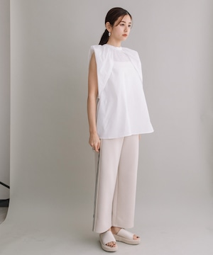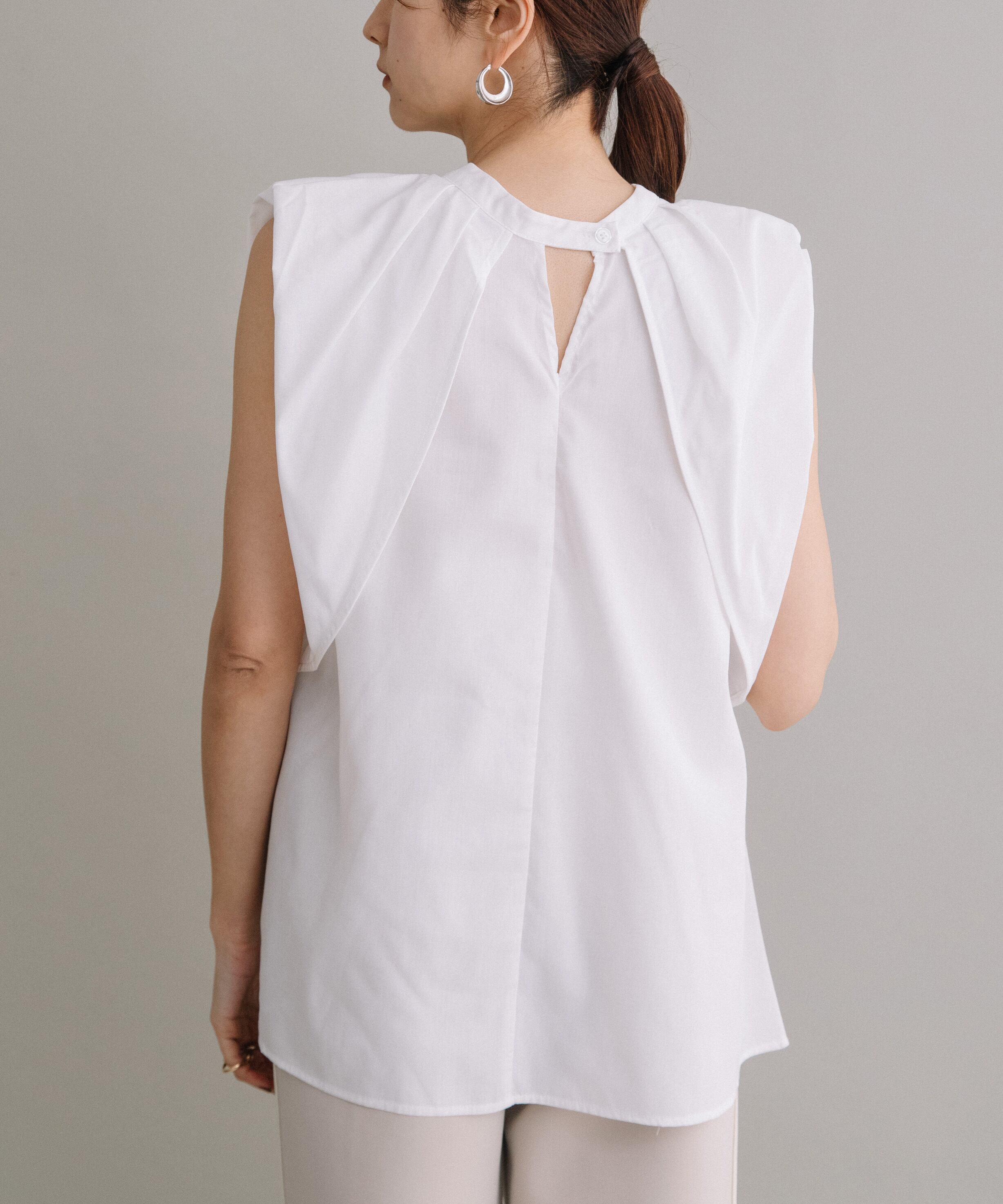 前後2WAYで着用可能なブラウスです。首元にギャザーとワンポイントのボタンデザインを施すことで、シンプルながらも一癖あるお洒落な1枚です。ハリ感のある素材を使用しているので、タックが綺麗に入りきちんと感も演出してくれます。長すぎず短すぎずな丈感なので、気分やボトムスによってイン・アウト両方お楽しみいただけます。