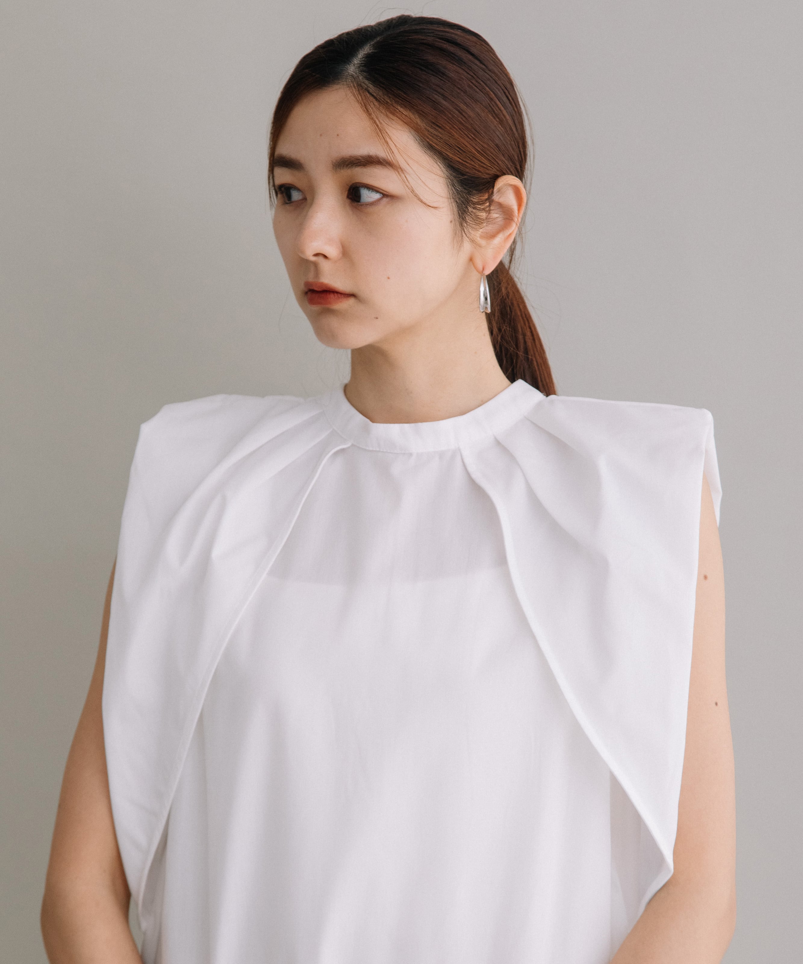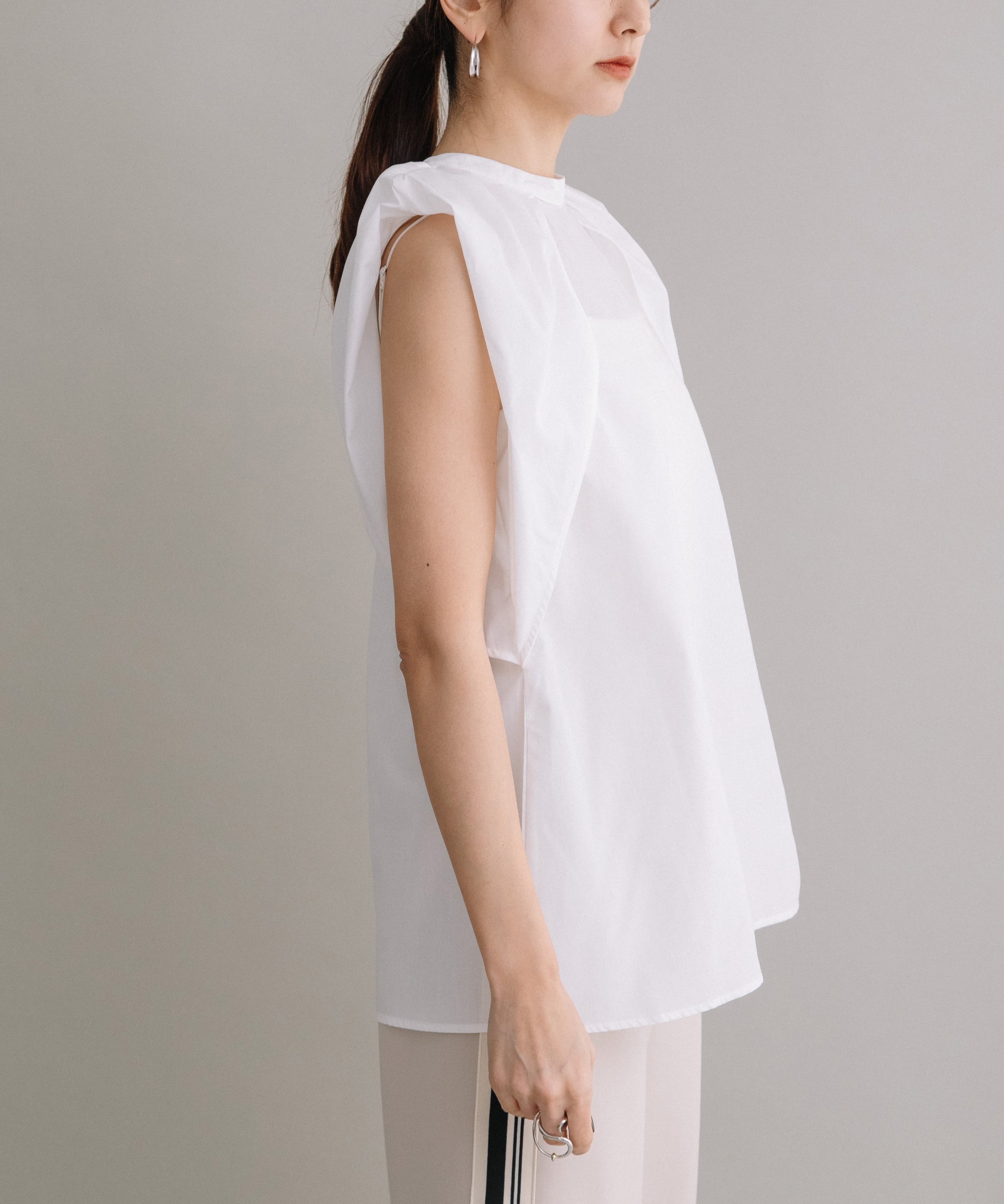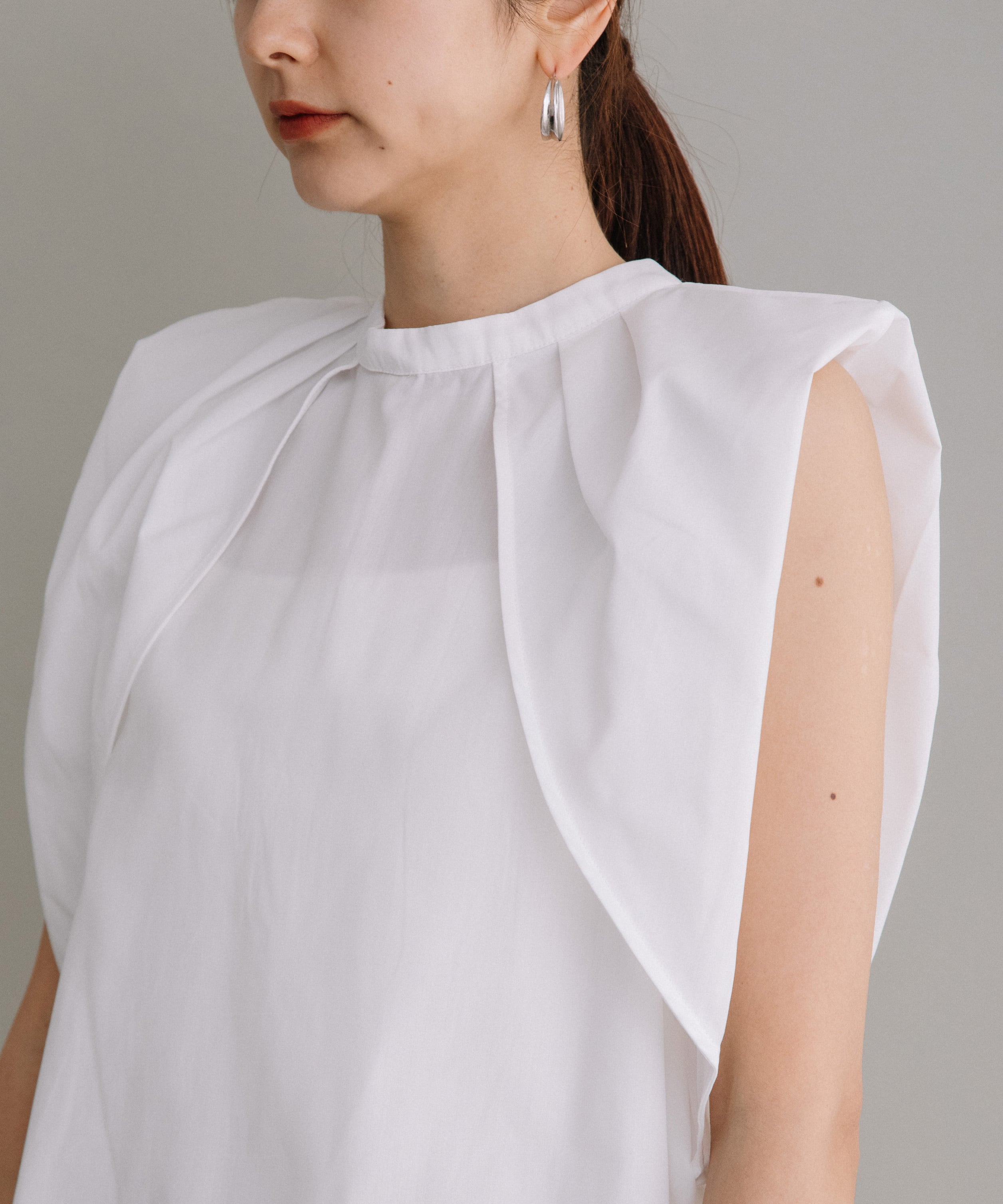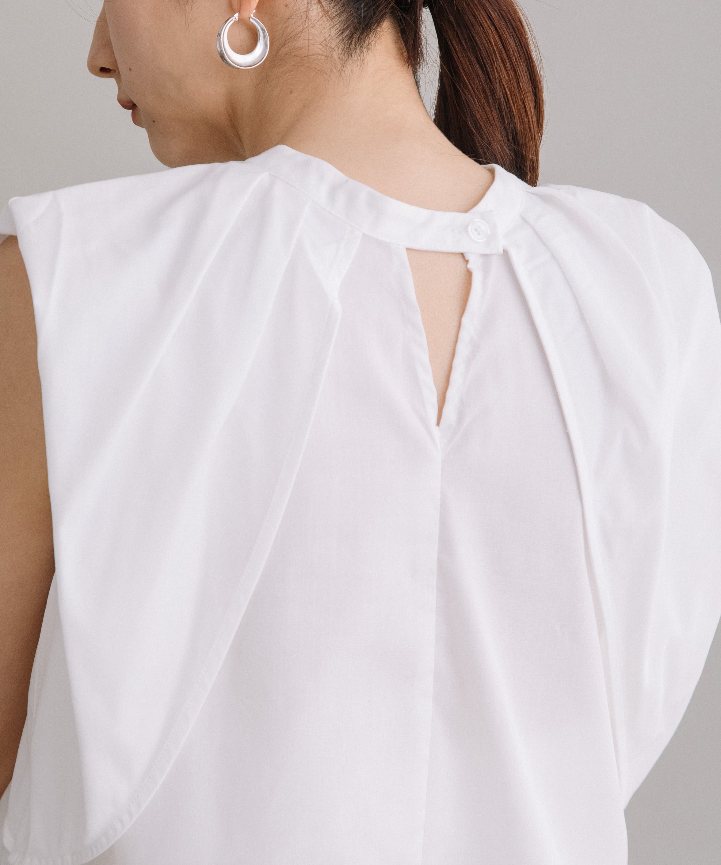 前後2WAYで着用可能なブラウスです。首元にギャザーとワンポイントのボタンデザインを施すことで、シンプルながらも一癖あるお洒落な1枚です。ハリ感のある素材を使用しているので、タックが綺麗に入りきちんと感も演出してくれます。長すぎず短すぎずな丈感なので、気分やボトムスによってイン・アウト両方お楽しみいただけます。