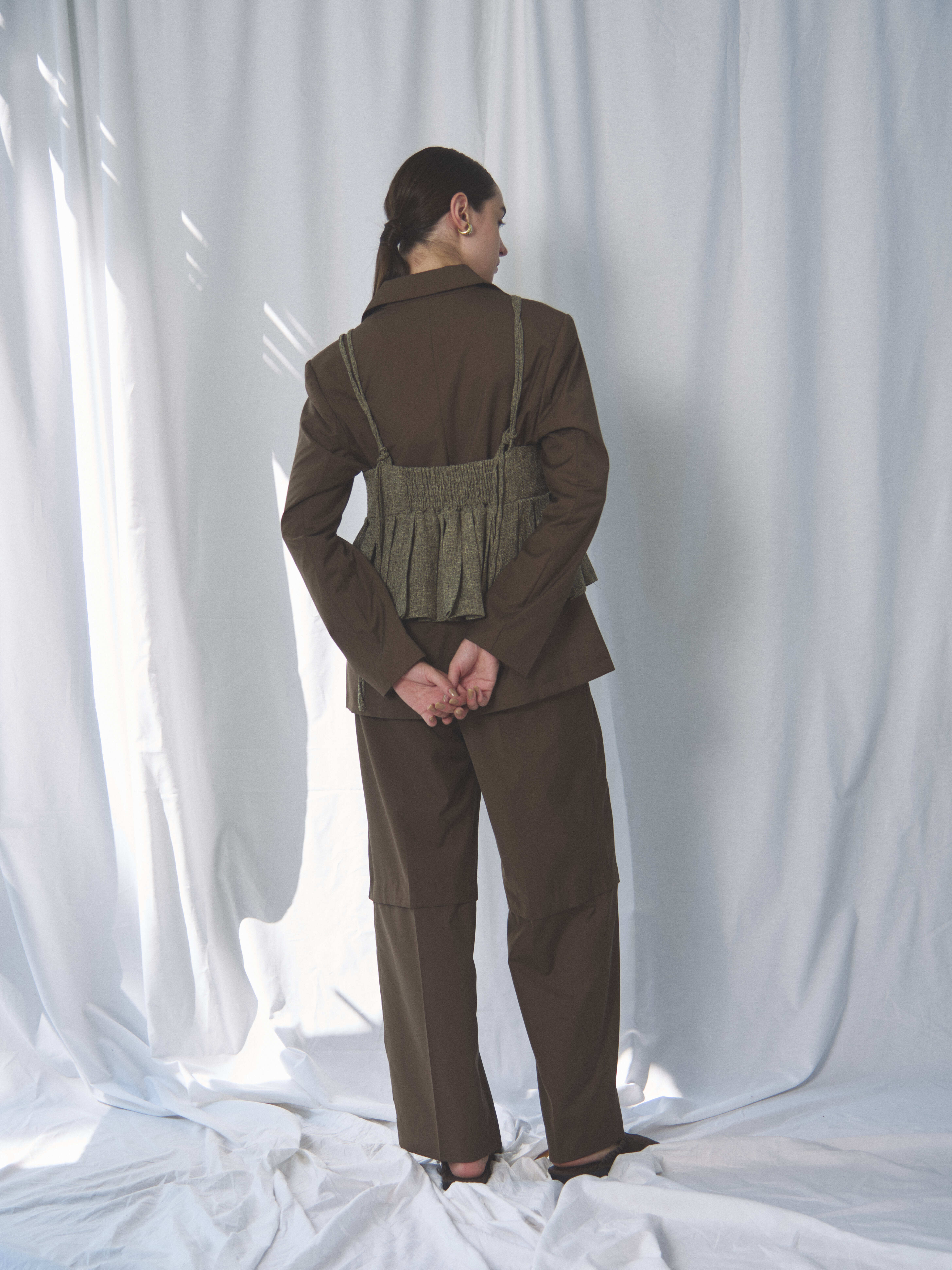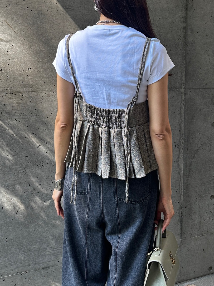プリーツ部分が綺麗なフレアシルエットを描き、立体的なシルエットのキャミビスチェ。トレンドライクな細めのダブルショルダーが華奢見えし、結び目を変えることで長さ調整も可能です。暑い季節にはキャミソールと合わせて一枚で、春秋は幅広いアイテムとのレイヤードスタイルで、ロングシーズンお使いいただけるアイテムです。