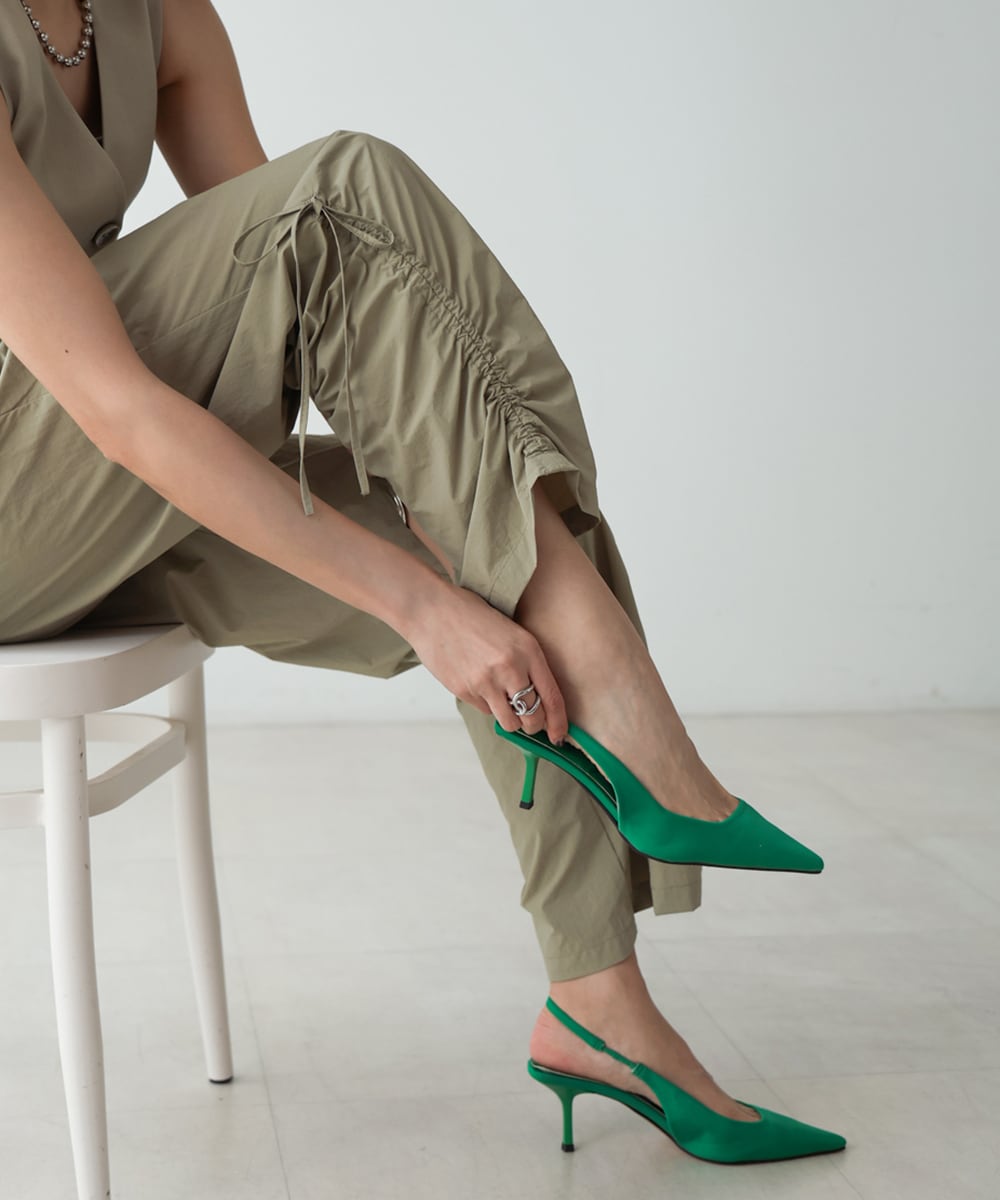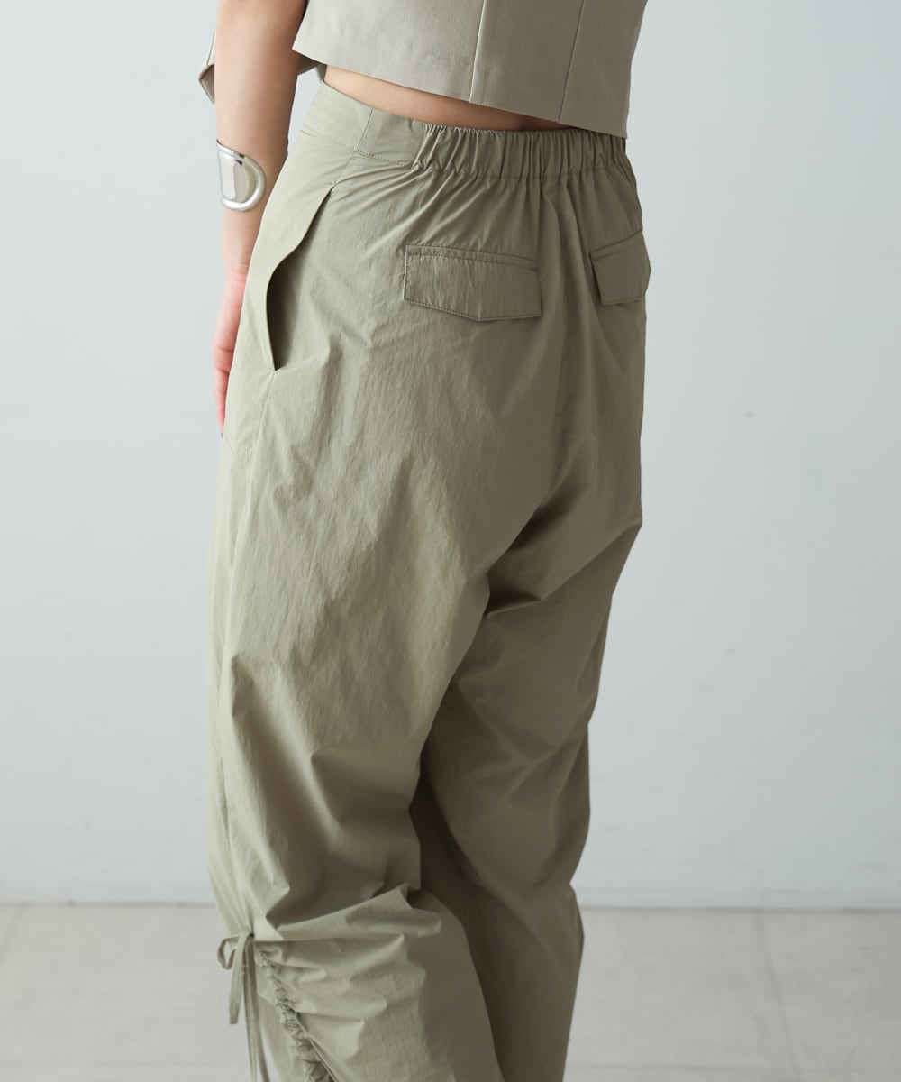 裾のドロストデザインがアクセントの効いた、主役級ミリタリーパンツ。結んだり伸ばしたりしてお好みのシルエットでの着用が可能な為、トップスや気分によってアレンジをお楽しみいただけます。程よいハリ感でカジュアルながらも、どこか女性らしさのあるアイテムです。