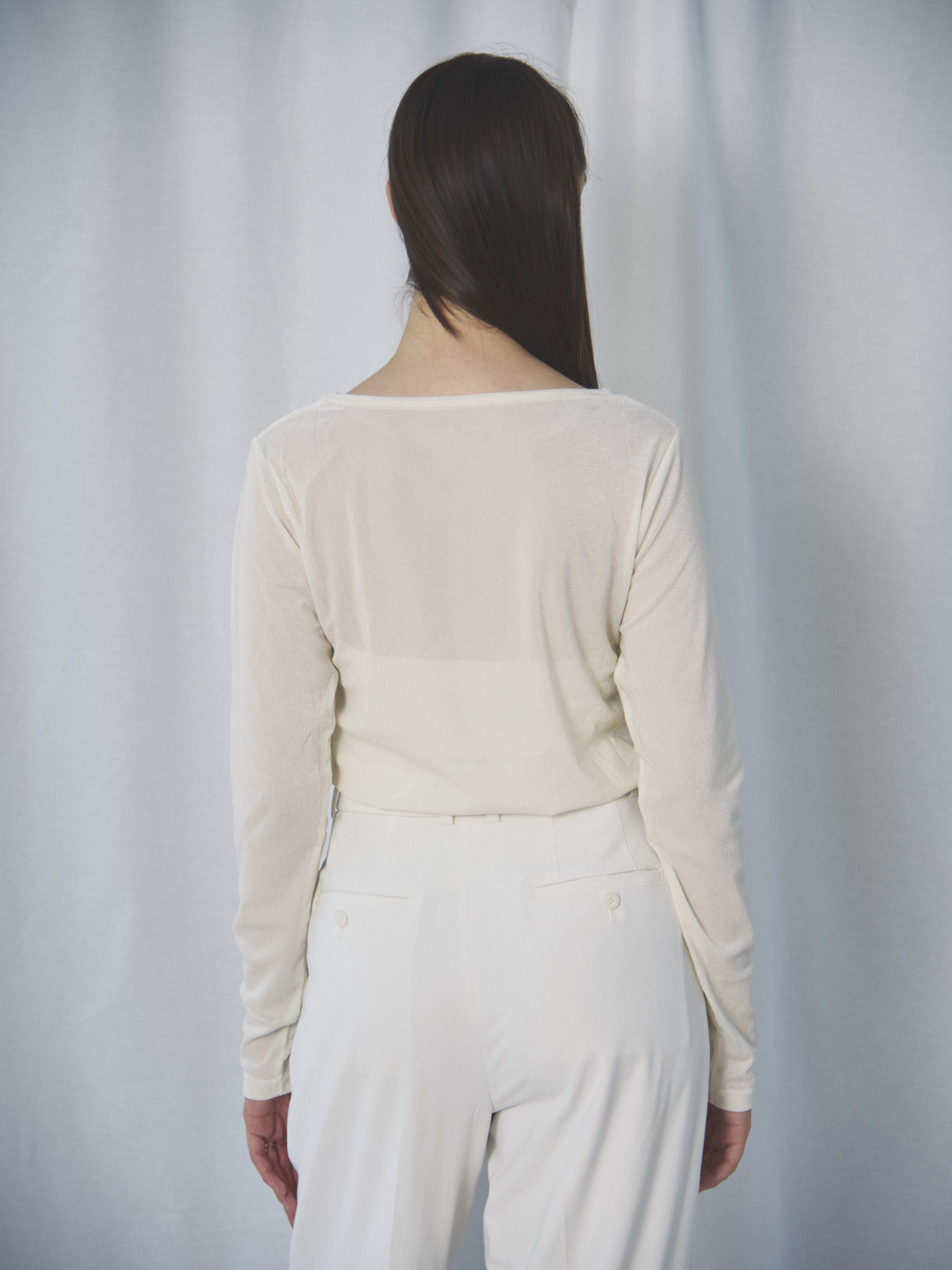 シアーとベロアの生地を合わせた、上品ながらも抜け感のあるデザイントップス。一枚着としてはもちろん、オーバーオールやキャミソールのインナーとしてもちょうど良いサイズ感で、着るだけでシーズンムード高まるアイテムは一枚持っておきたいところ。マットな光沢感で落ち着いた華やかさがあり、オケージョンシーンやフォーマルシーンなどでも活躍します。