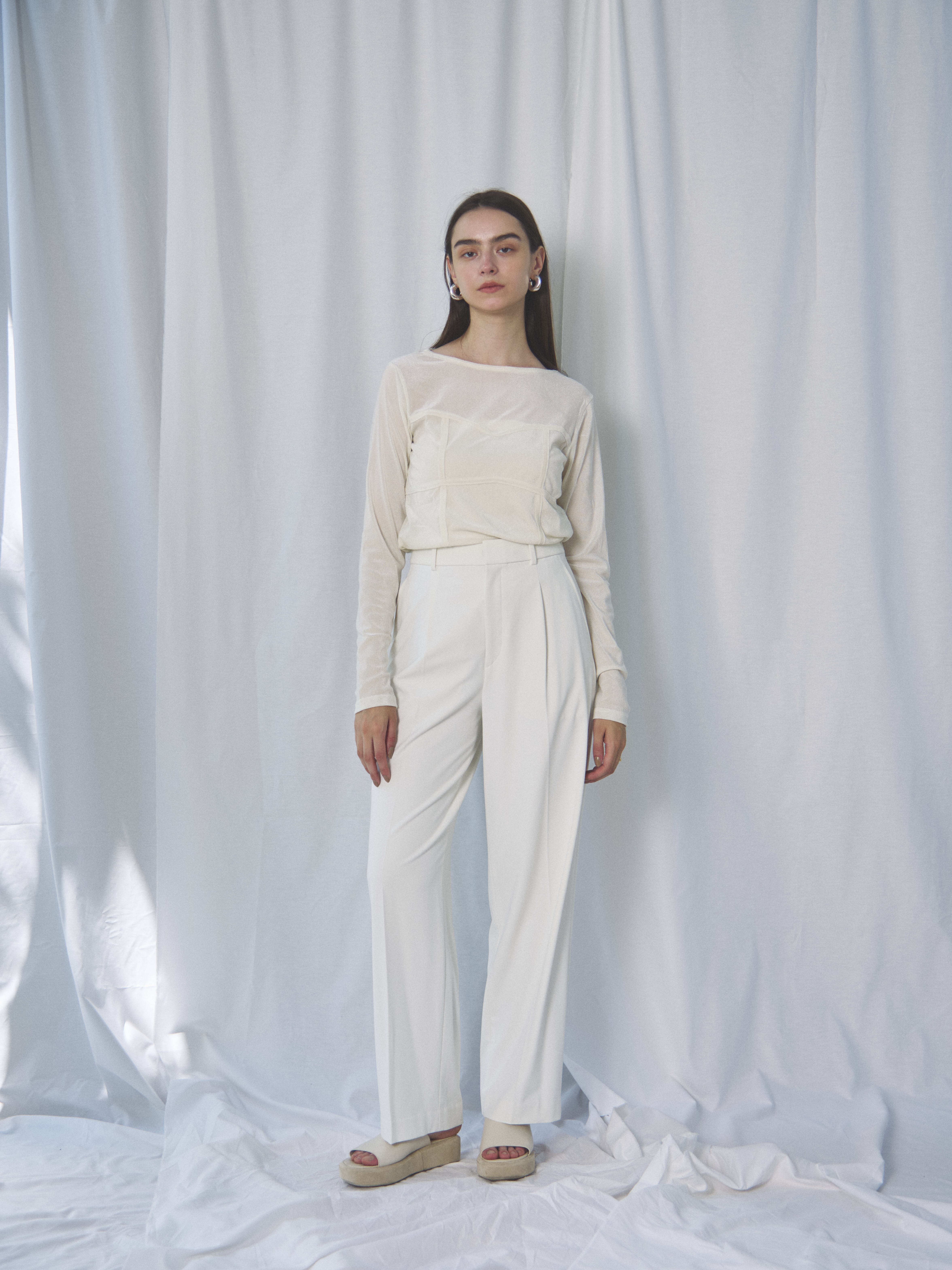 ビスチェをドッキングしたような表情あるデザインで、一枚での着用でも華やかさがあります。ベストやオーバーオール、キャミワンピなどレイヤードコーデのインナーとしても◎程よくタイトなサイズ感なので、ボリュームのあるスカートやワイドパンツとの相性も抜群です。
