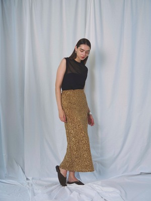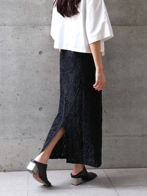 手書きのような刺繍ラインが印象的なベロアスカート。光の加減で陰影が生まれ、表情豊かな質感に仕上がっています。ベロア特有のドレープが生み出す上品なシルエットながら、伸縮性があり履き心地の良さが嬉しいポイントです。ウエストはゴム仕様で裏地付き。裾のほんのりとした透け感が、まだ暑さの残る晩夏にもぴったりなアイテムです。