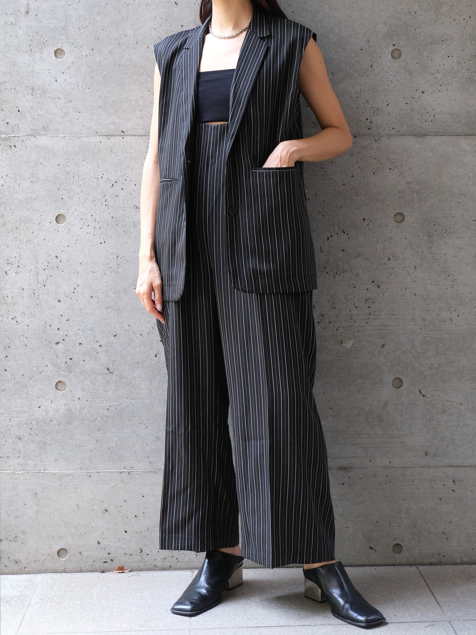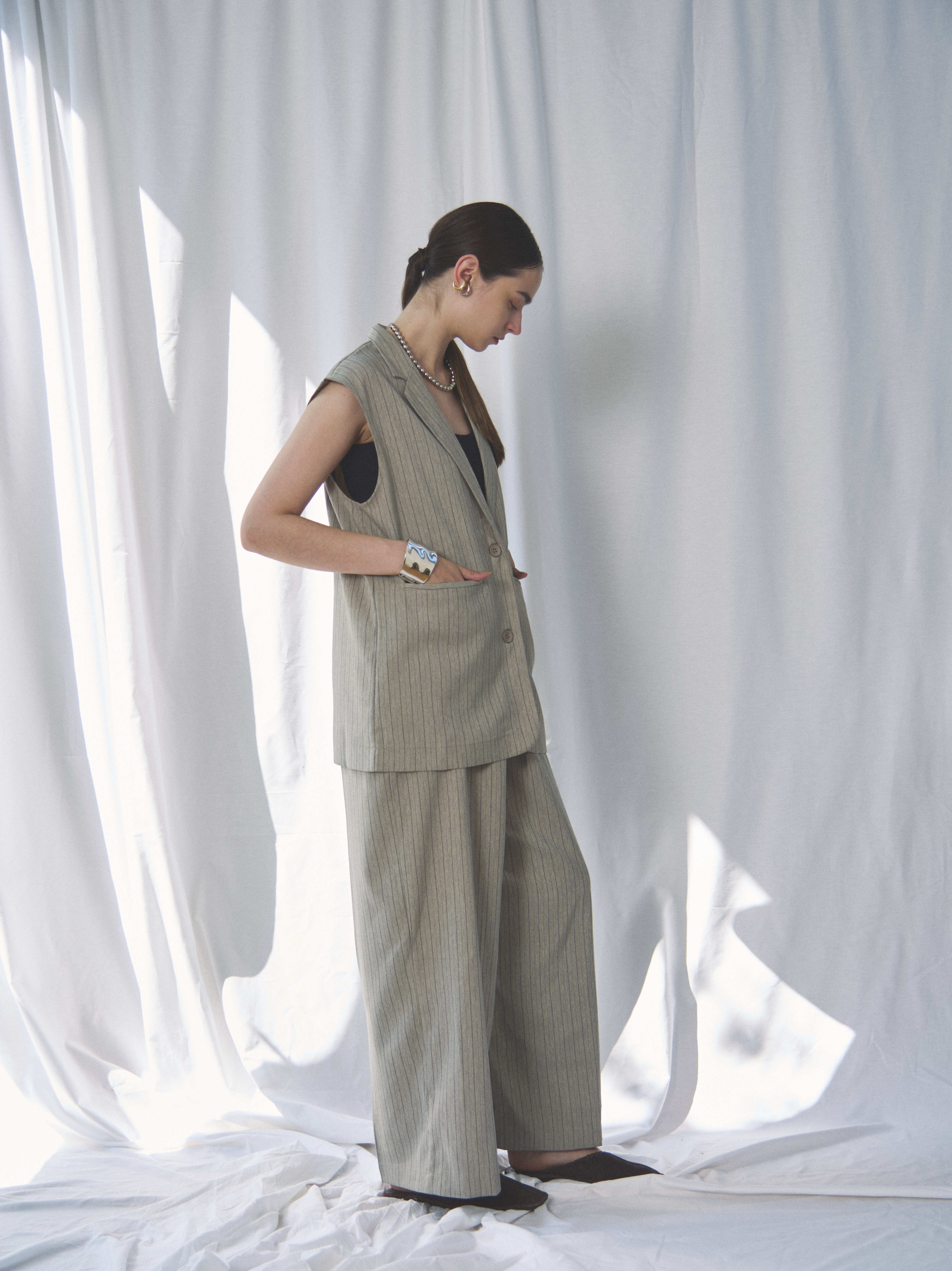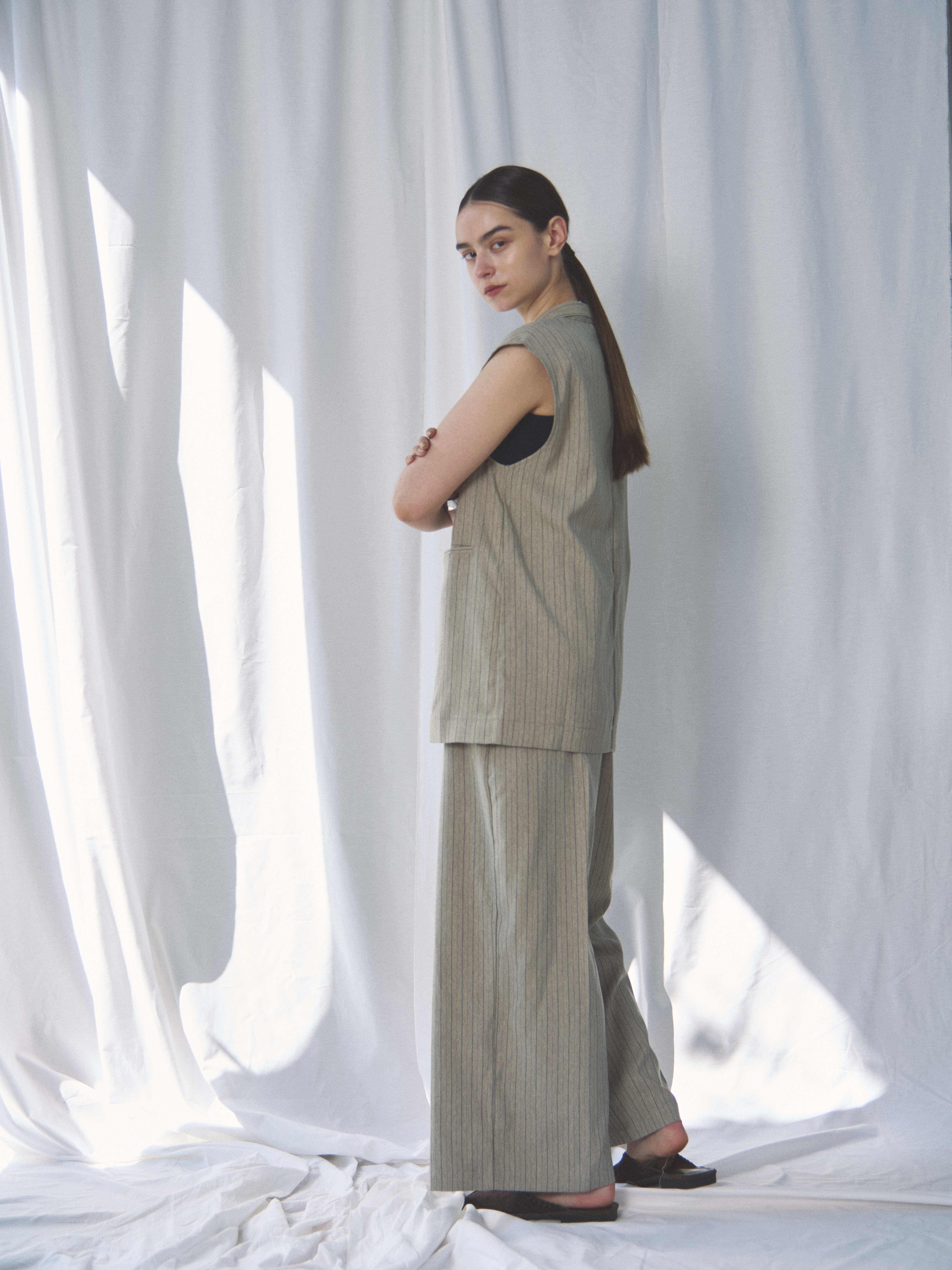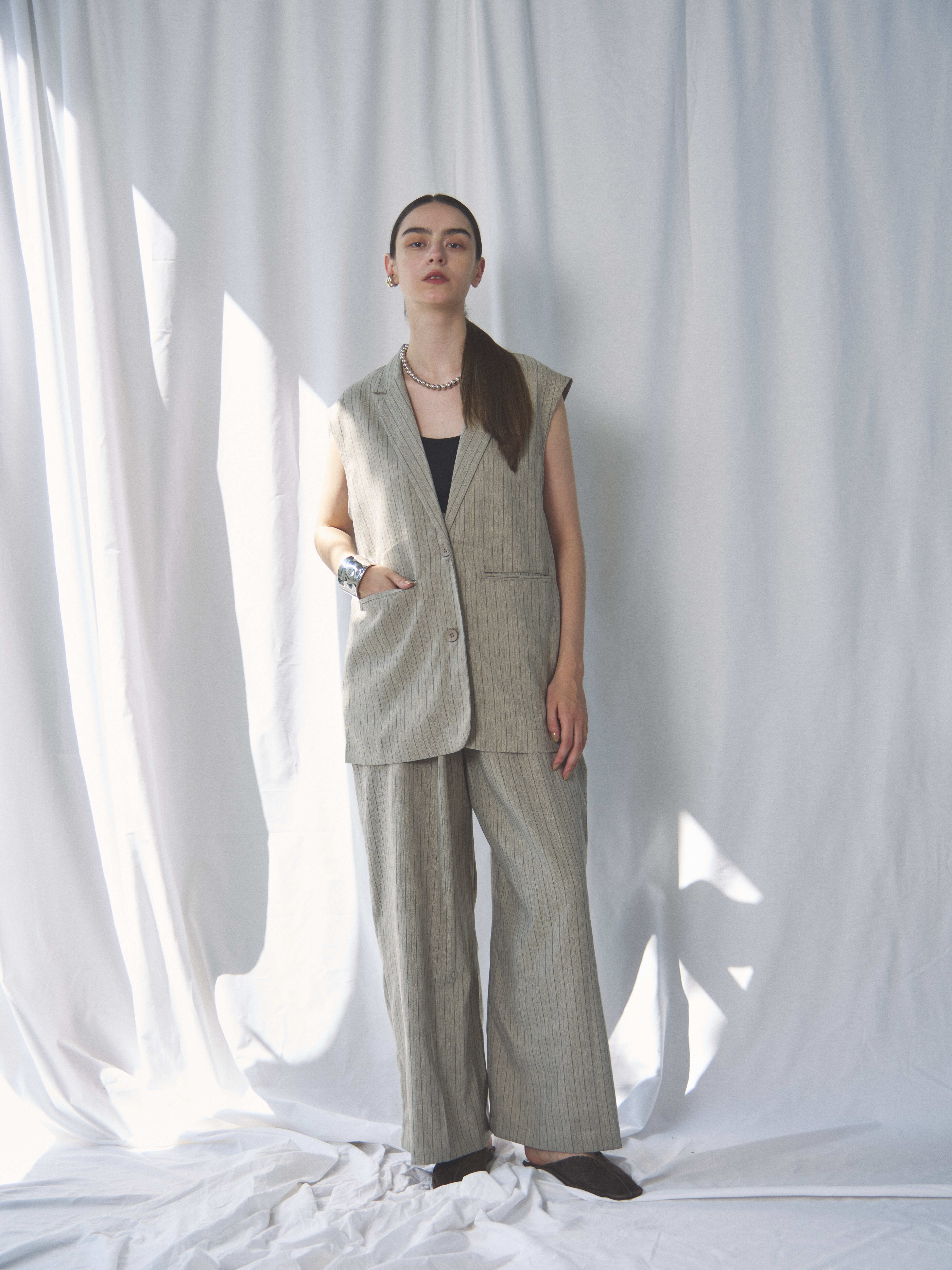 同素材のHERRINGBONE STRIPED SLEEVELESS JACKET(ヘリンボーンストライプスリーブレスジャケット)【7533217】とのセットアップ着用がおすすめ。夏はキャミソールやタンクトップ、Tシャツ合わせで、秋冬はシアートップスやリブニット、タートルネック合わせなど、オールシーズンお楽しみいただけます。