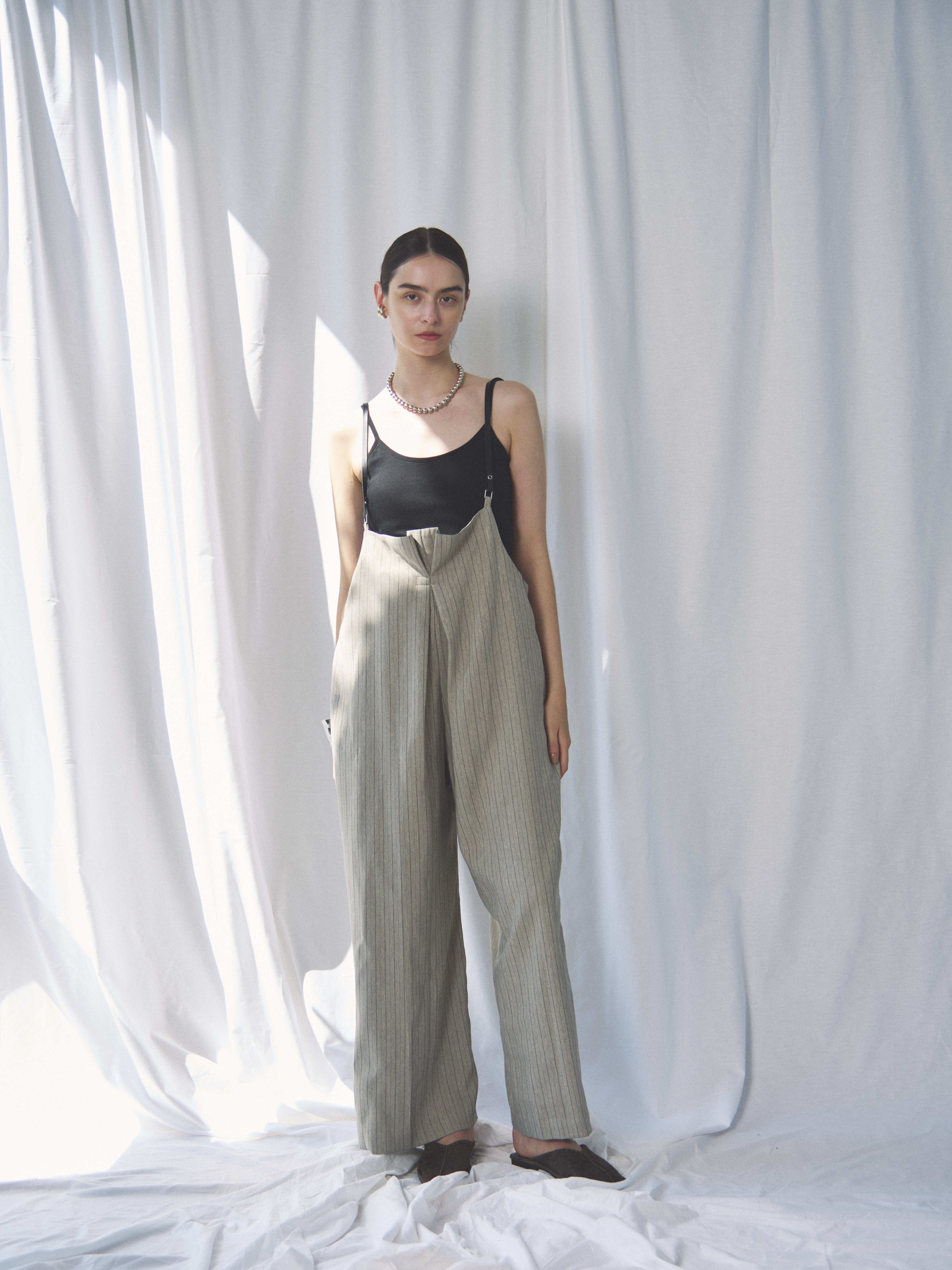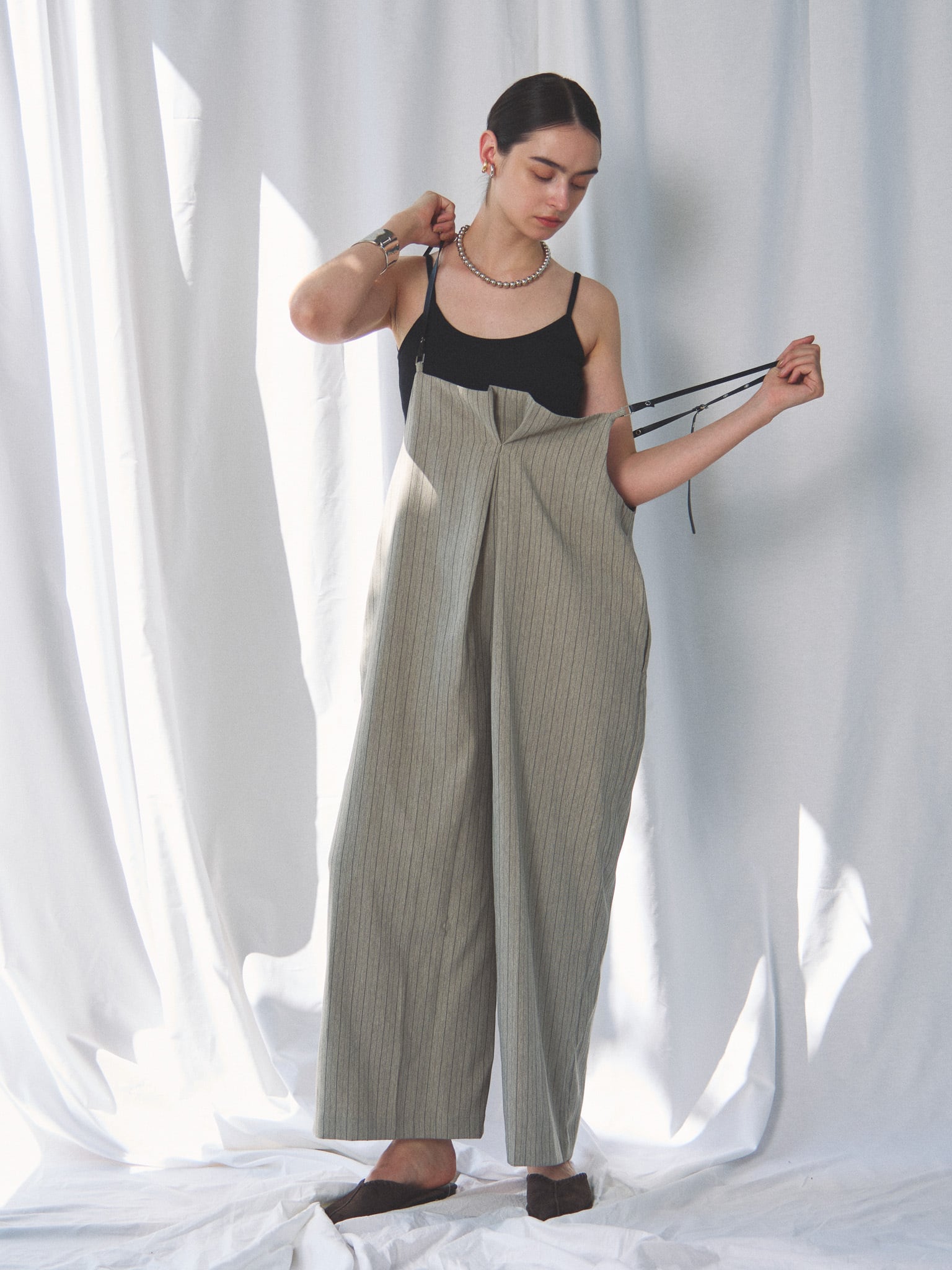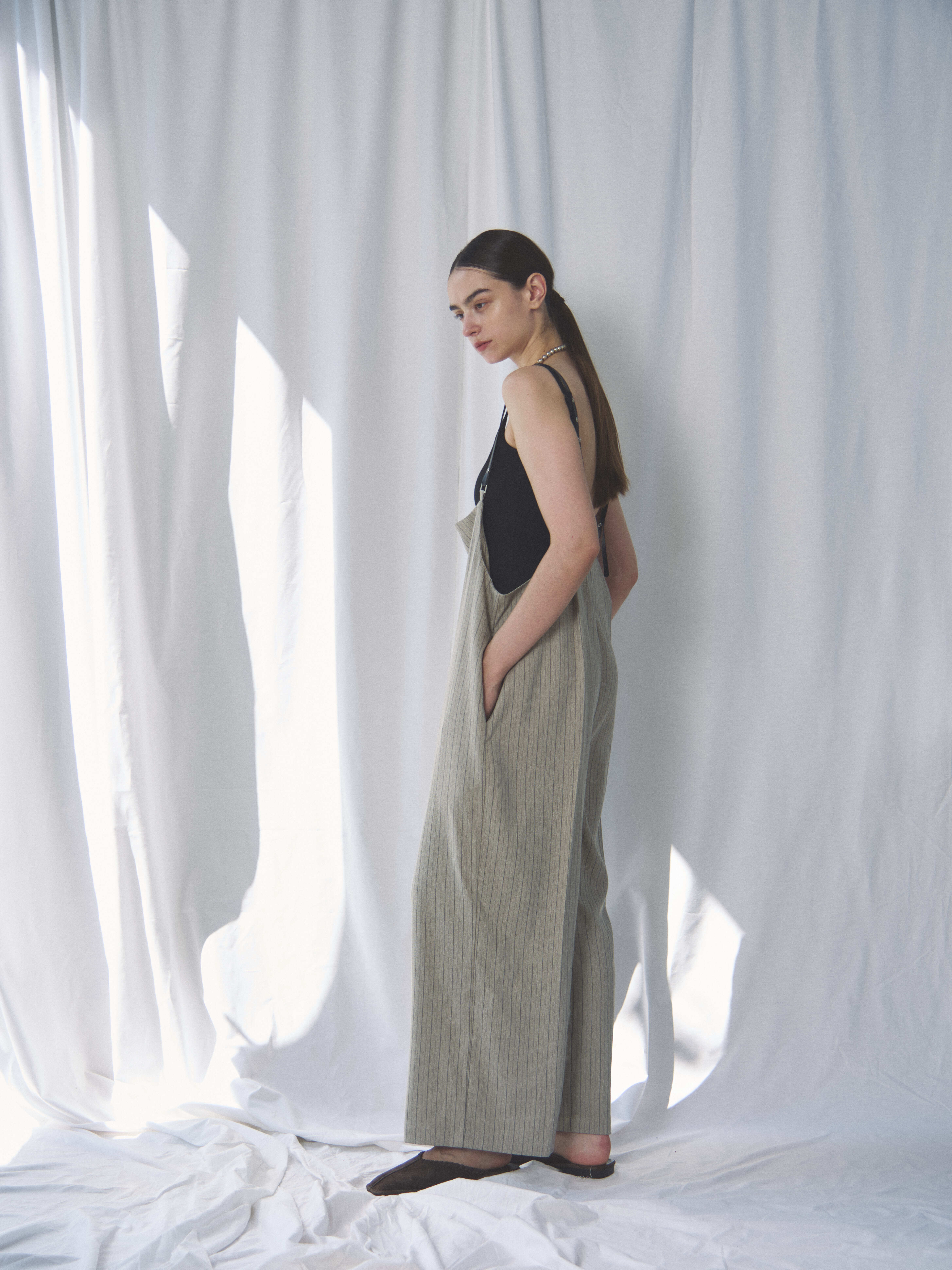 マニッシュな印象のヘリンボーンストライプ柄をあしらったサロペット。ワイドシルエットで体のラインを拾わずリラックスした着心地を叶えながらも、縦ラインを強調しスタイルアップ効果も。インナー次第でロングシーズンお楽しみいただけます。シンプルなトップスを合わせるだけでスタイリングが完成するのも嬉しいポイント。