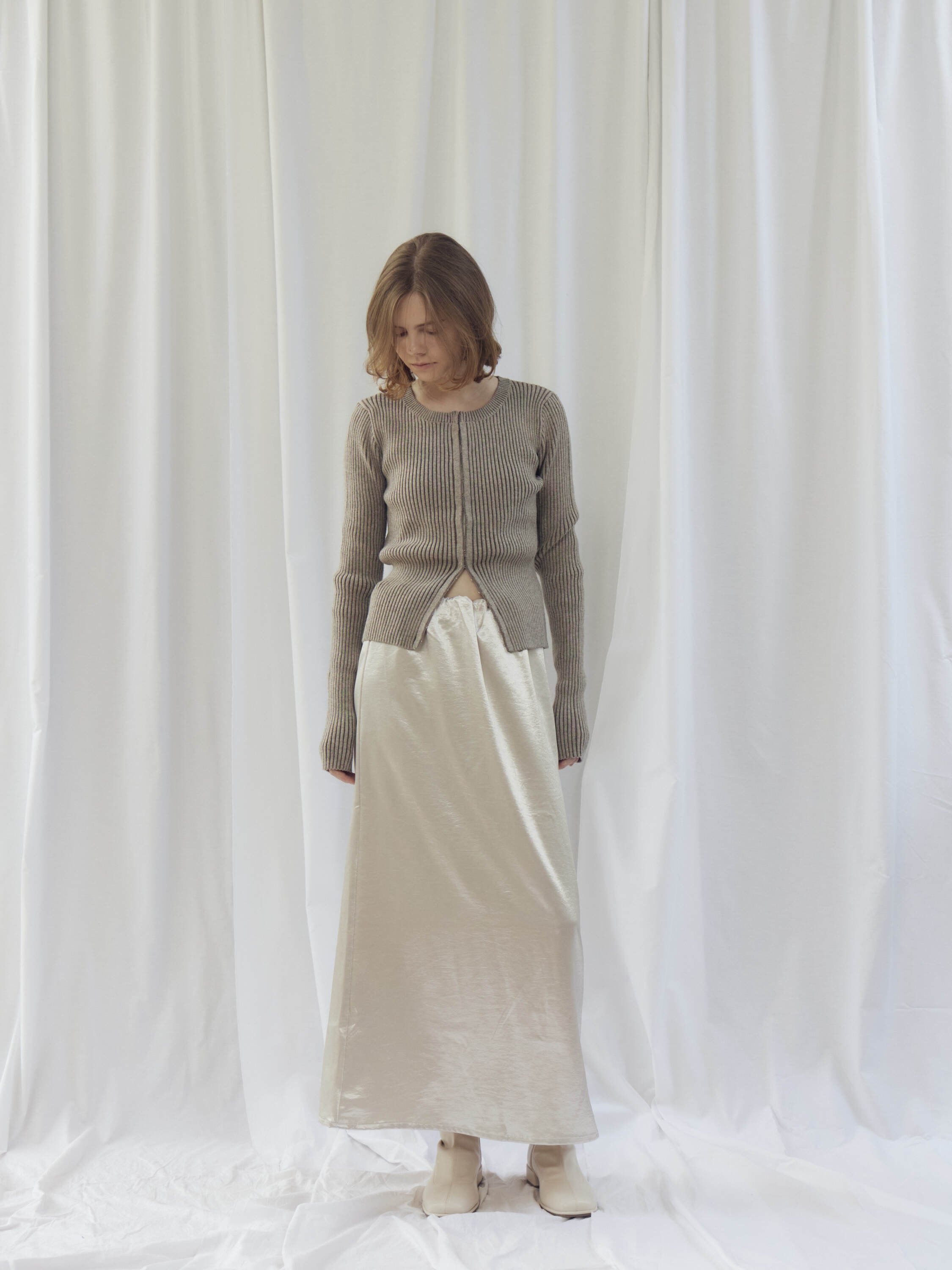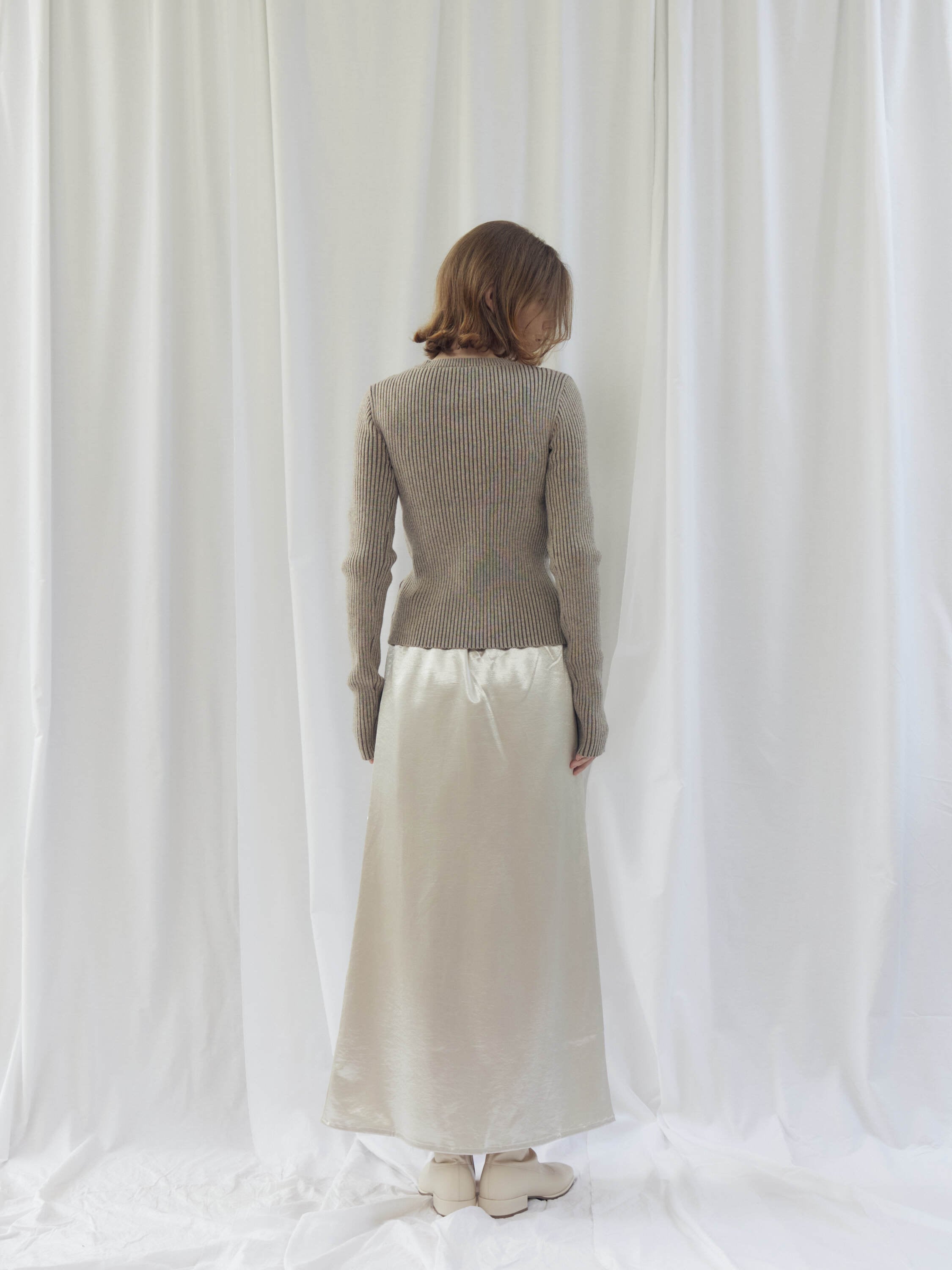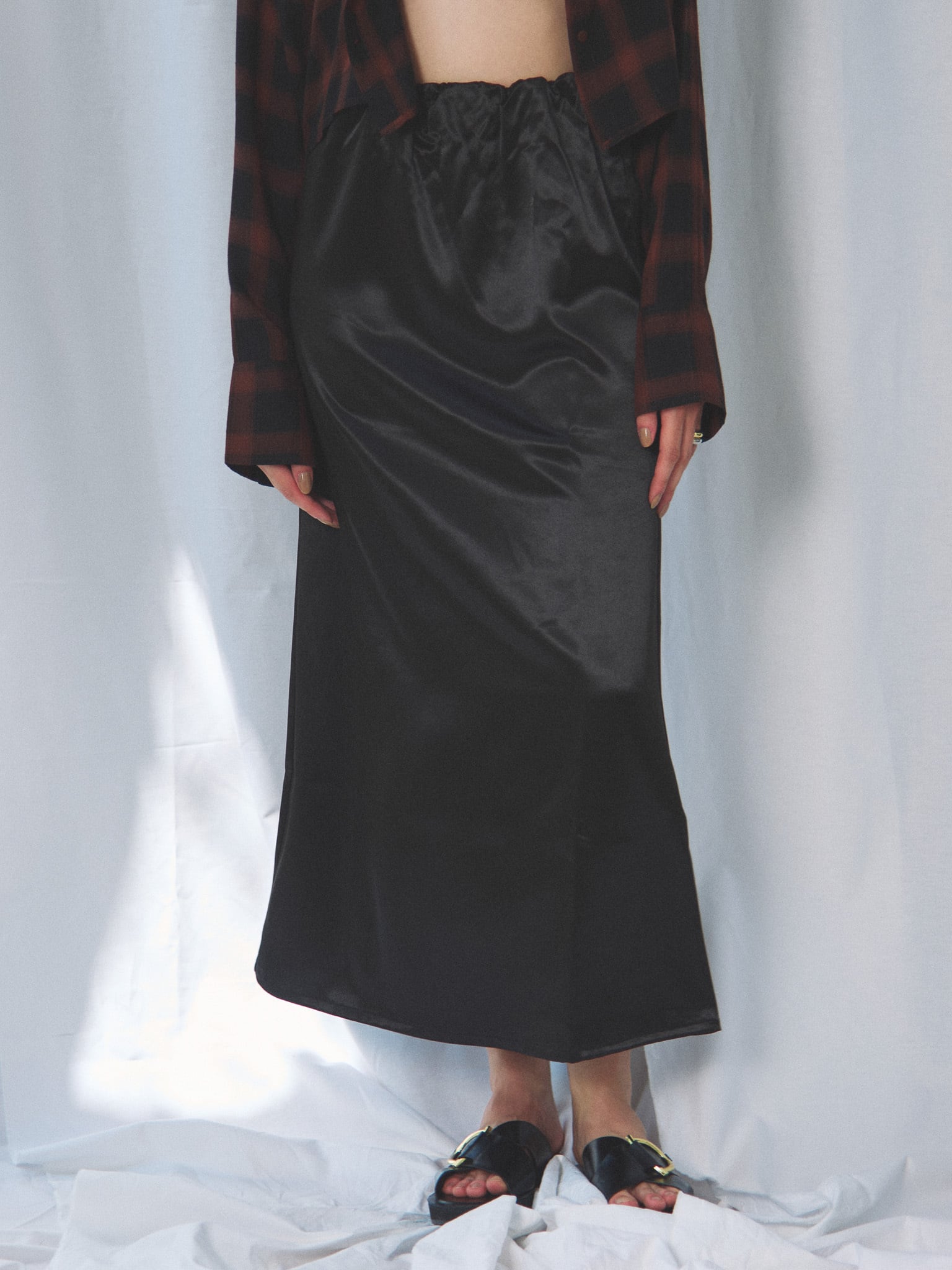 セミフレアで美シルエットが女性らしいサテンスカート。落ち感と滑らかで程よい光沢感が美しく、コーディネートに華やかさをプラスします。ウエストはゴム仕様でイージーな履き心地も嬉しいポイント。オールシーズンお使いいただける生地感なので、ワードローブに取り入れやすい一枚です。