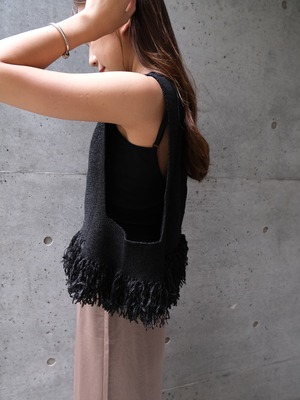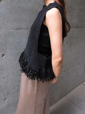 フェザー見えする糸で編立たニットTOPS。フリンジデザインがフェザー感を演出しているので1枚で着映えさせてくれるアイテムです。 高めのウエスト位置で切り替えてフリンジデザインをしているので、スタイルUPしてみせてくれるのと、気になるウエスト周りをさりげなくカバーしてくれるのも嬉しいポイント♪ 腕回りがしっかりと開いているので、Tシャツやシアーインナーと合わせてベストのようにも着て頂けます。