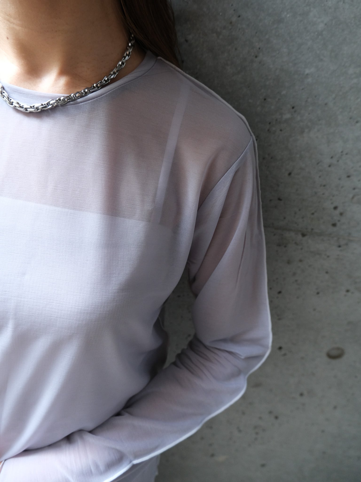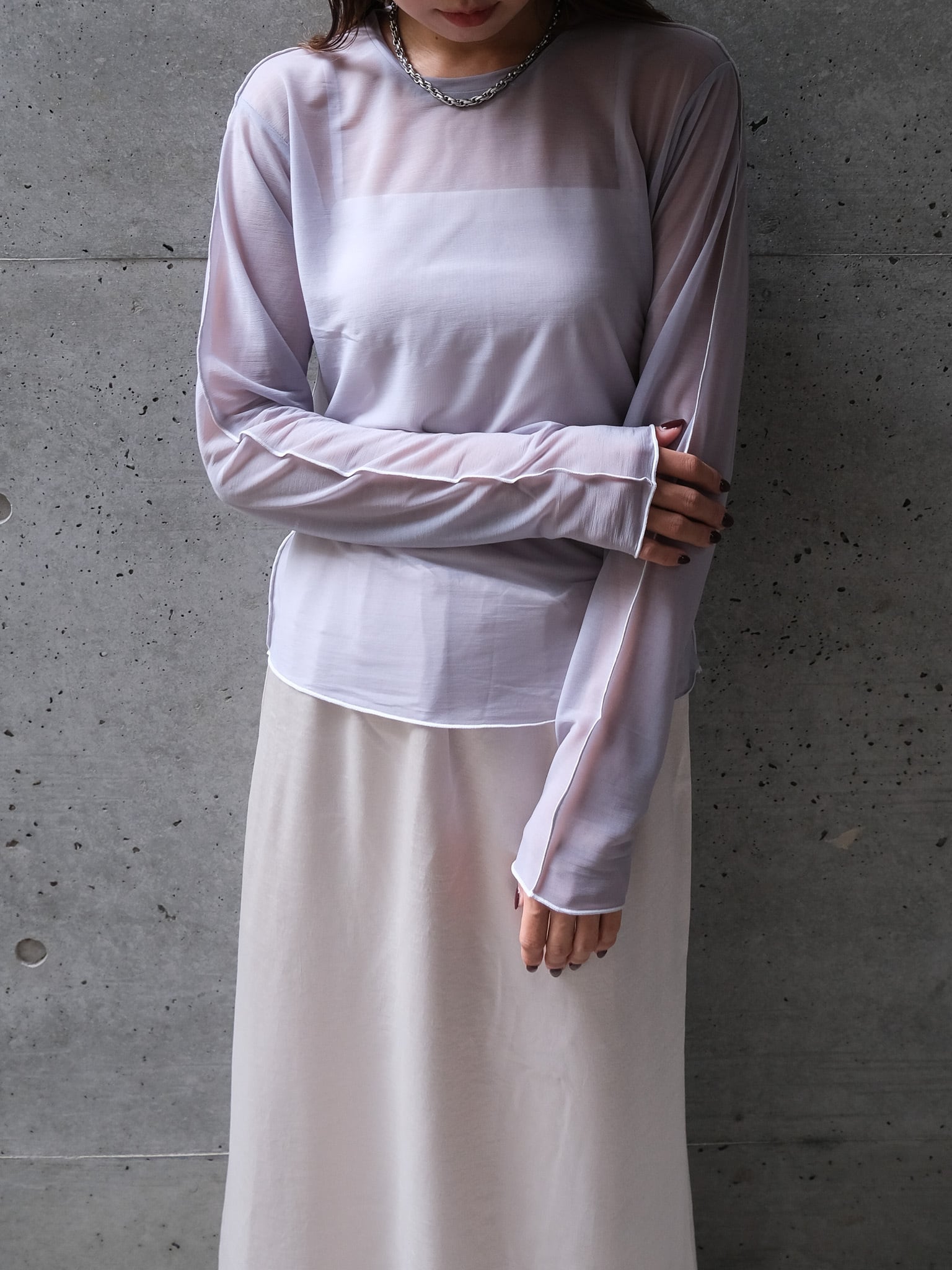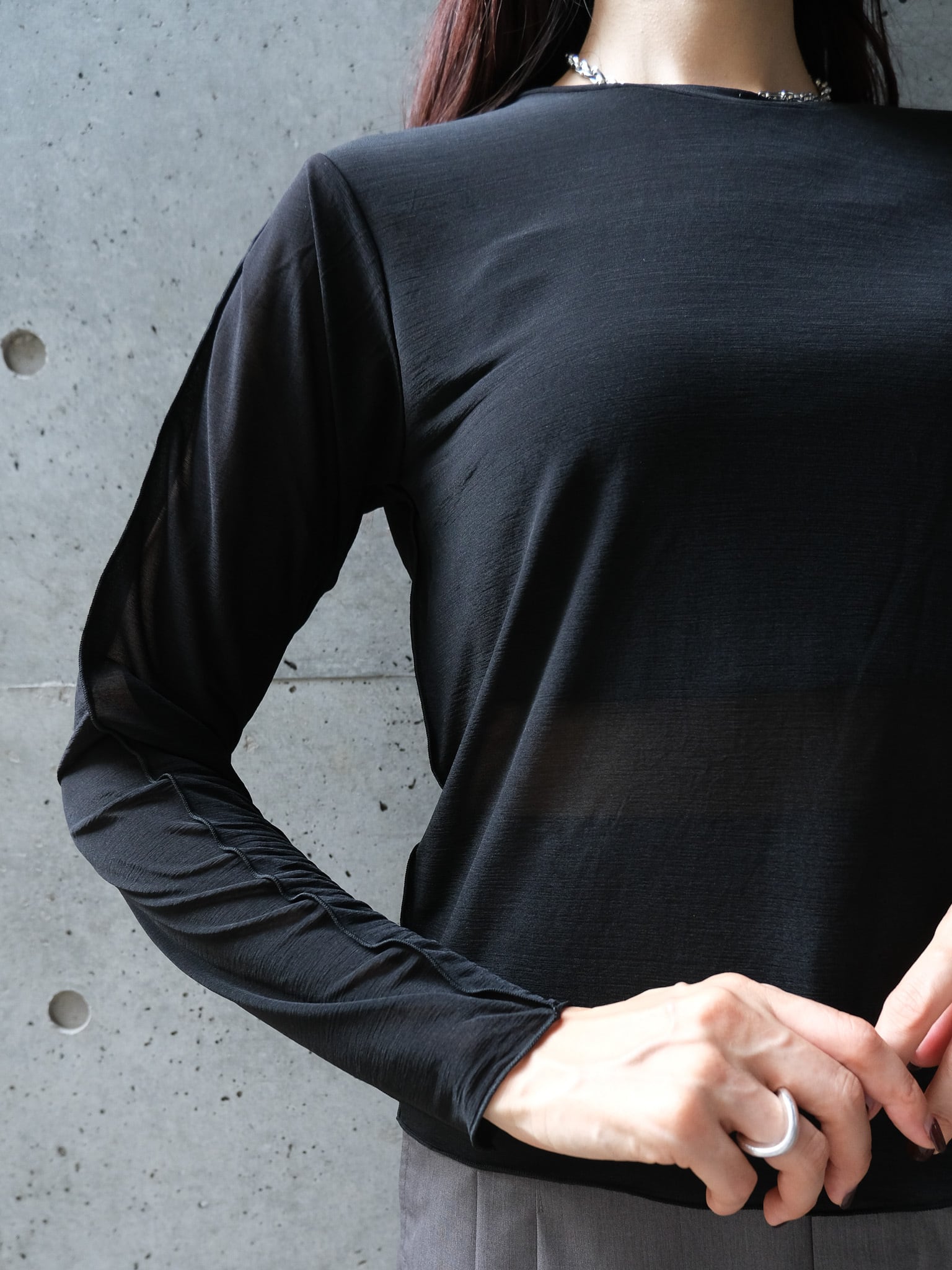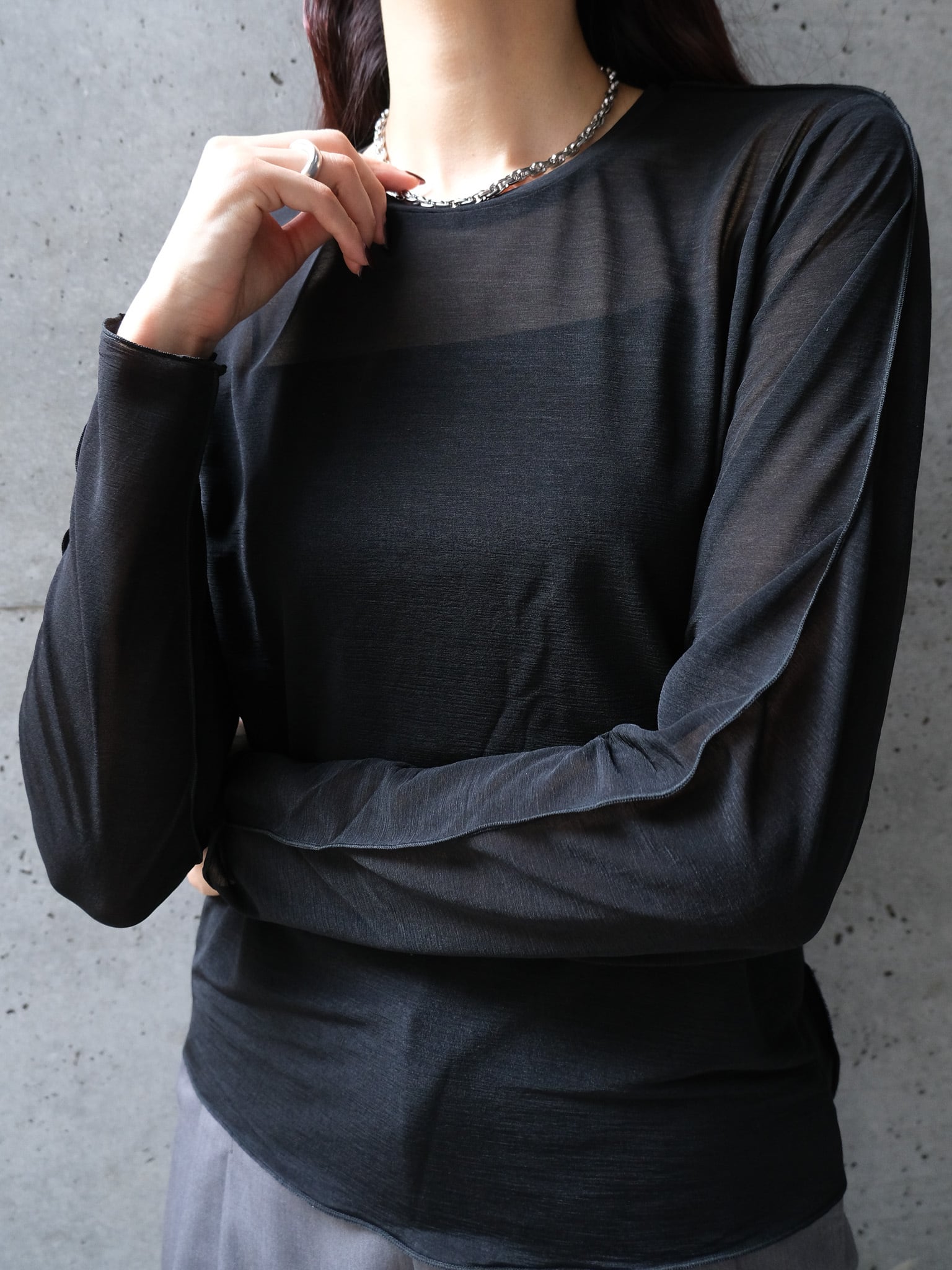 程よく透けるシアー素材を使用しています。やや伸縮で性もあり着心地良く着用いただきます。ご自宅でホームケアしていただけます。