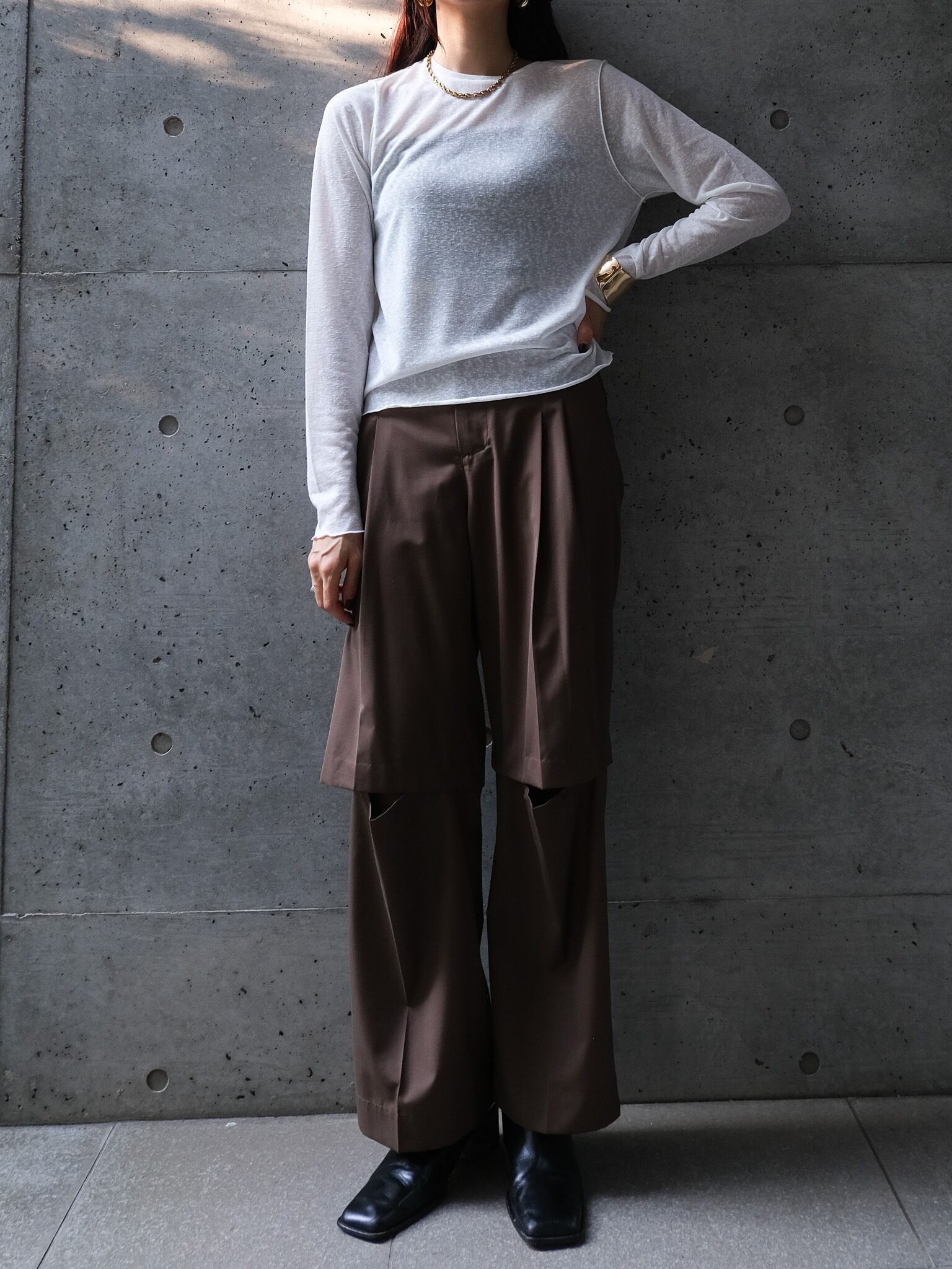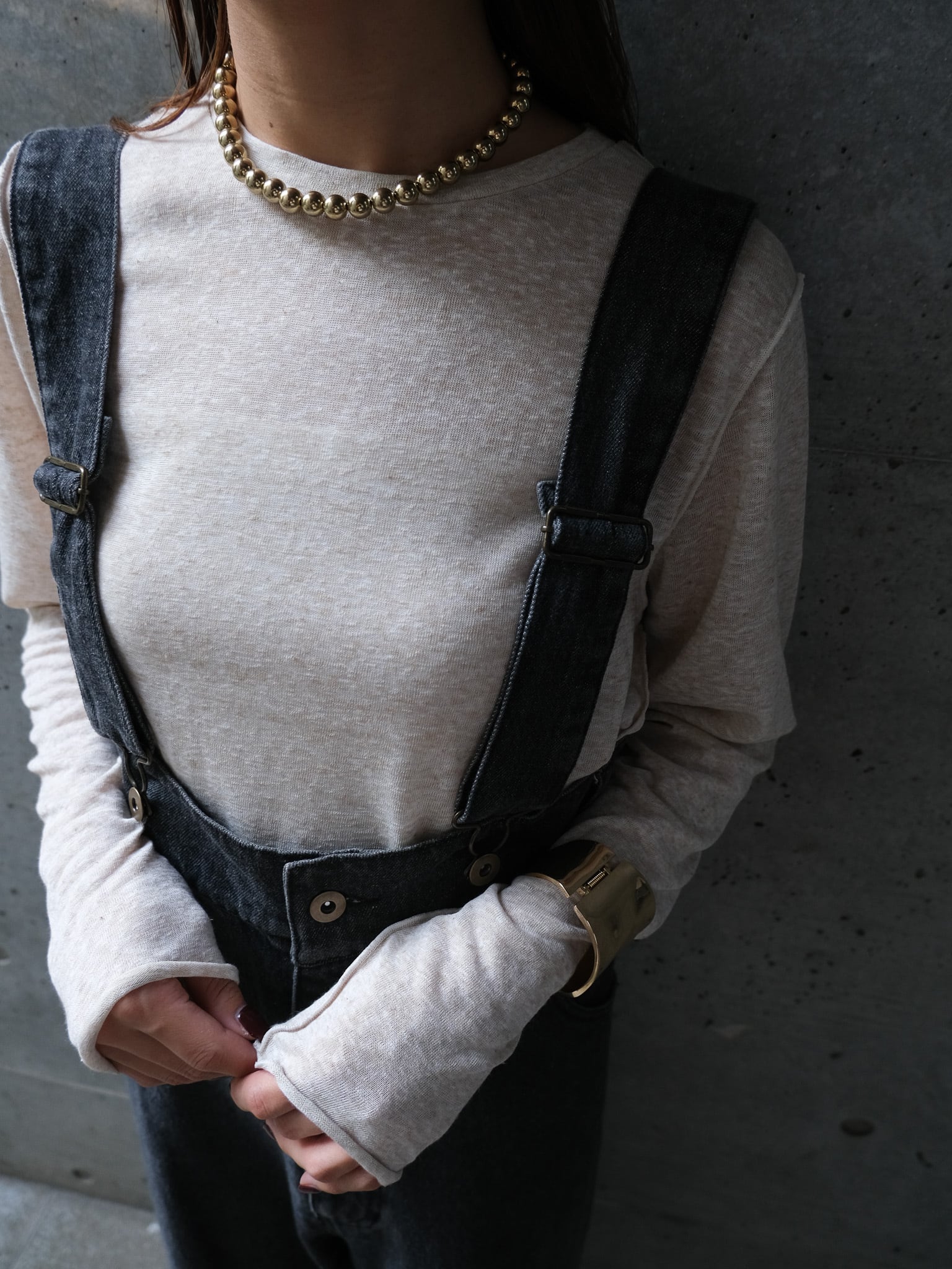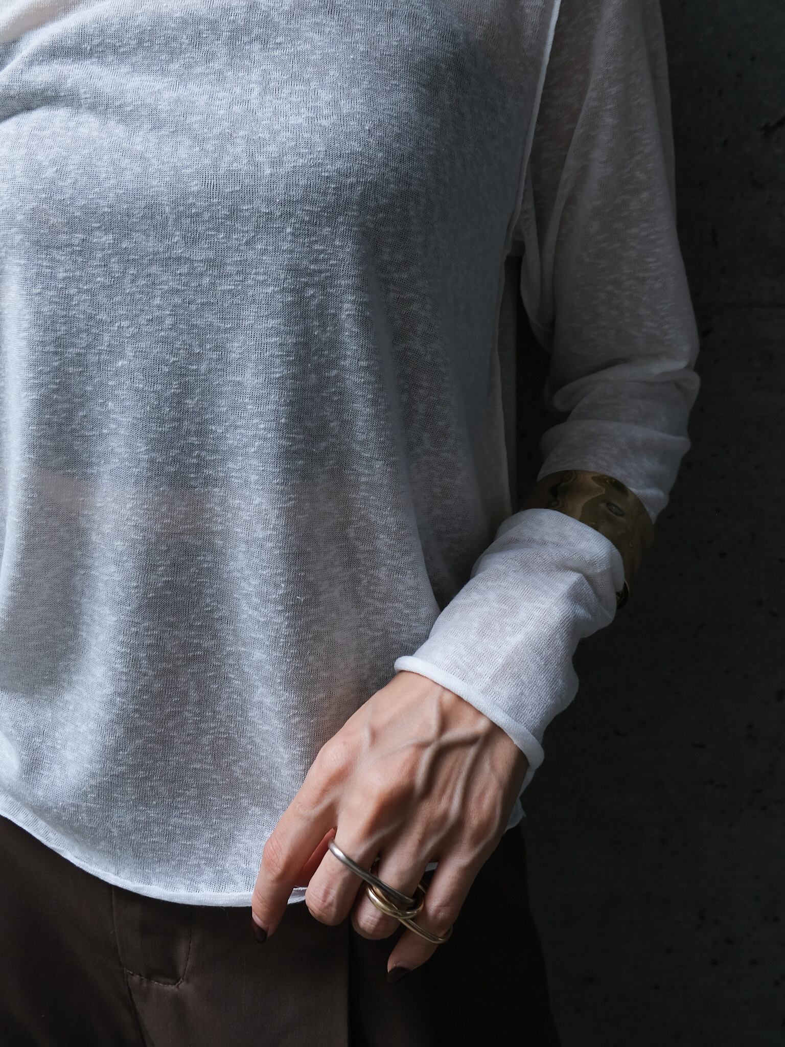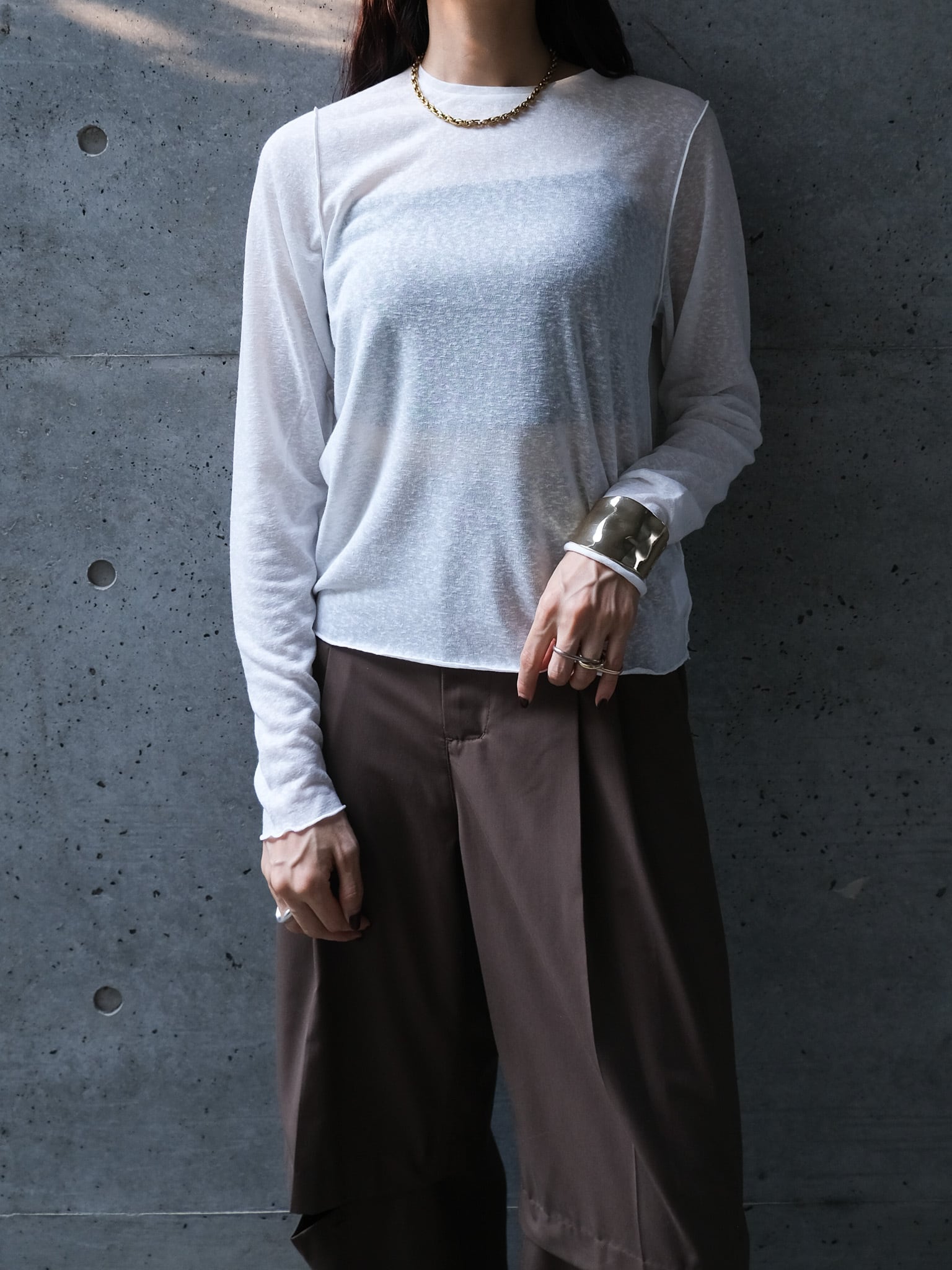 全体にメランジ感のあるシアー素材のカットソーはリネンブレンドでさらりと着こなしていただける1枚。透けすぎず肌が薄っすら見える程度なので1枚で着ても安心のアイテムです。