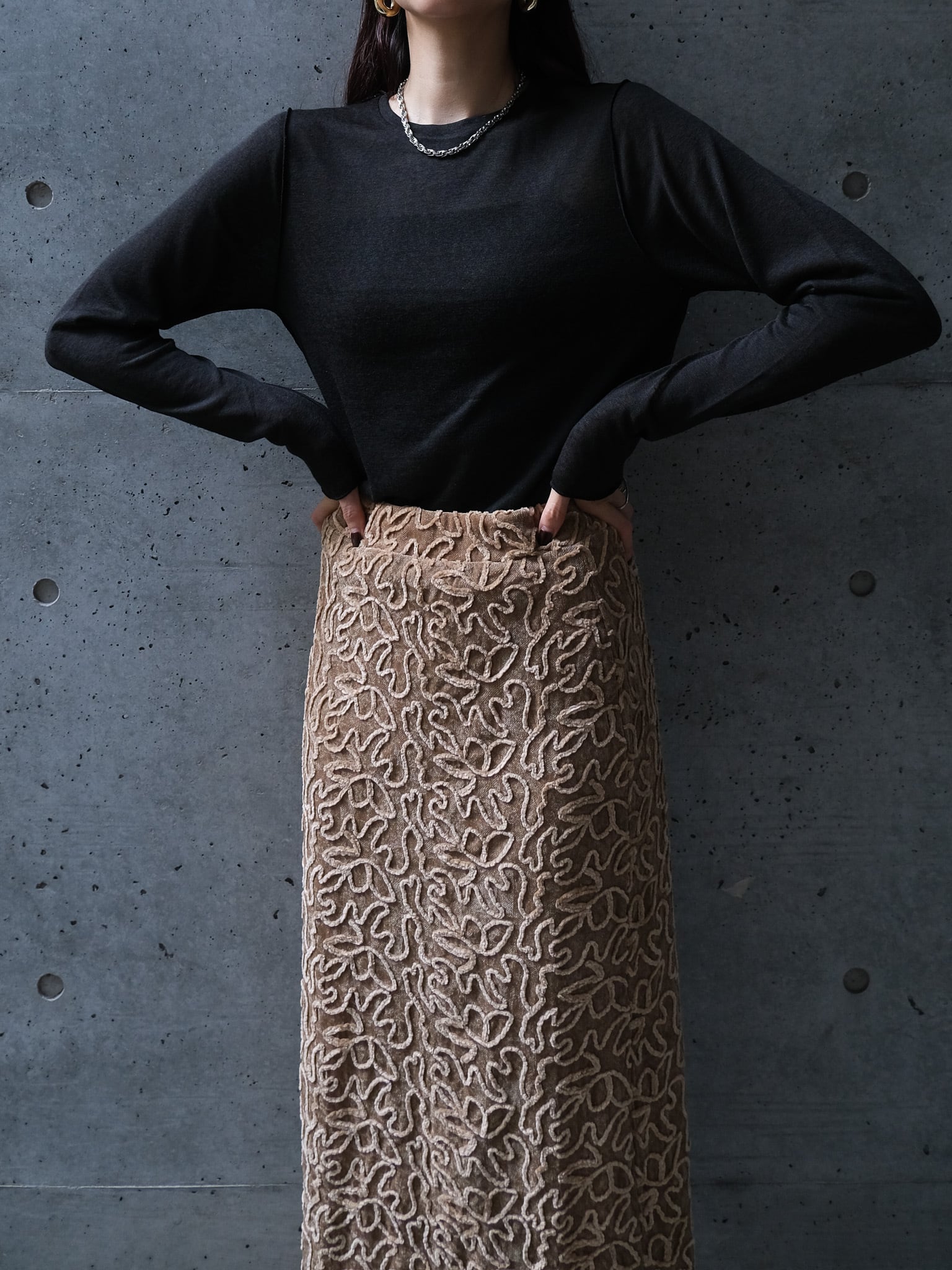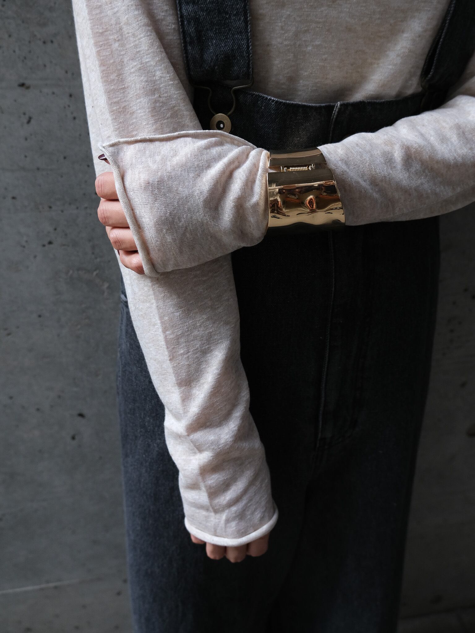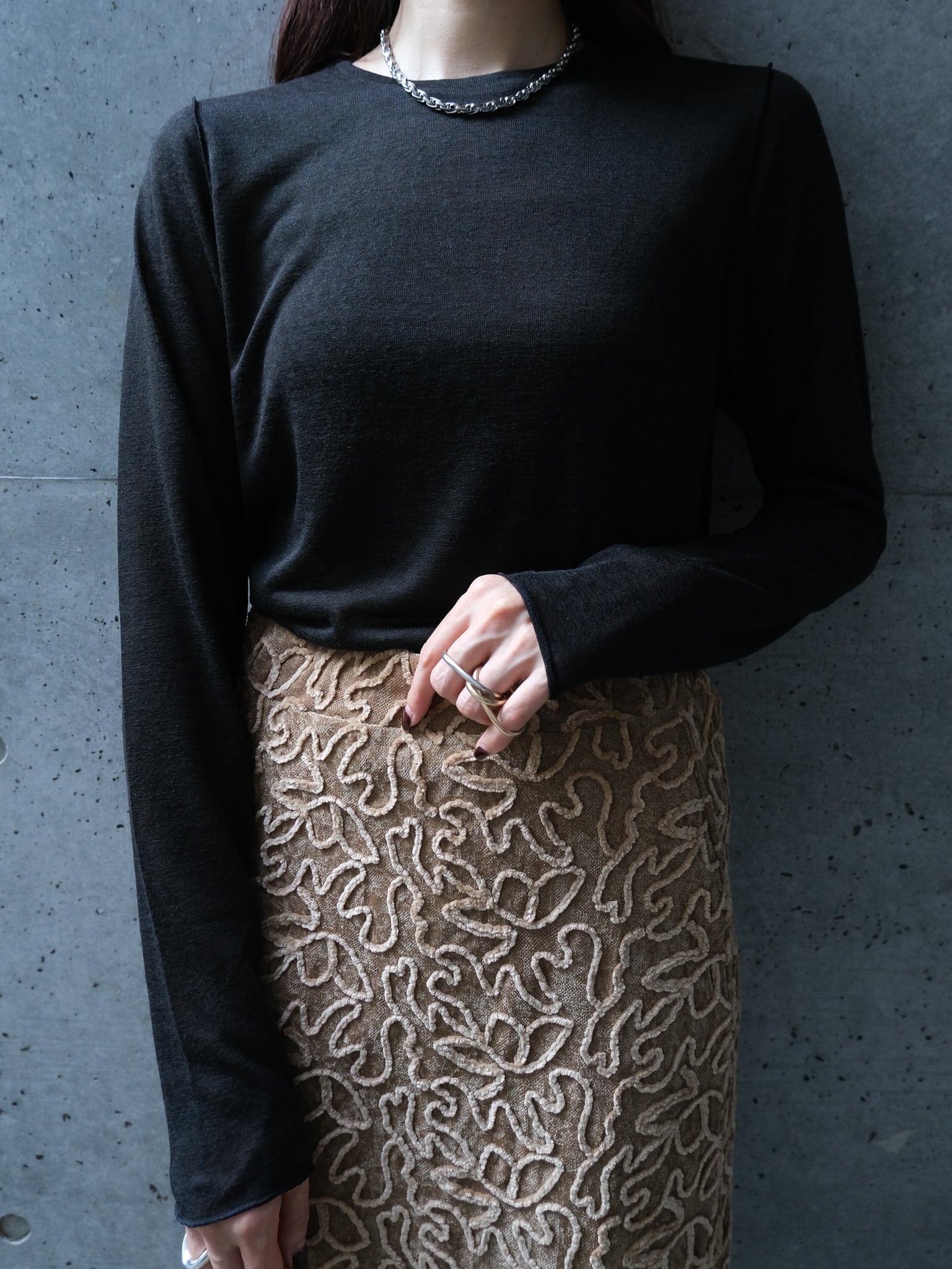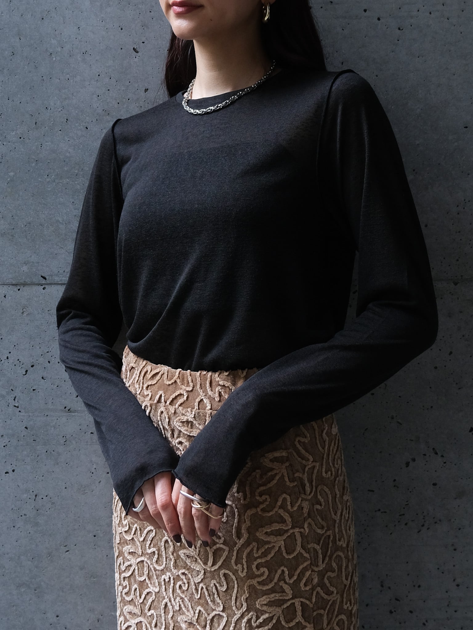 大人気だったメランジシアーカットソーがサイズ展開を加えて再登場!シアー素材でさらりと着こなしていただけるので今の時期から春先までロングシーズンで活躍してくれること間違いなしのアイテムです。縫い代や袖口、裾などは同色系のメロウミシンでワンポイント、主張しすぎないベーシックカットソーとして1枚は持っておきたいカットソーです。