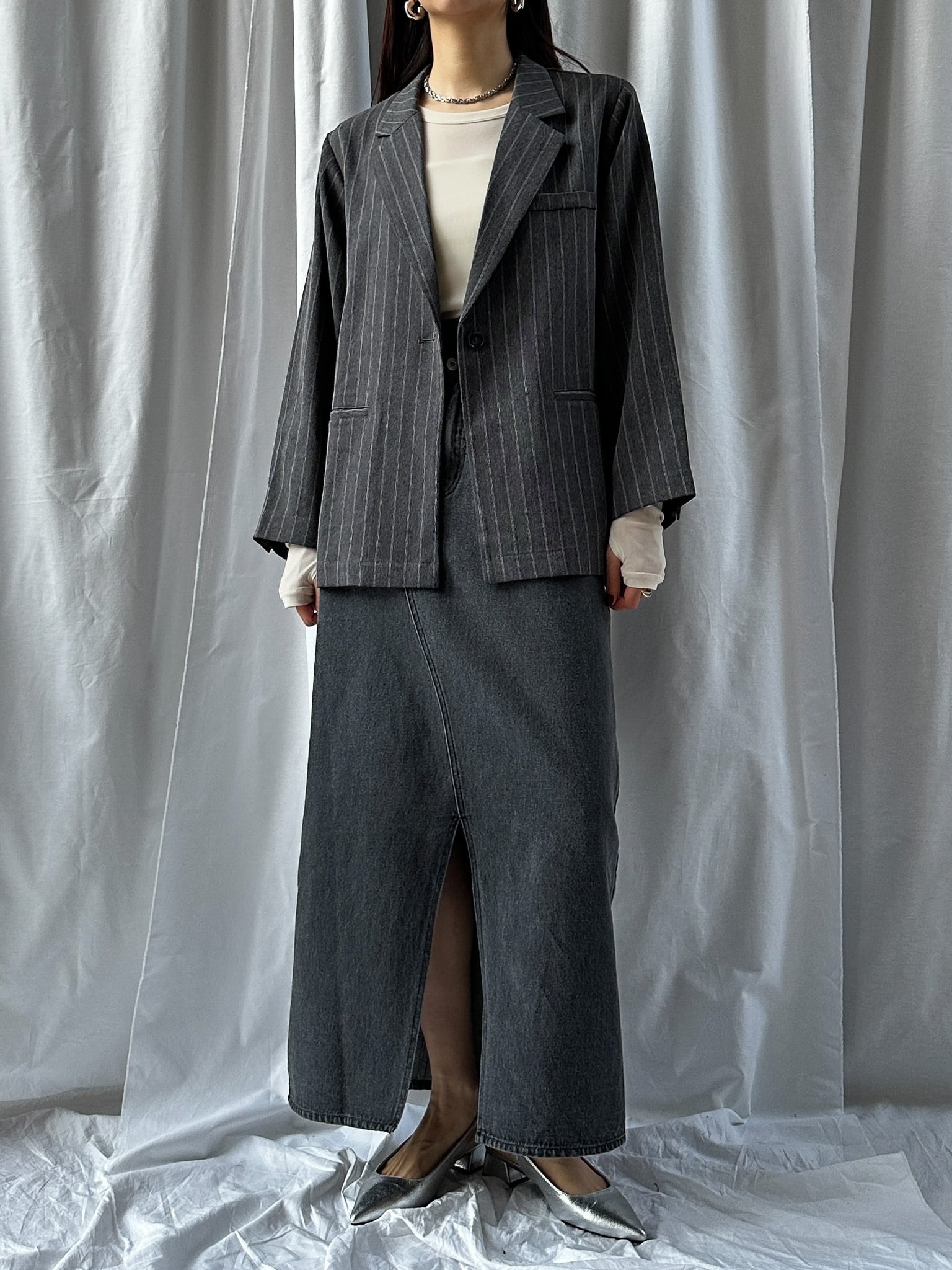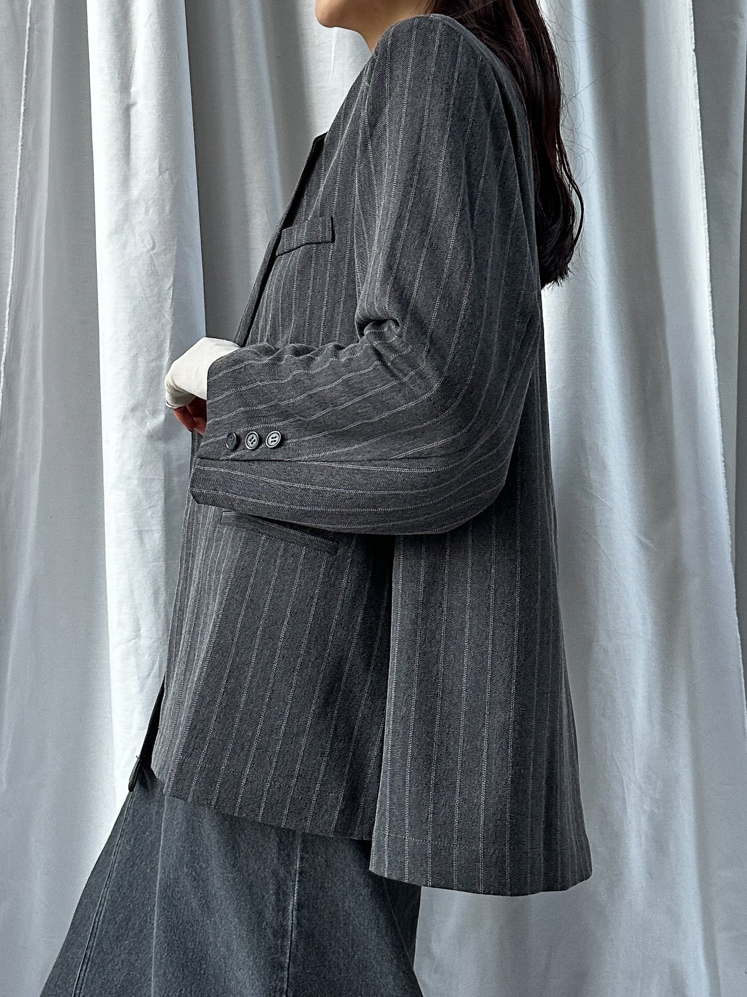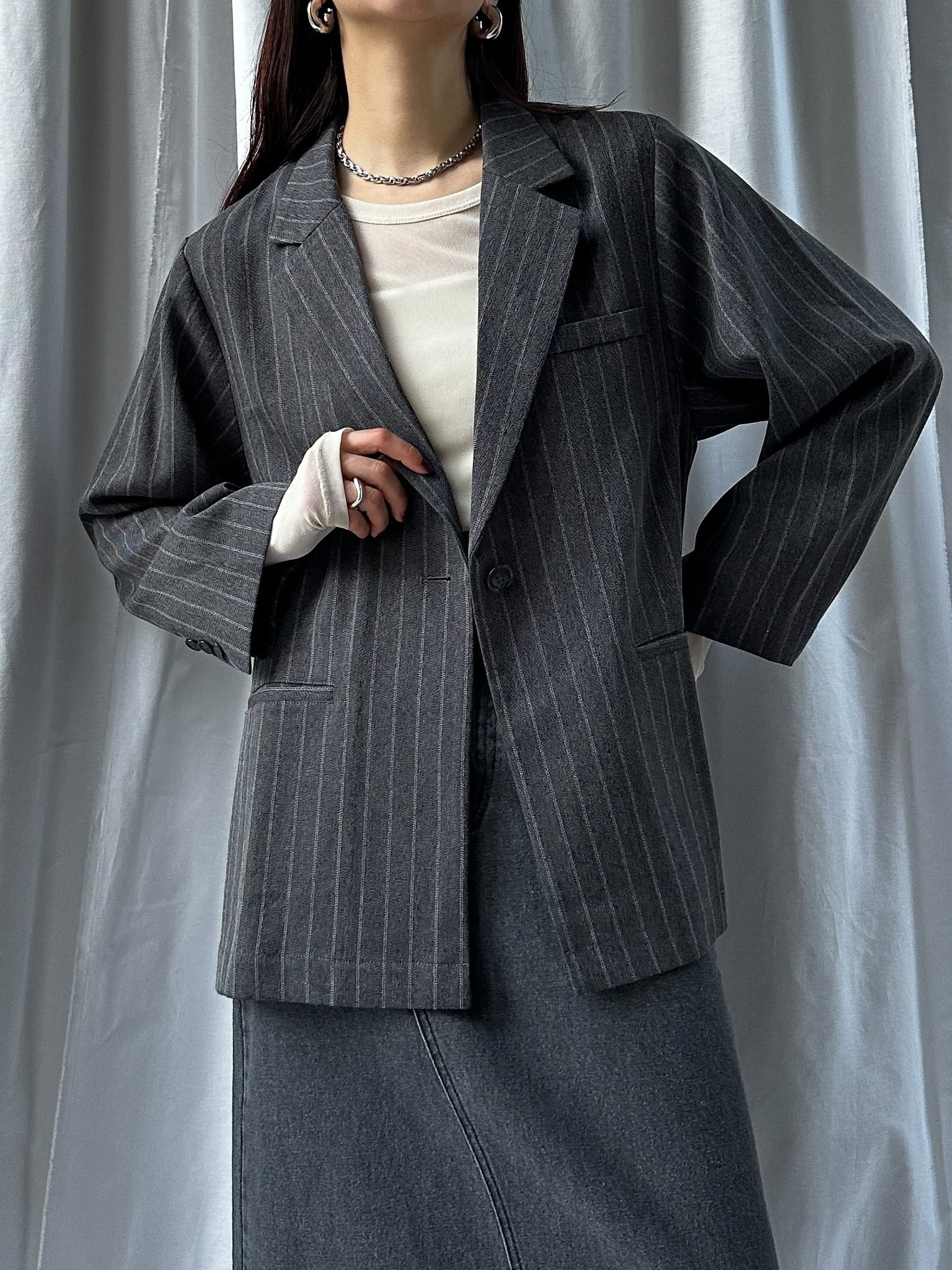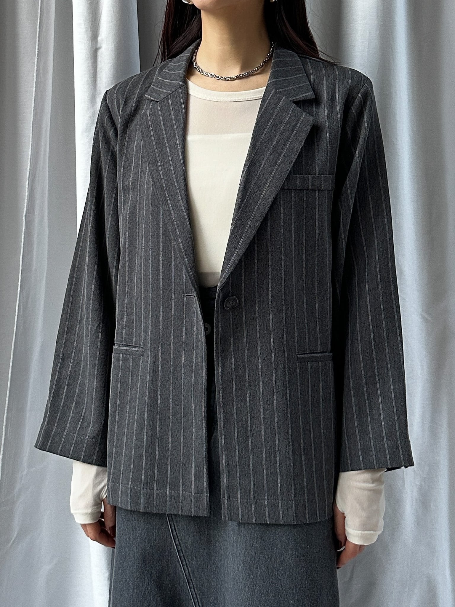 STRIPED ZIP SLIT PANTS(ストライプZIPスリットパンツ)【5543037】とのセットアップ着用がおすすめです。お仕事ではかっちりと、OFFのシーンではデニムなどと合わせてカジュアルにしても◎。さらっと羽織れる素材感でジャケットの堅苦しさがなく、裏地がついていない為シャツのような着心地です。上からビスチェなどを合わせるとトレンドのレイヤードスタイルに。程よい存在感で、上半身に視線を集めてスタイルアップ効果も狙えます。