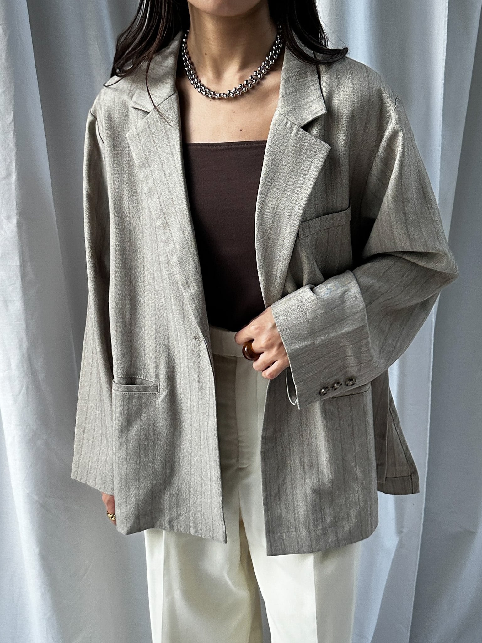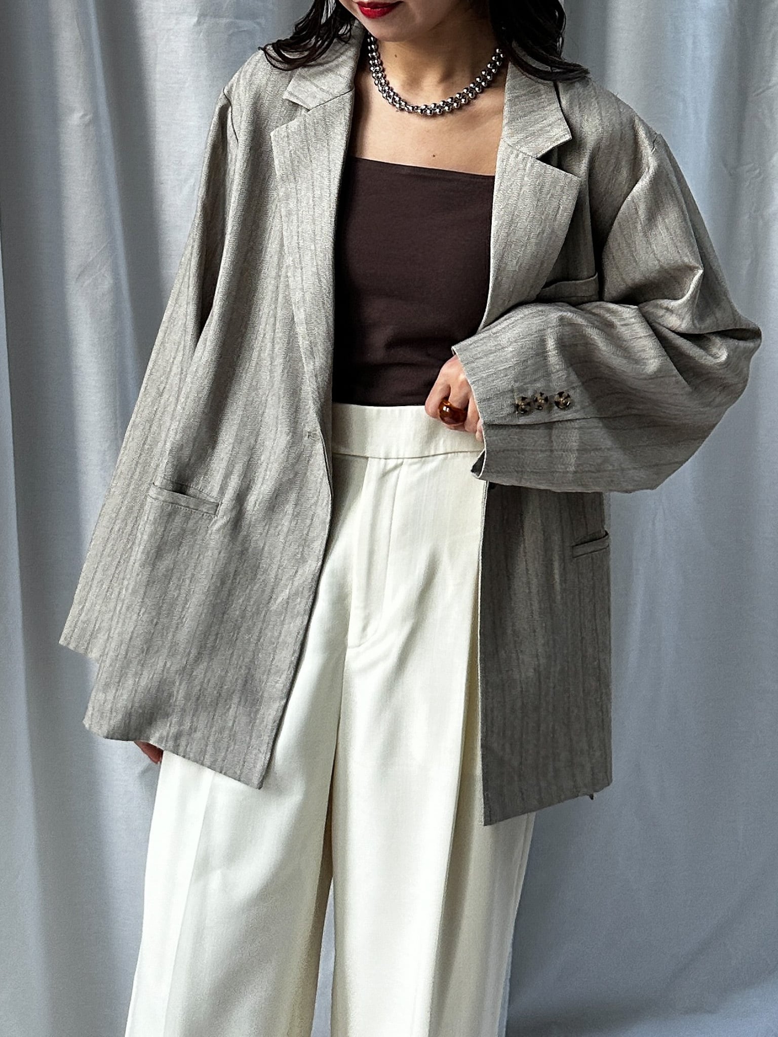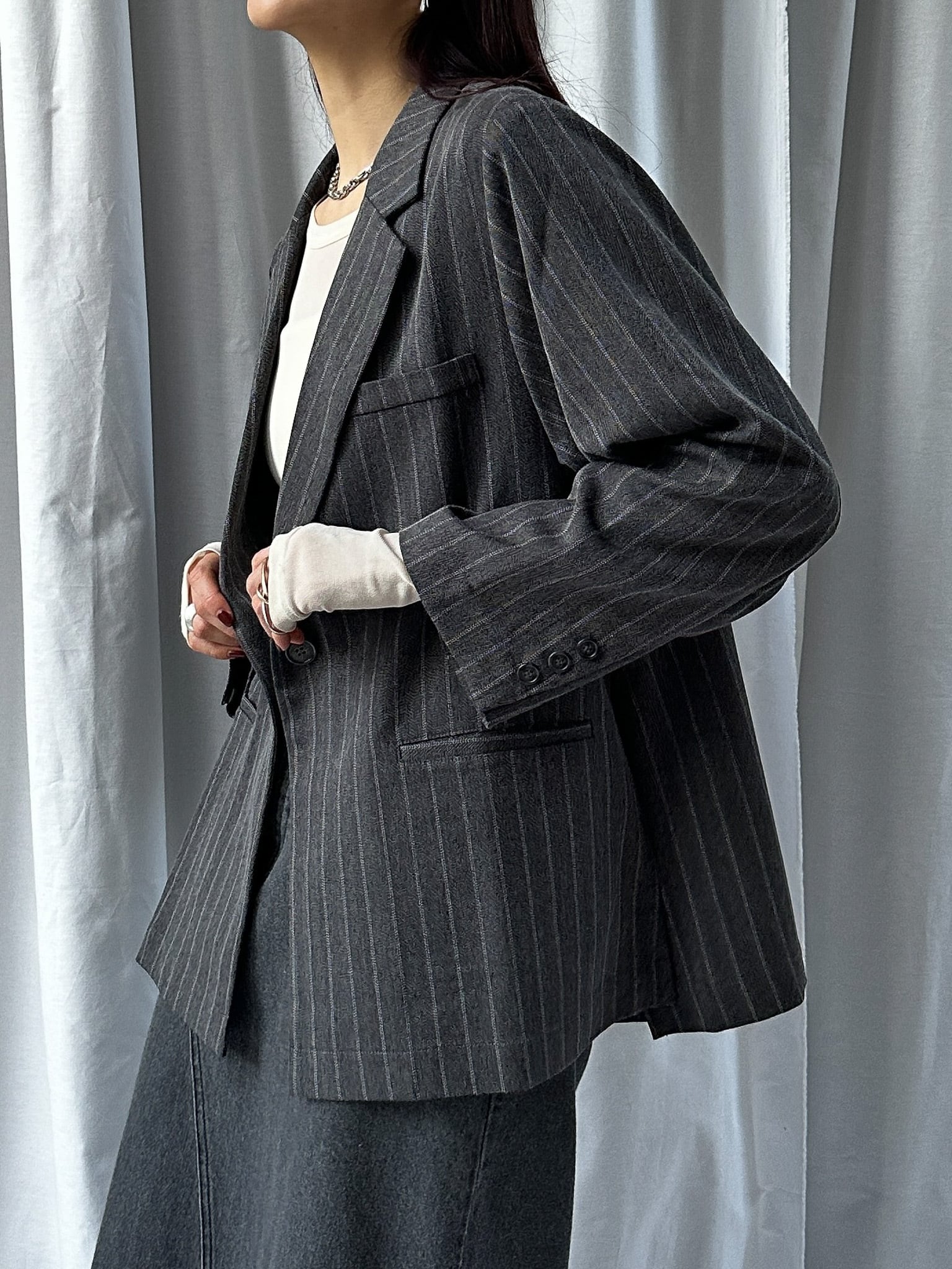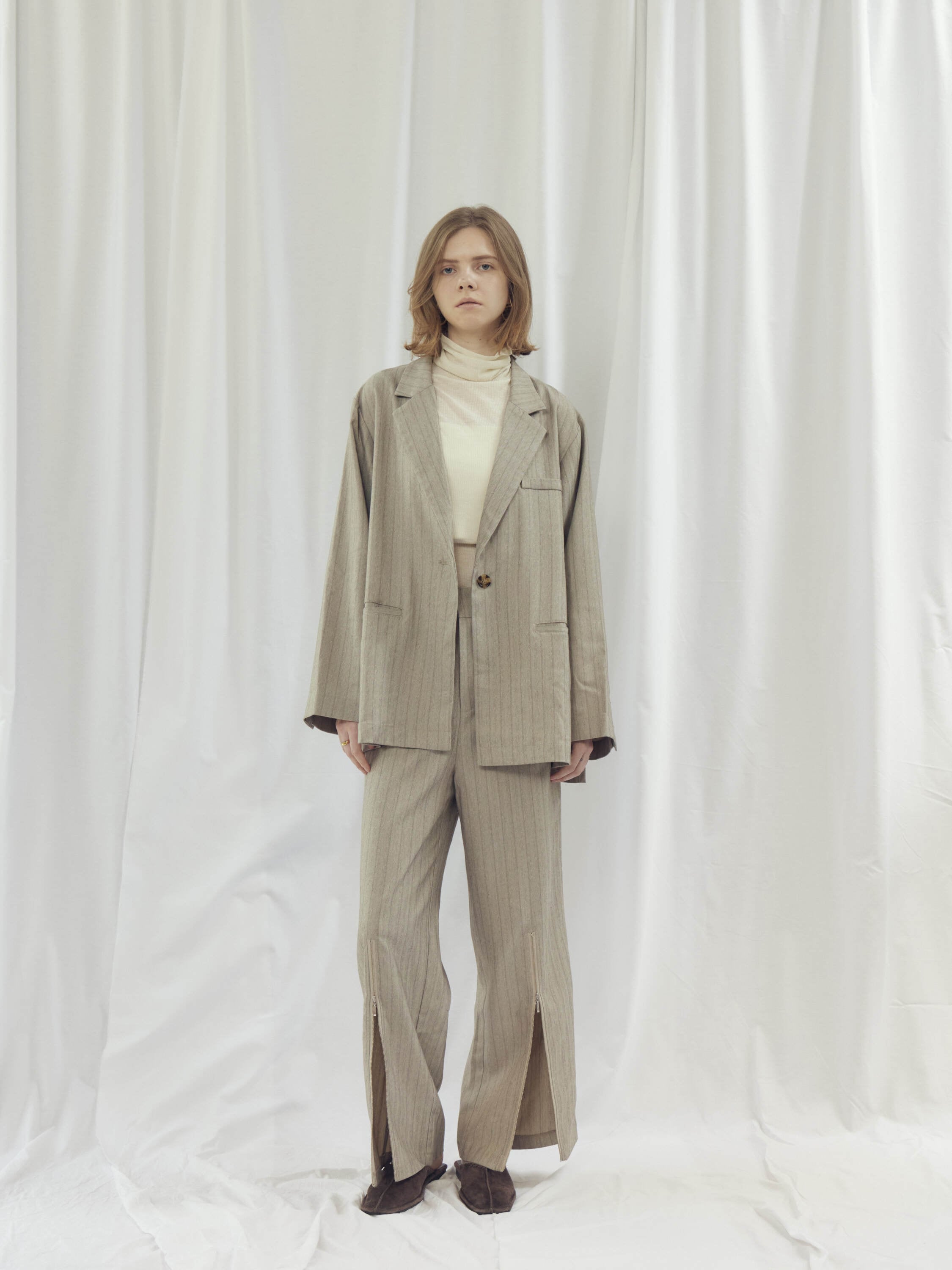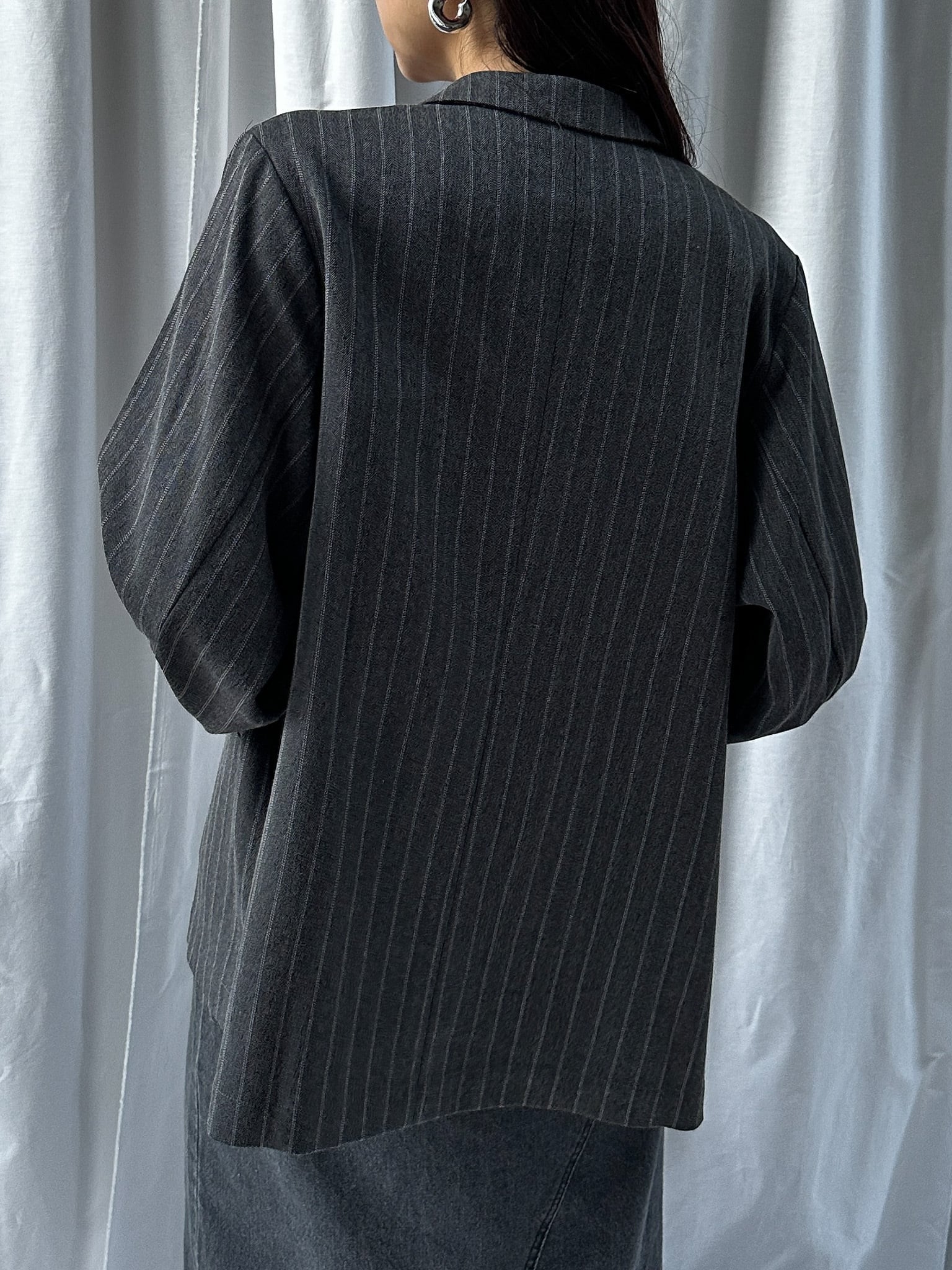 STRIPED ZIP SLIT PANTS(ストライプZIPスリットパンツ)【5543037】とのセットアップ着用がおすすめです。お仕事ではかっちりと、OFFのシーンではデニムなどと合わせてカジュアルにしても◎。さらっと羽織れる素材感でジャケットの堅苦しさがなく、裏地がついていない為シャツのような着心地です。上からビスチェなどを合わせるとトレンドのレイヤードスタイルに。程よい存在感で、上半身に視線を集めてスタイルアップ効果も狙えます。
