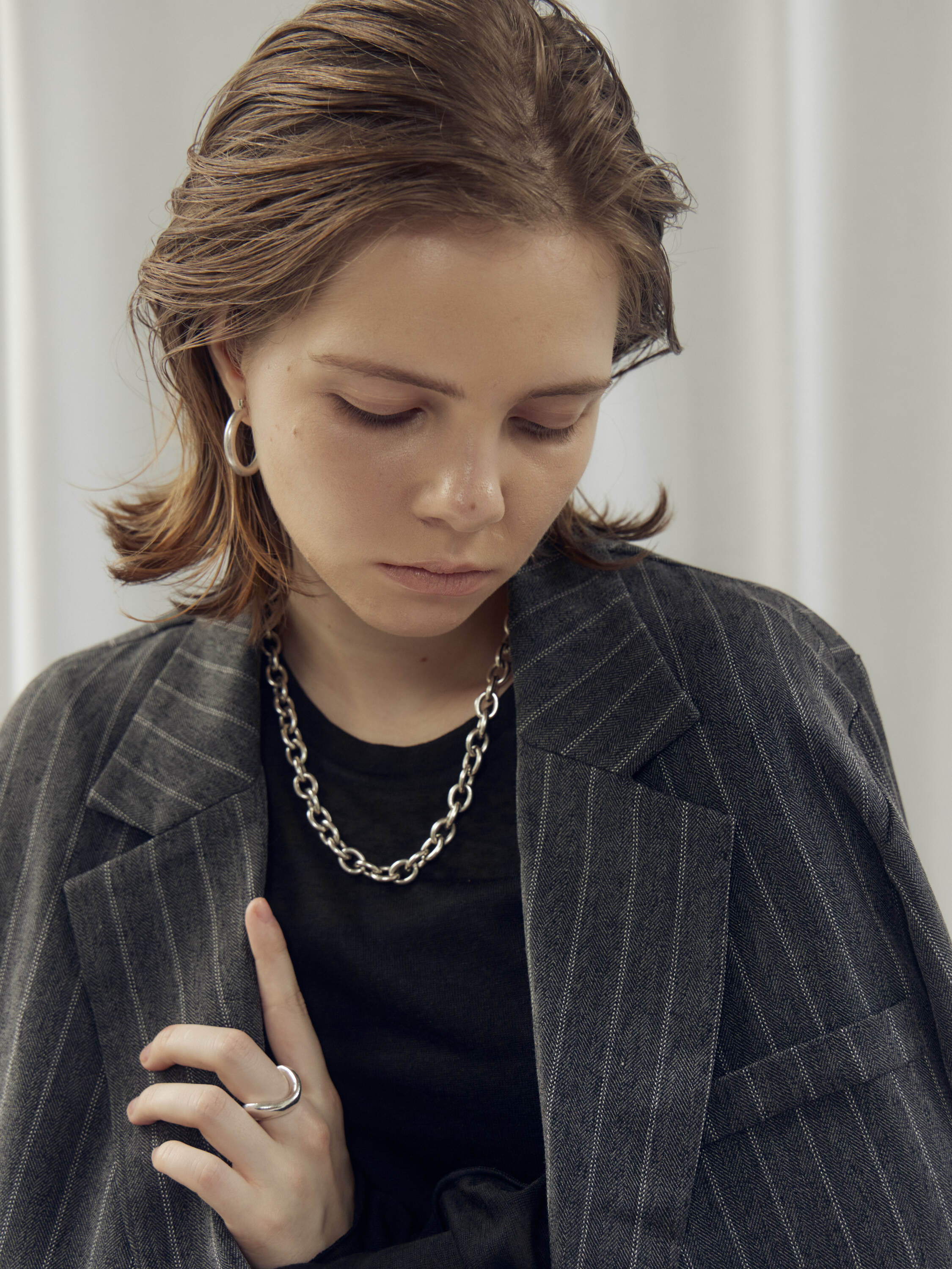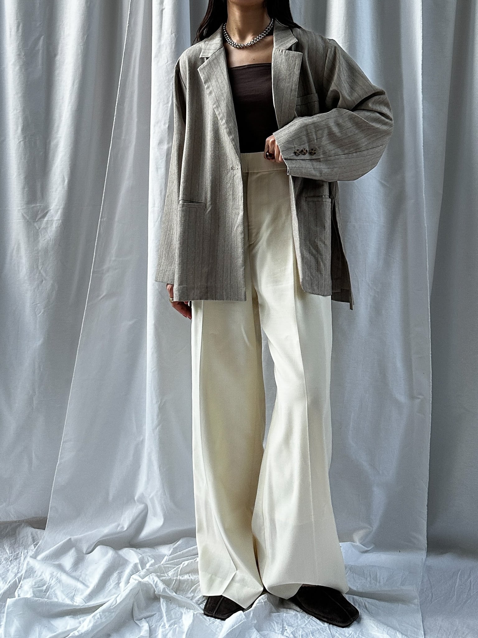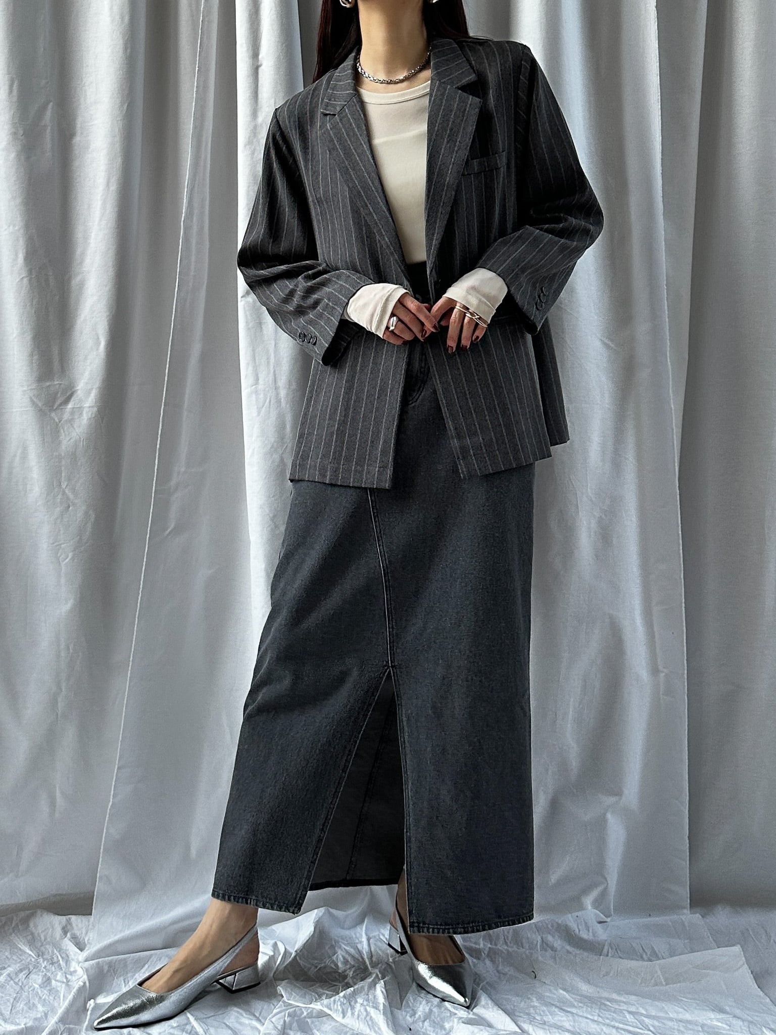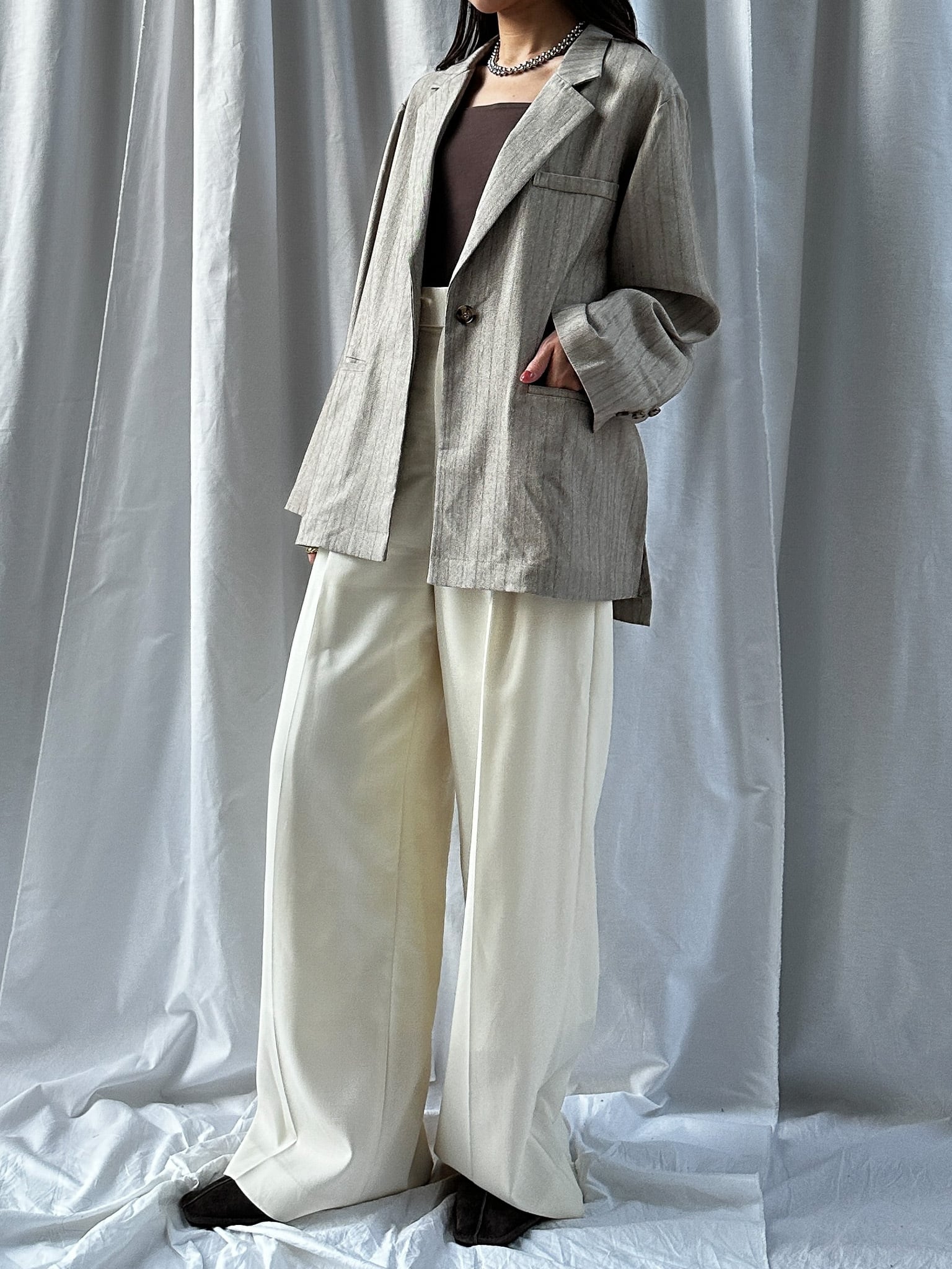 STRIPED ZIP SLIT PANTS(ストライプZIPスリットパンツ)【5543037】とのセットアップ着用がおすすめです。お仕事ではかっちりと、OFFのシーンではデニムなどと合わせてカジュアルにしても◎。さらっと羽織れる素材感でジャケットの堅苦しさがなく、裏地がついていない為シャツのような着心地です。上からビスチェなどを合わせるとトレンドのレイヤードスタイルに。程よい存在感で、上半身に視線を集めてスタイルアップ効果も狙えます。