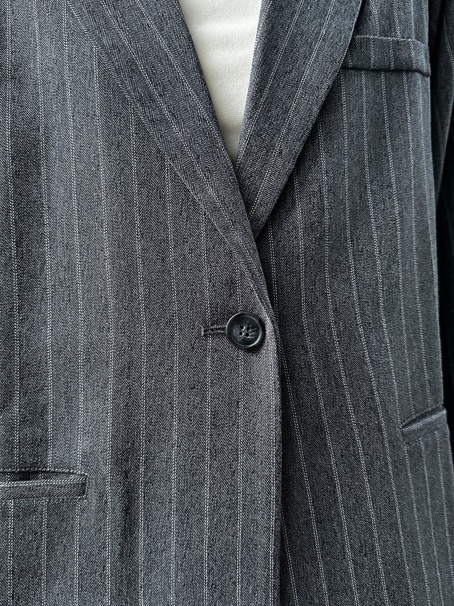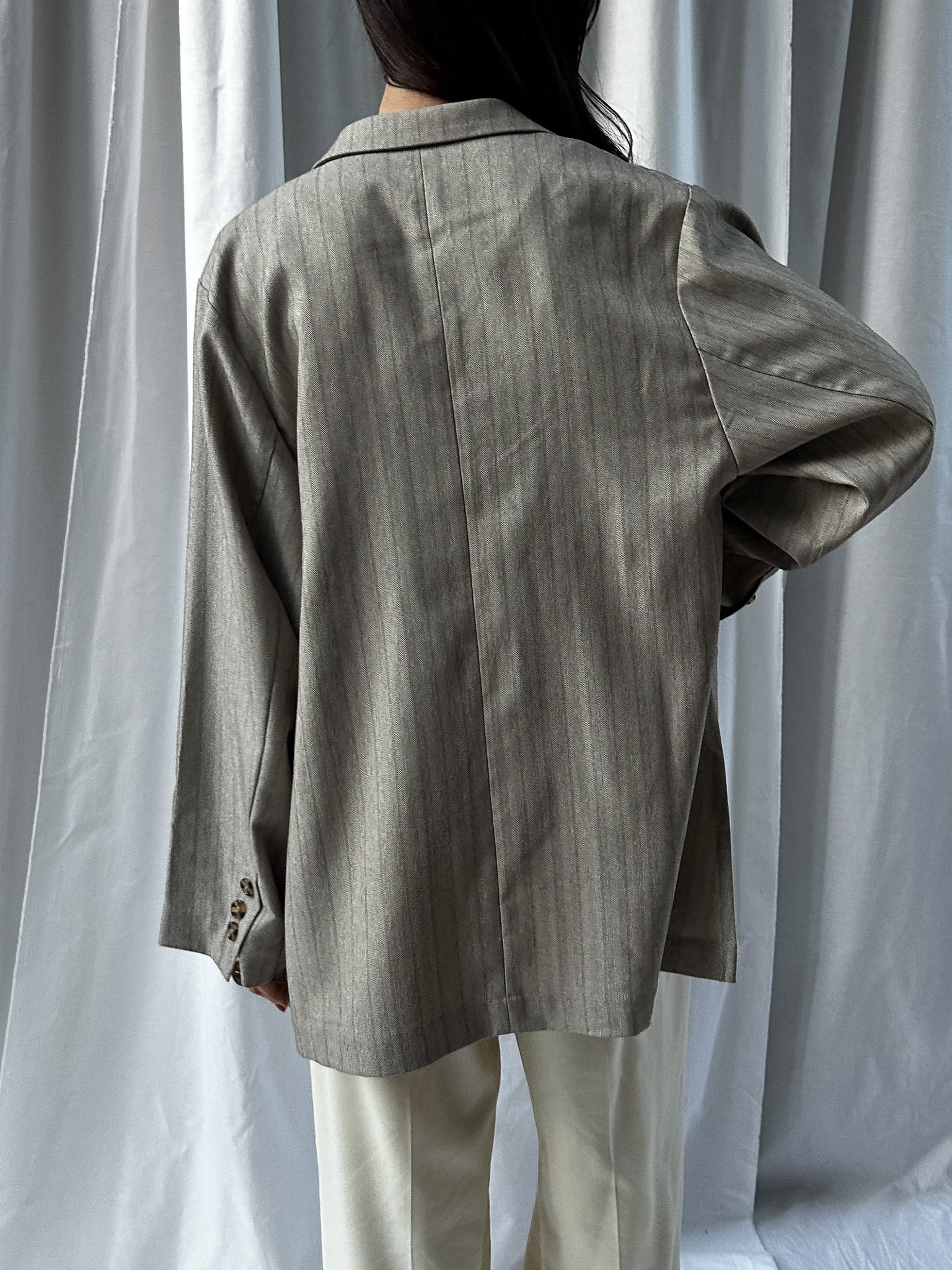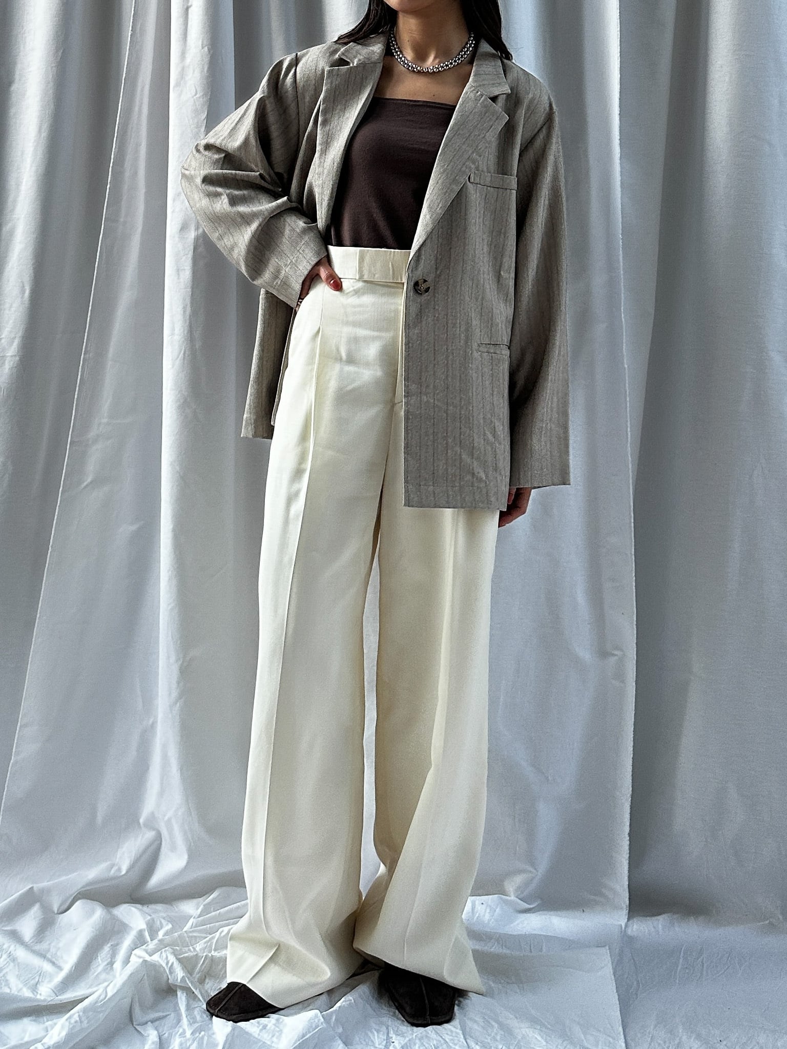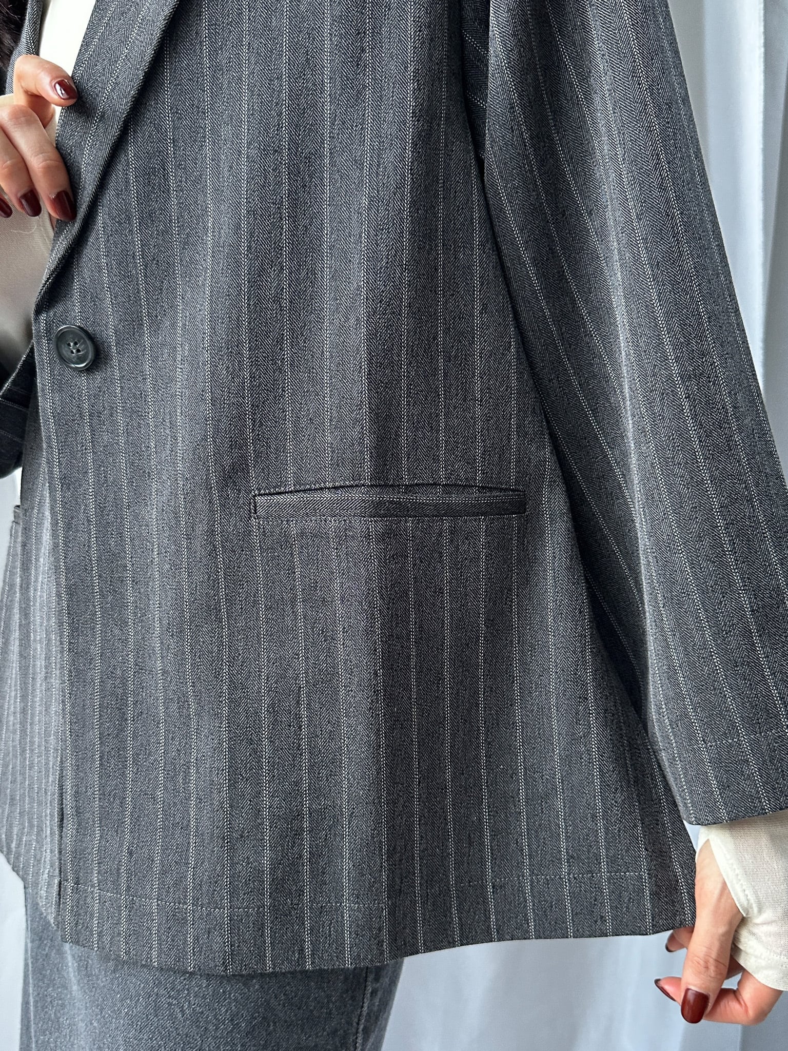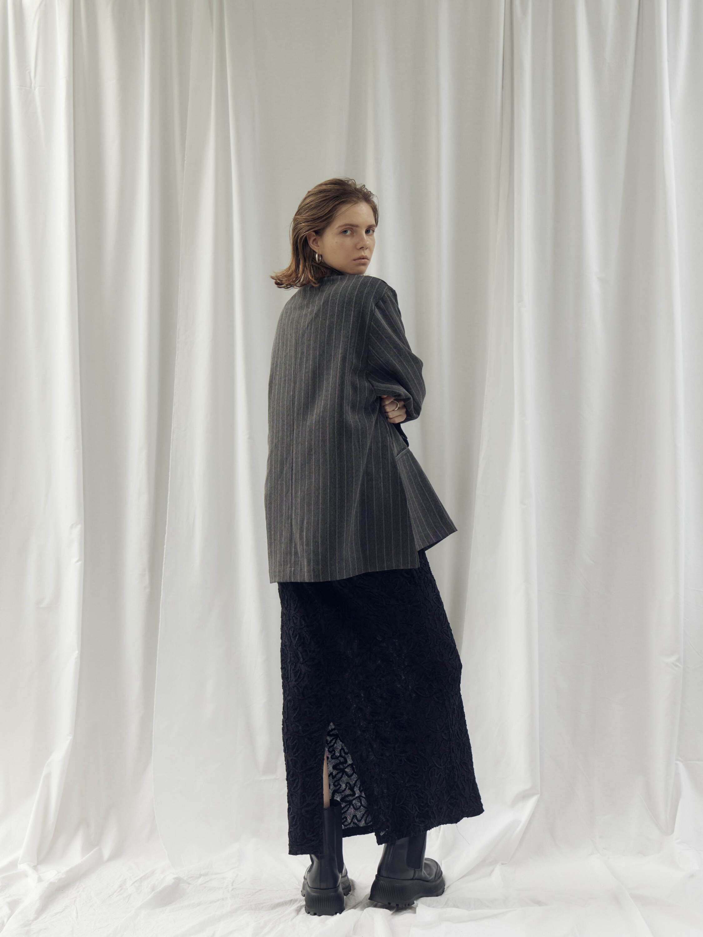STRIPED ZIP SLIT PANTS(ストライプZIPスリットパンツ)【5543037】とのセットアップ着用がおすすめです。お仕事ではかっちりと、OFFのシーンではデニムなどと合わせてカジュアルにしても◎。さらっと羽織れる素材感でジャケットの堅苦しさがなく、裏地がついていない為シャツのような着心地です。上からビスチェなどを合わせるとトレンドのレイヤードスタイルに。程よい存在感で、上半身に視線を集めてスタイルアップ効果も狙えます。