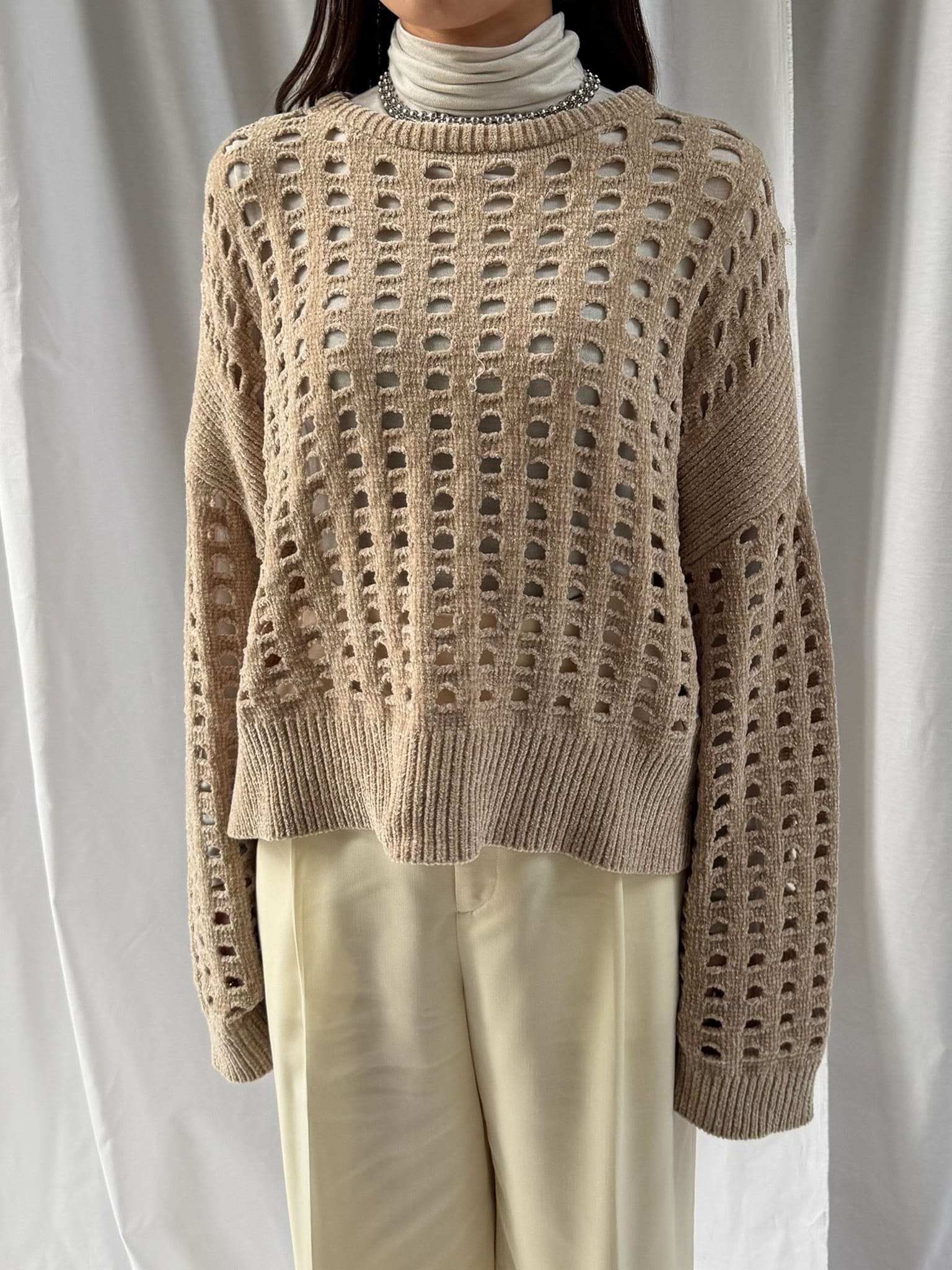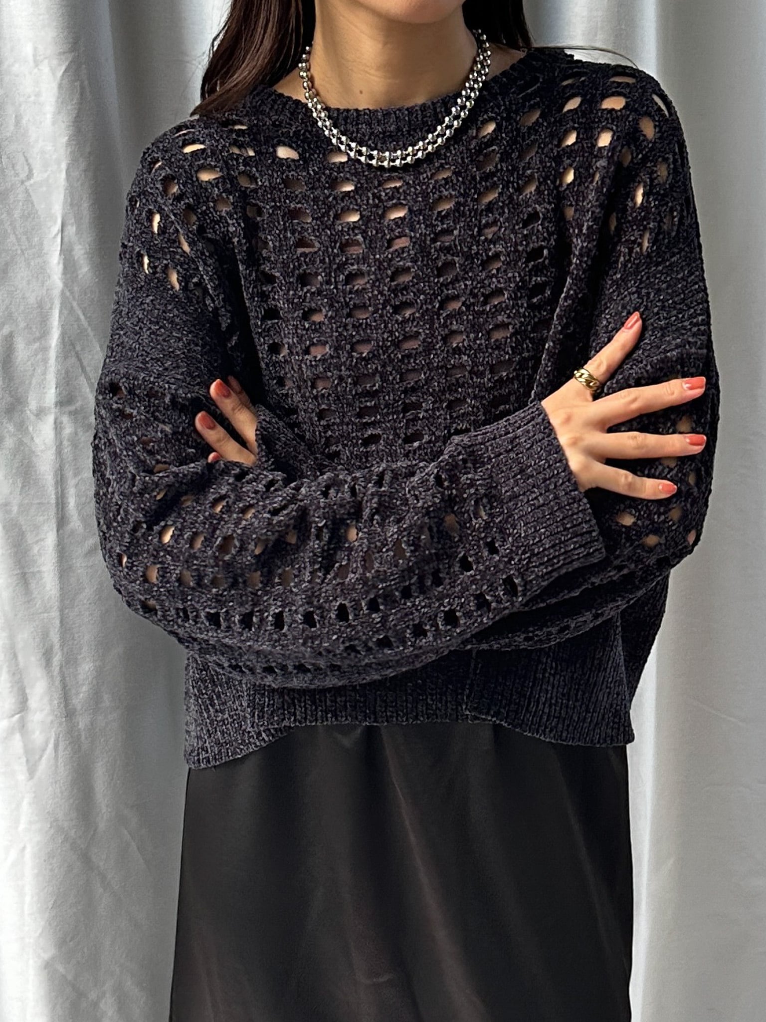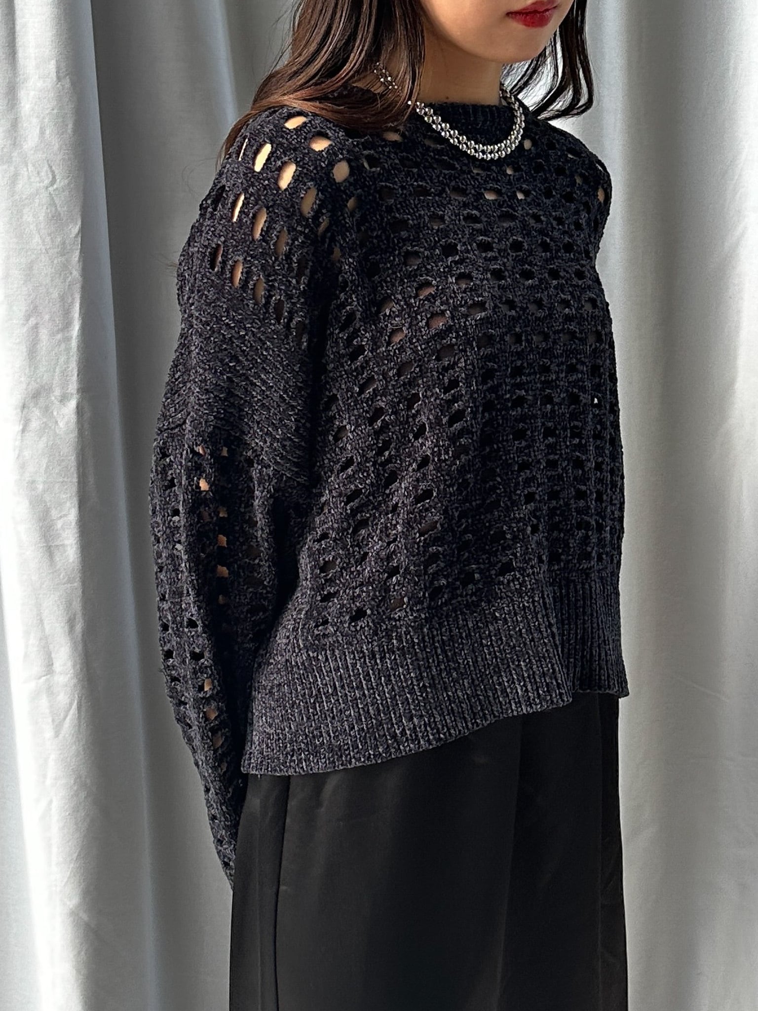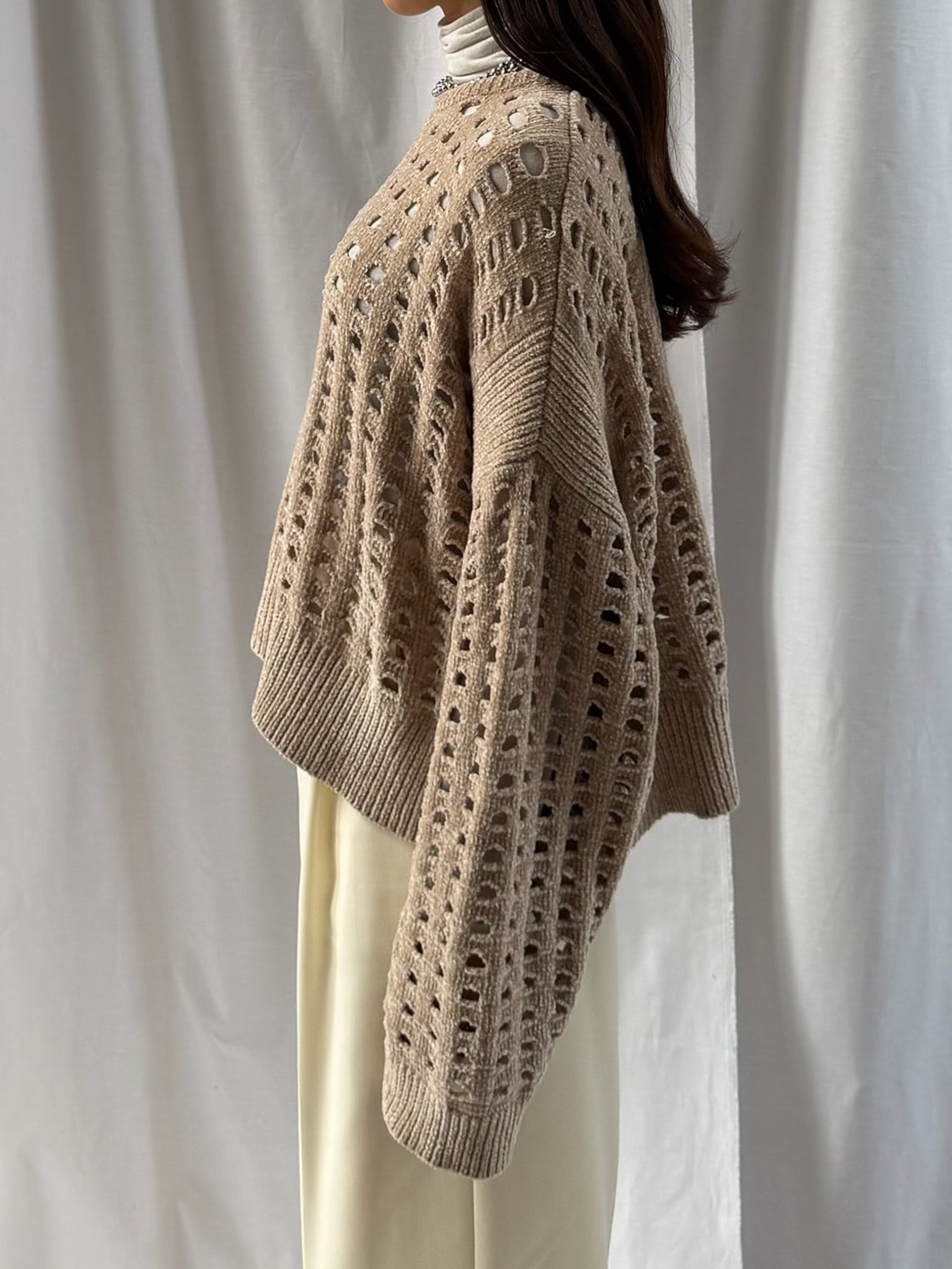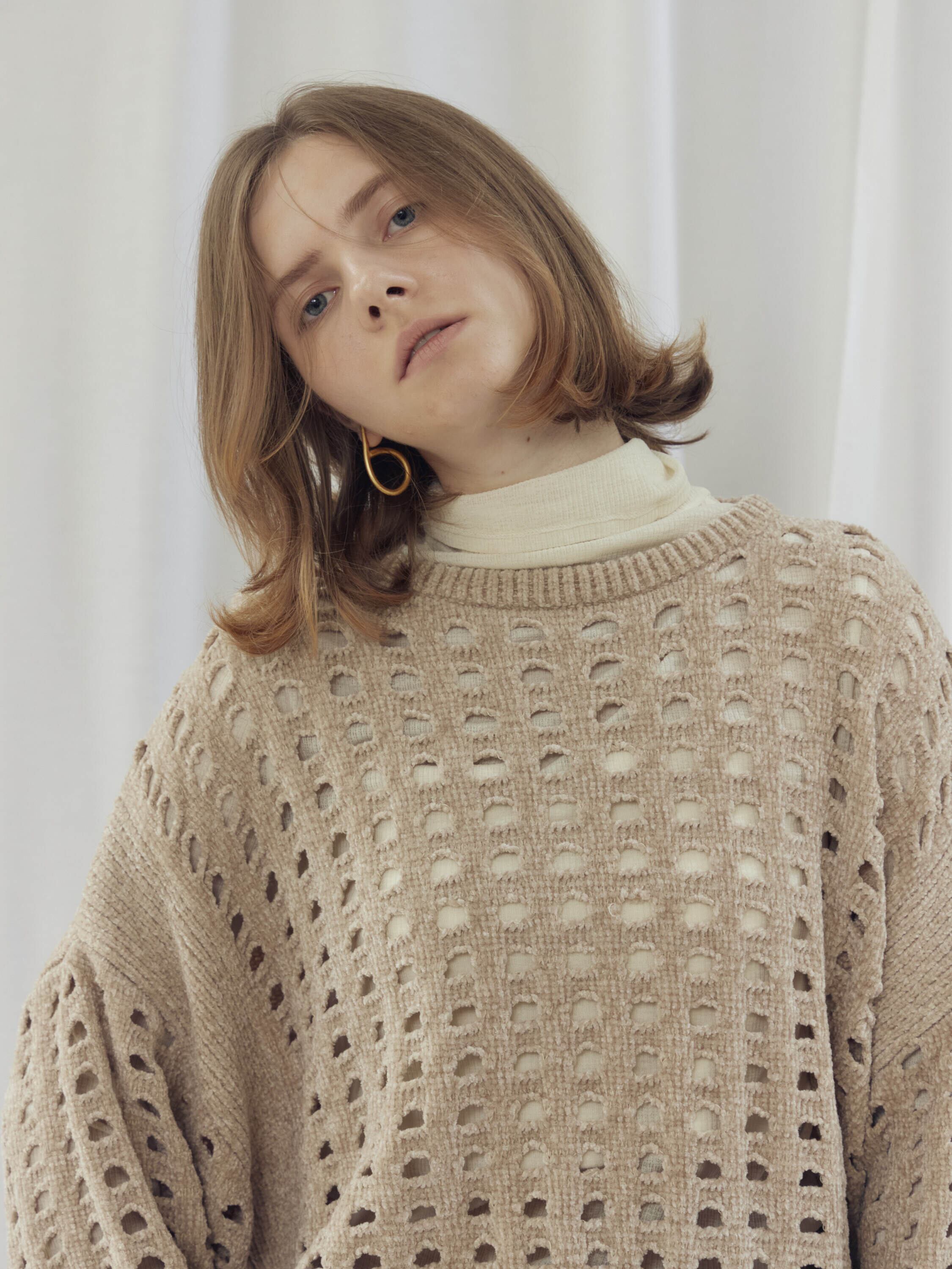 柔らかく肌触りの良いモールヤーンを使用したメッシュニット。程よい透け感のメッシュ編みがこなれた印象に。インナーを合わせやすいゆとりのあるサイズ感と、ほどよいクロップド丈で足長効果満載です。インナー次第でロングシーズン楽しめます。