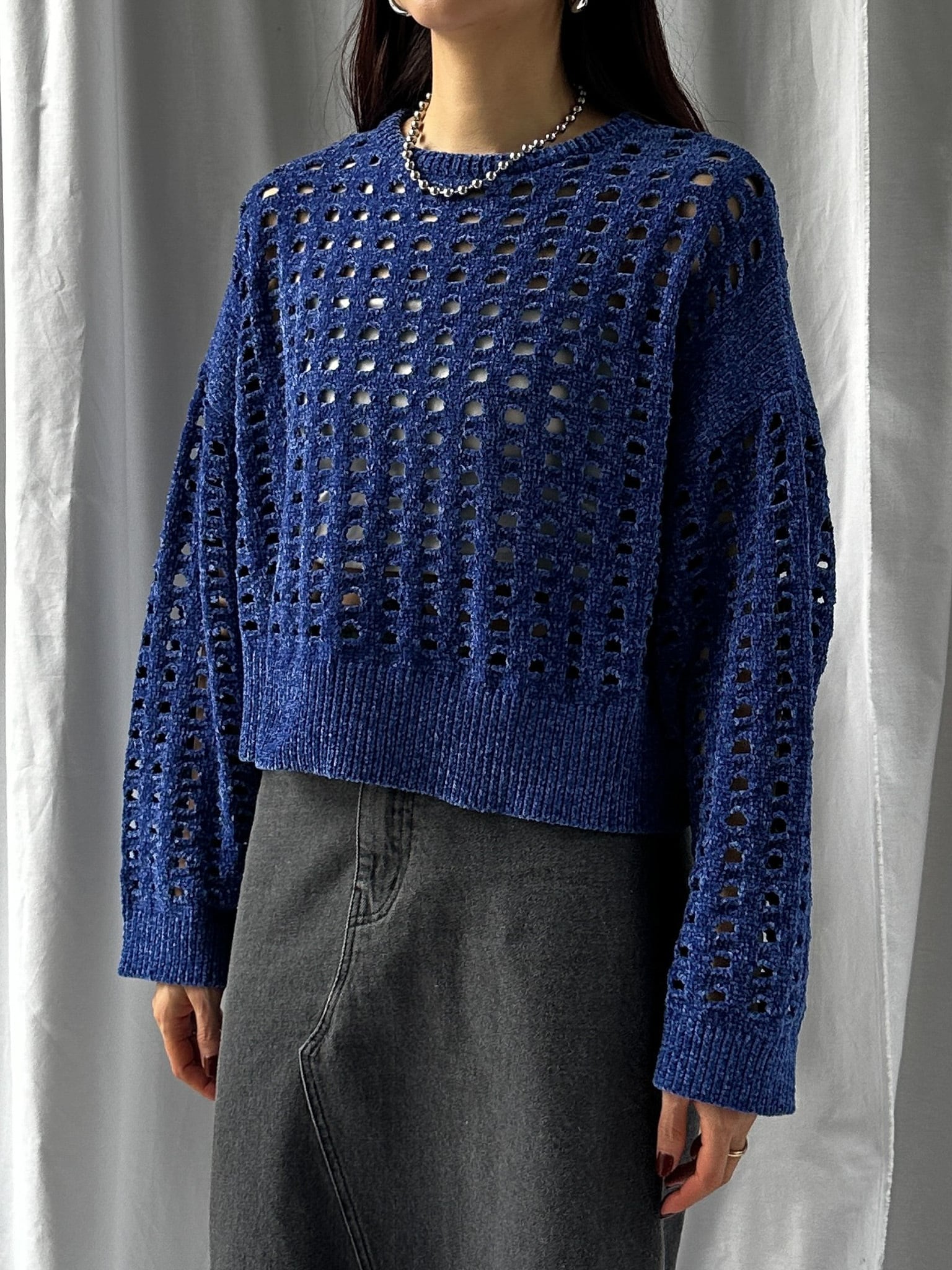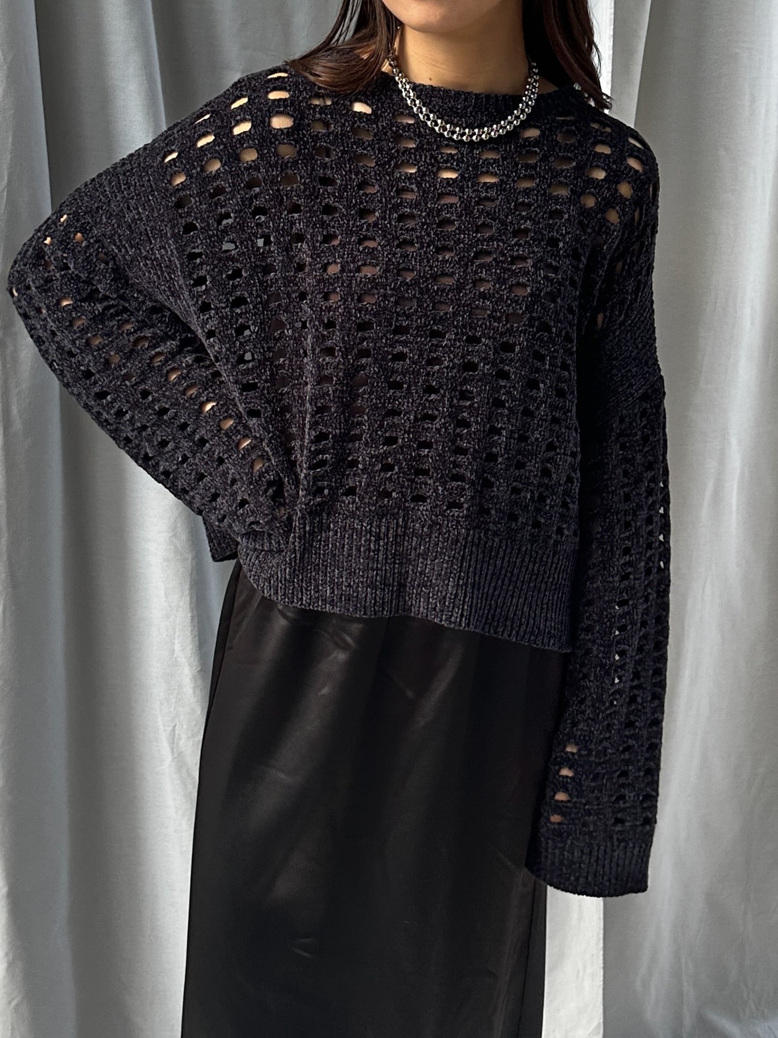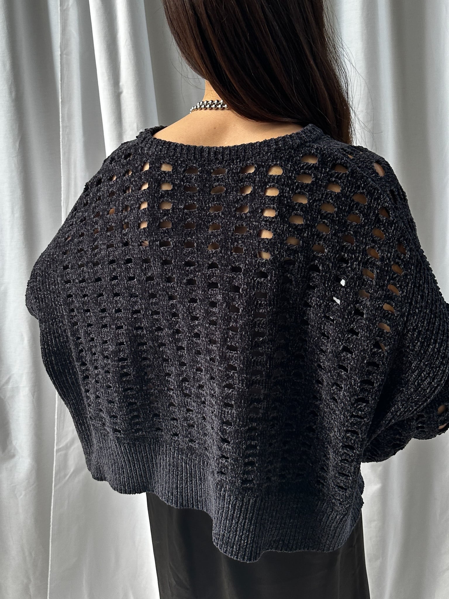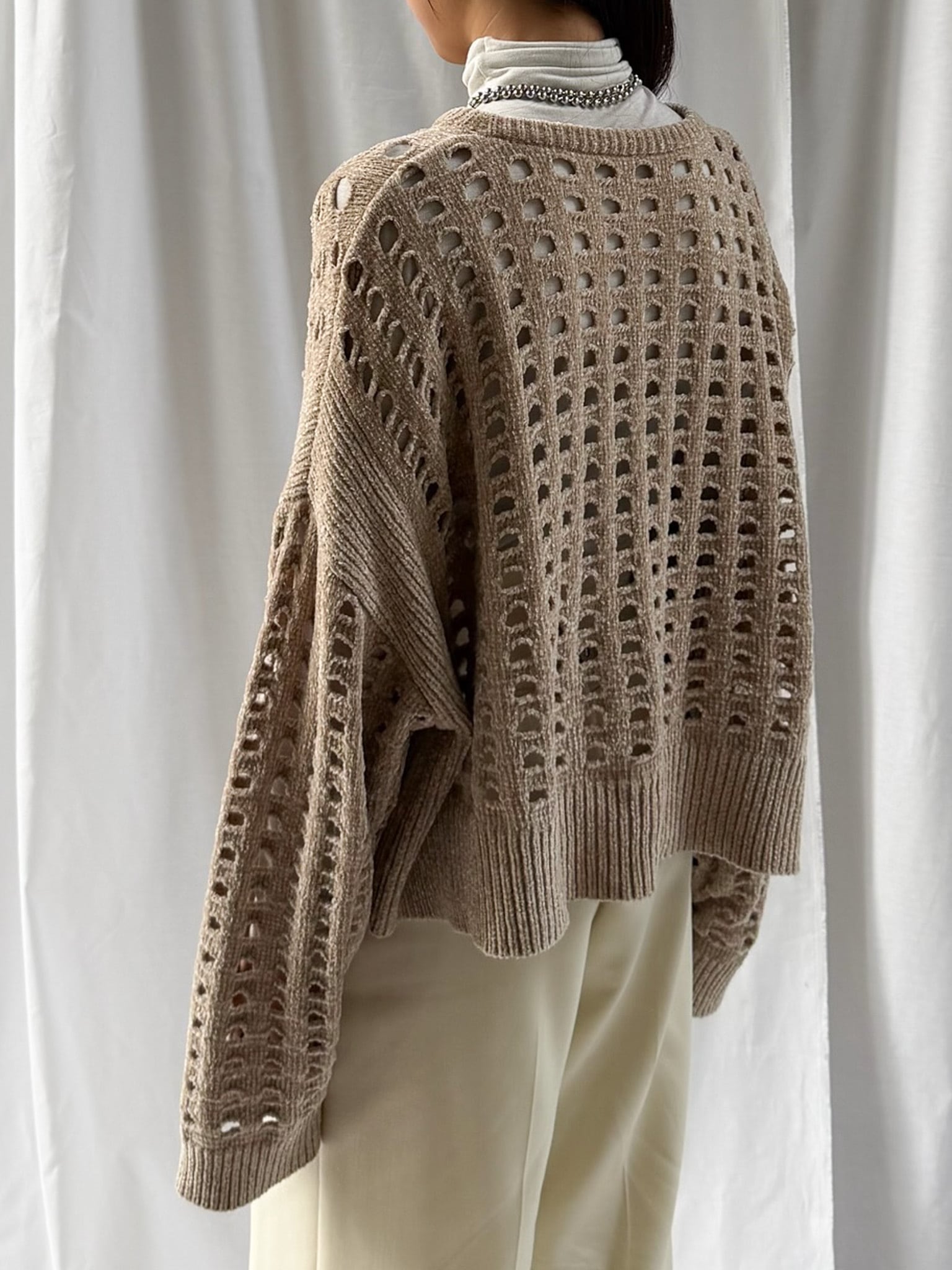 柔らかく肌触りの良いモールヤーンを使用したメッシュニット。程よい透け感のメッシュ編みがこなれた印象に。インナーを合わせやすいゆとりのあるサイズ感と、ほどよいクロップド丈で足長効果満載です。インナー次第でロングシーズン楽しめます。