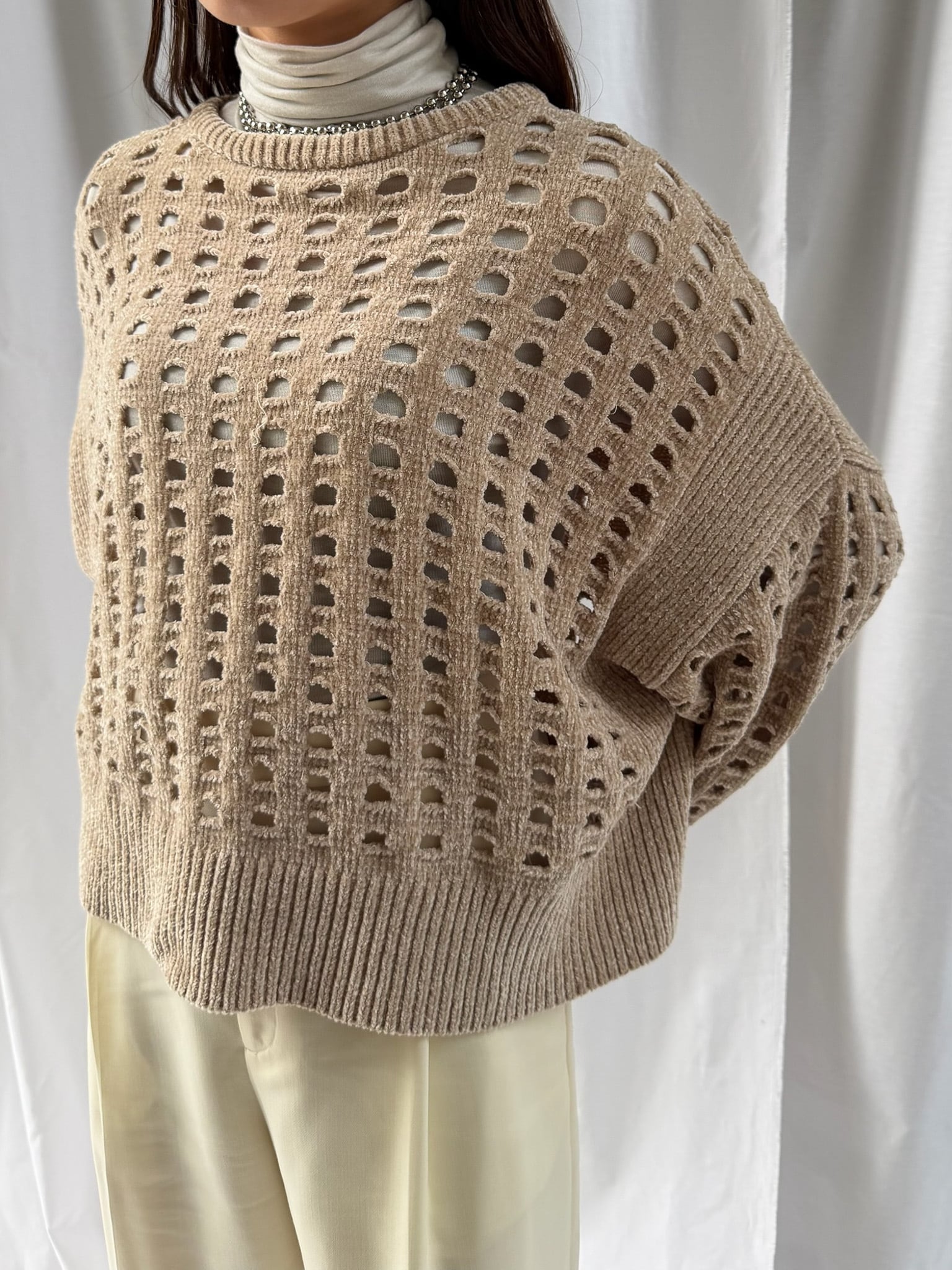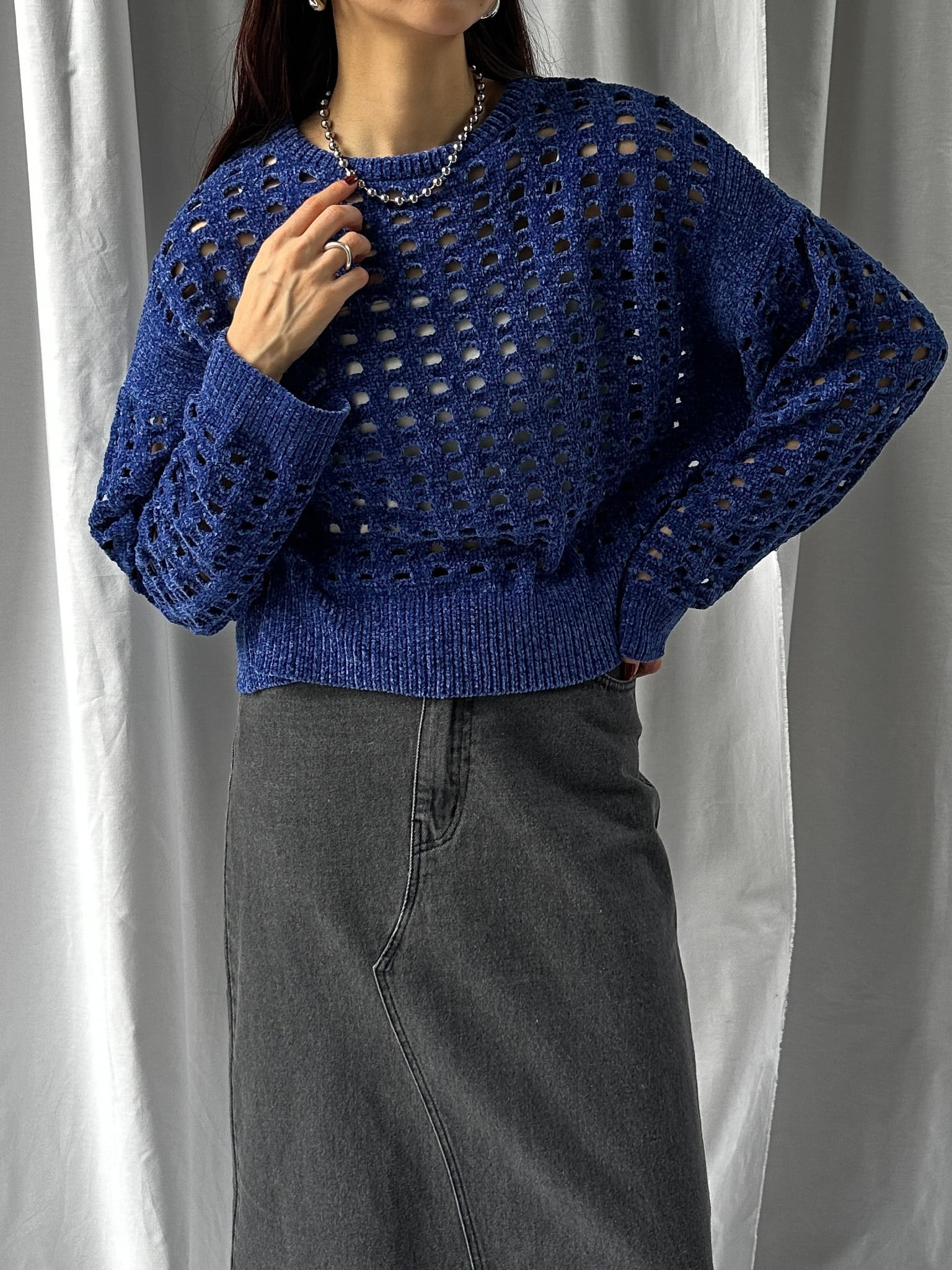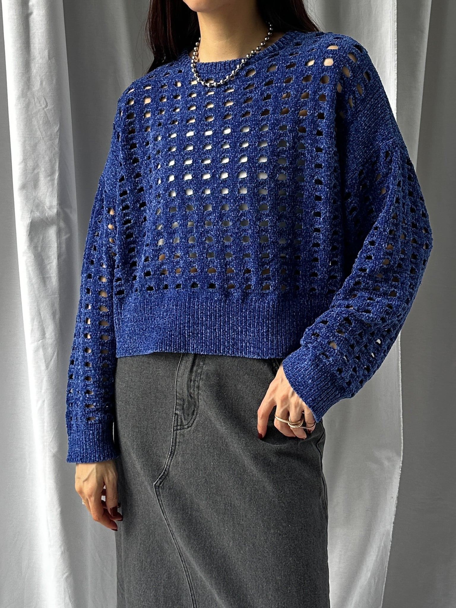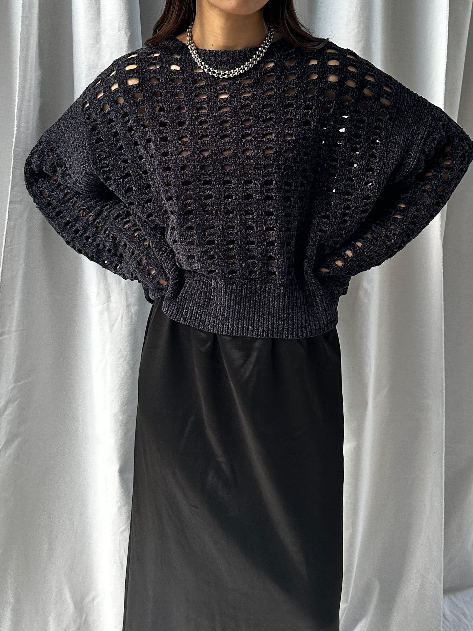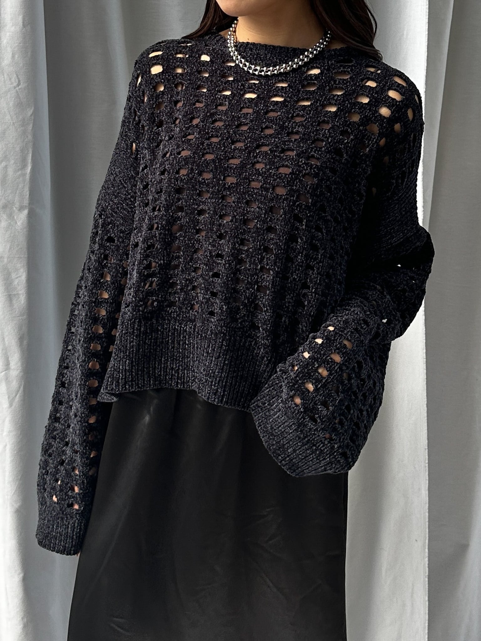 柔らかく肌触りの良いモールヤーンを使用したメッシュニット。程よい透け感のメッシュ編みがこなれた印象に。インナーを合わせやすいゆとりのあるサイズ感と、ほどよいクロップド丈で足長効果満載です。インナー次第でロングシーズン楽しめます。
