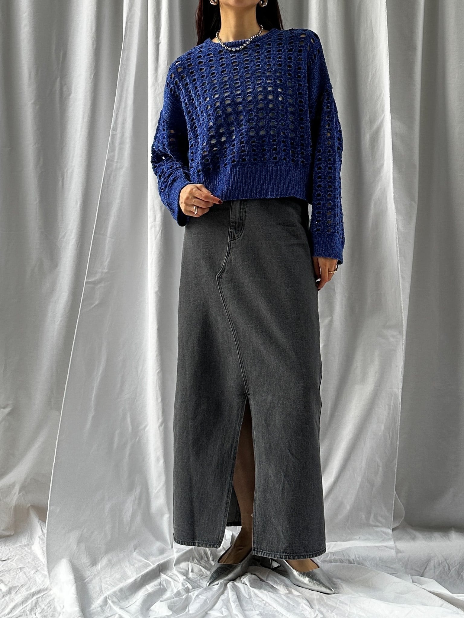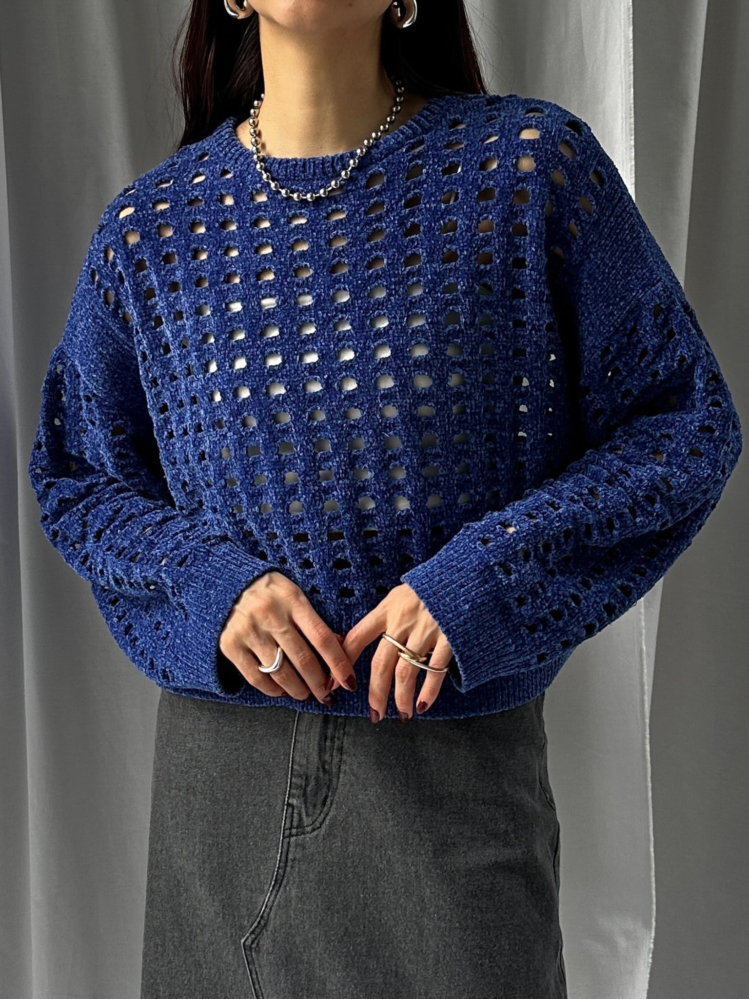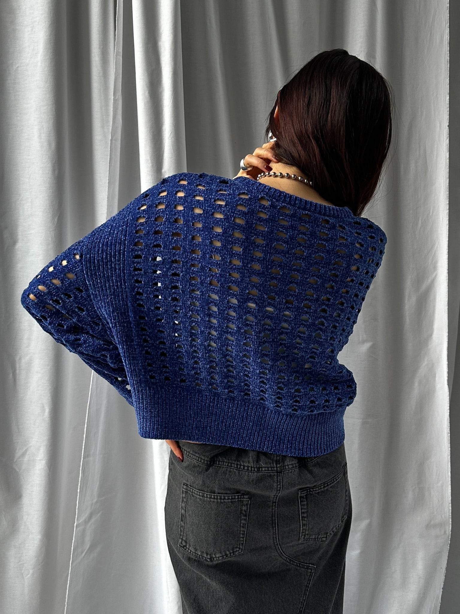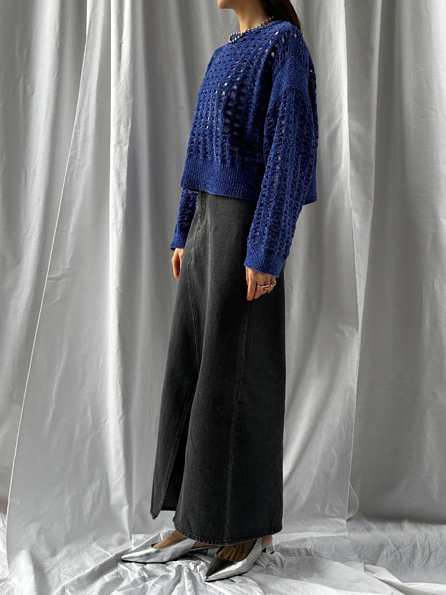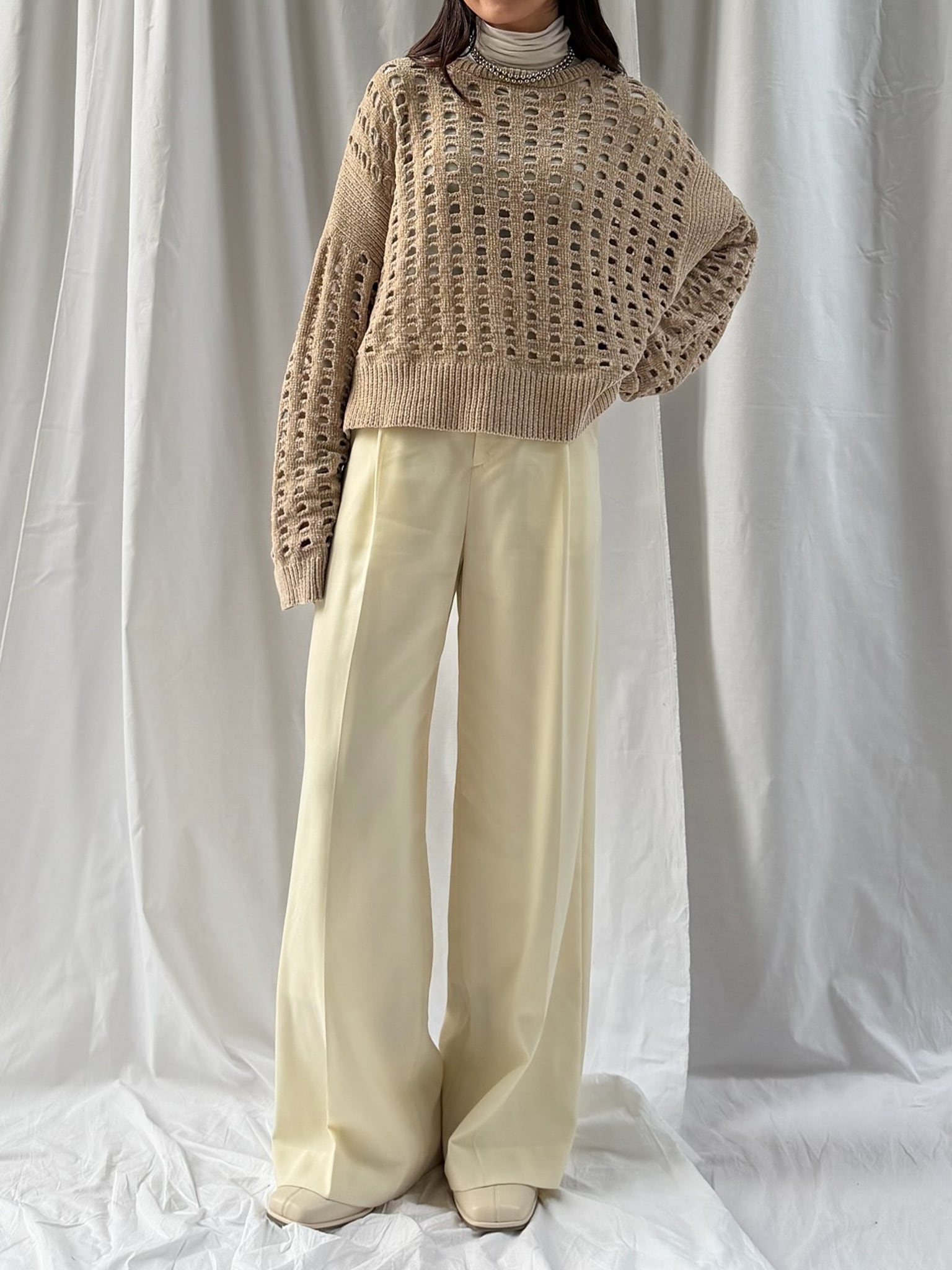 柔らかく肌触りの良いモールヤーンを使用したメッシュニット。程よい透け感のメッシュ編みがこなれた印象に。インナーを合わせやすいゆとりのあるサイズ感と、ほどよいクロップド丈で足長効果満載です。インナー次第でロングシーズン楽しめます。