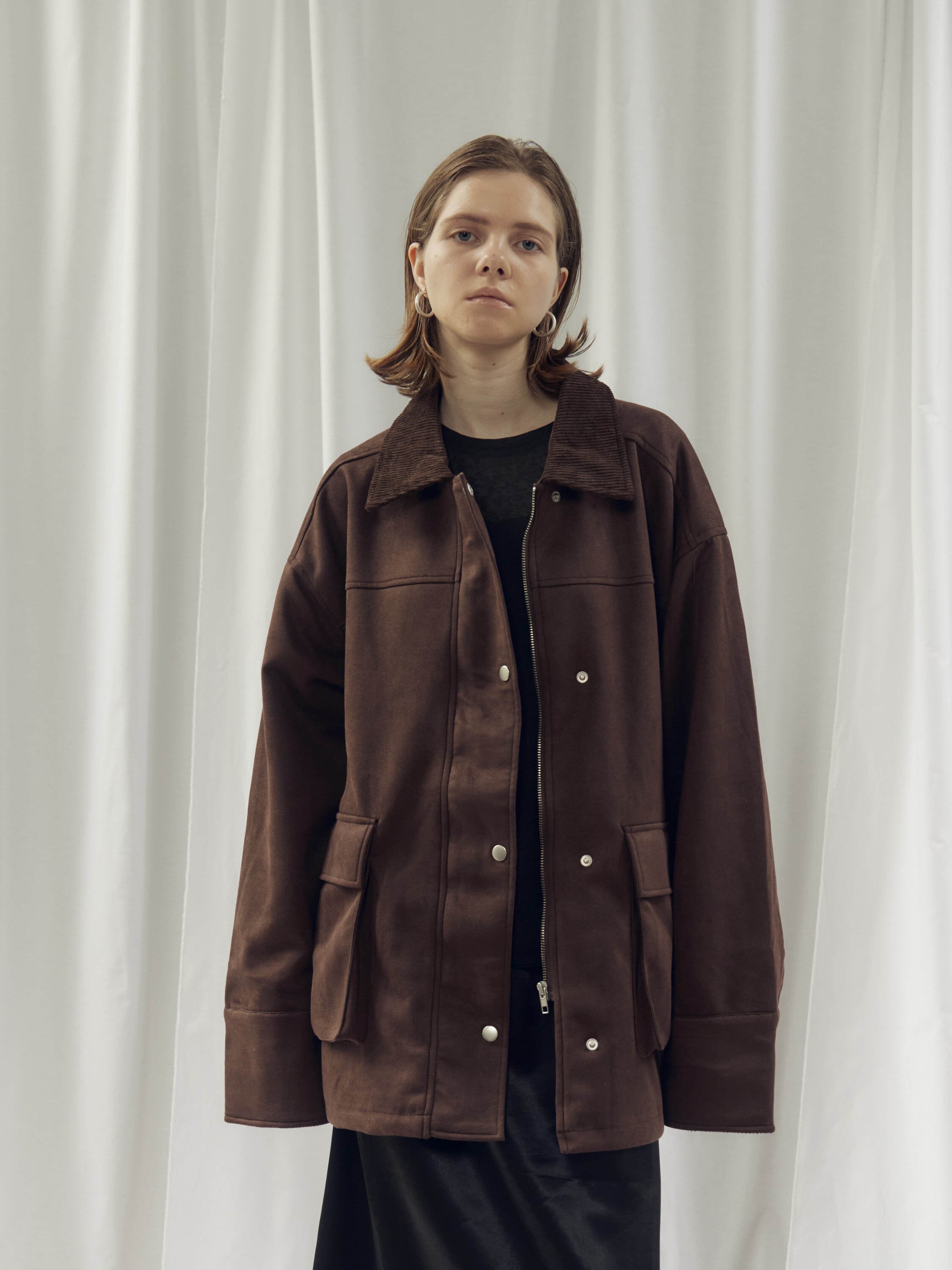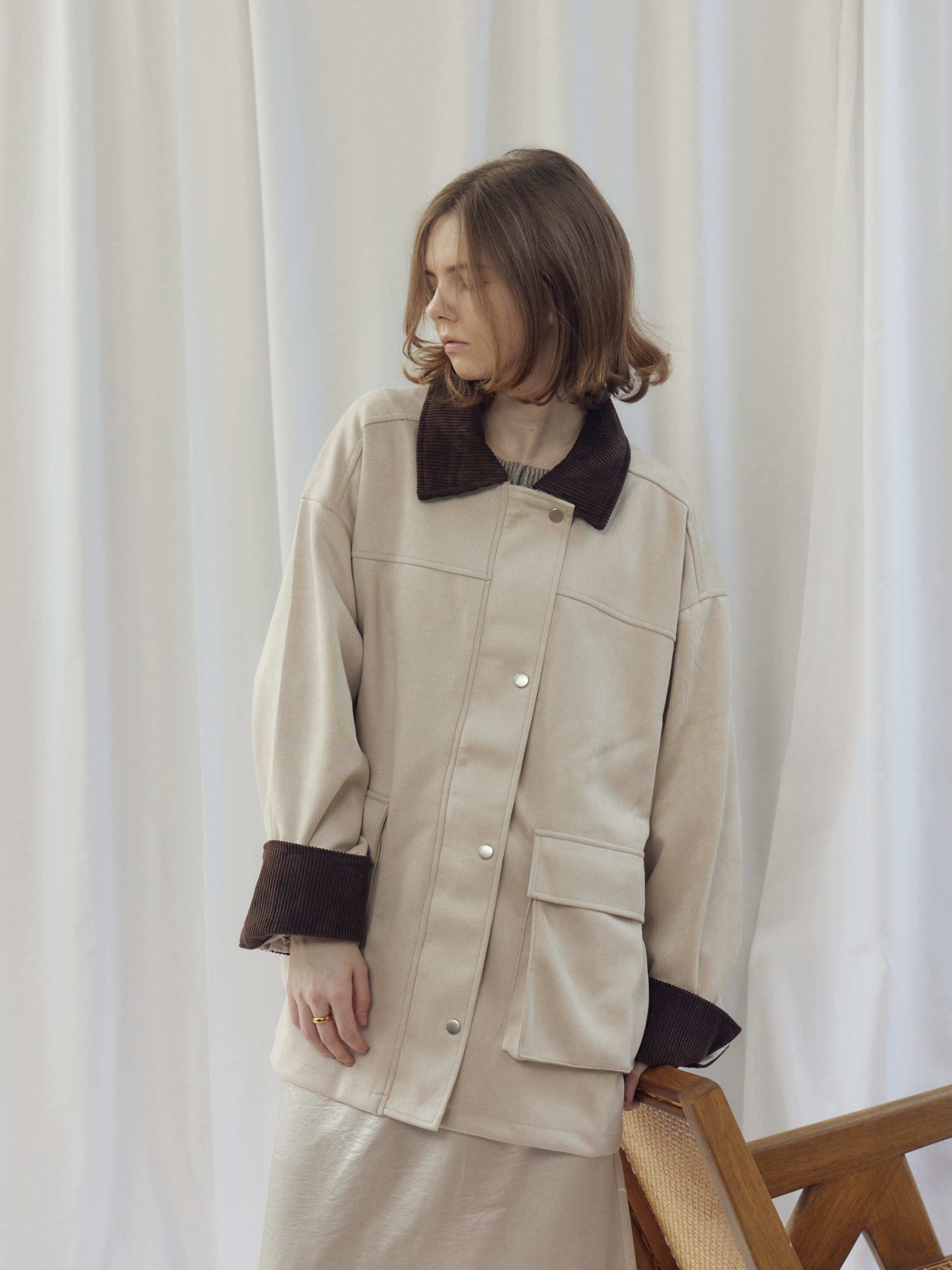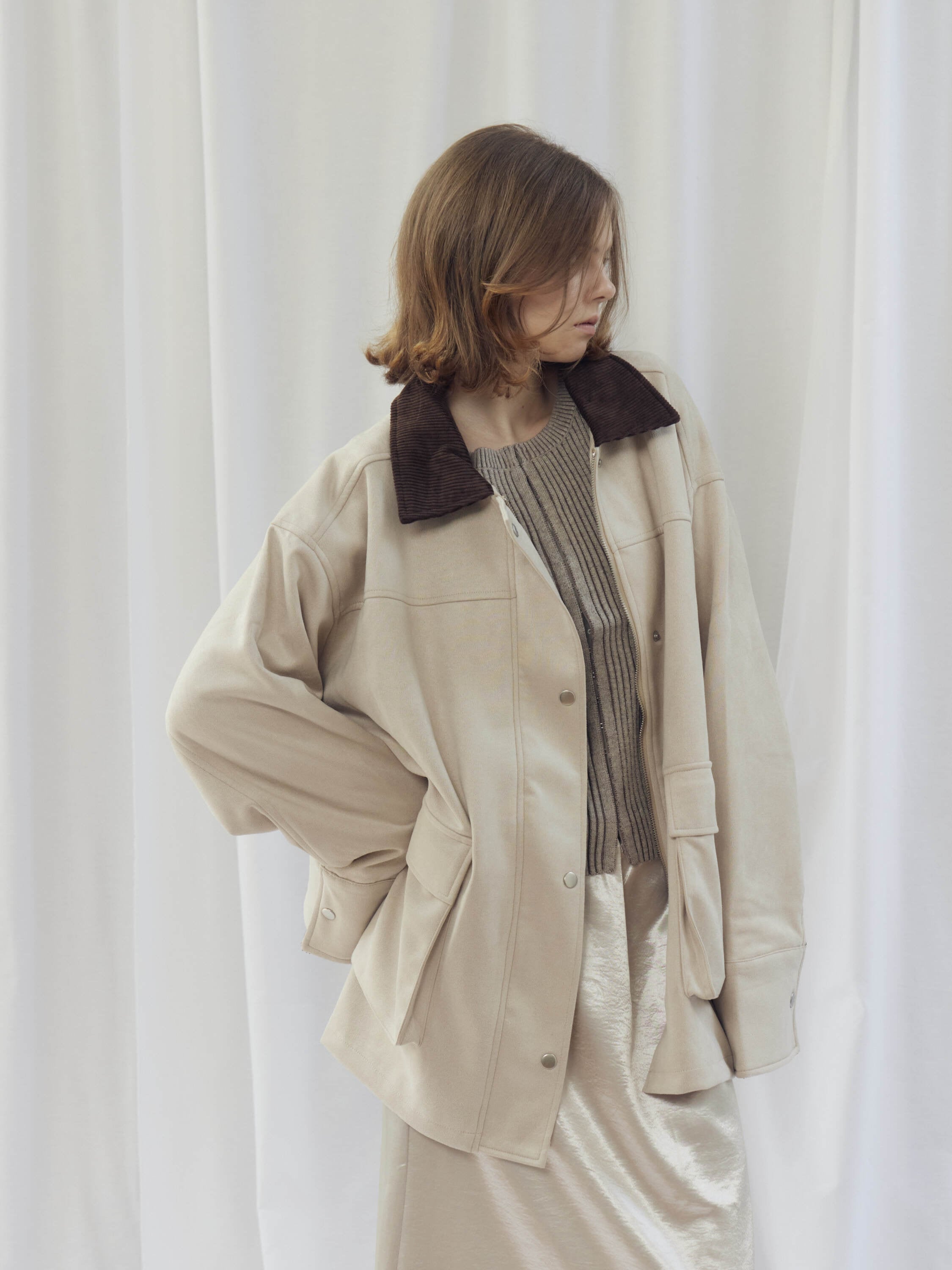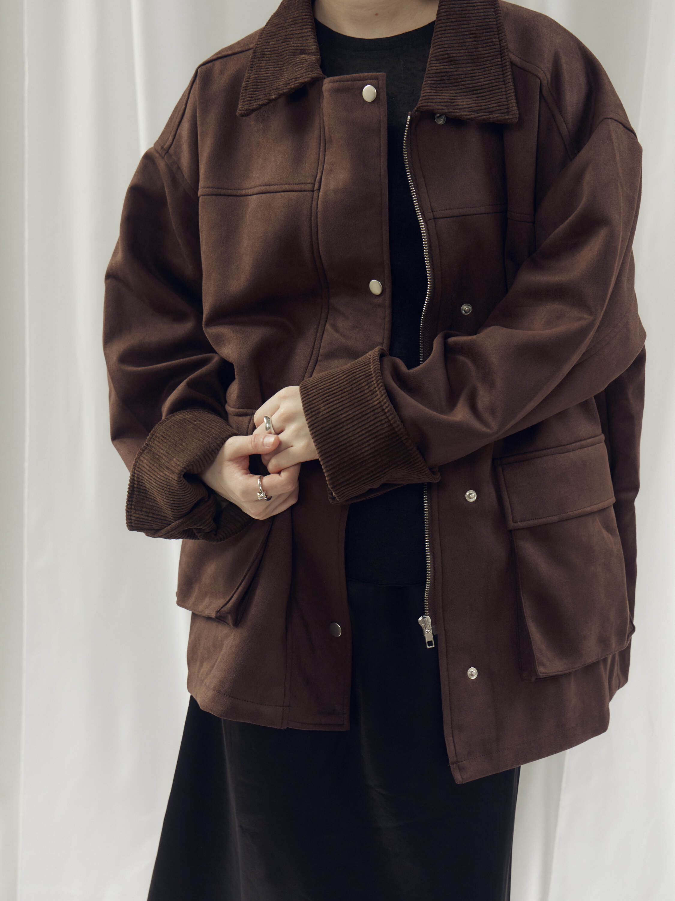衿とカフスの異素材ミックスが印象的なスエードジャケット。フェイクスエードを使用した秋冬らしい素材です。ゆったりとしたサイズ感で、厚手のニットを仕込んでロングシーズン着用可能。フロントの大きめなポケットが目を惹き、デザイン性と利便性を兼ね備えたアイテムです。