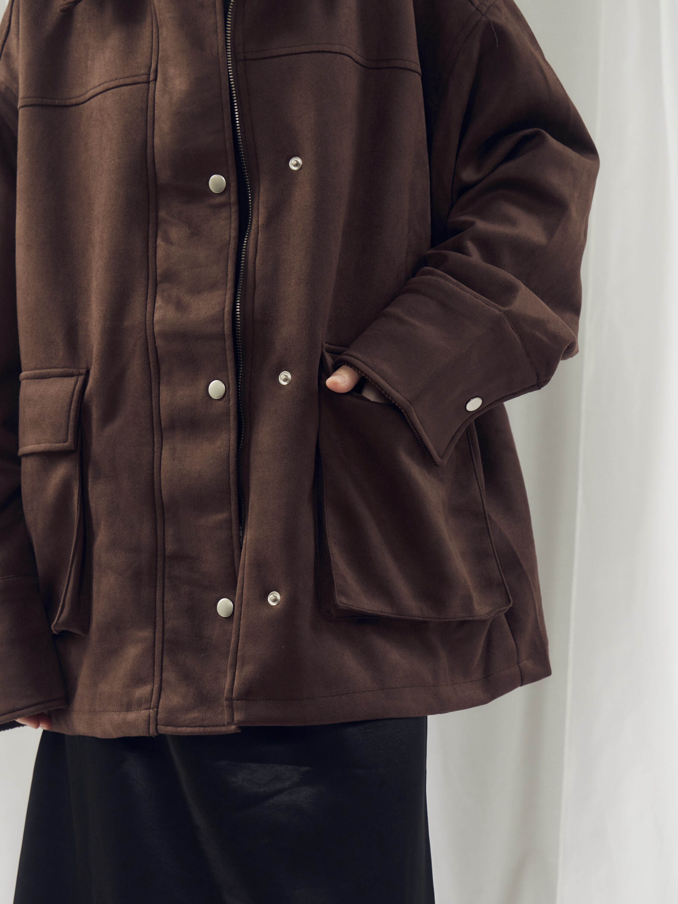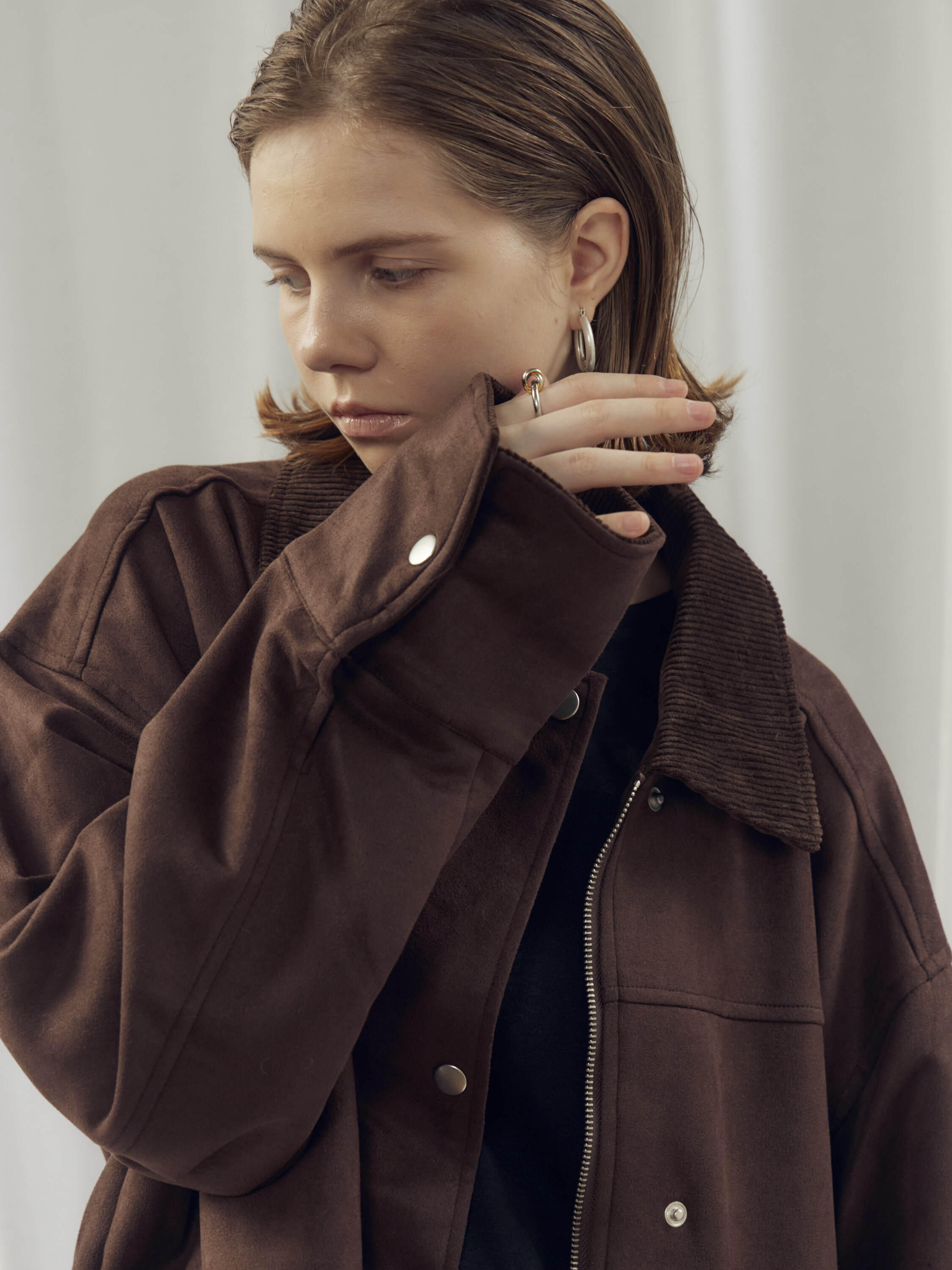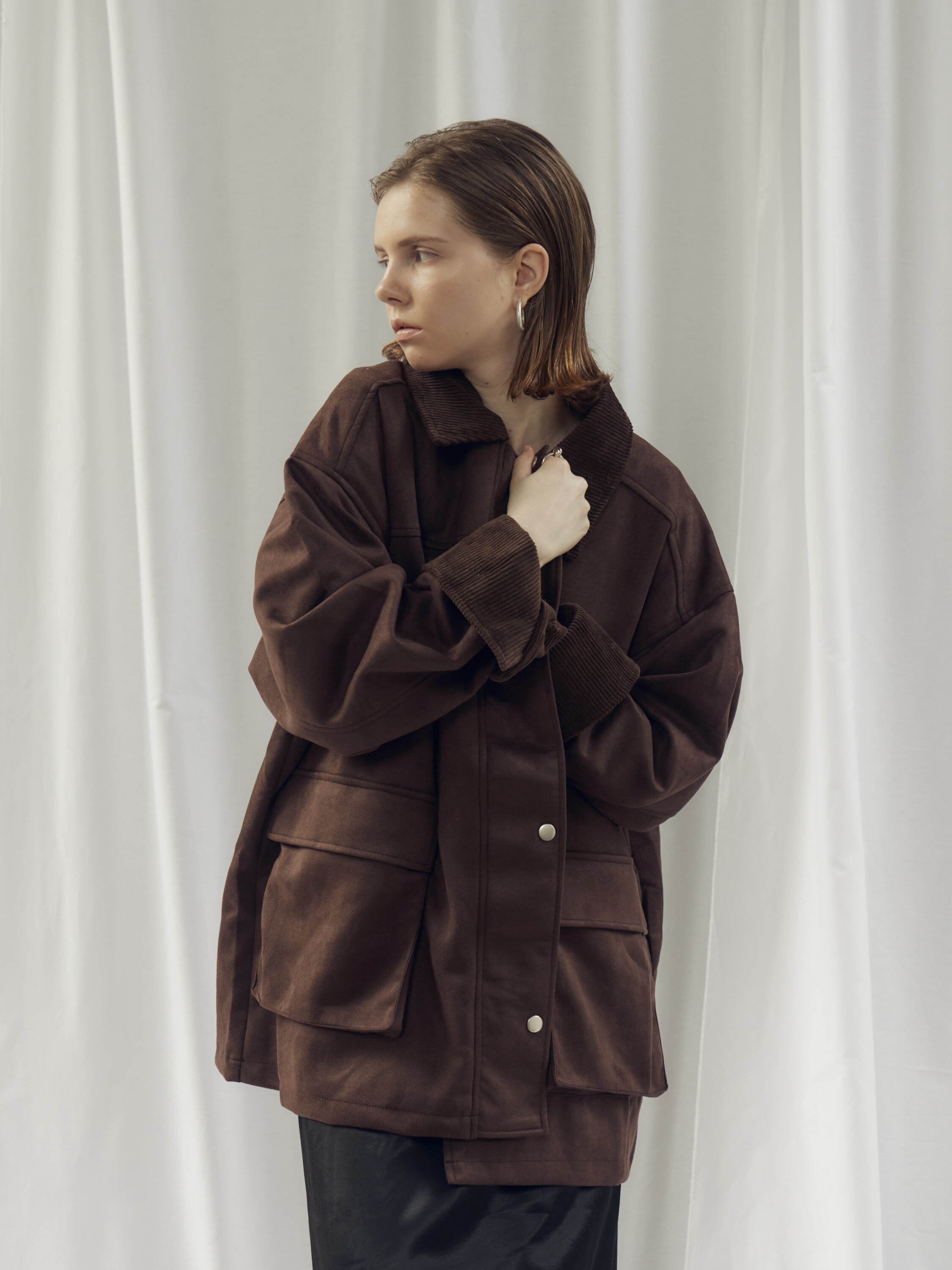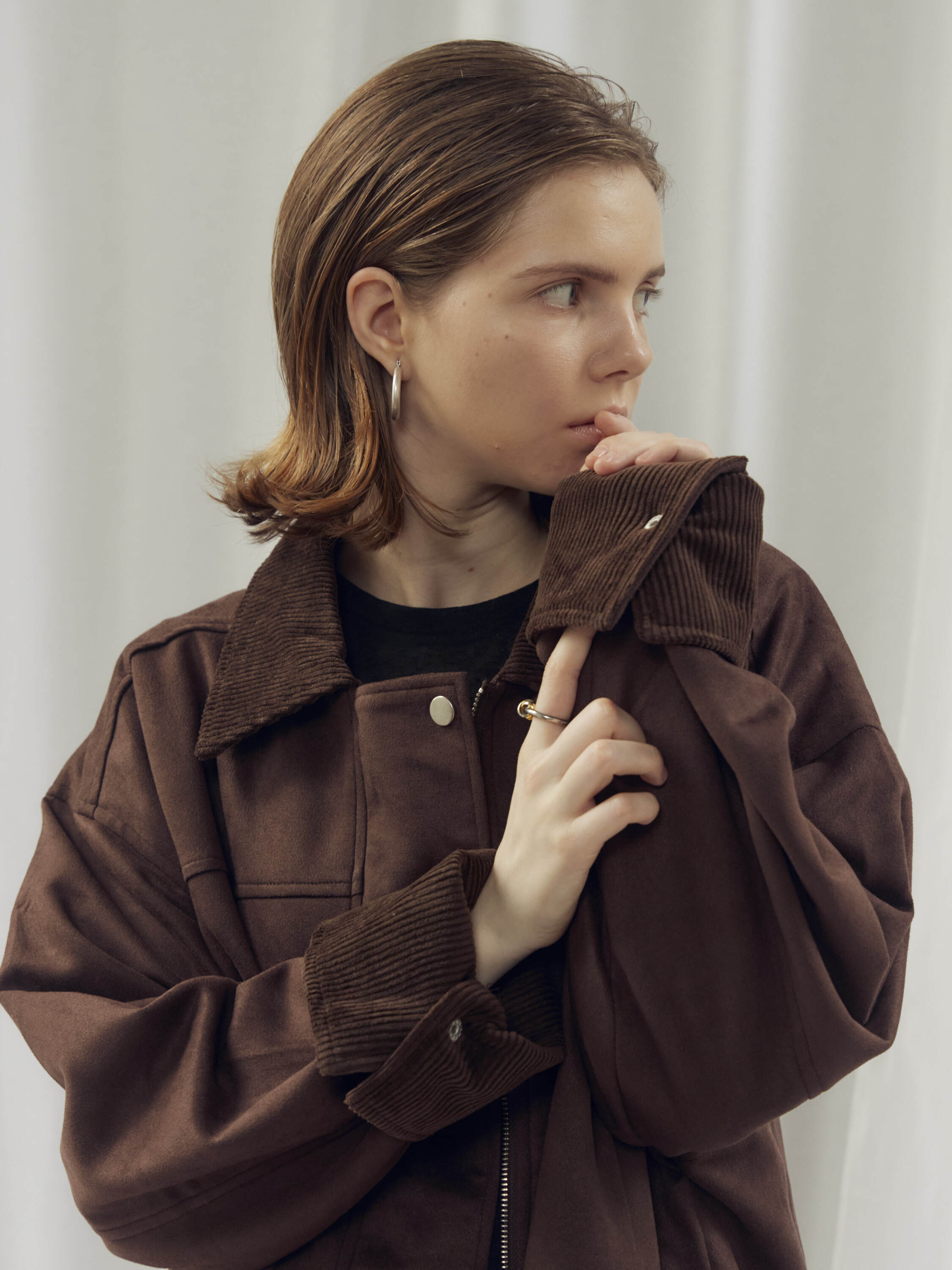 衿とカフスの異素材ミックスが印象的なスエードジャケット。フェイクスエードを使用した秋冬らしい素材です。ゆったりとしたサイズ感で、厚手のニットを仕込んでロングシーズン着用可能。フロントの大きめなポケットが目を惹き、デザイン性と利便性を兼ね備えたアイテムです。