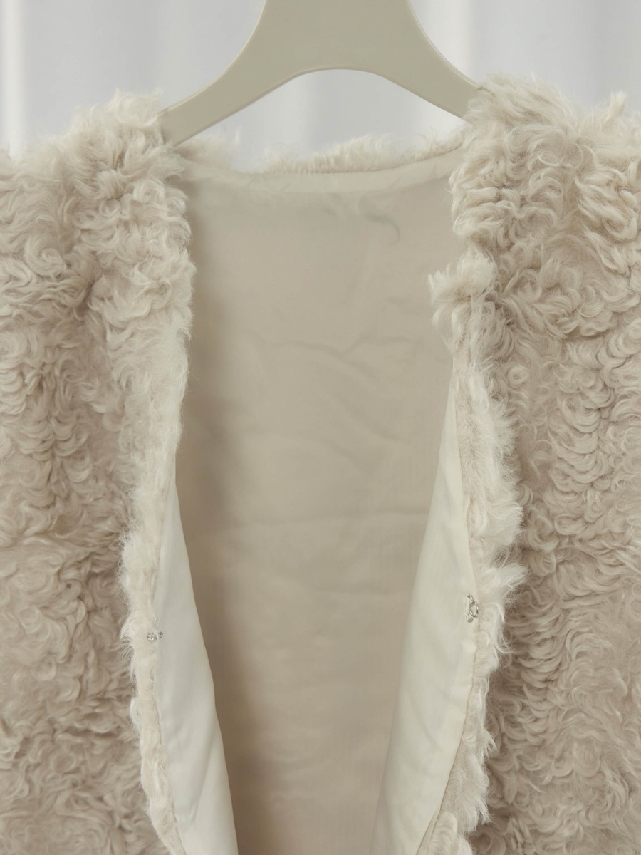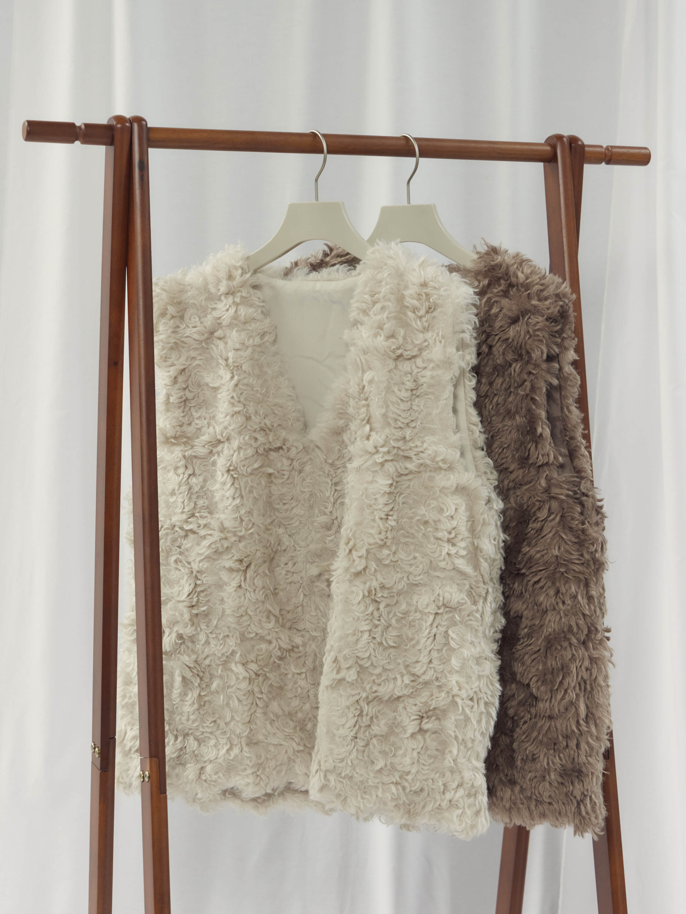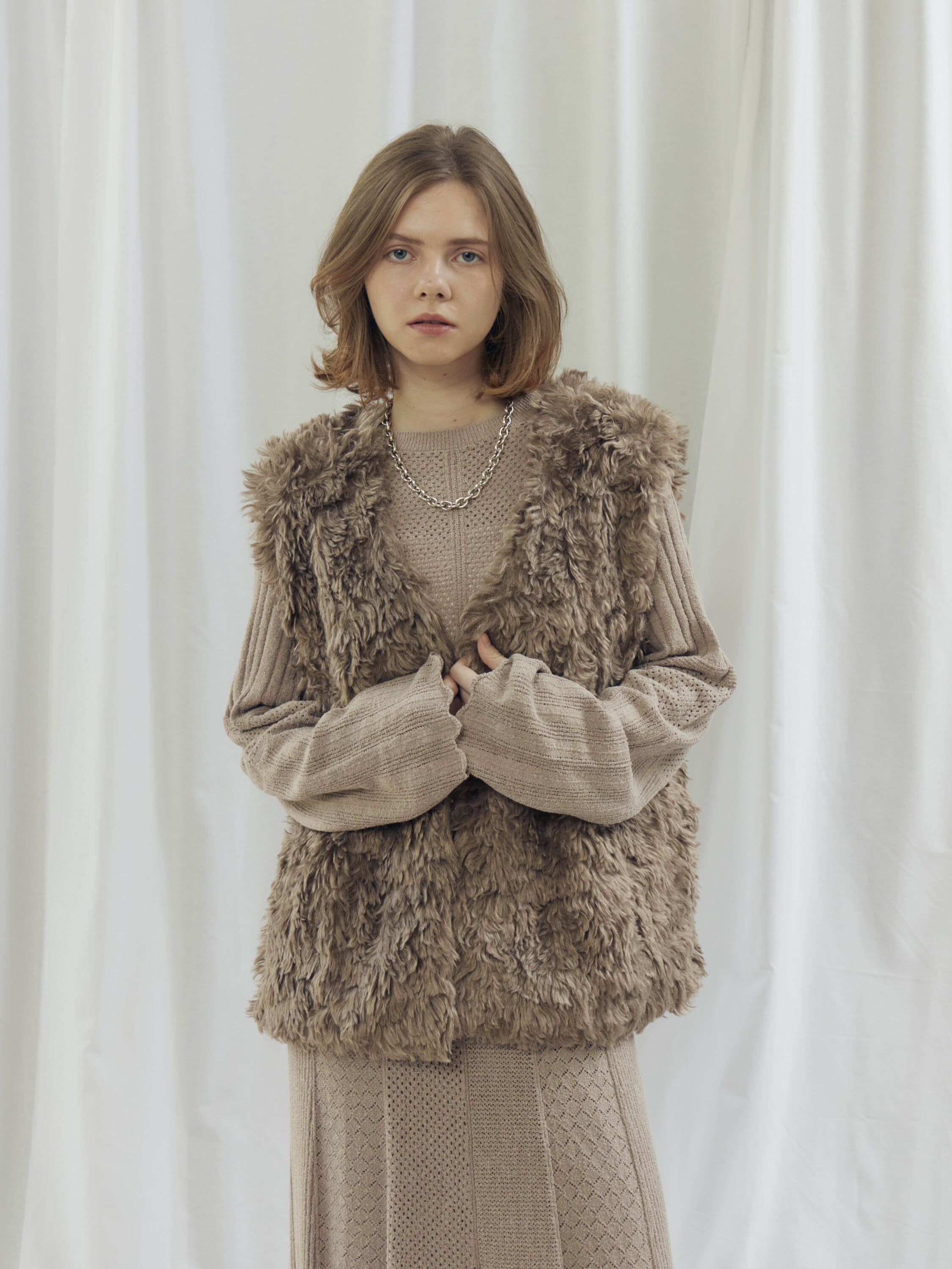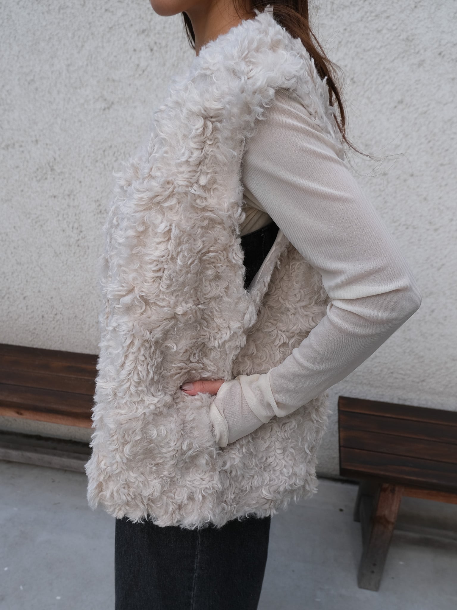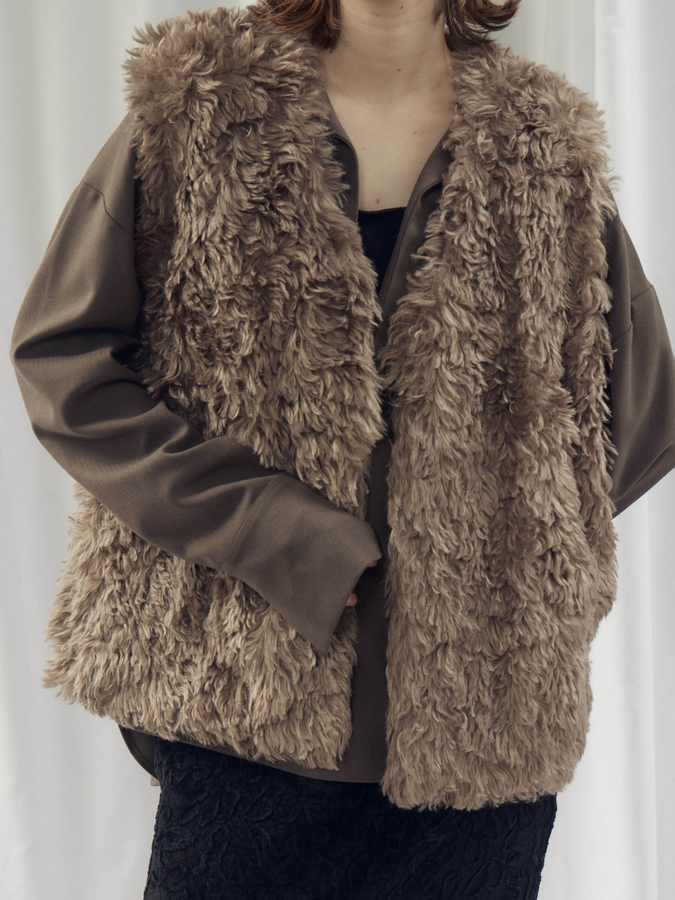 ふわっとしたフェイクファー素材のノーカラーベスト。軽やかで暖かみがあり、羽織るだけでコーディネートに華やかさをプラスしてくれます。レイヤードしやすいサイズ感で、パンツにもスカートにも相性抜群な一枚です。