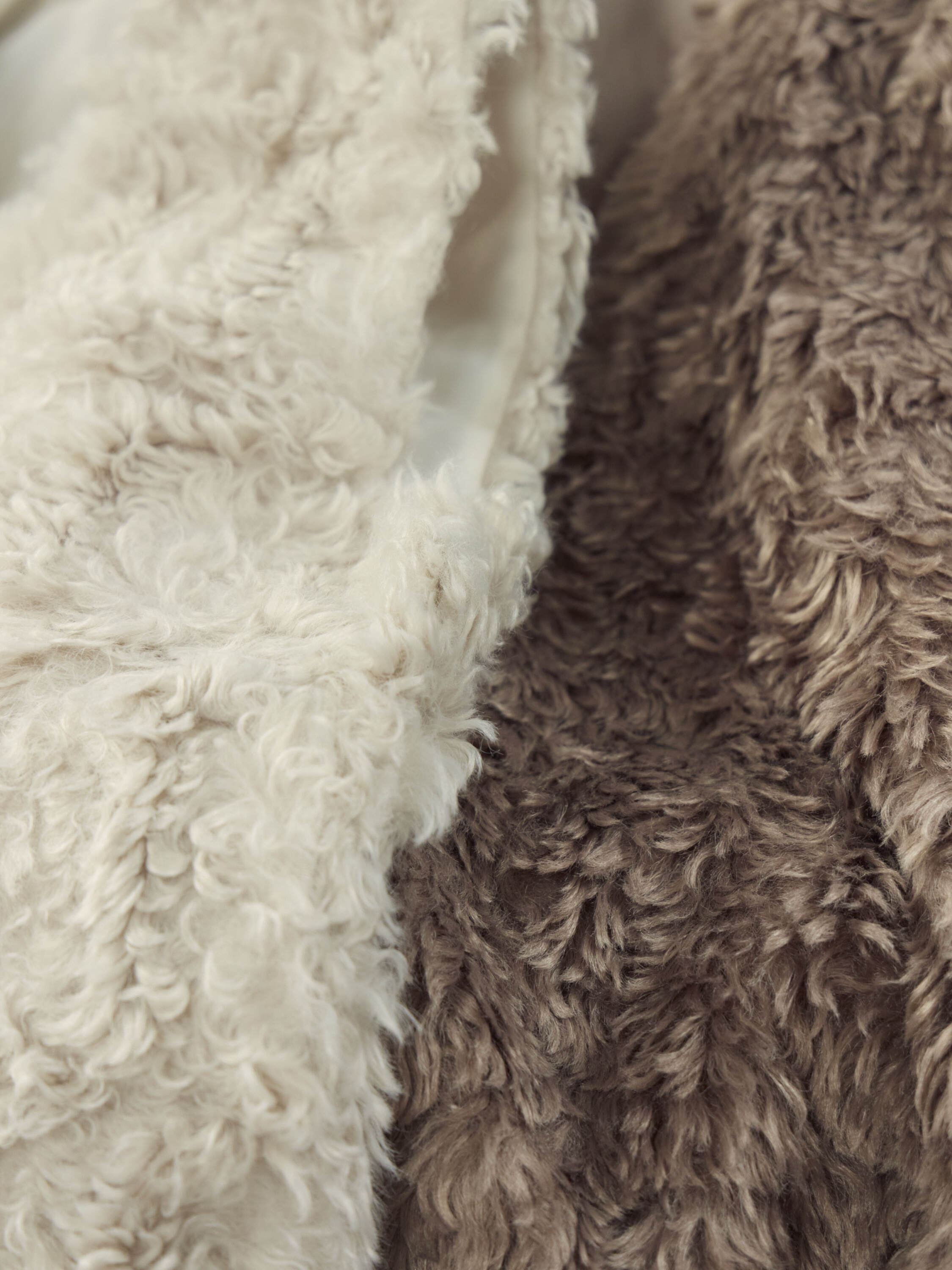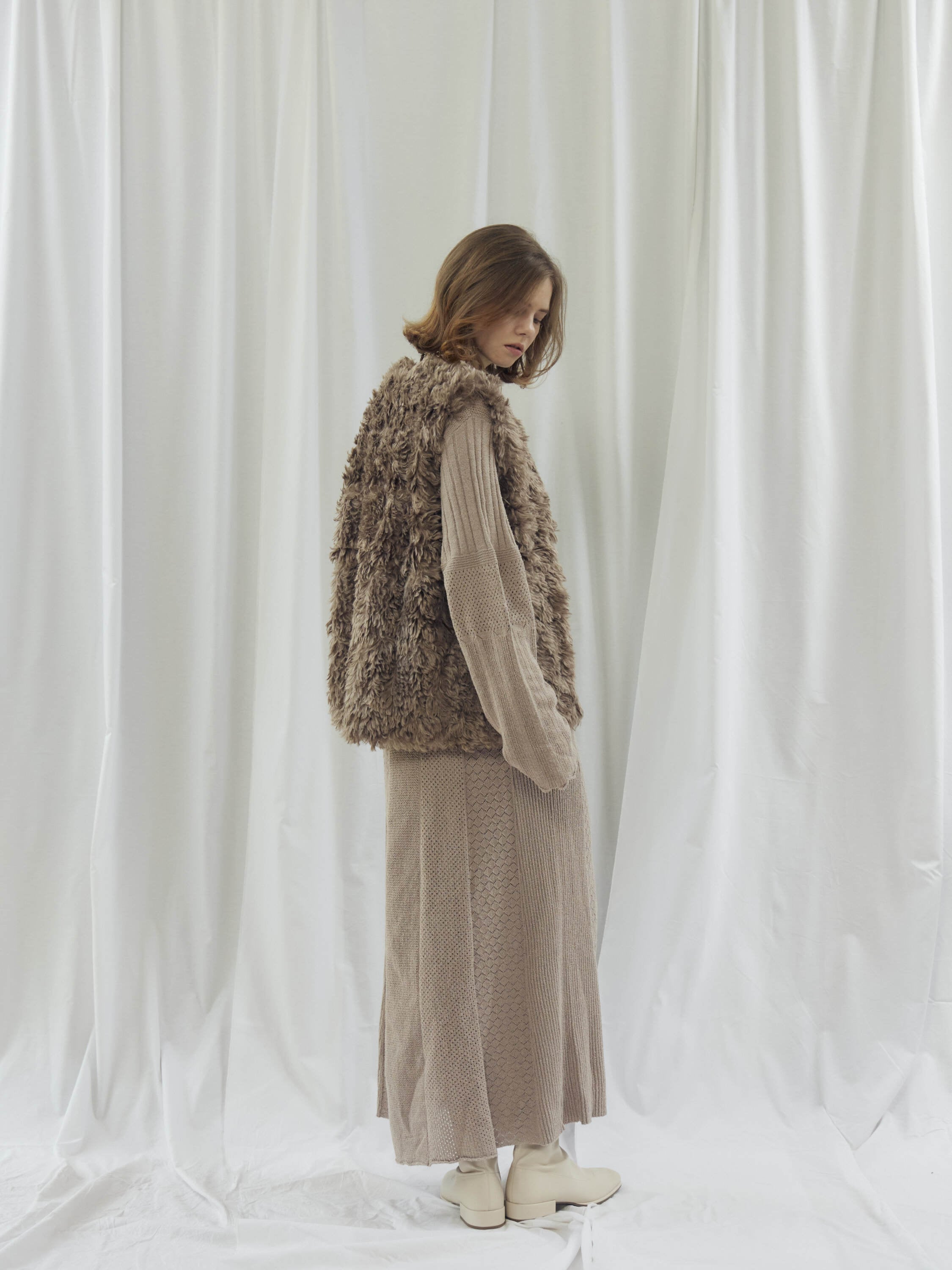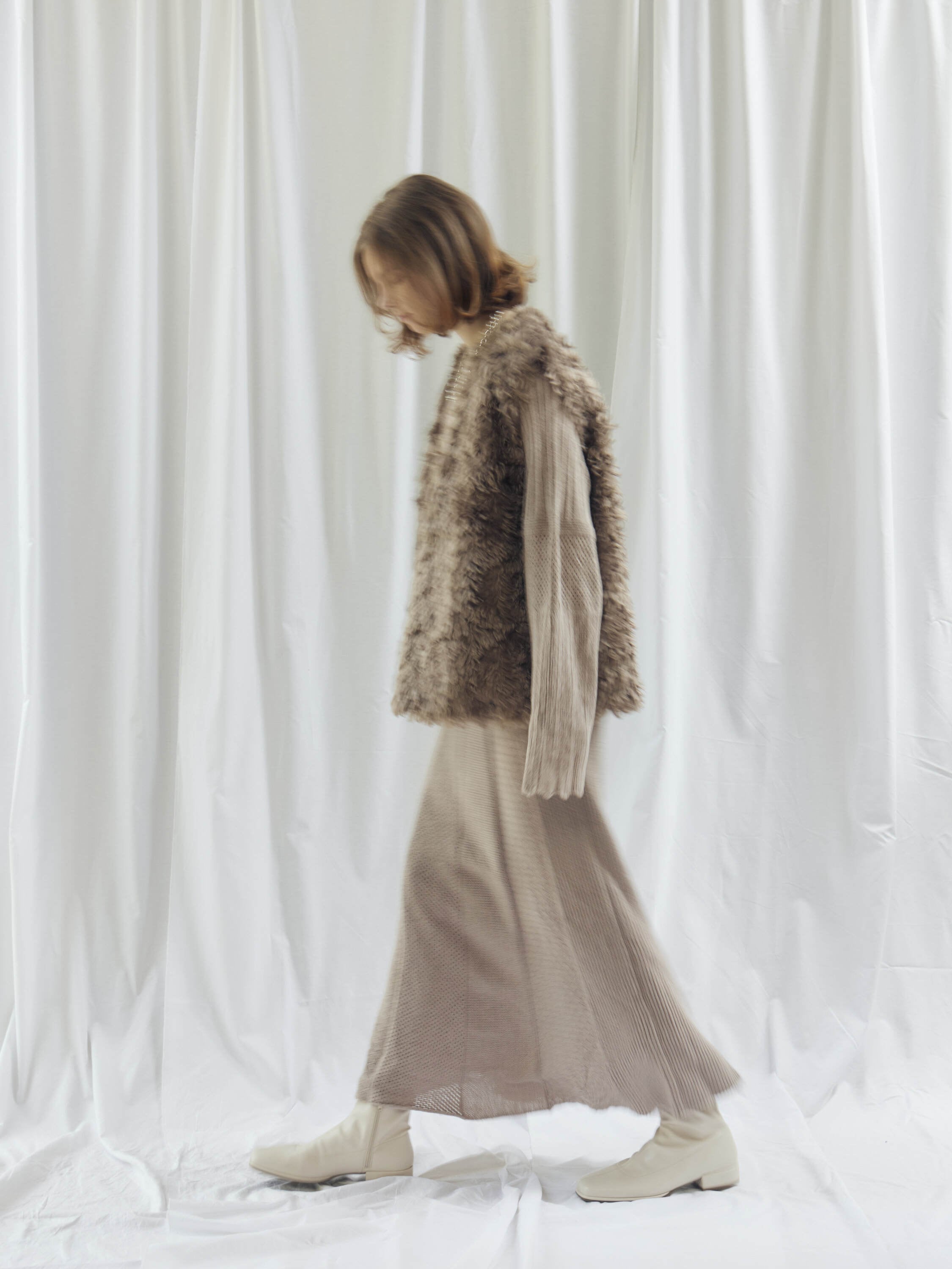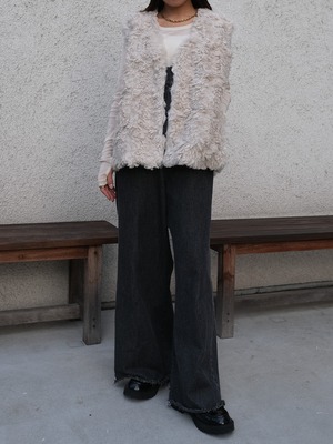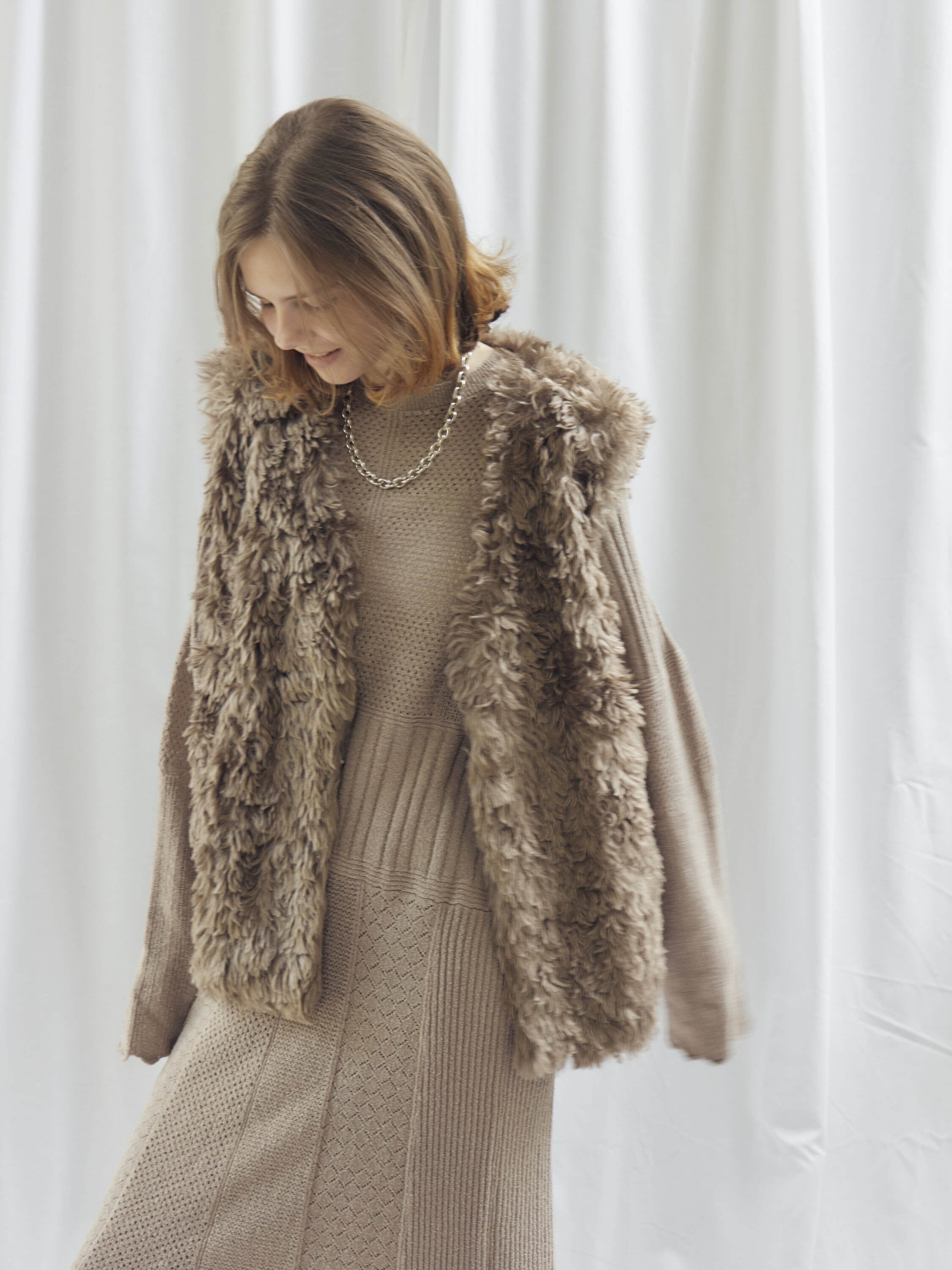 ふわっとしたフェイクファー素材のノーカラーベスト。軽やかで暖かみがあり、羽織るだけでコーディネートに華やかさをプラスしてくれます。レイヤードしやすいサイズ感で、パンツにもスカートにも相性抜群な一枚です。