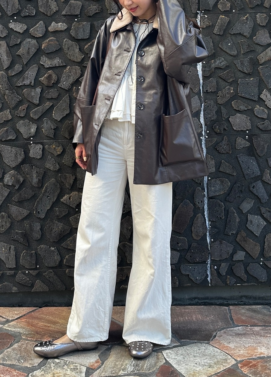 まるでリアルレザーのような重厚感ある素材感のジャケット。羽織るだけでシーズンムードを高めてくれます。柔らかな女性らしい印象をプラスしてくれるボア襟は、取り外しが可能です。