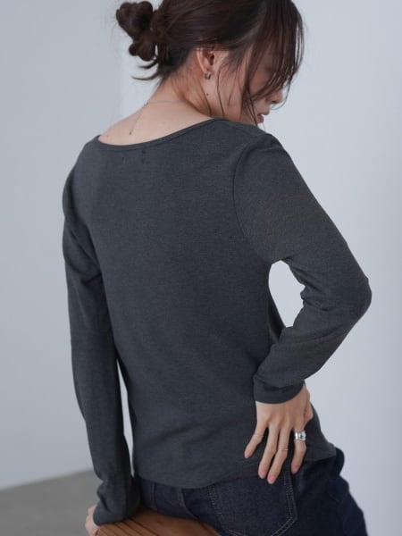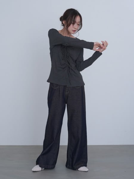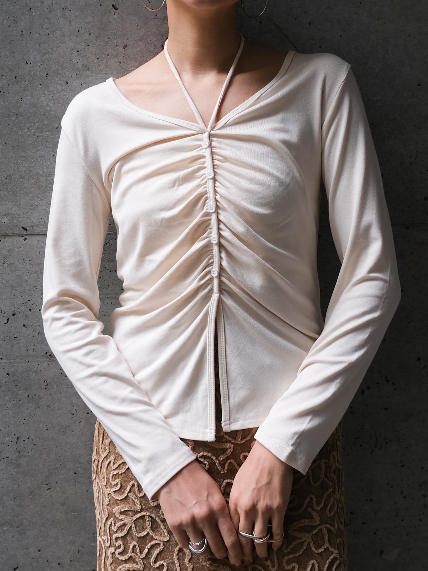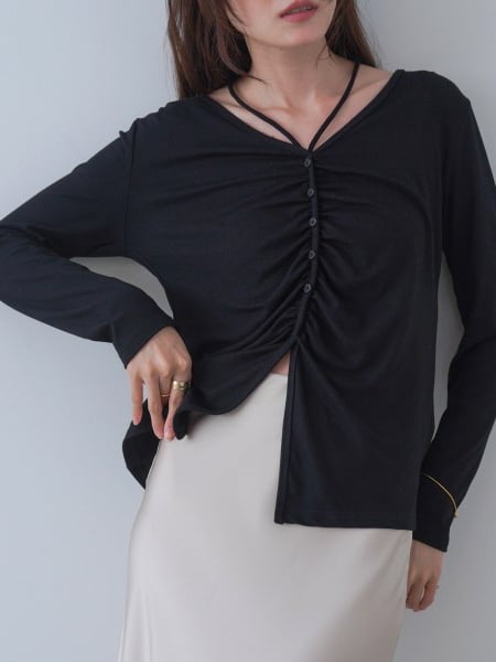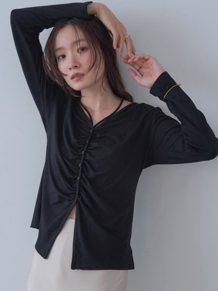しなやかで落ち感のある素材感が、シャーリングの立体感を美しく引き立てます。肌触りは柔らかく快適で、伸縮性もあるためデイリーに着やすいのがポイントです。