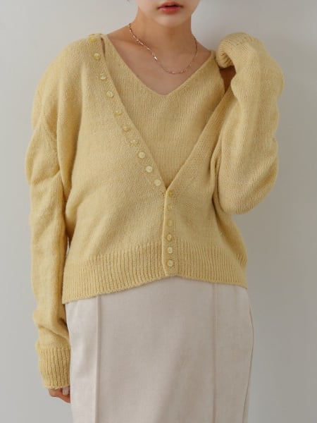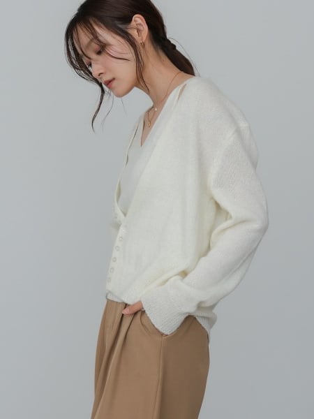 シンプルなニットキャミソールと、ボタンをアクセントにしたカーディガンがセットになった万能アイテム。アイボリー・チャコール・イエローの3色展開で、大人の女性らしい甘さをさりげなく取り入れられます。セットでの着用はもちろん、それぞれ単品使いもできるので、オンオフ問わず着回し力抜群。上品さとフェミニンさを兼ね備えた一枚です。