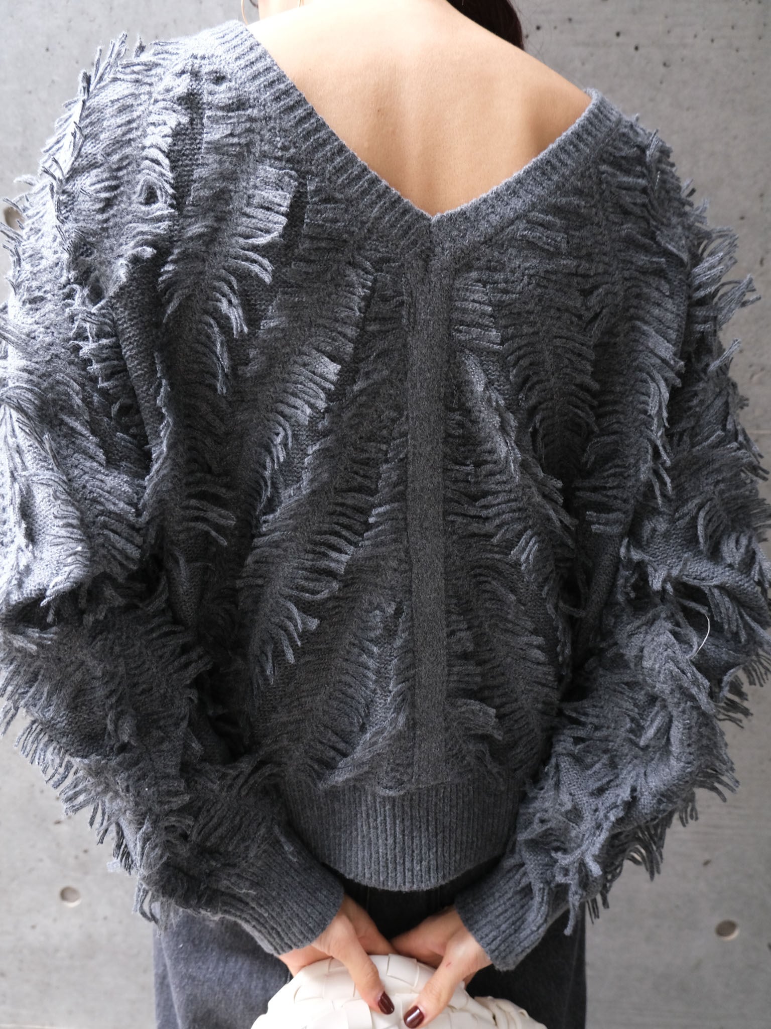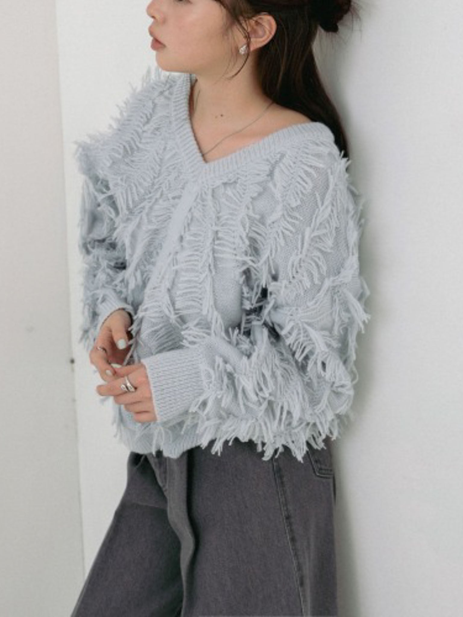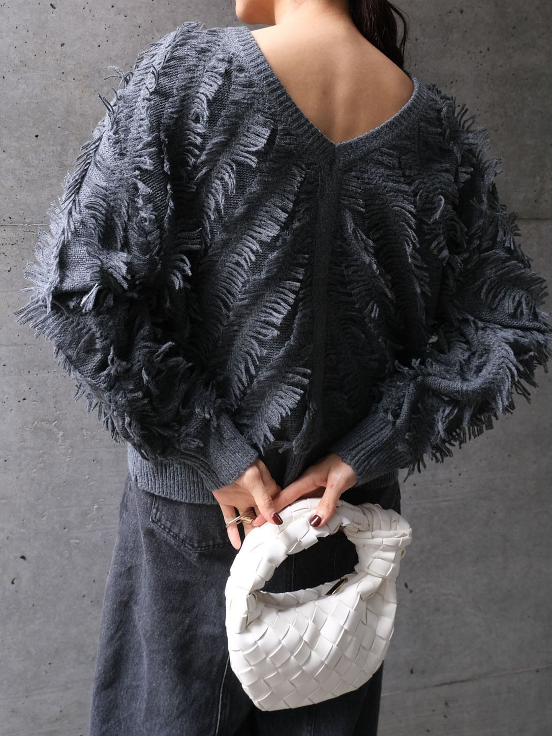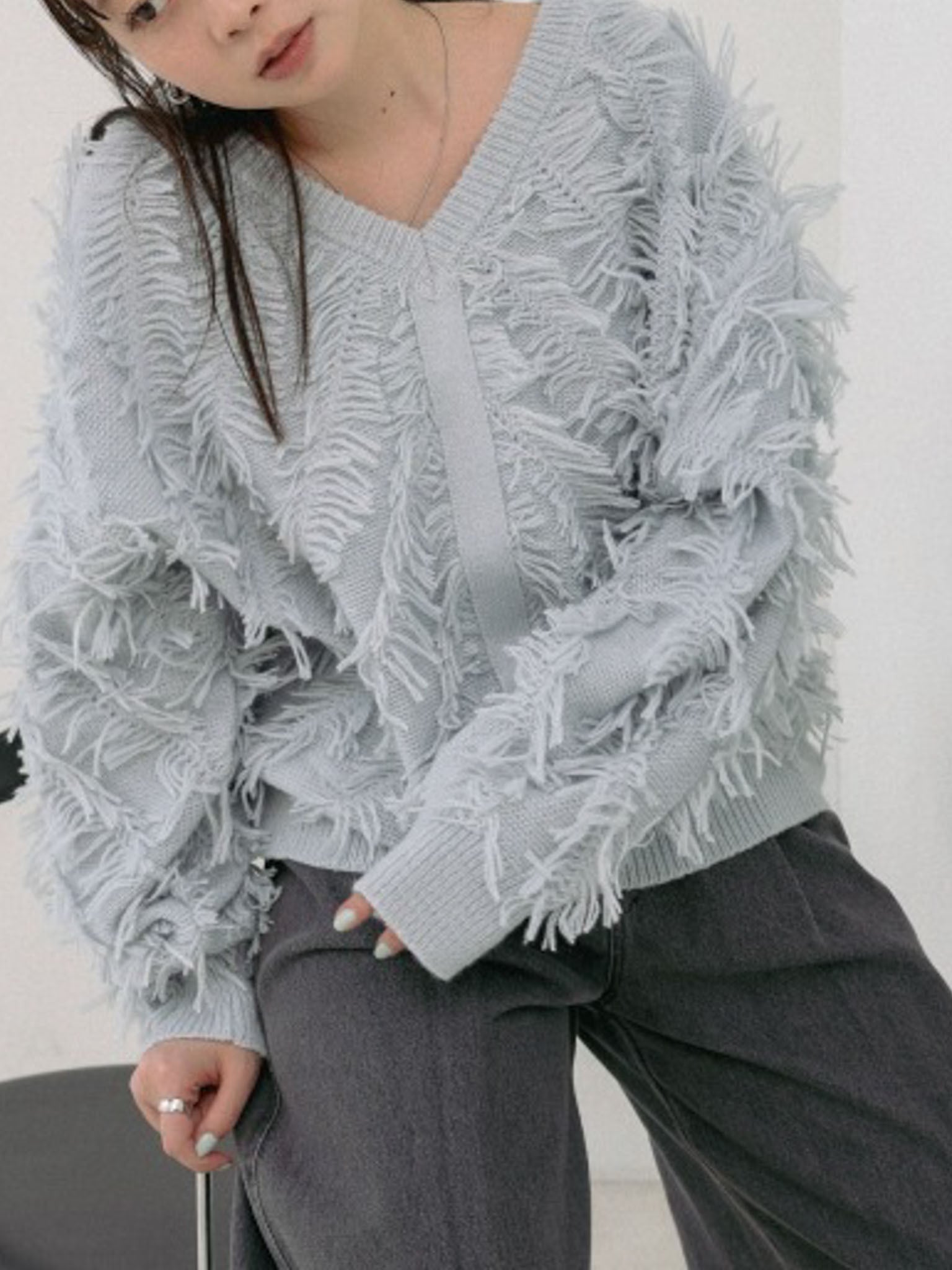 前後2WAYで着回しのきくシャギートップスが登場です!片方ずつVネックとUネックになっているので、その日の気分に合わせて着方を変えられます♪全体的に落ち感のあるニットトップスになっているので着た時のごわつきを最小限に抑えることが出来ます。スラックスと合わせるとモードな雰囲気になったり、デニムと合わせるとカジュアルなスタイリングになったりと合わせるものによって様々な顔が見られるのがポイントです。