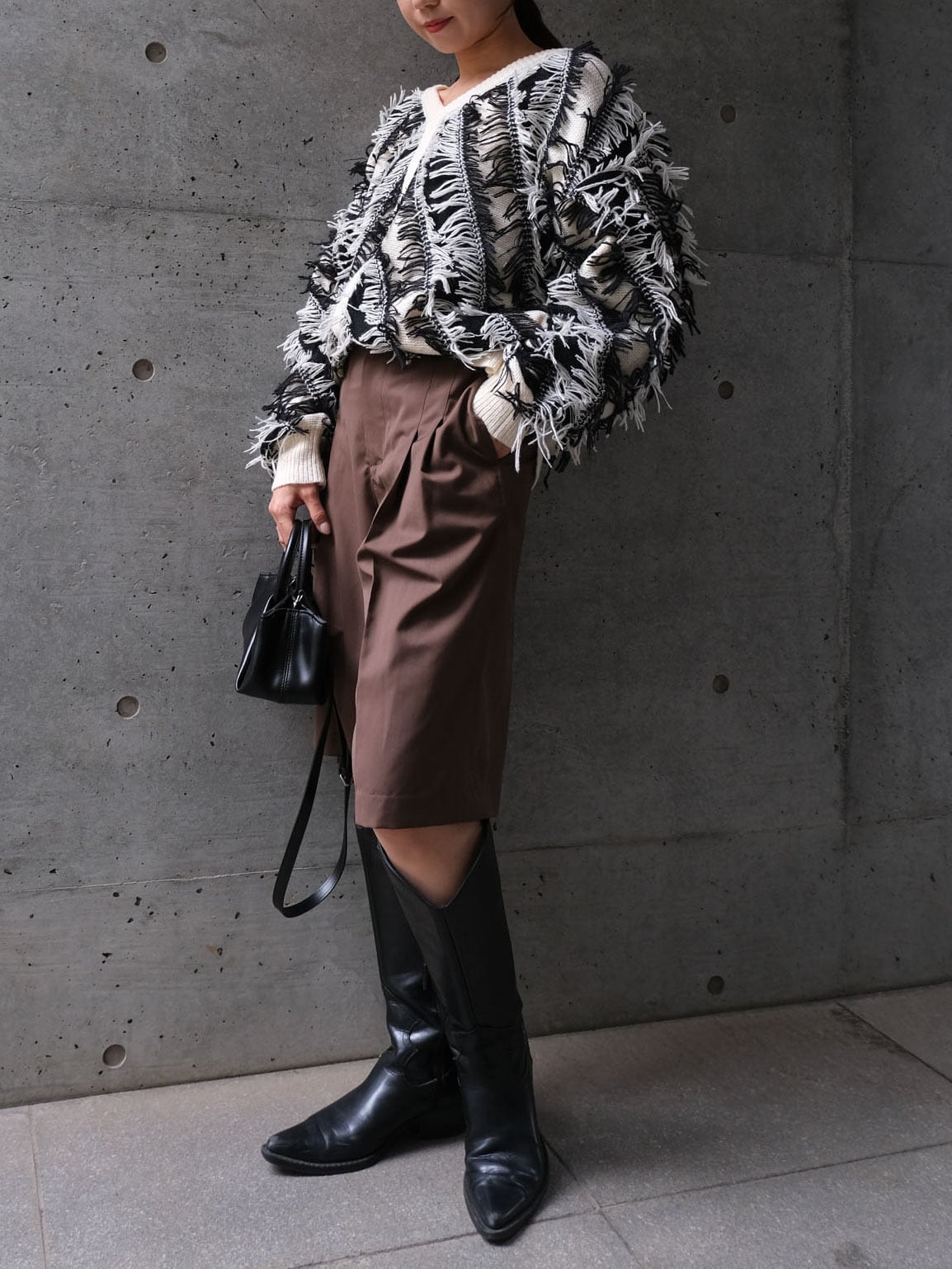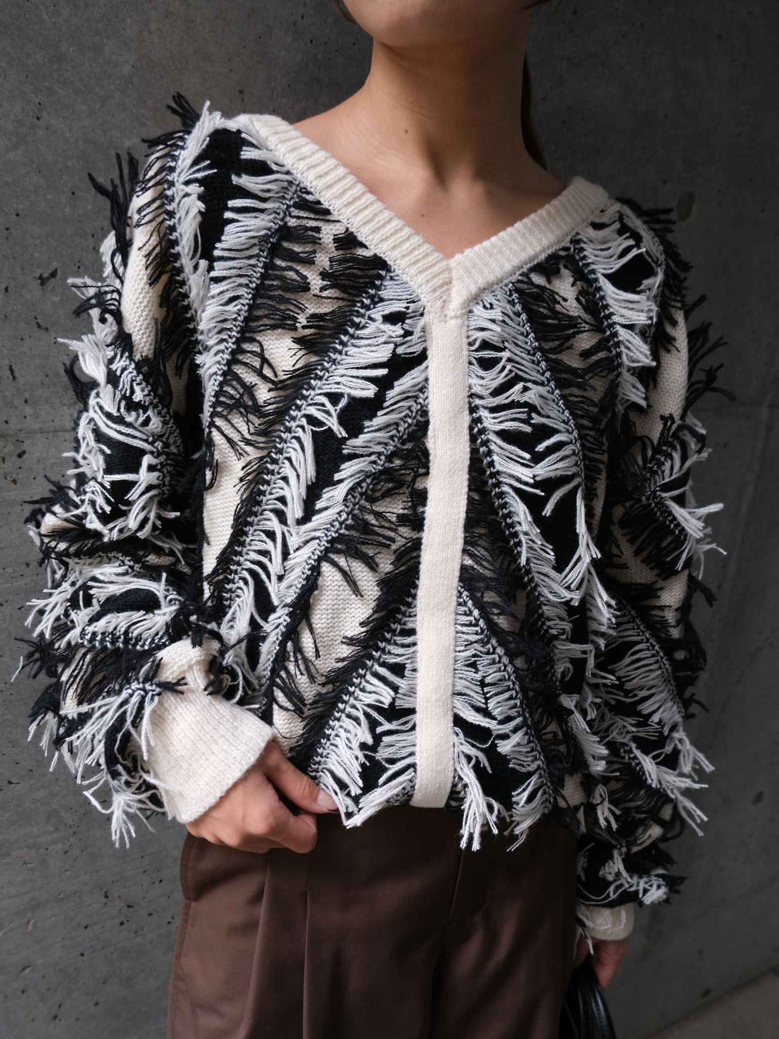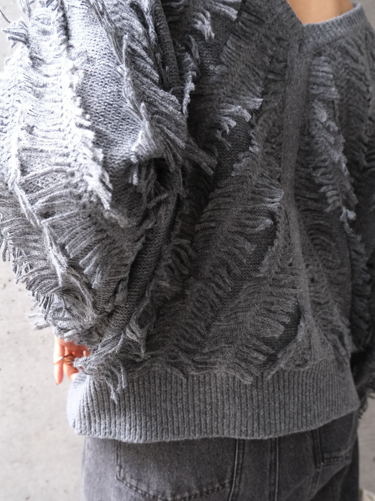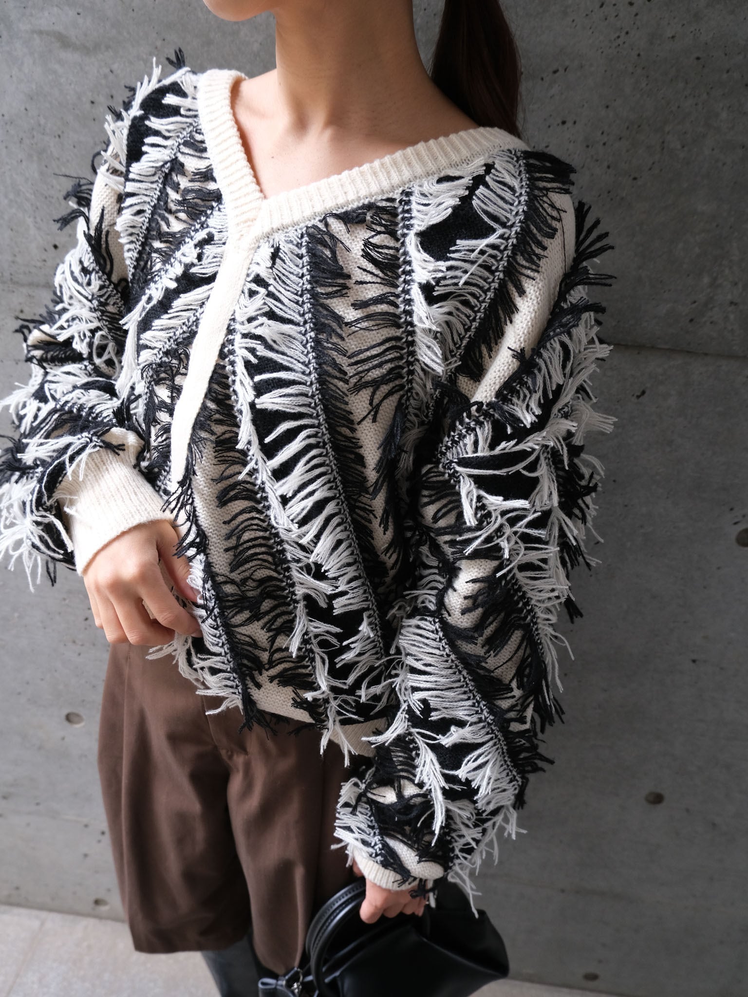 前後2WAYで着回しのきくシャギートップスが登場です!片方ずつVネックとUネックになっているので、その日の気分に合わせて着方を変えられます♪全体的に落ち感のあるニットトップスになっているので着た時のごわつきを最小限に抑えることが出来ます。スラックスと合わせるとモードな雰囲気になったり、デニムと合わせるとカジュアルなスタイリングになったりと合わせるものによって様々な顔が見られるのがポイントです。