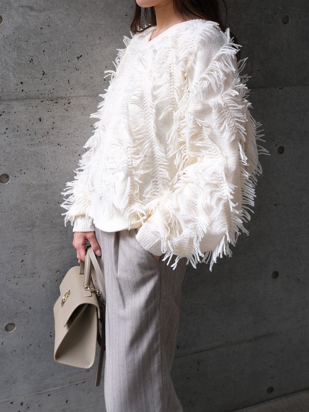 柔らかな素材感と落ち感のある暖かいシャギーニットトップスです。