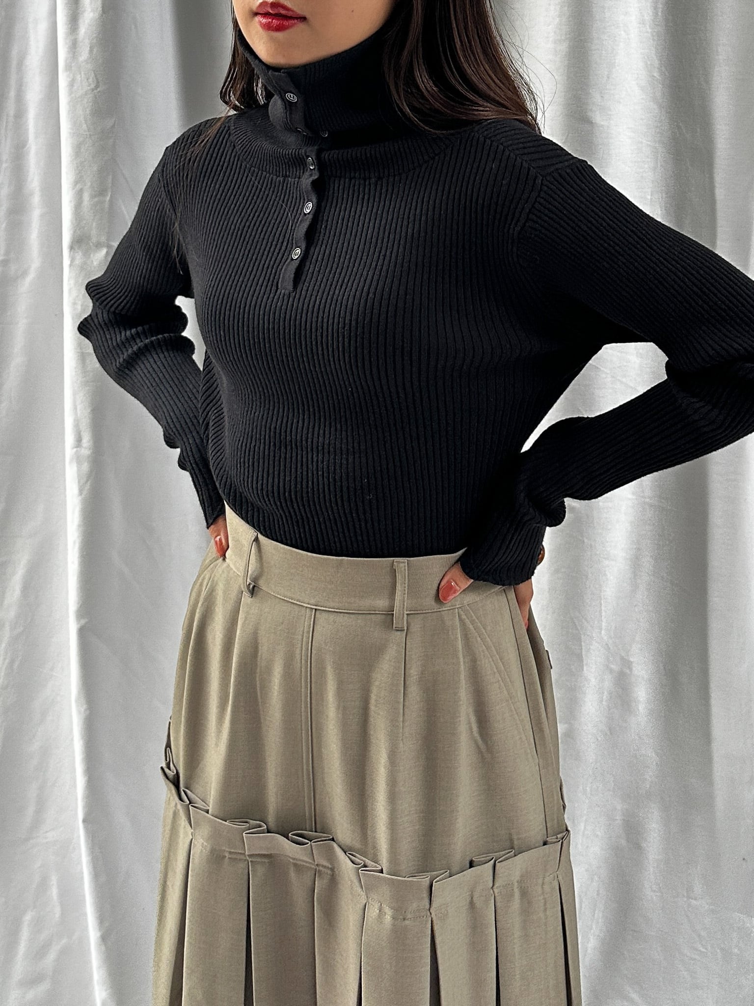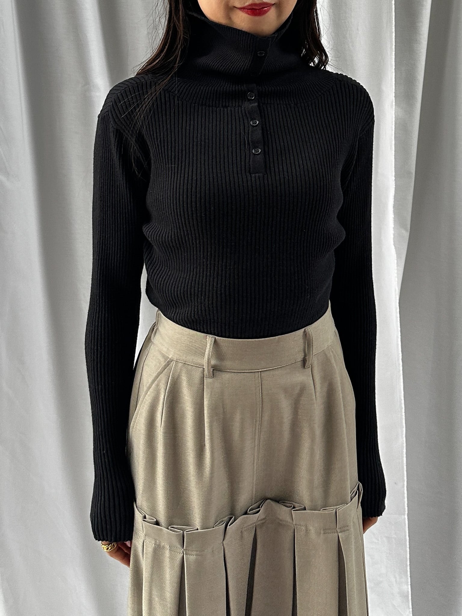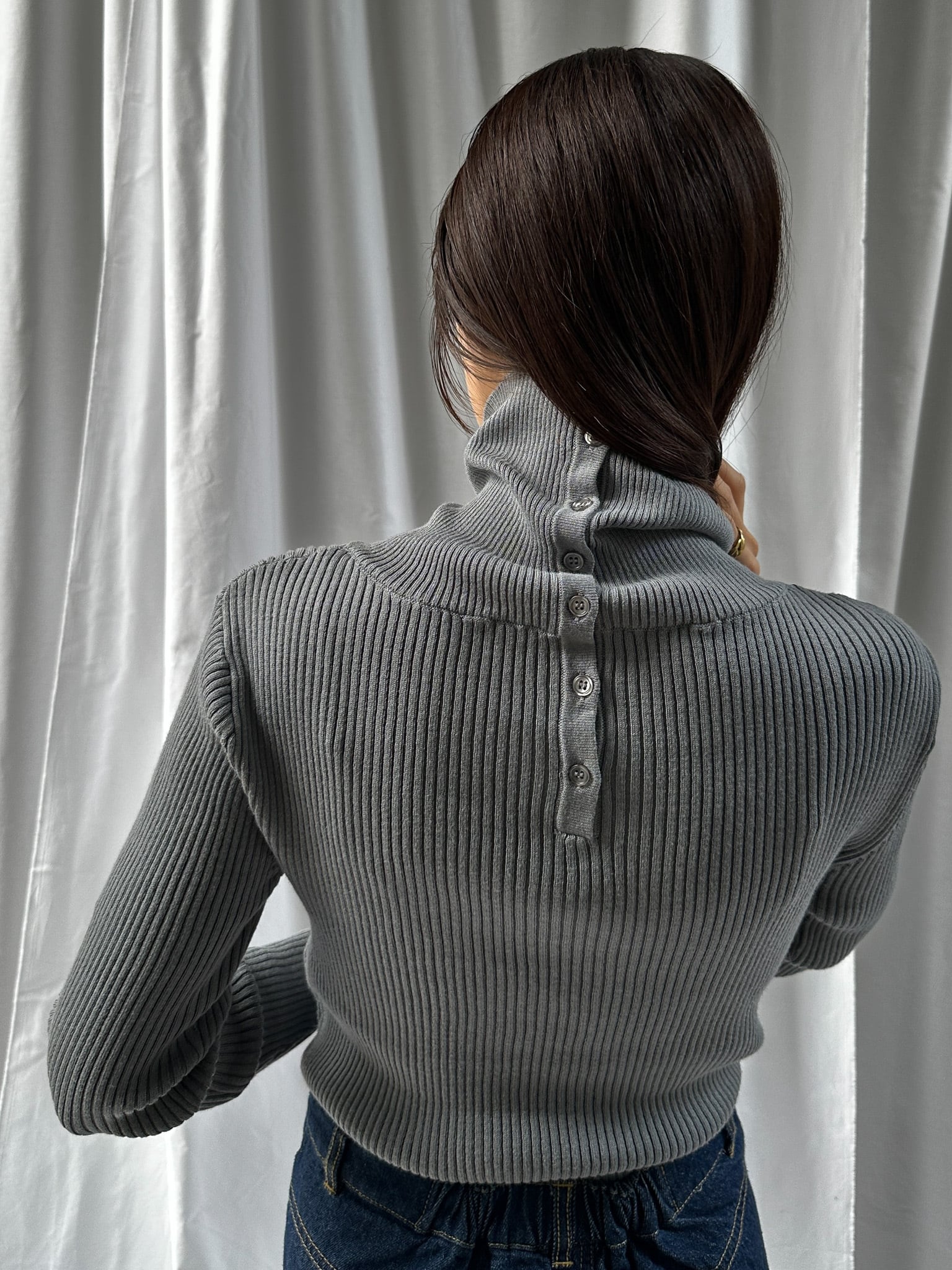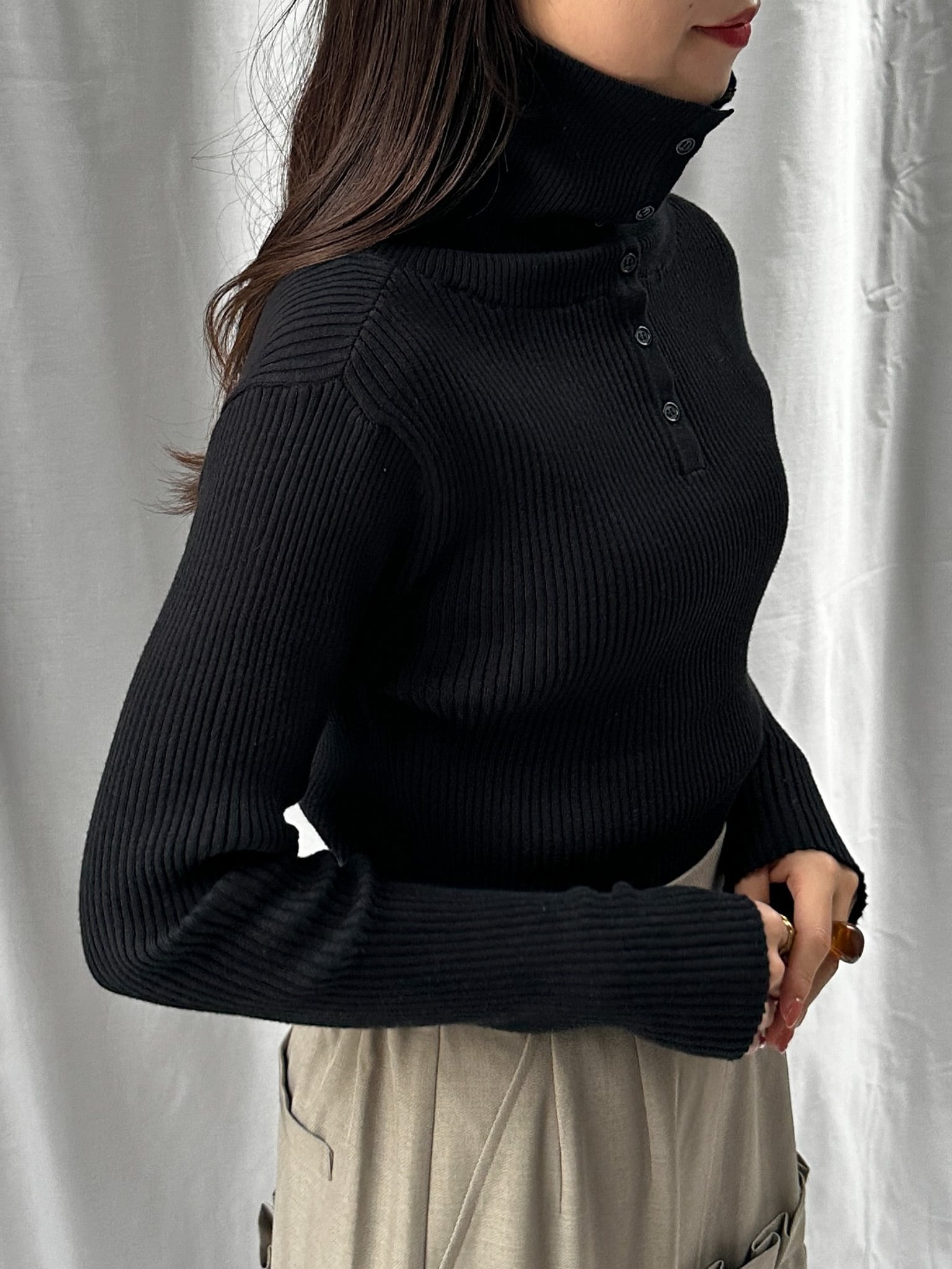 程よく首に沿うタートルネックは、きちんと感がありながらも窮屈さを感じさせません。背中にはさりげないボタンディテールをあしらい、後ろ姿にもほんの少しの“特別”を。シンプルなのに、どこか雰囲気のある着こなしを叶えます。細やかなリブ編みで仕立てたニットは、ほどよいフィット感がありながらも、ぴたっとしすぎない絶妙なシルエット。身頃と衿でリブ幅を変えることで、視覚的にも上品な立体感を生み出しています。