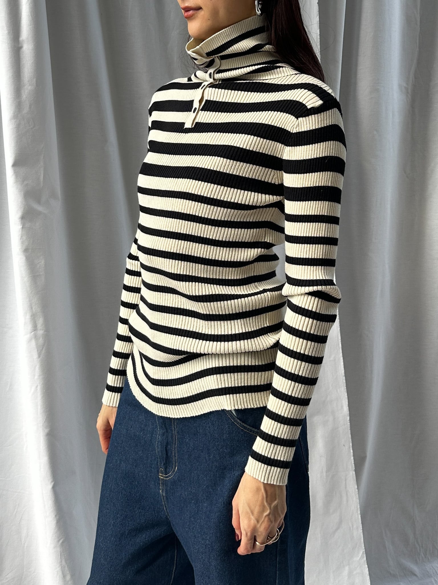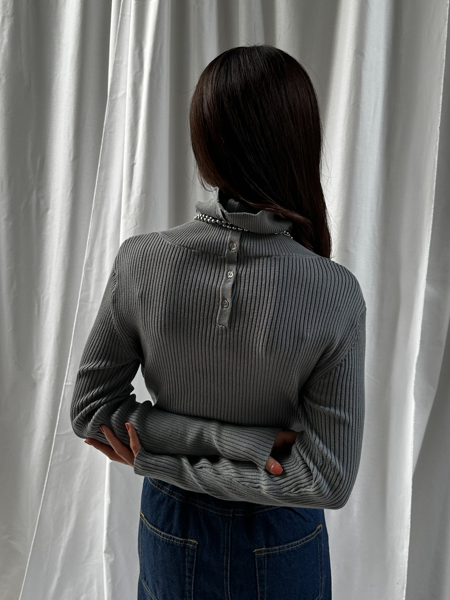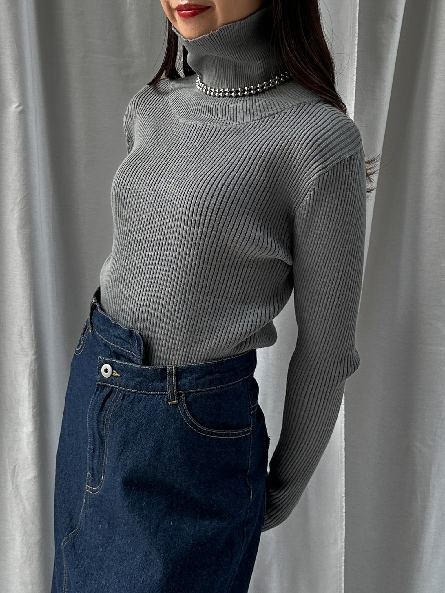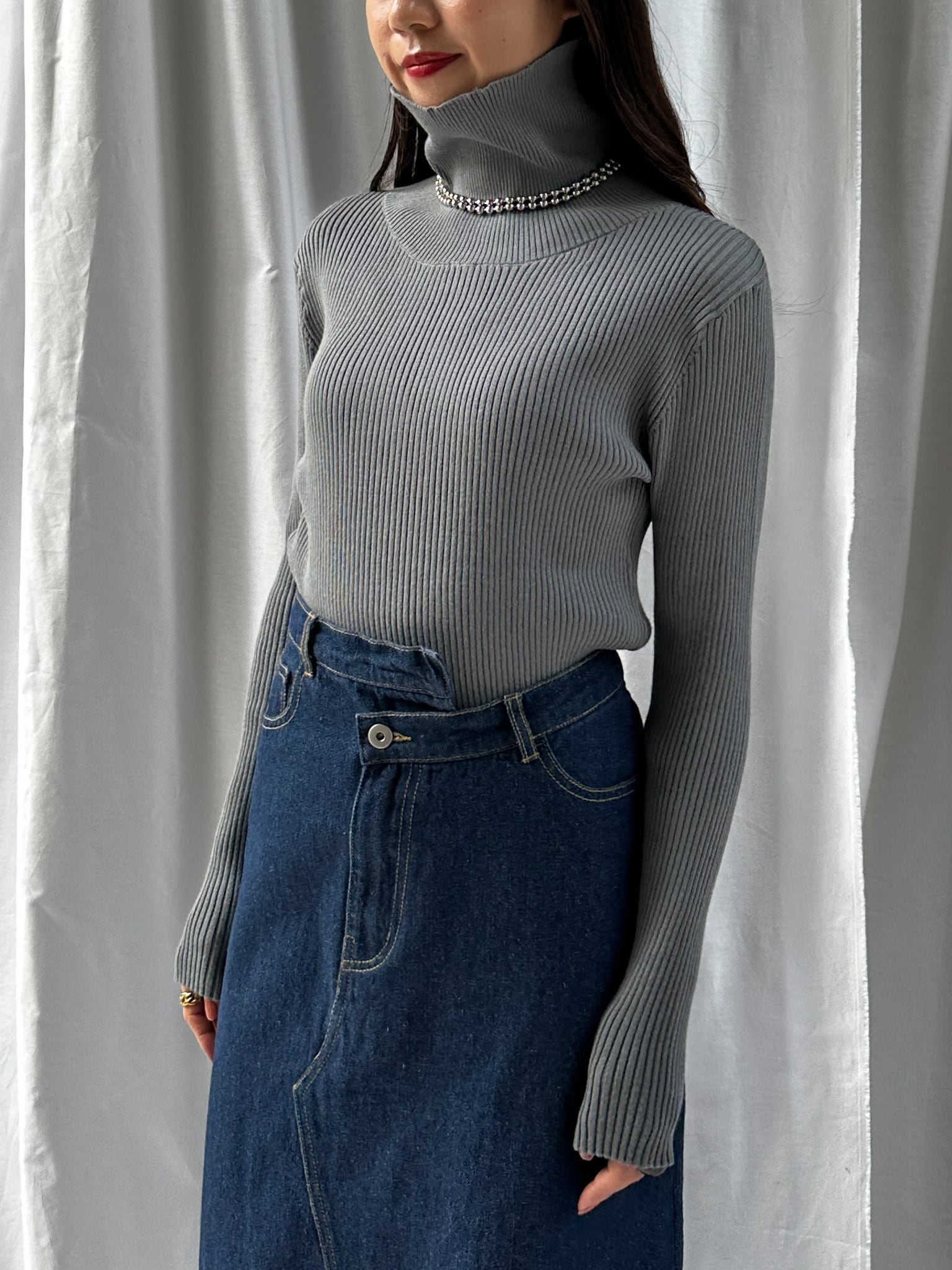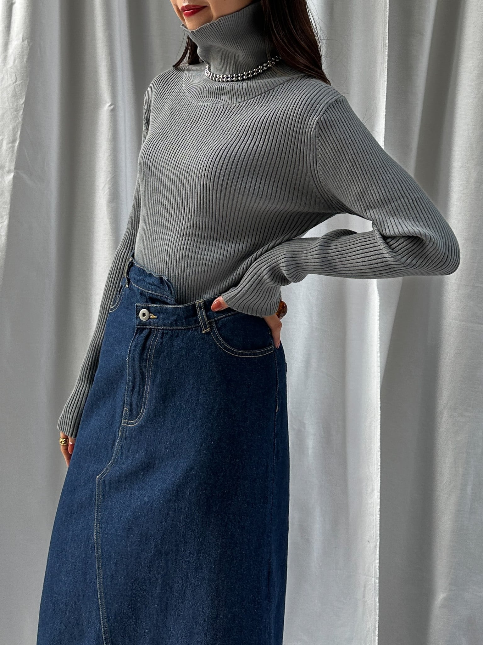 程よく首に沿うタートルネックは、きちんと感がありながらも窮屈さを感じさせません。背中にはさりげないボタンディテールをあしらい、後ろ姿にもほんの少しの“特別”を。シンプルなのに、どこか雰囲気のある着こなしを叶えます。細やかなリブ編みで仕立てたニットは、ほどよいフィット感がありながらも、ぴたっとしすぎない絶妙なシルエット。身頃と衿でリブ幅を変えることで、視覚的にも上品な立体感を生み出しています。