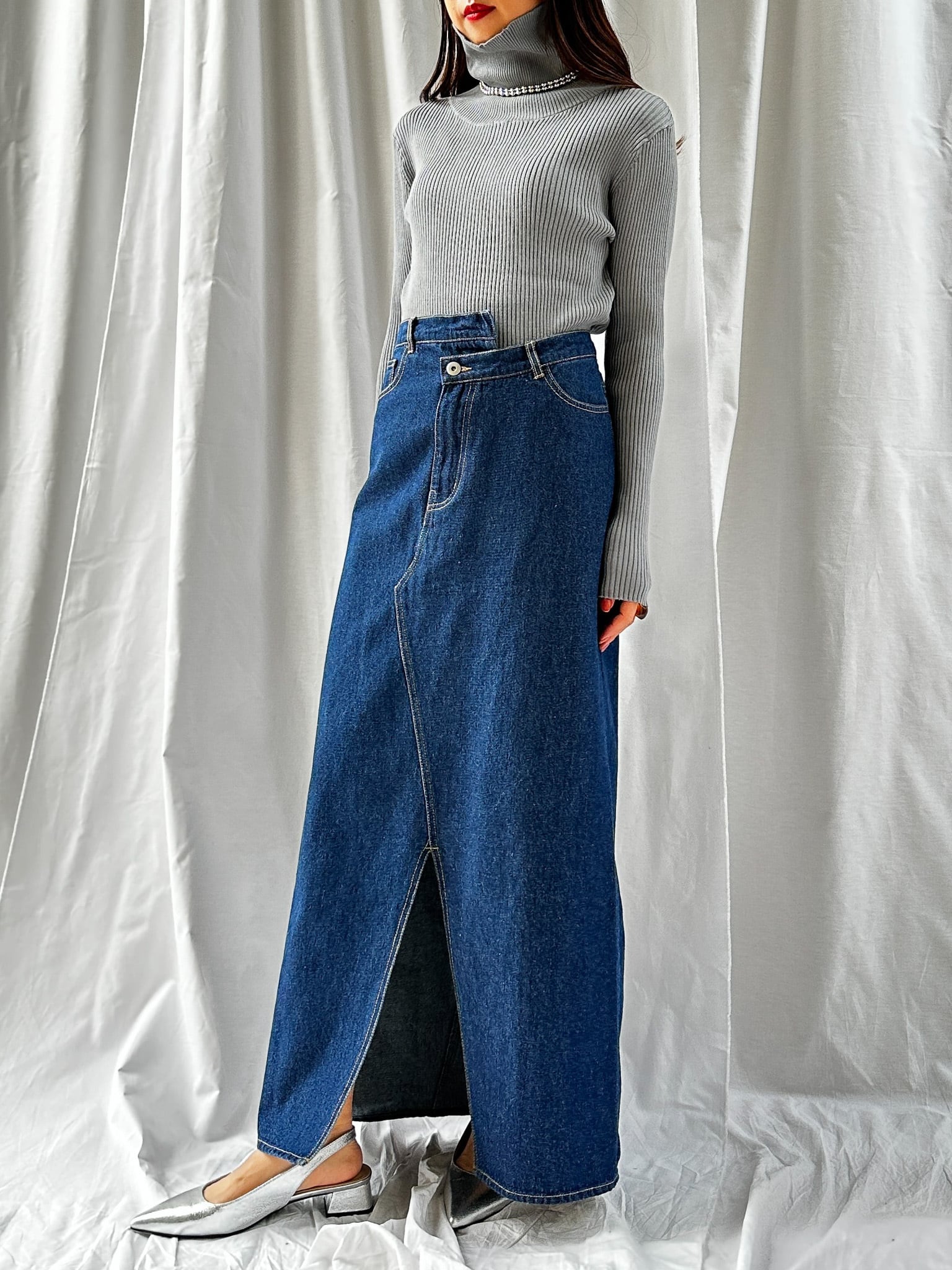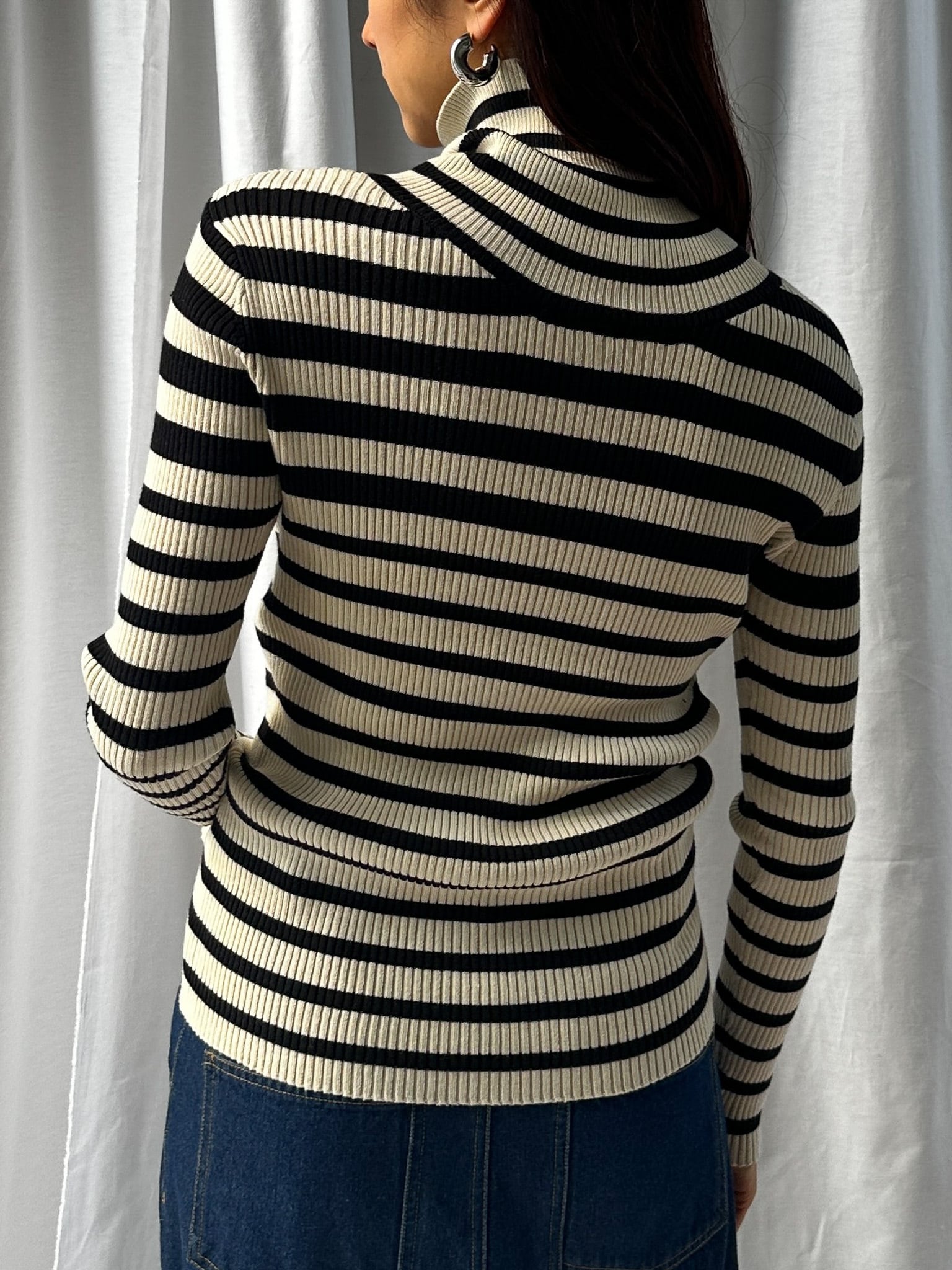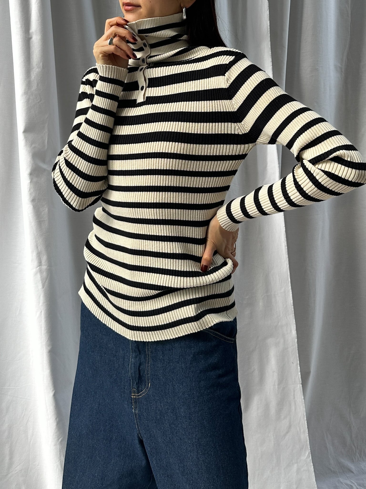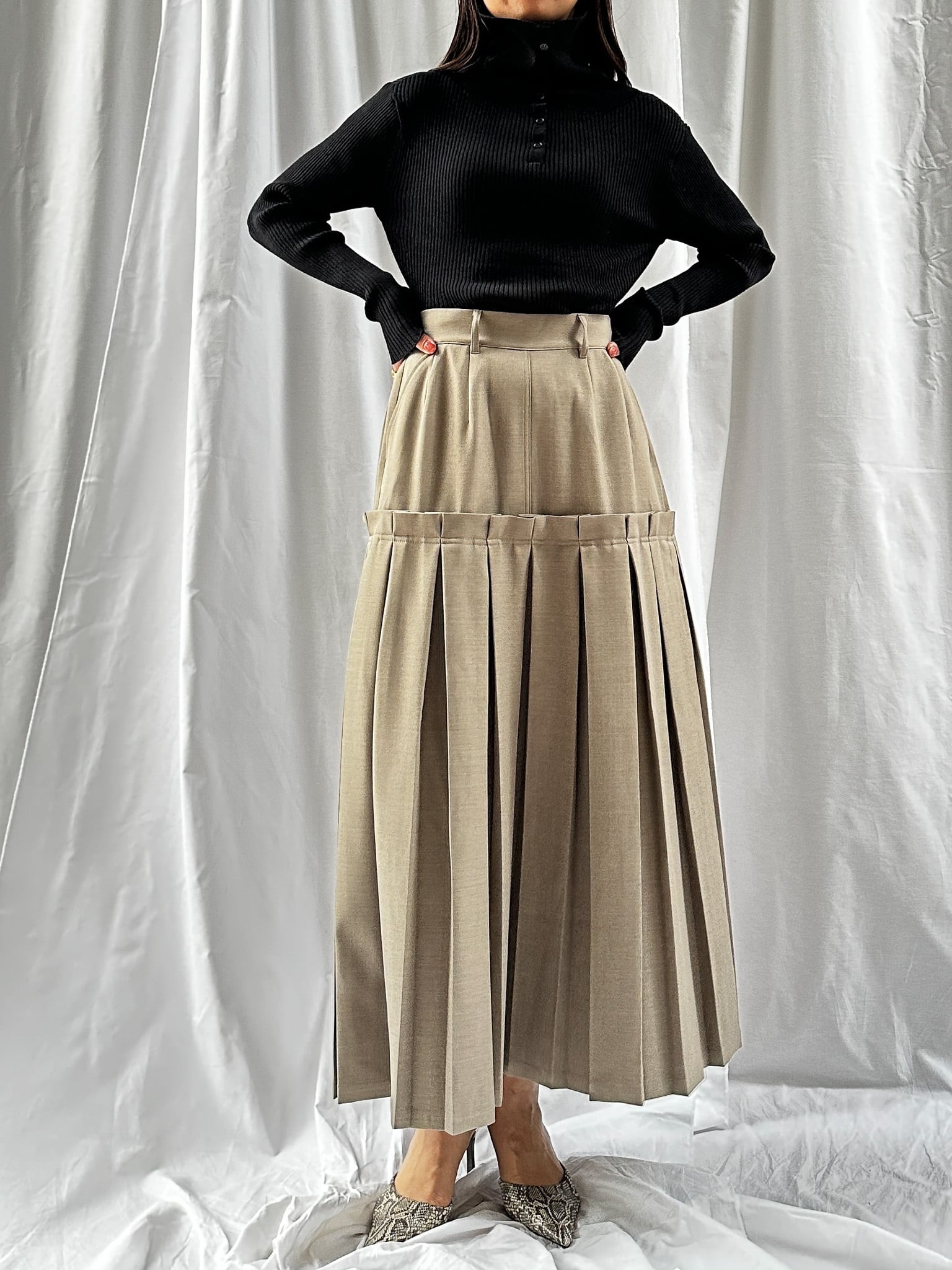 程よく首に沿うタートルネックは、きちんと感がありながらも窮屈さを感じさせません。背中にはさりげないボタンディテールをあしらい、後ろ姿にもほんの少しの“特別”を。シンプルなのに、どこか雰囲気のある着こなしを叶えます。細やかなリブ編みで仕立てたニットは、ほどよいフィット感がありながらも、ぴたっとしすぎない絶妙なシルエット。身頃と衿でリブ幅を変えることで、視覚的にも上品な立体感を生み出しています。