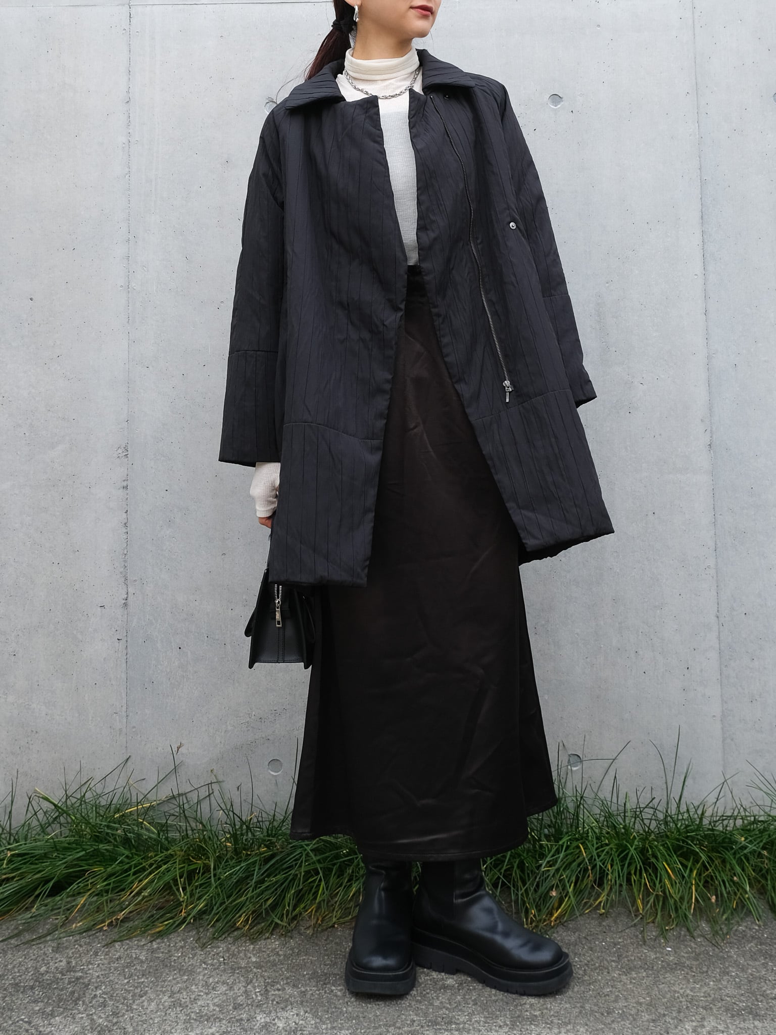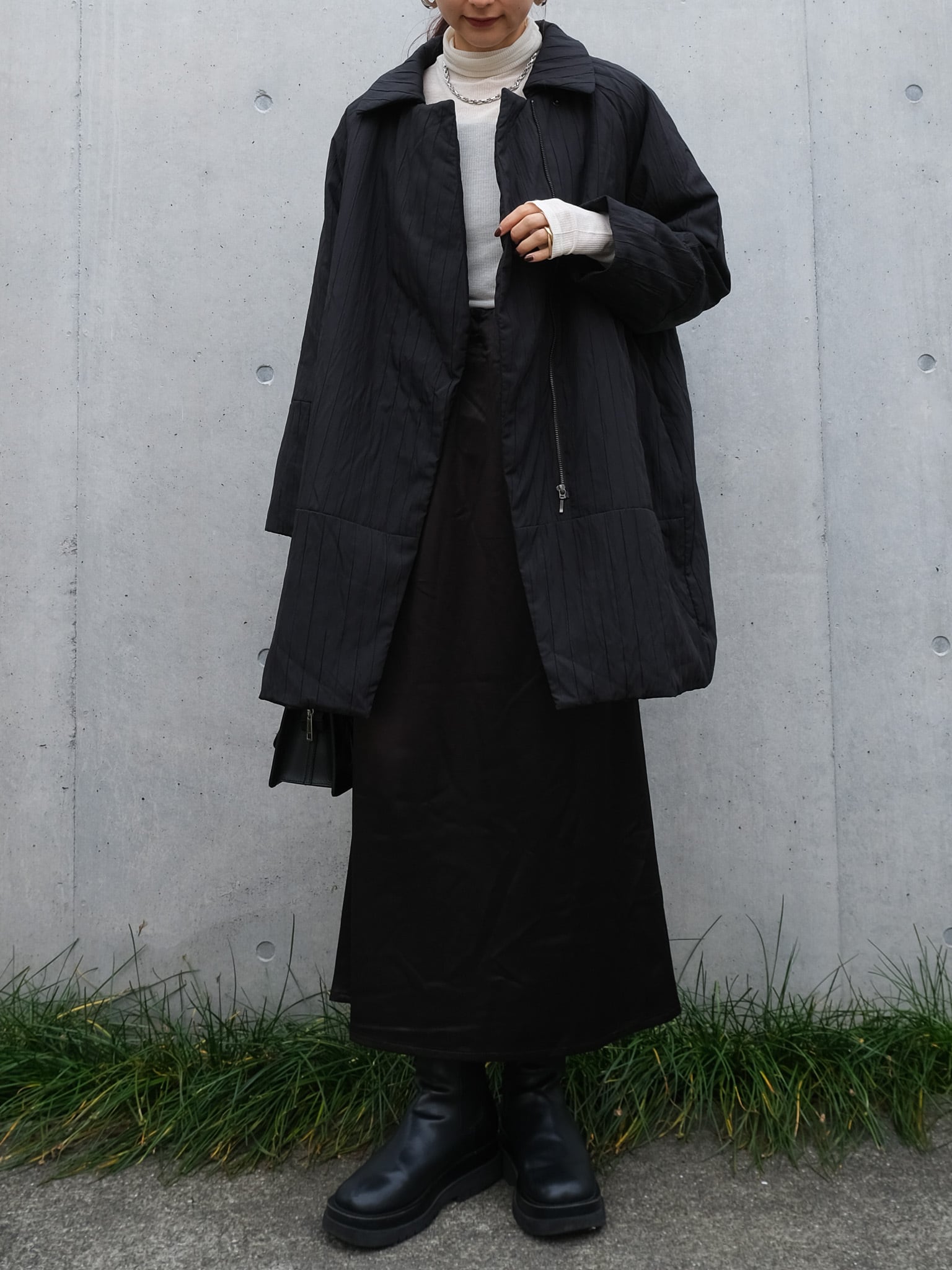 上半身にボリュームがあり、アウターを着ると着膨れしがちなストレートタイプさんですが、縦ラインを意識したステッチのデザインがすっきり見えを叶えます。ボトムスにはタイト目なものを合わせ、更に縦に意識がいくデザインを合わせることで、着太りを防げます。