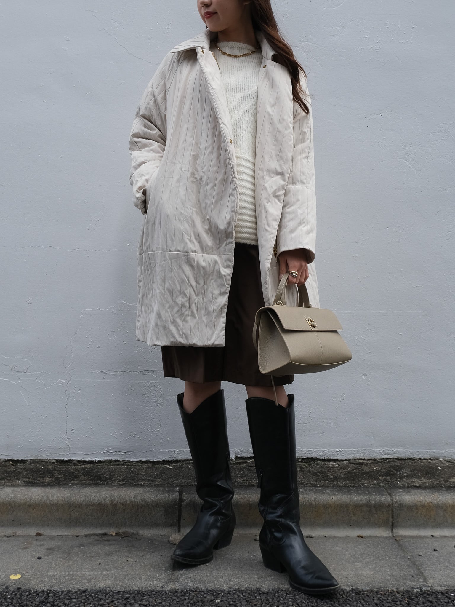 ショート丈のボトムスにロングブーツやワンピースを合わせて女性らしく。ワイドめパンツやデニムにスニーカーを合わせてカジュアルにもOK!膝丈のバランスはボトムスを選ばず、デイリーにもお出かけにも◎