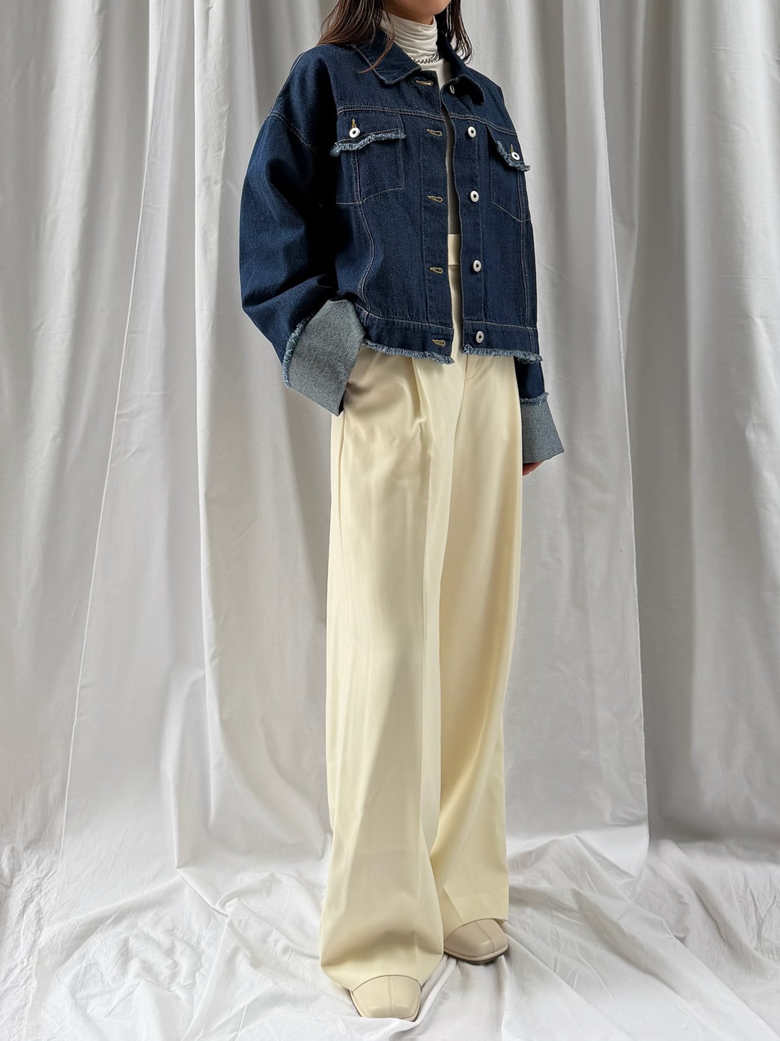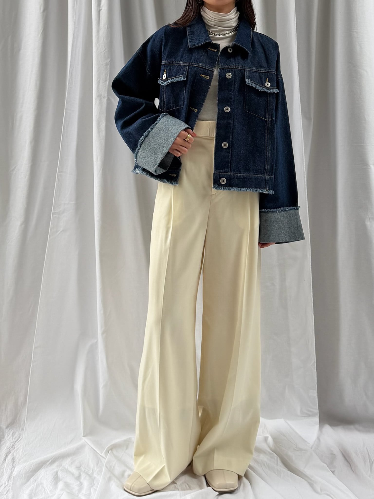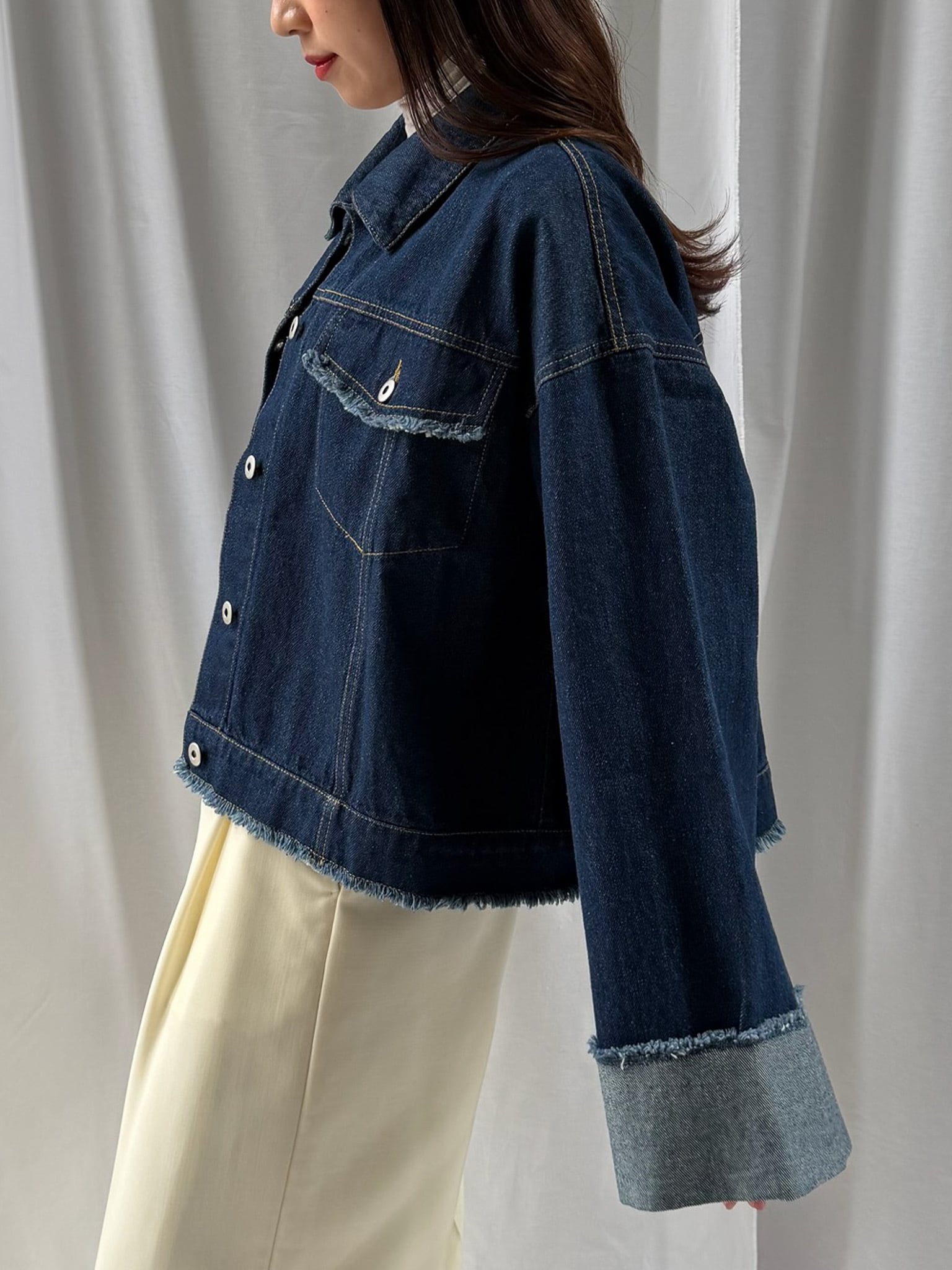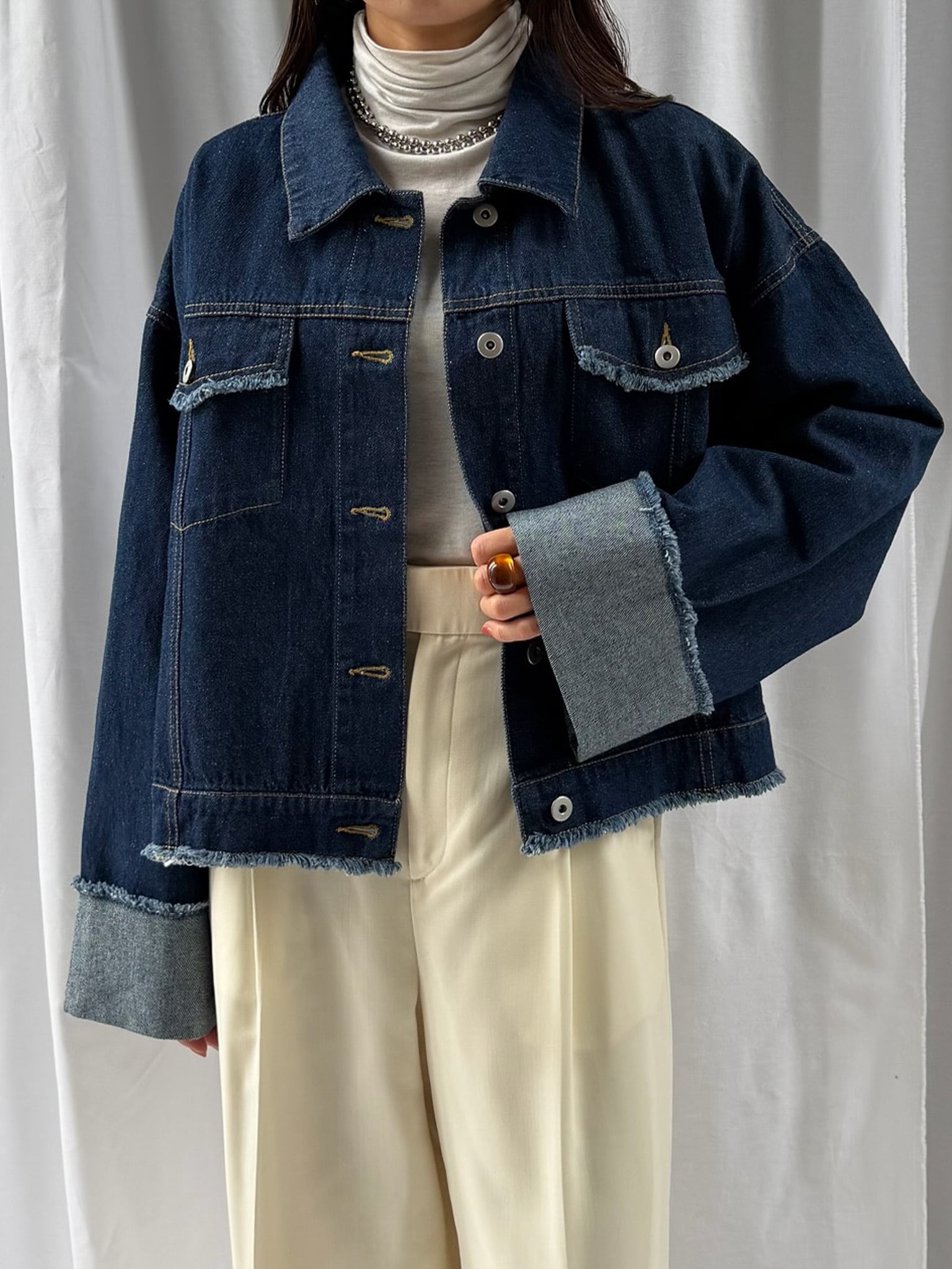 羽織るだけで旬なシルエットを楽しめるデニムジャケット。裾のフリンジやバランスの良いサイズ感はそのままに、好みの長さで折り返し自在なワイドスリーブにアップデート。肉厚なニットを着用しても着脱がスムーズなので、ロングシーズン活躍すること間違いなし。360°どこからみても形のきれいさが際立つアイテムです。