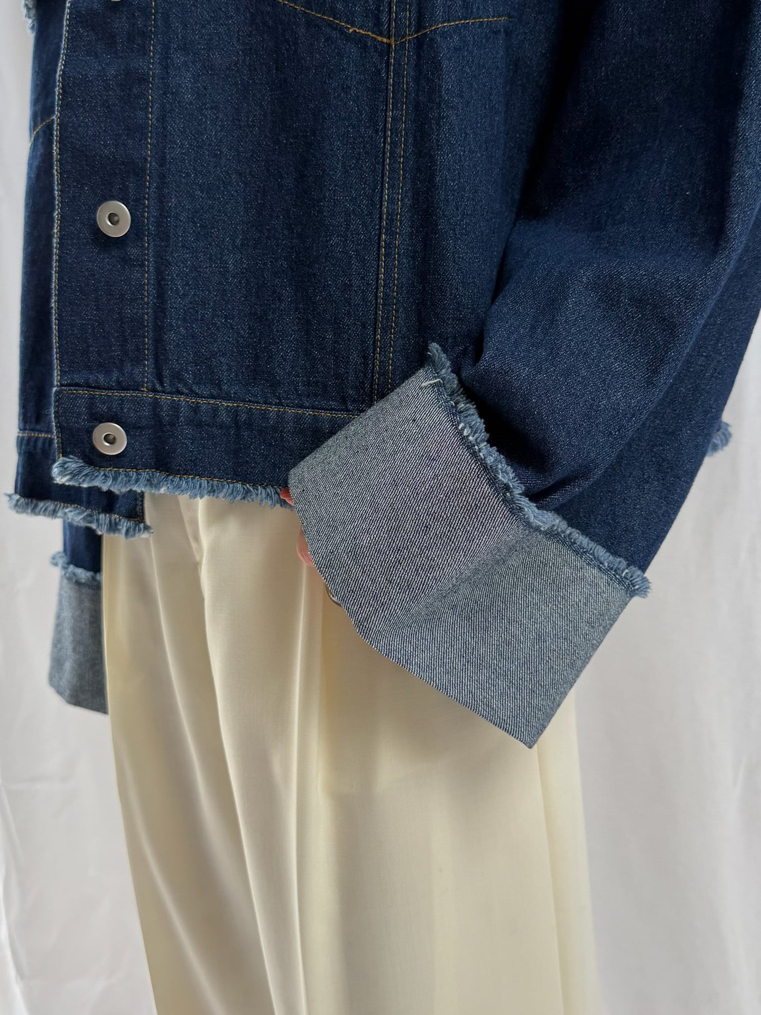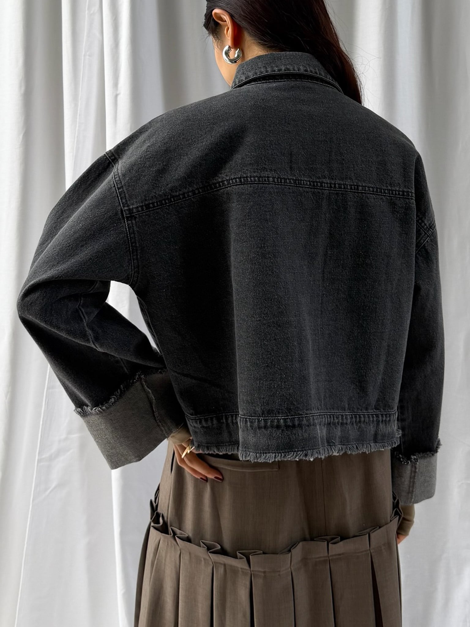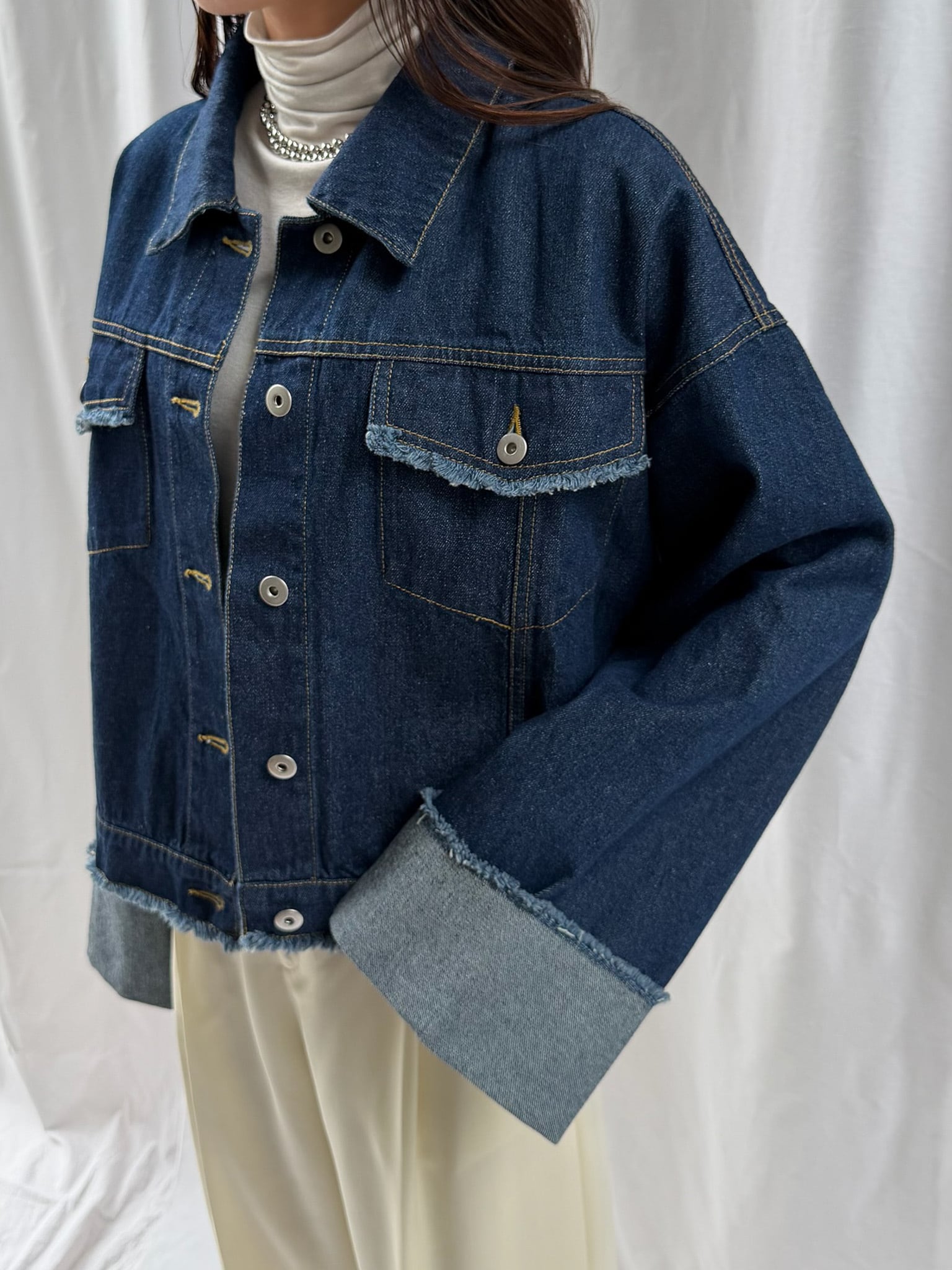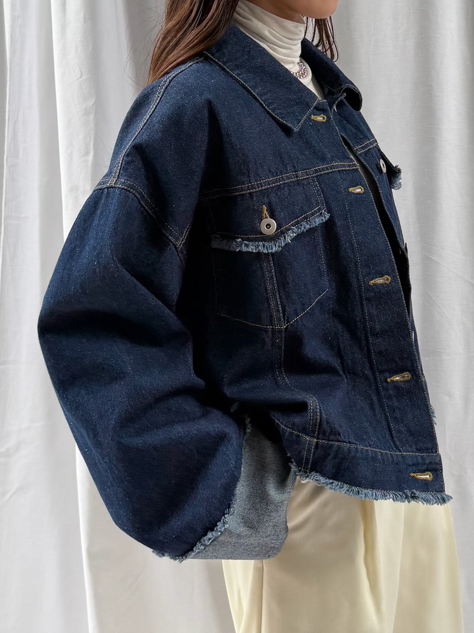 羽織るだけで旬なシルエットを楽しめるデニムジャケット。裾のフリンジやバランスの良いサイズ感はそのままに、好みの長さで折り返し自在なワイドスリーブにアップデート。肉厚なニットを着用しても着脱がスムーズなので、ロングシーズン活躍すること間違いなし。360°どこからみても形のきれいさが際立つアイテムです。