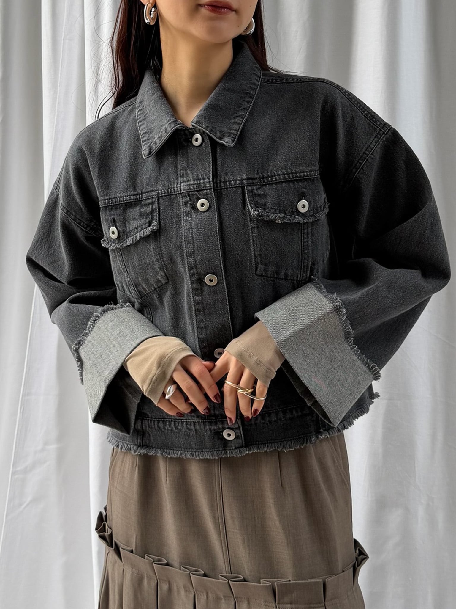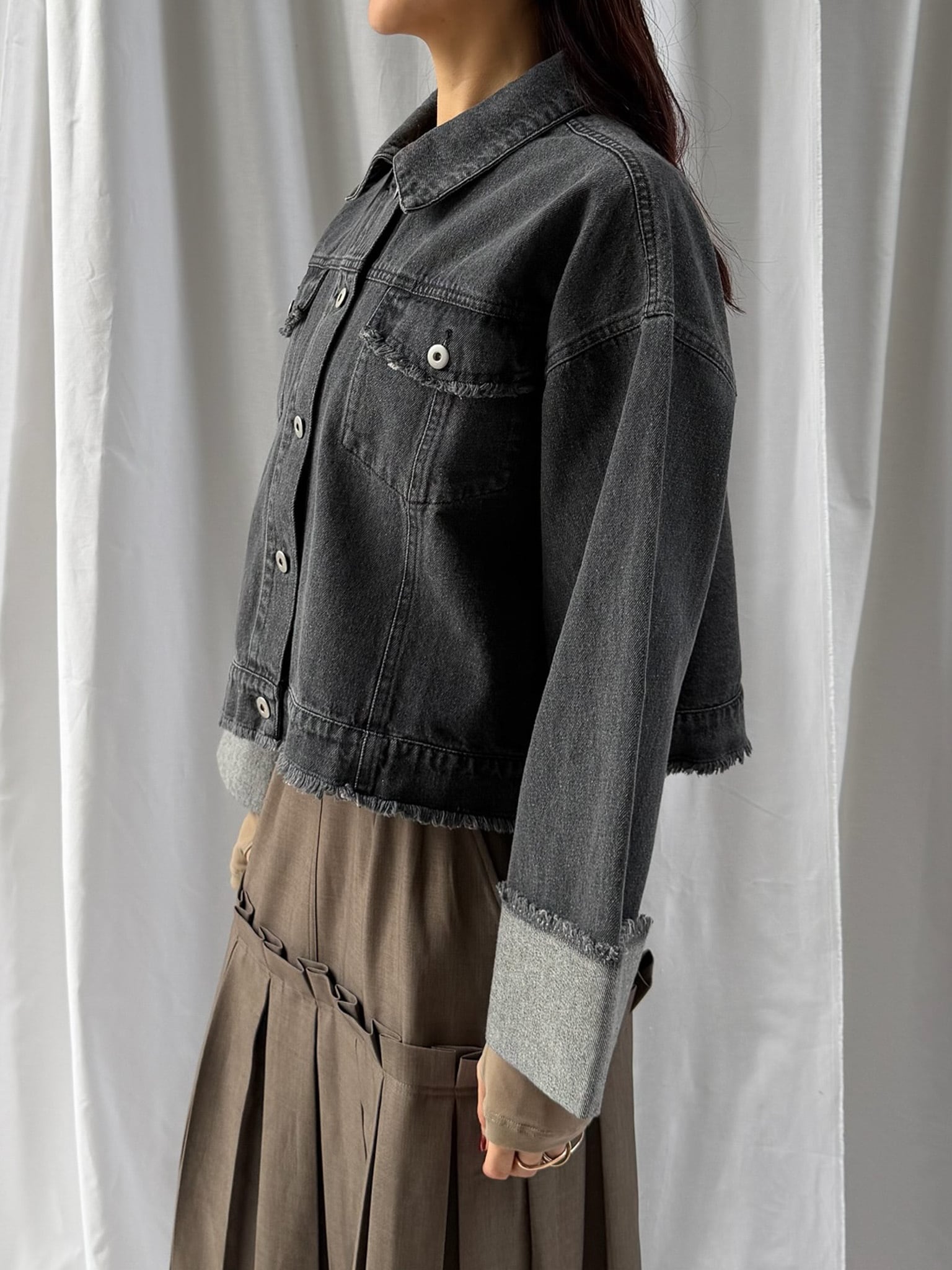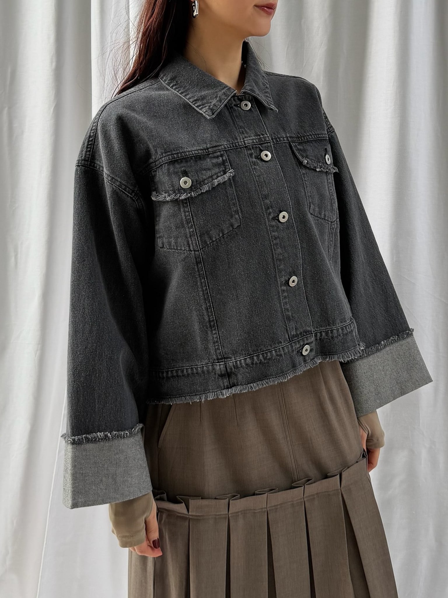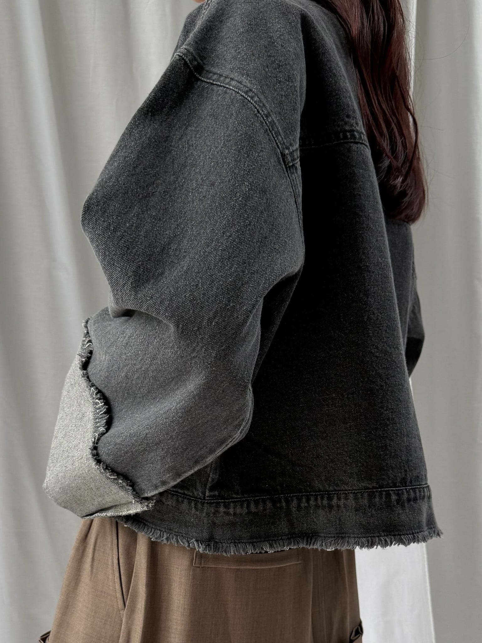 羽織るだけで旬なシルエットを楽しめるデニムジャケット。裾のフリンジやバランスの良いサイズ感はそのままに、好みの長さで折り返し自在なワイドスリーブにアップデート。肉厚なニットを着用しても着脱がスムーズなので、ロングシーズン活躍すること間違いなし。360°どこからみても形のきれいさが際立つアイテムです。