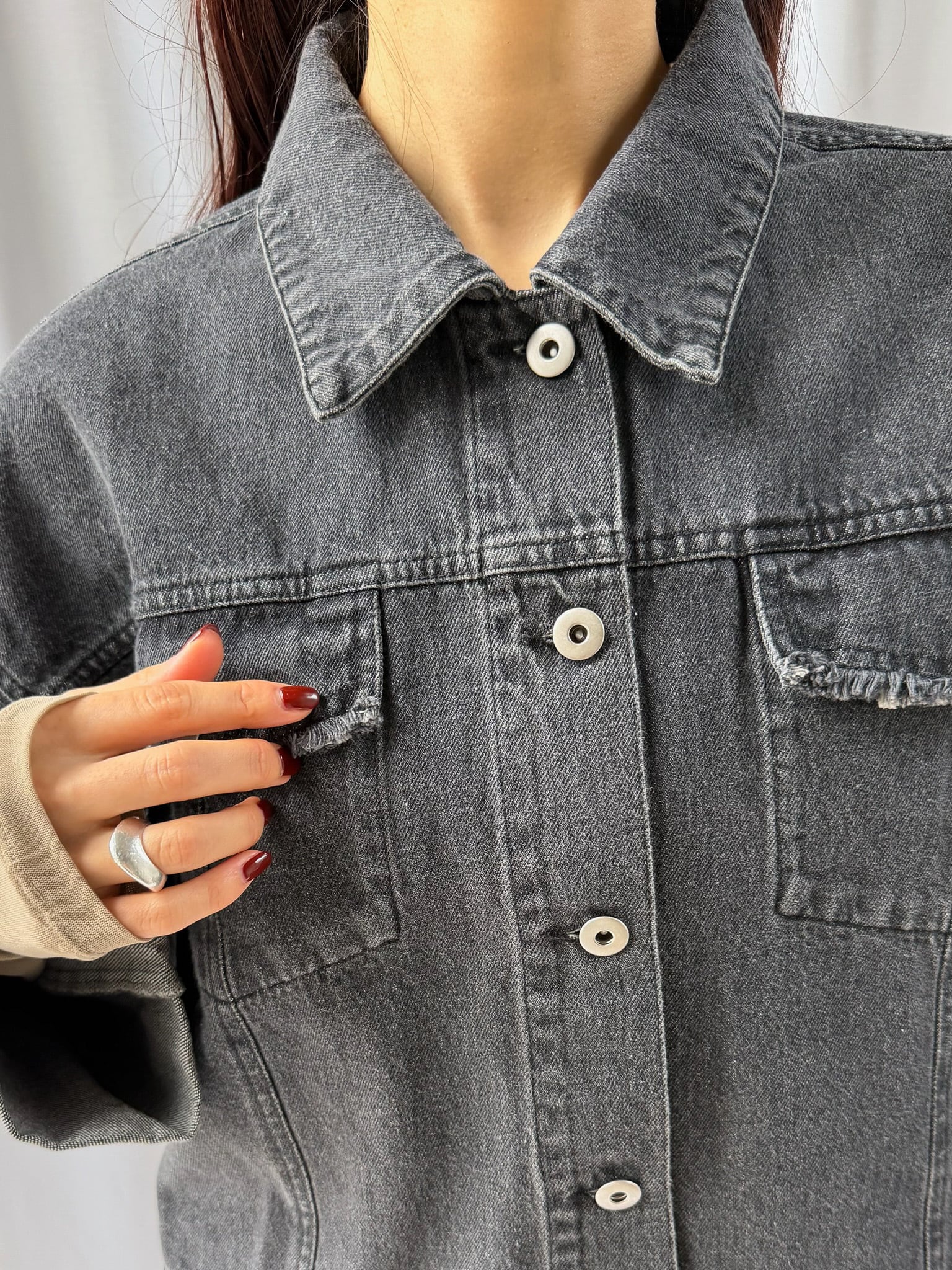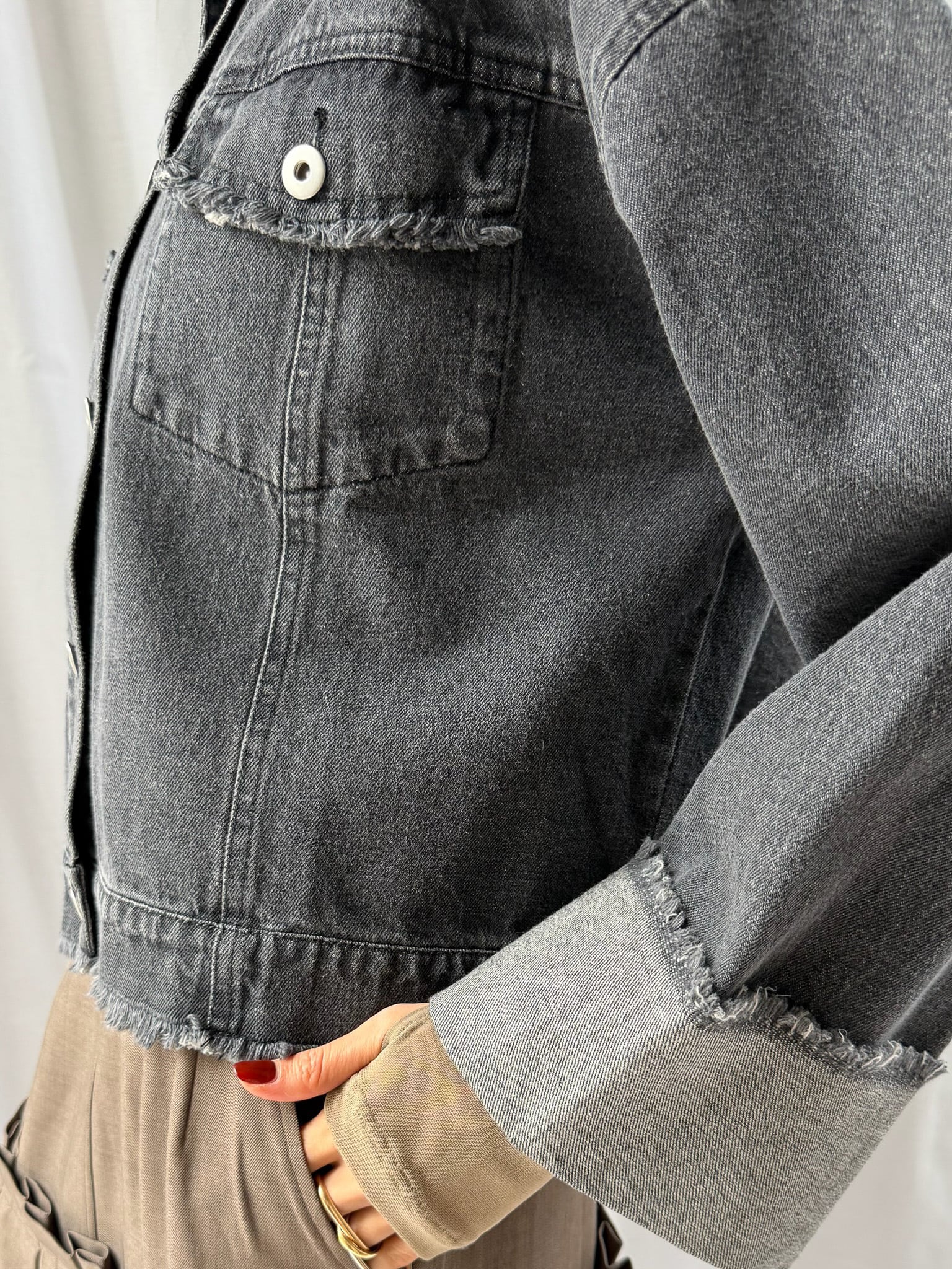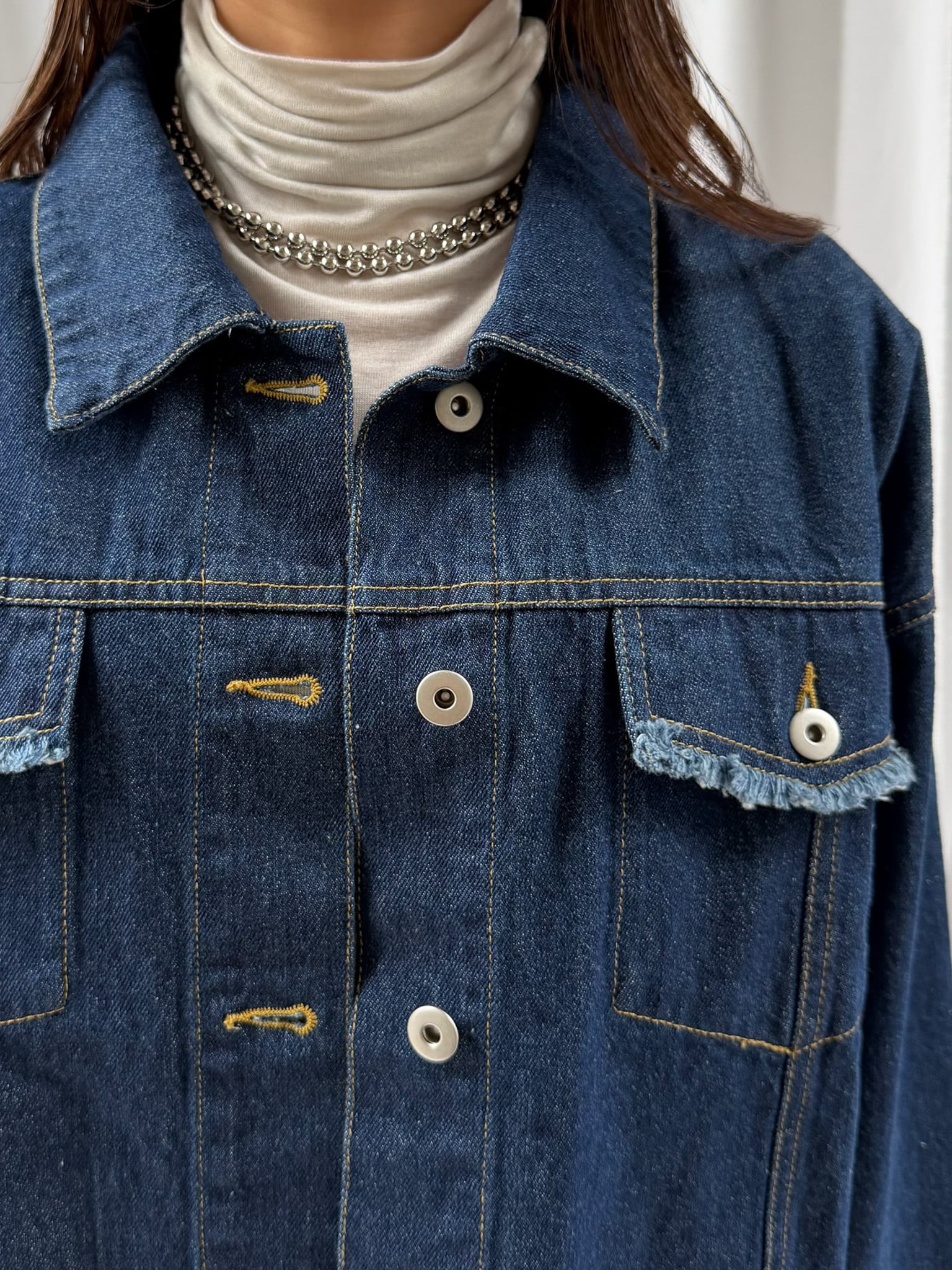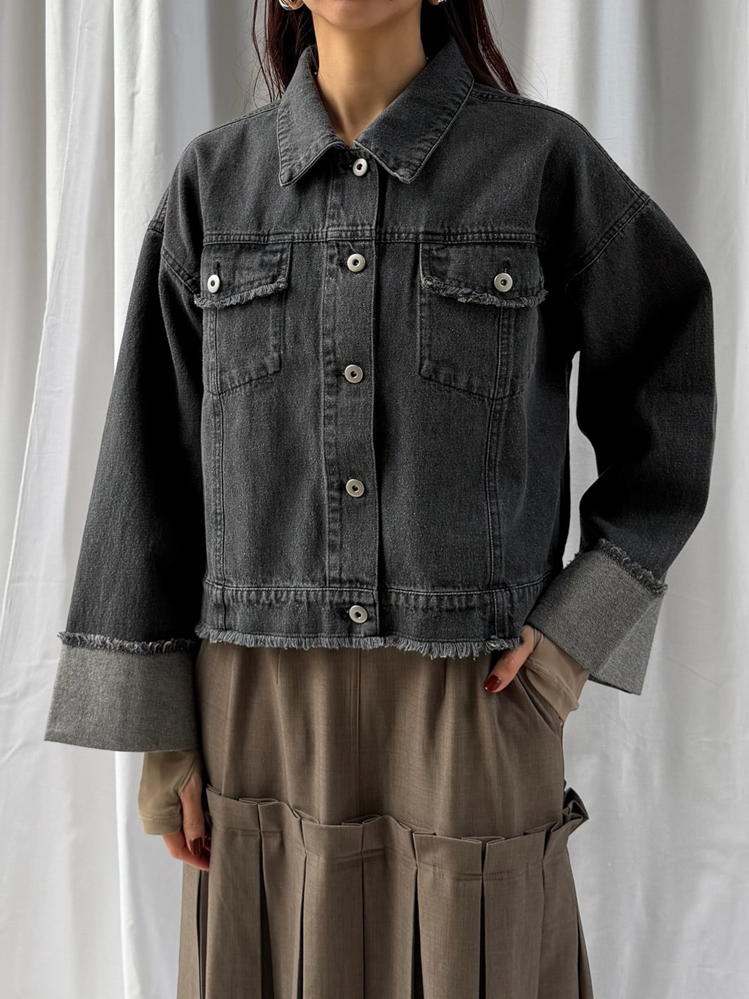 羽織るだけで旬なシルエットを楽しめるデニムジャケット。裾のフリンジやバランスの良いサイズ感はそのままに、好みの長さで折り返し自在なワイドスリーブにアップデート。肉厚なニットを着用しても着脱がスムーズなので、ロングシーズン活躍すること間違いなし。360°どこからみても形のきれいさが際立つアイテムです。