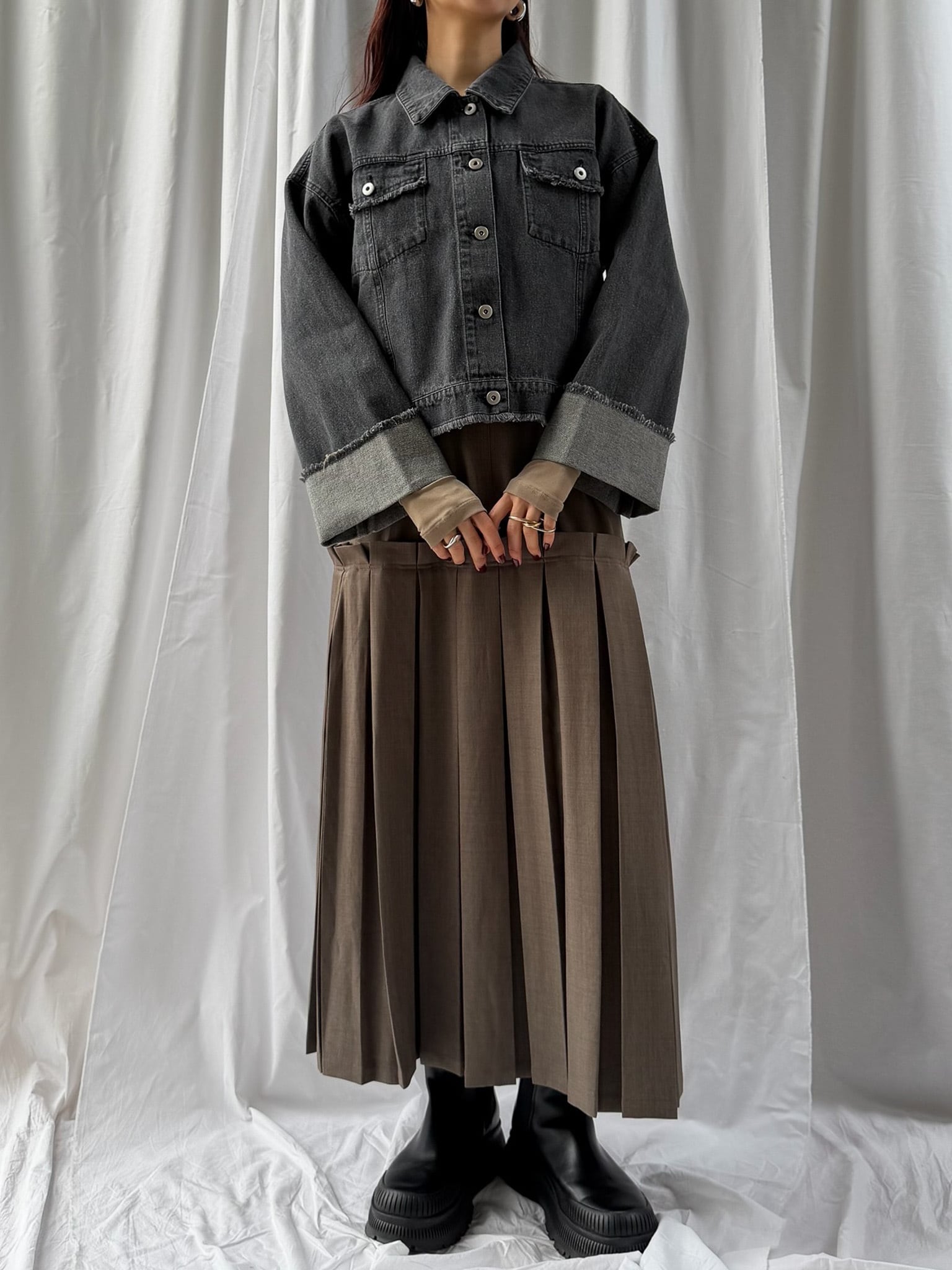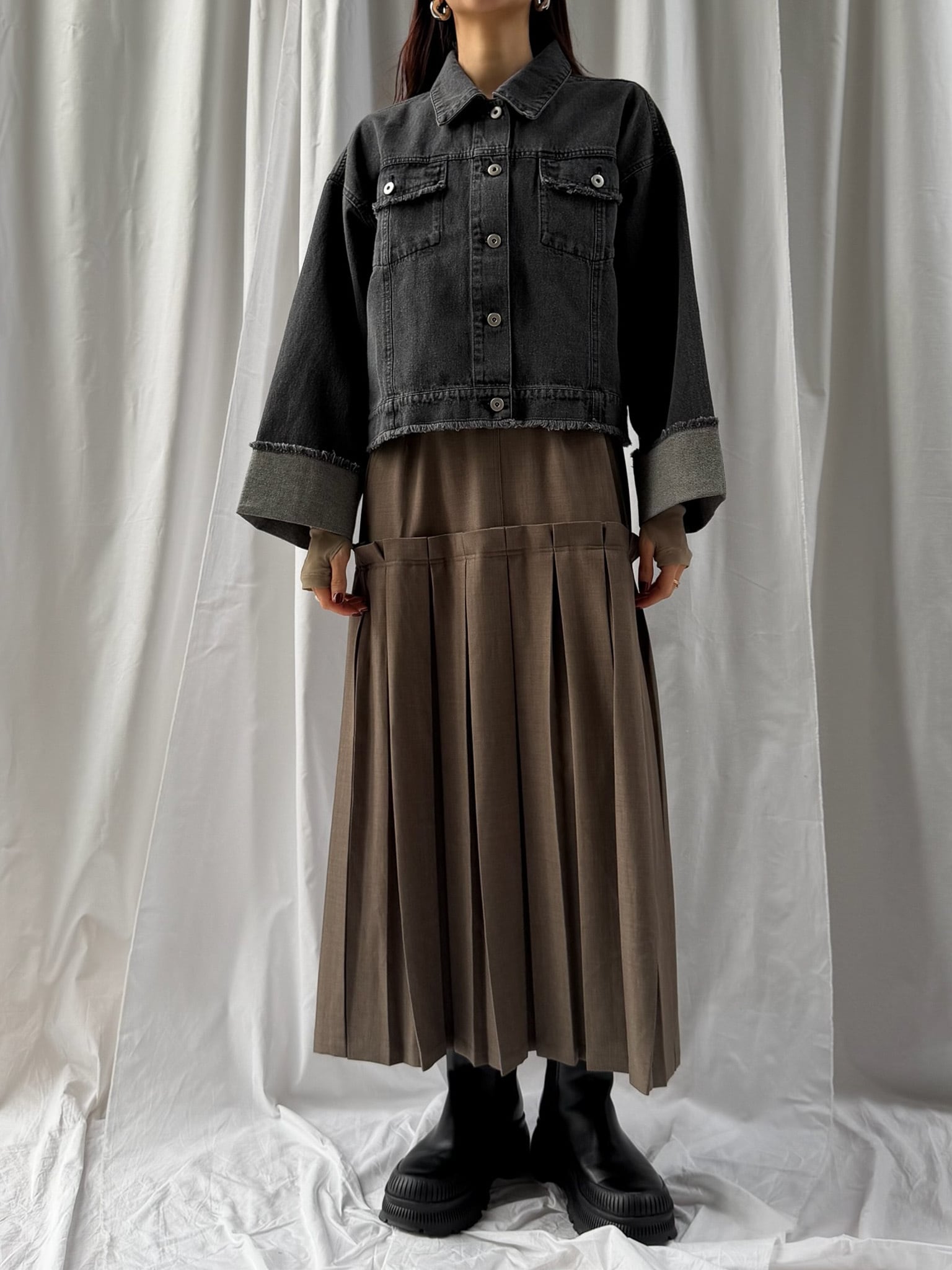 PATCHWORK REMAKE DENIM SKIRT(パッチワークリメイクデニムスカート)【5613037】、FRINGED DENIM JUMPER SKIRT(スソフリンジジャンスカ)【5613027】との相性がよく、セットアップでのスタイリングがおすすめです。綺麗めにパンツと合わせても、ボリュームのあるスカートと合わせても、程よい丈感でスタイルアップさせてくれます。