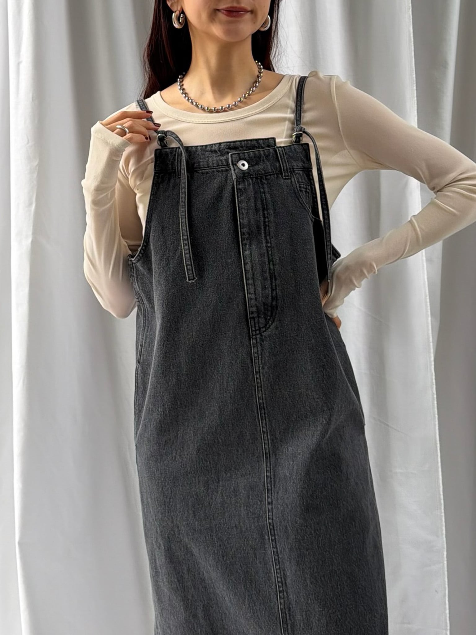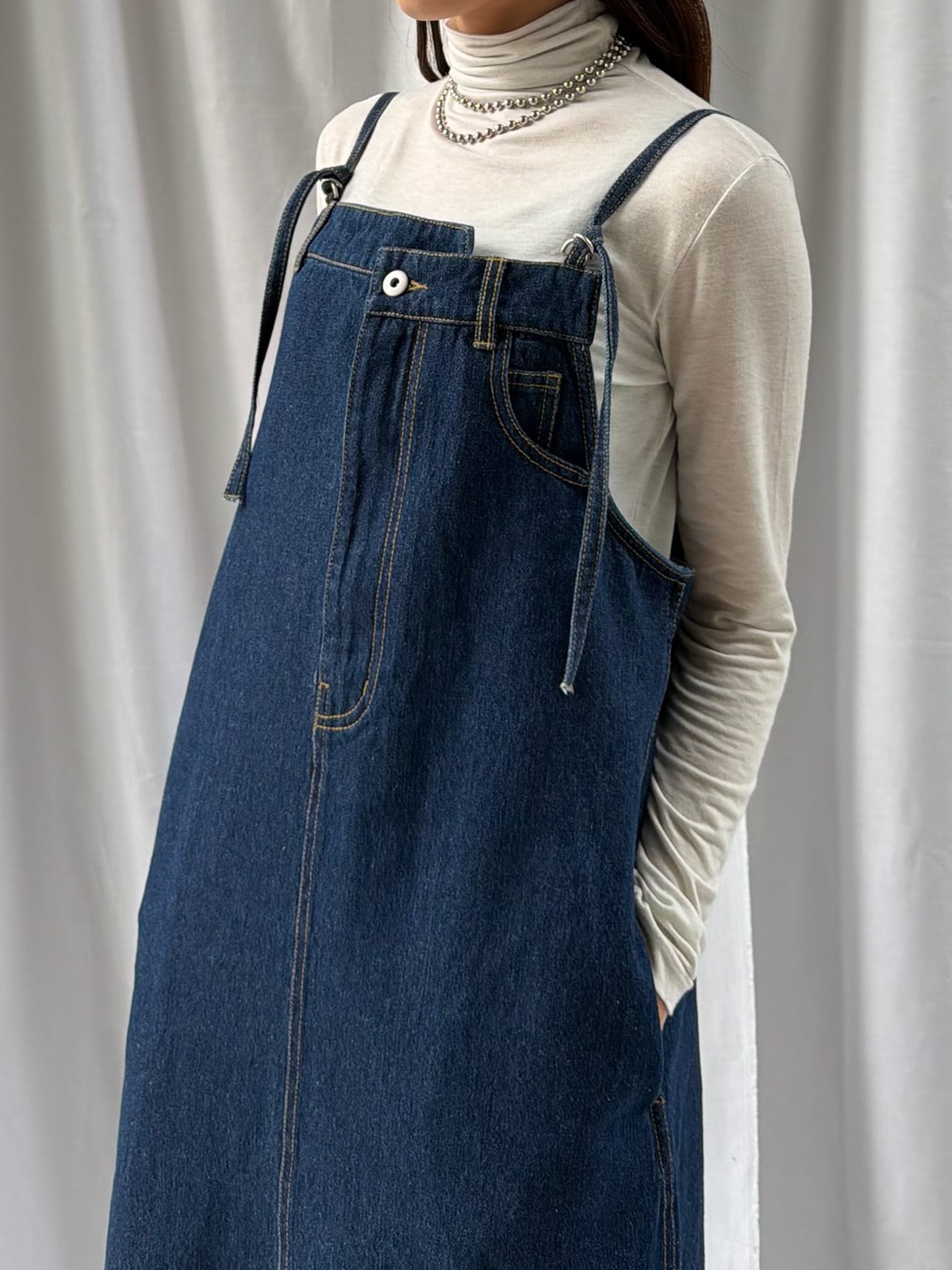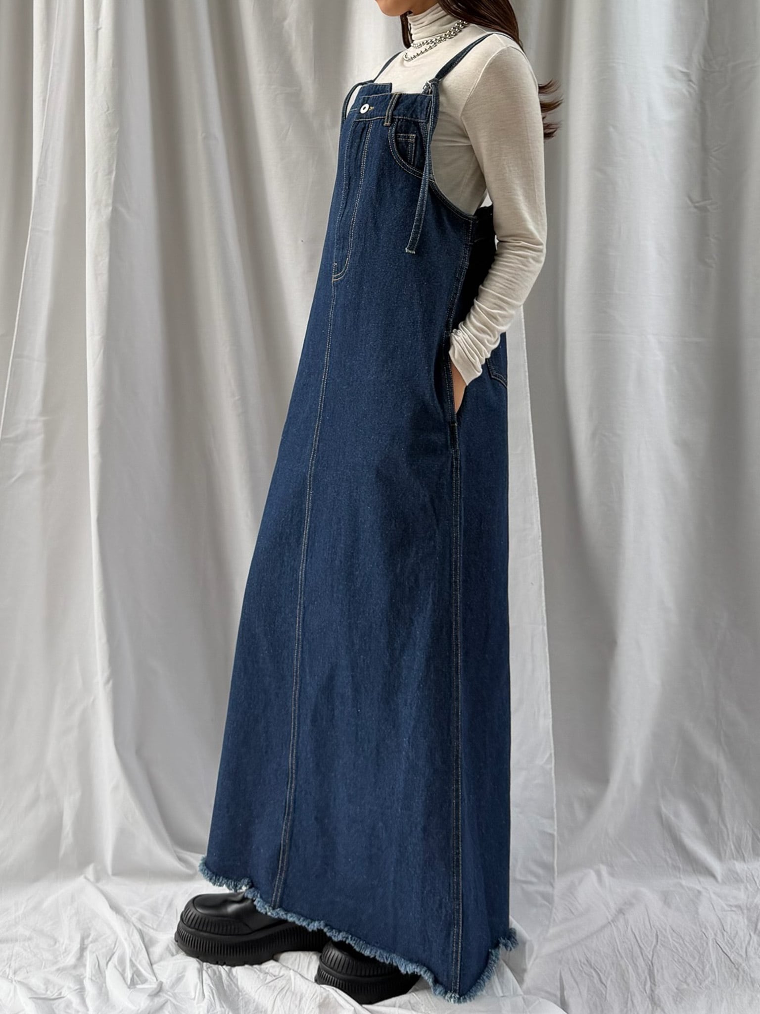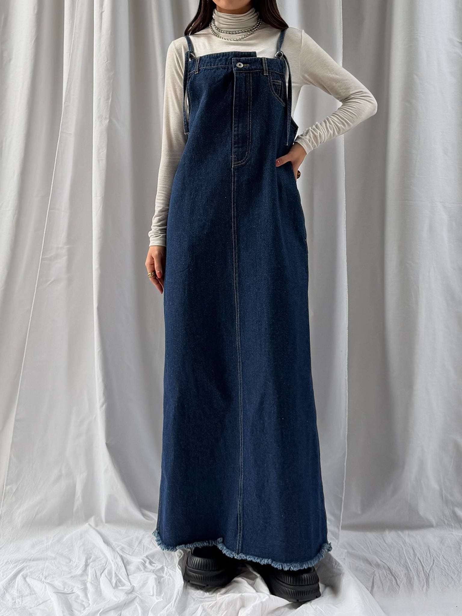 Iラインで大人な雰囲気のデニムワンピース。フロントのラップデザインと、裾のフリンジがアクセントの効いた一枚です。体のラインを拾いすぎないシルエットで、カジュアルなデニム素材でも上品に着られます。肩紐でお好みの長さに、後のボタンの留め位置で身幅の調整が可能◎ インナーを変えることでオールシーズン着用できるのも嬉しいポイントです。