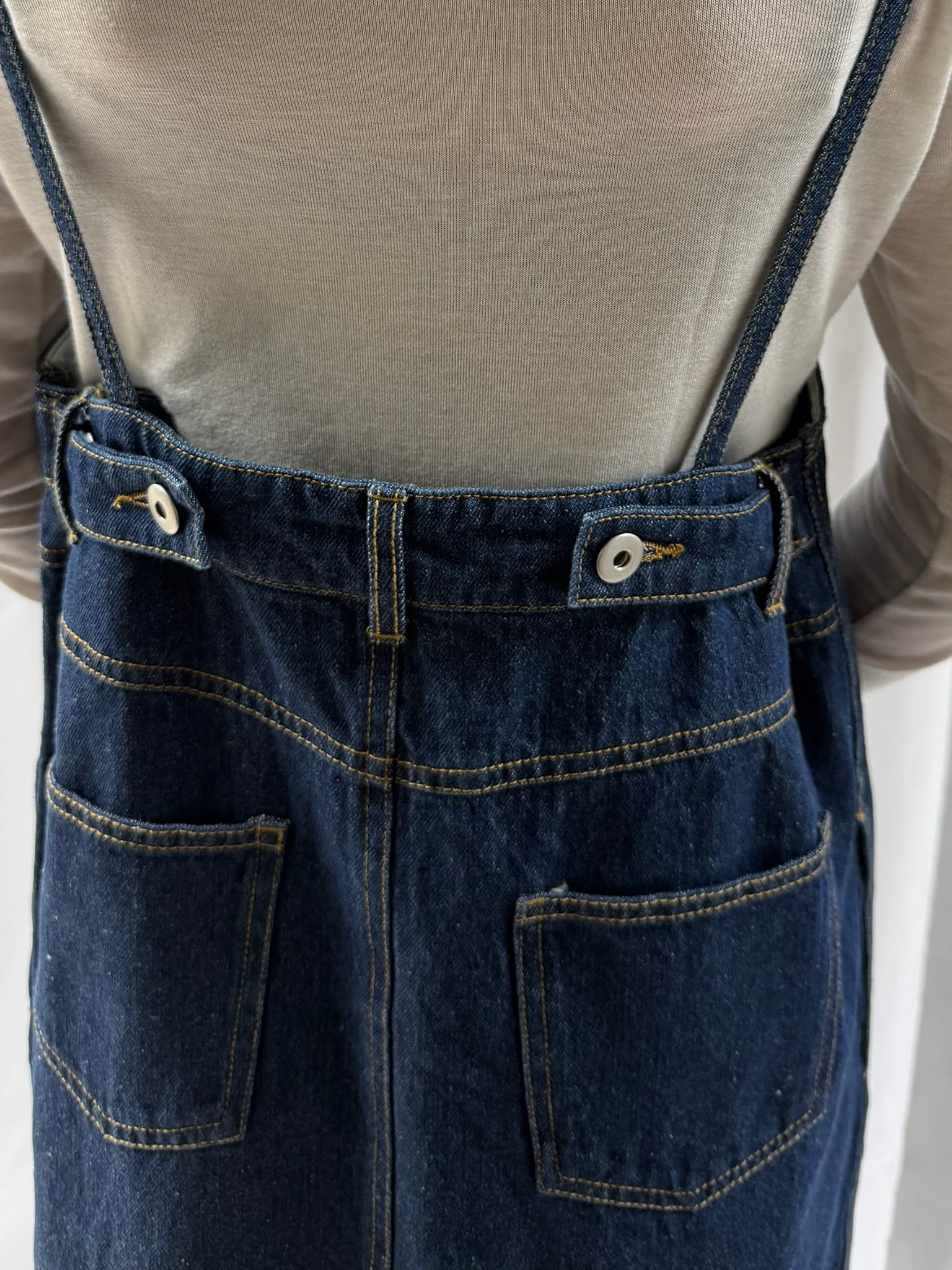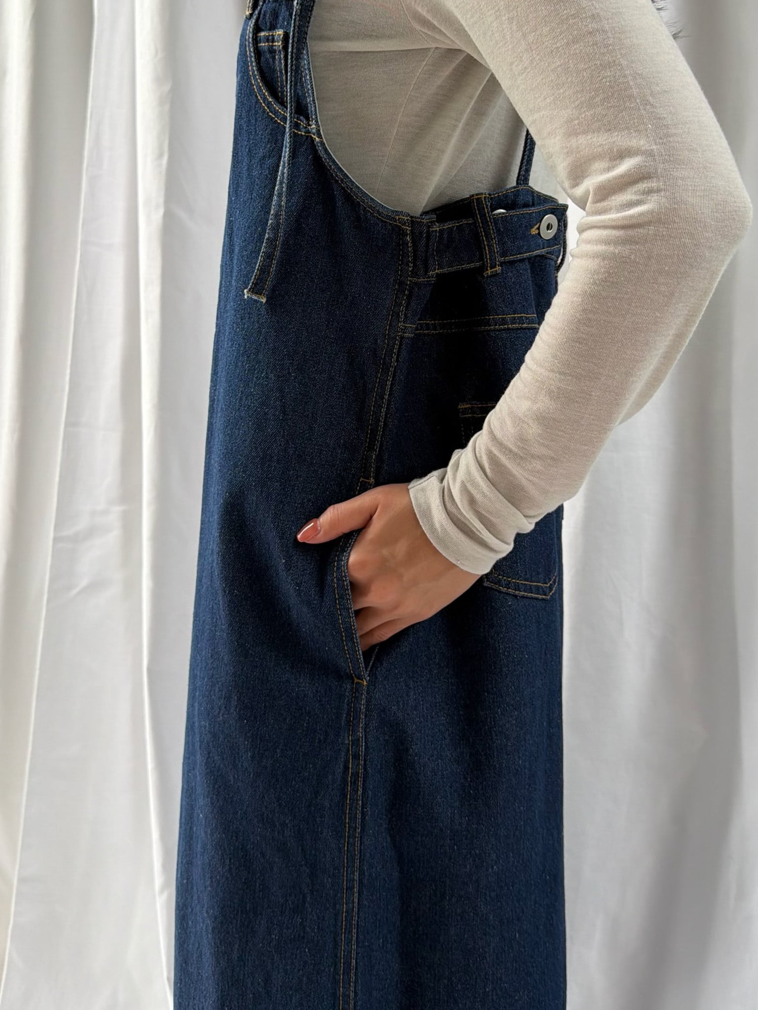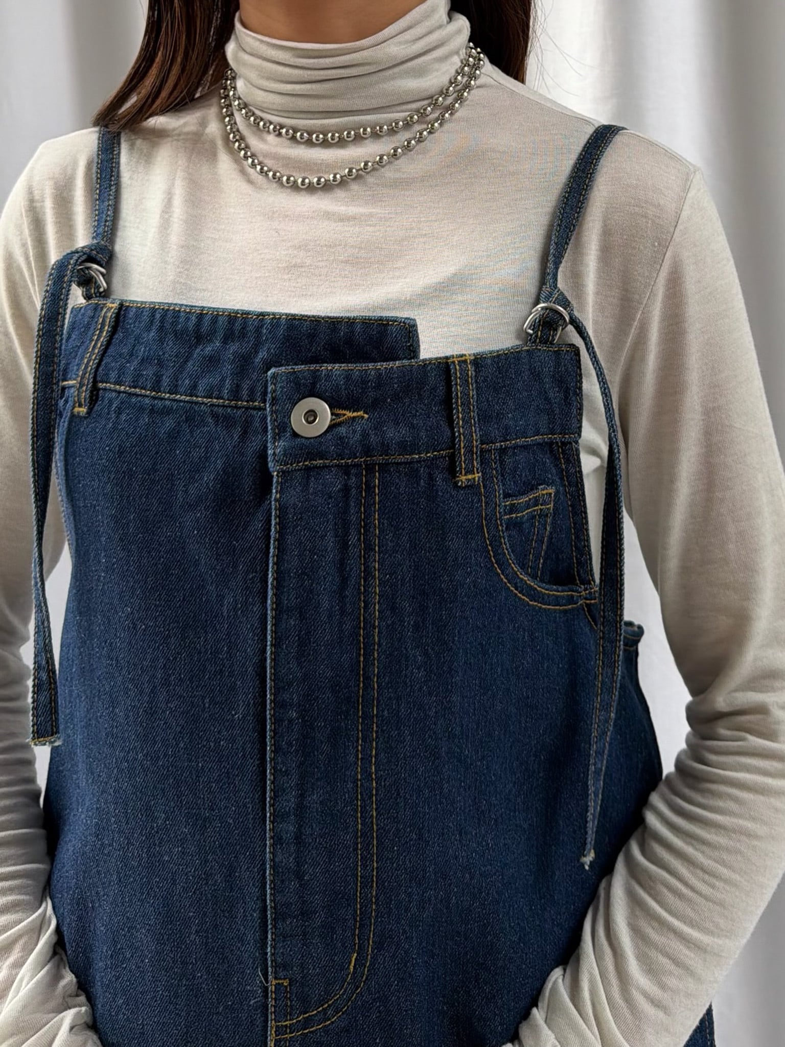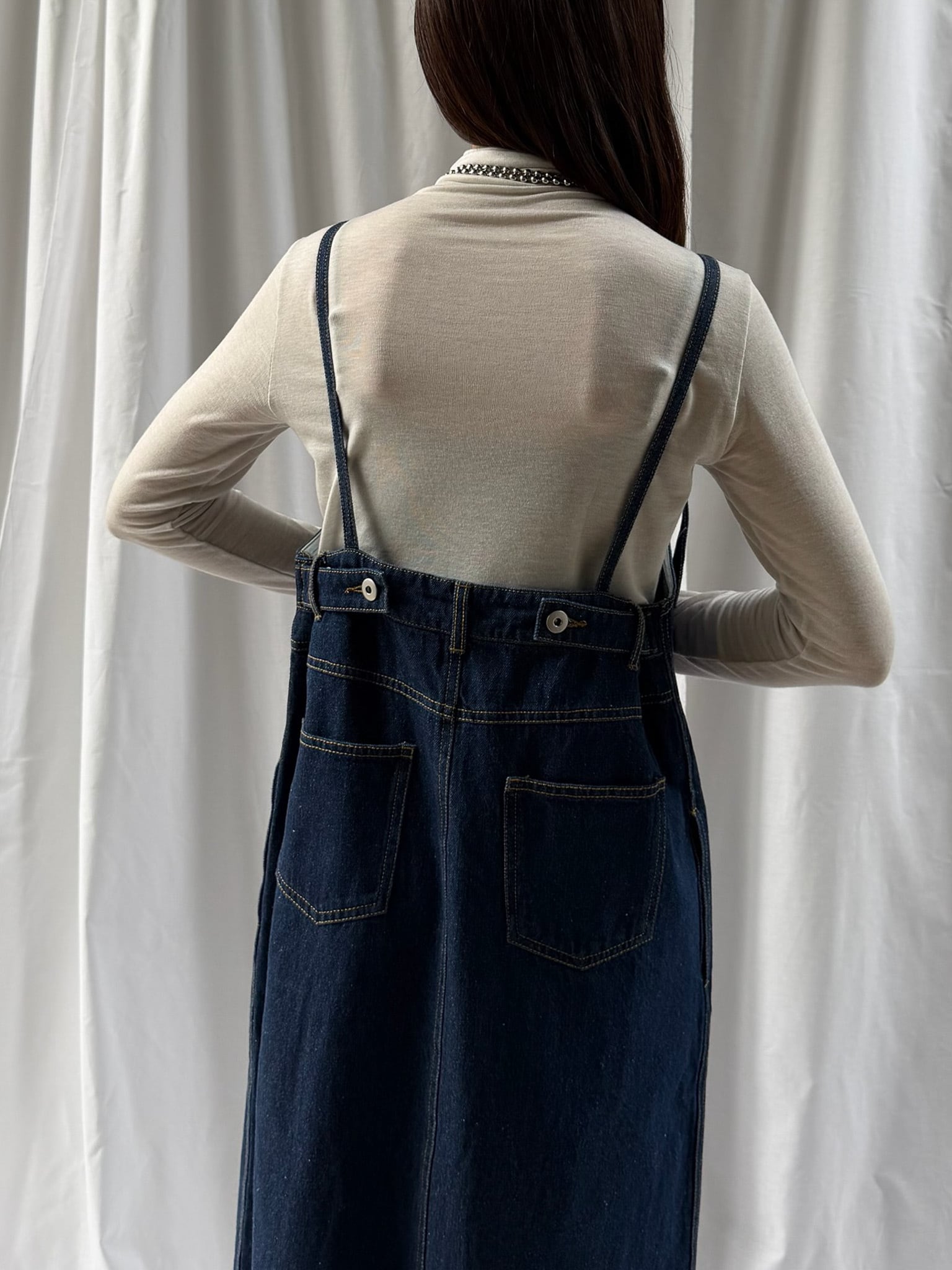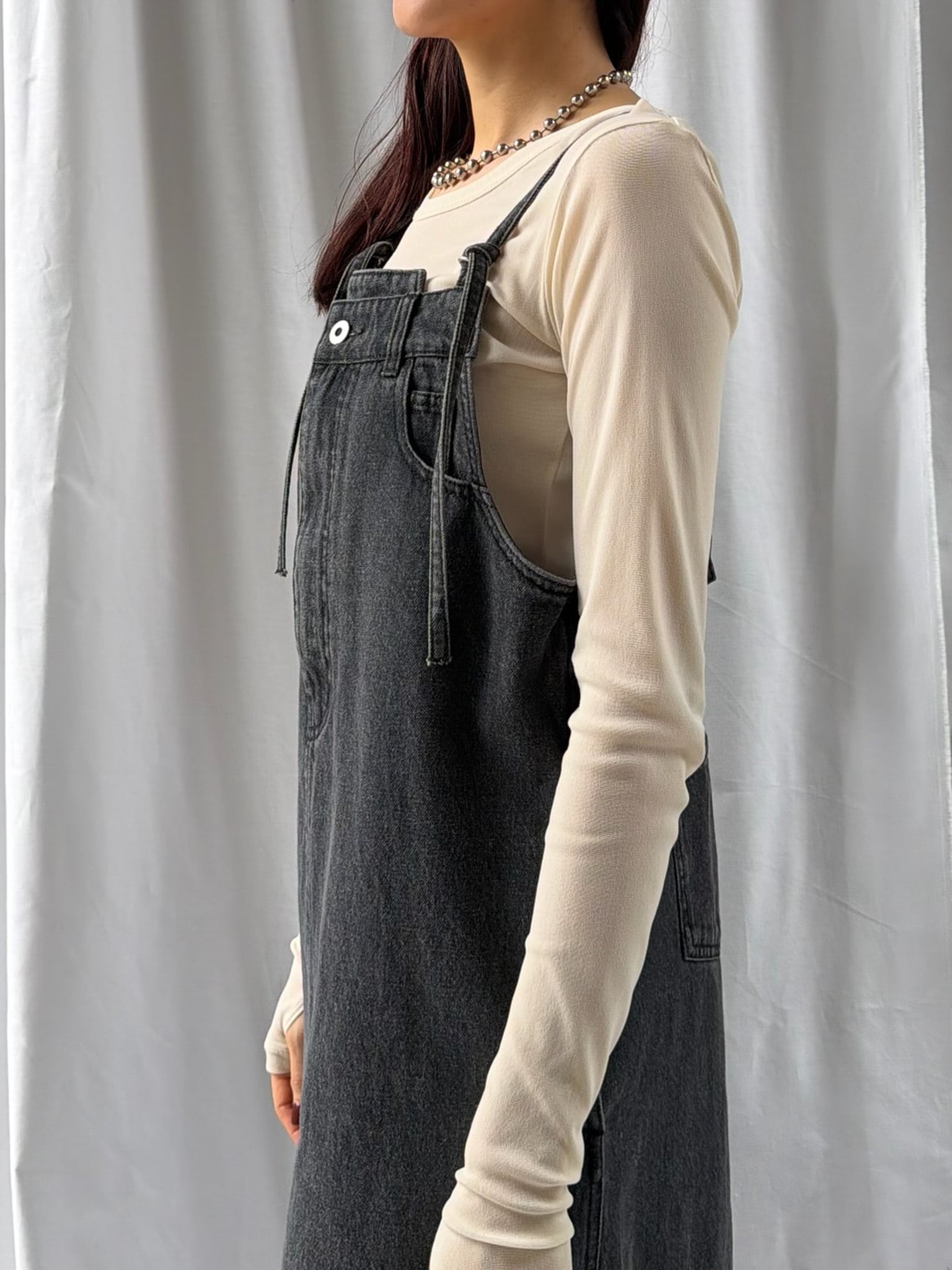 Iラインで大人な雰囲気のデニムワンピース。フロントのラップデザインと、裾のフリンジがアクセントの効いた一枚です。体のラインを拾いすぎないシルエットで、カジュアルなデニム素材でも上品に着られます。肩紐でお好みの長さに、後のボタンの留め位置で身幅の調整が可能◎ インナーを変えることでオールシーズン着用できるのも嬉しいポイントです。