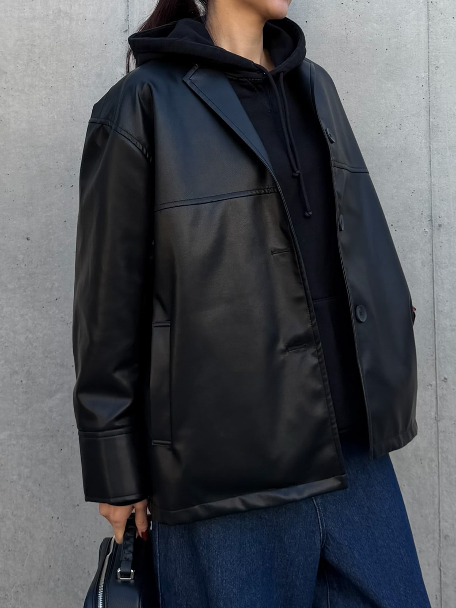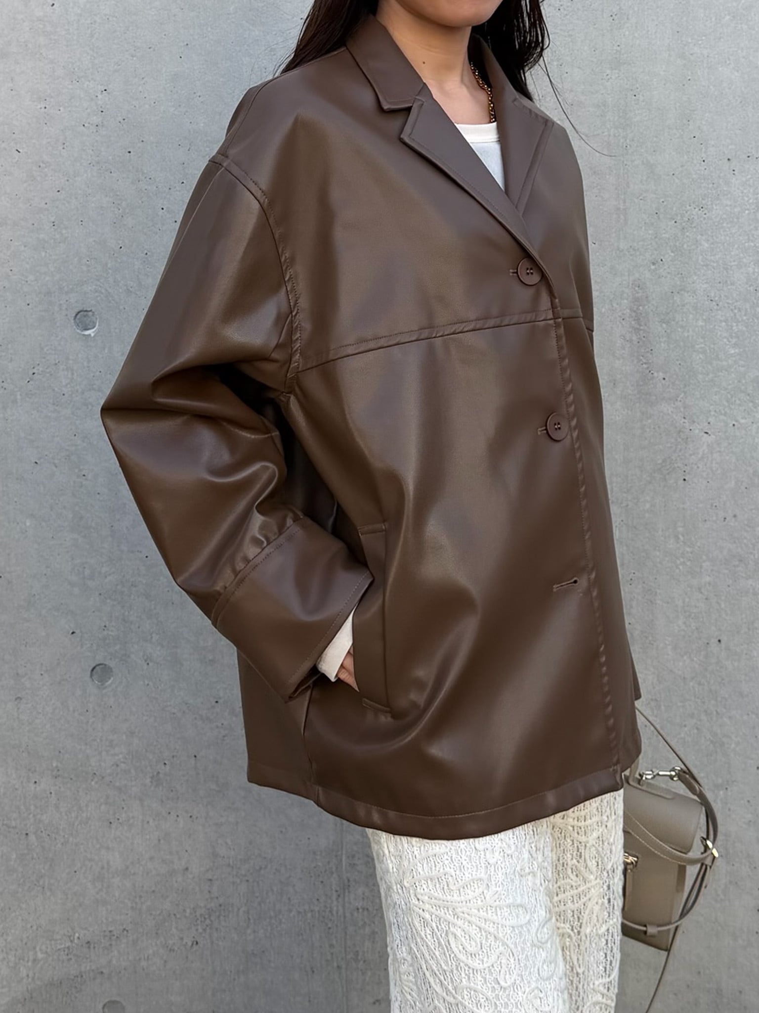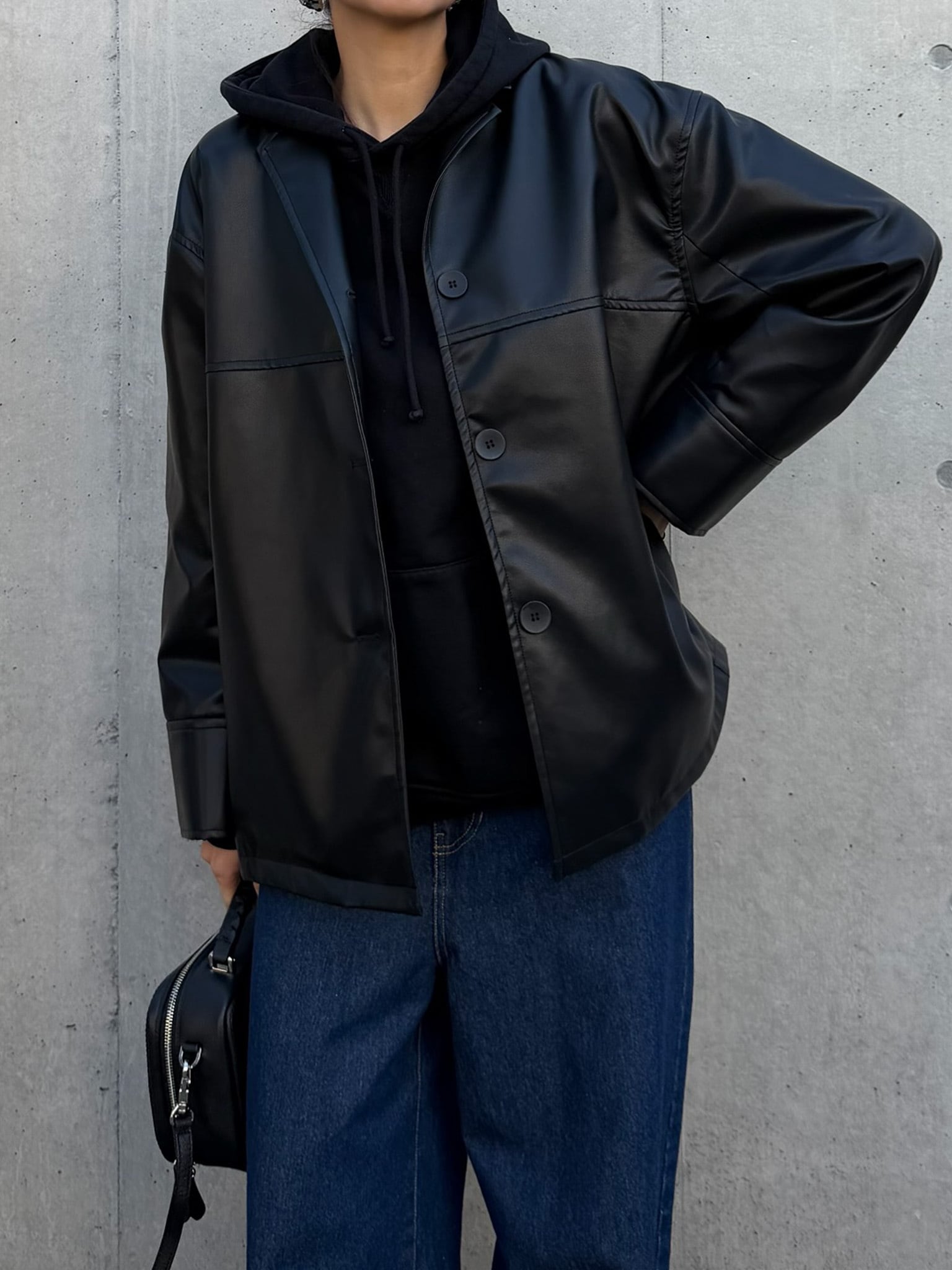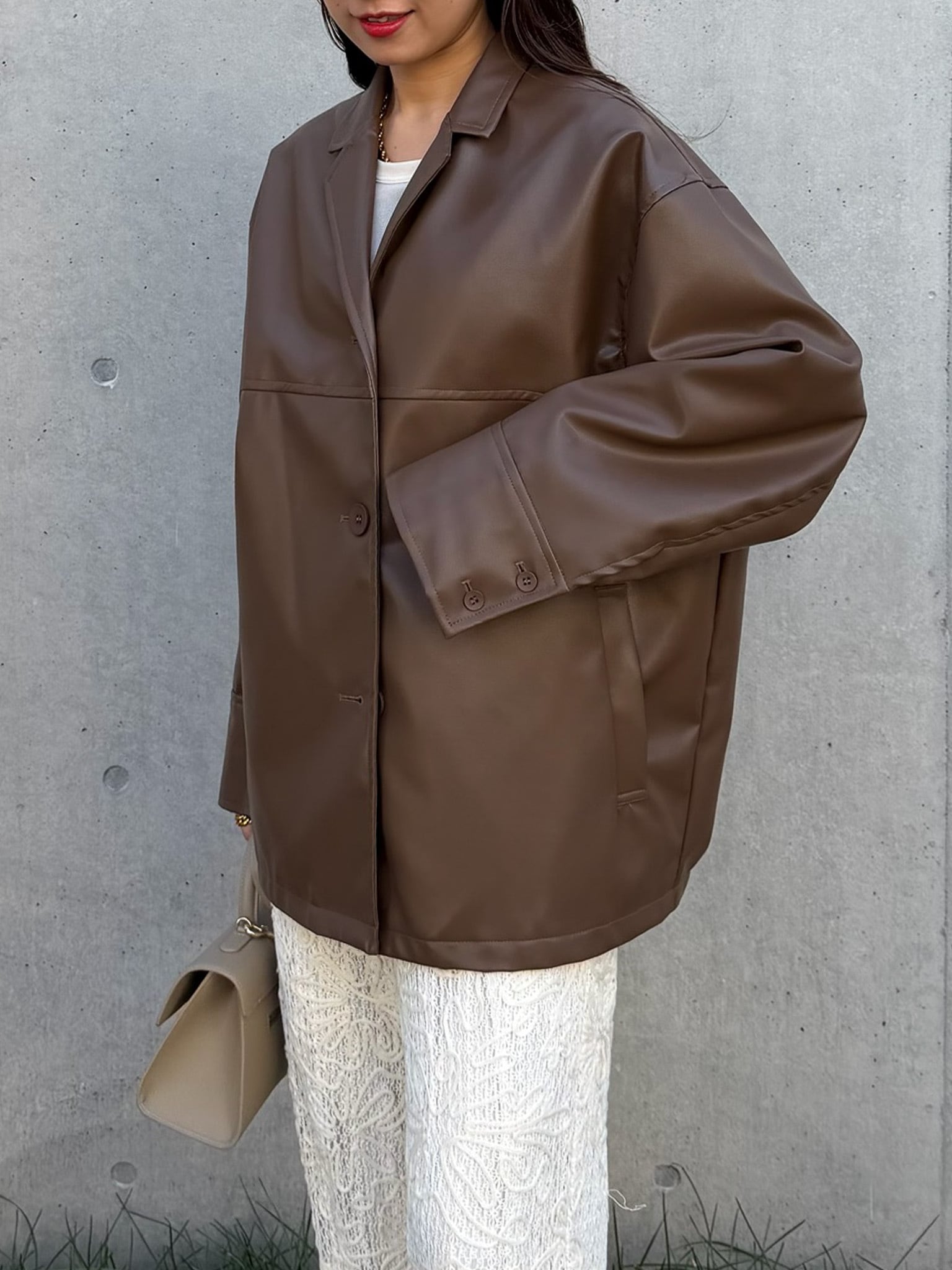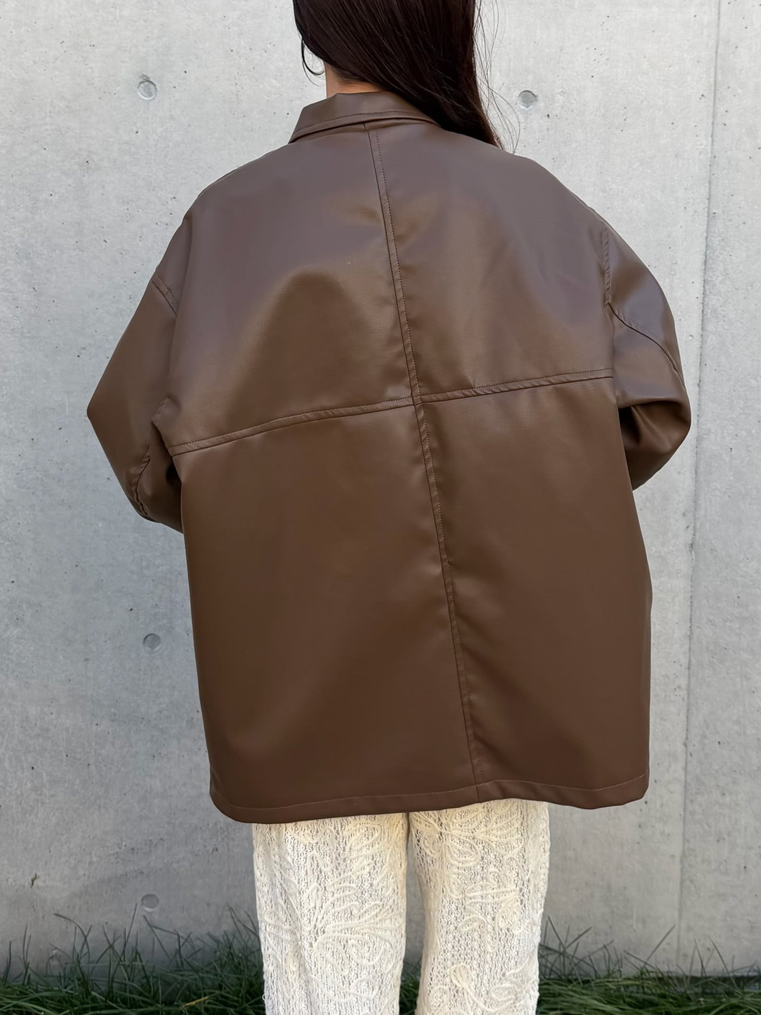 高級感のあるフェイクレザー素材を使用。柔らかくゆったりとしたシルエットで、軽やかな着心地を実現しました。シャツのようにコンパクトな襟デザインが、ジャケット特有の堅苦しさを抑え、デイリーに気軽に羽織れる一着です。
