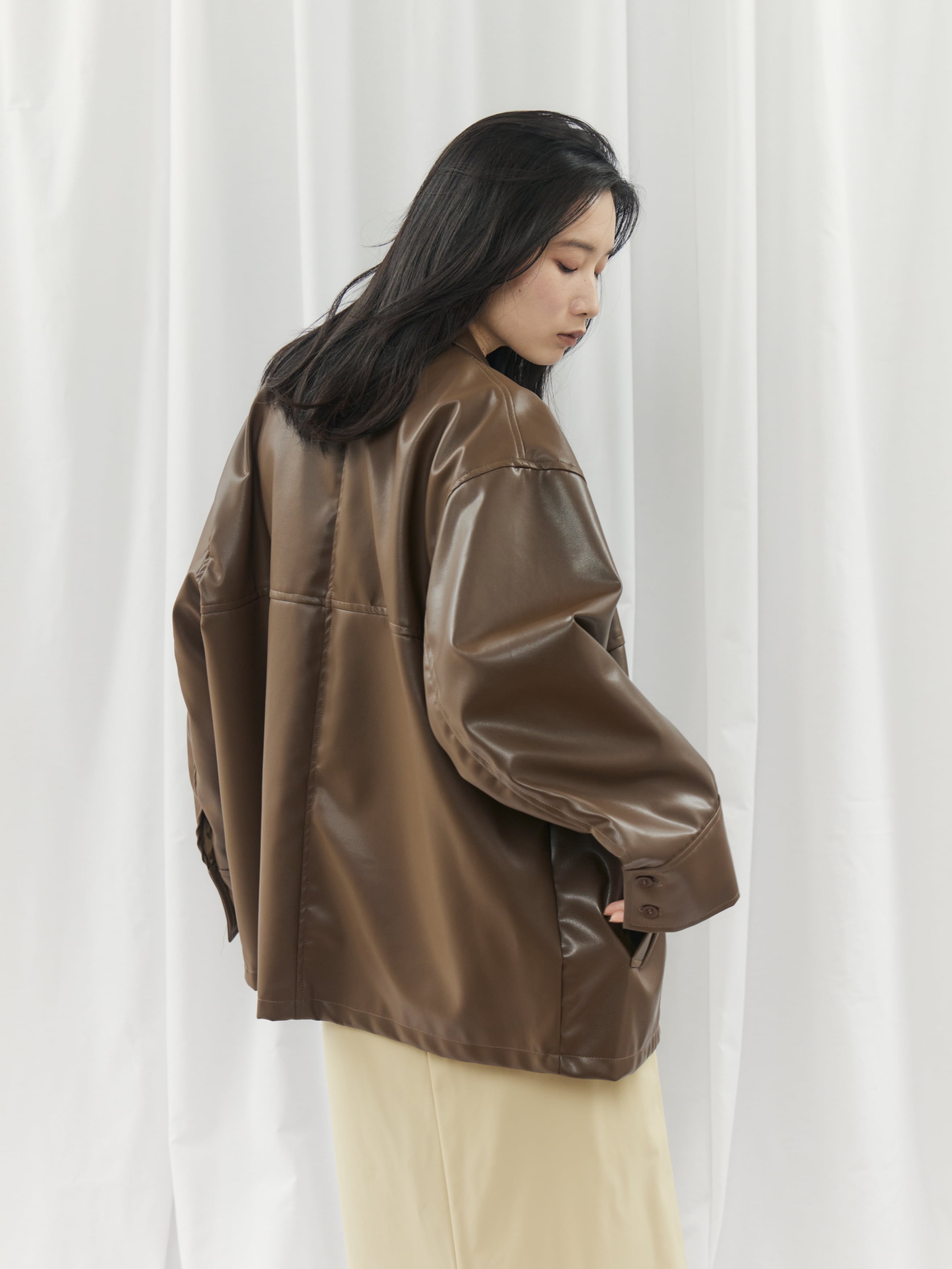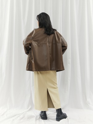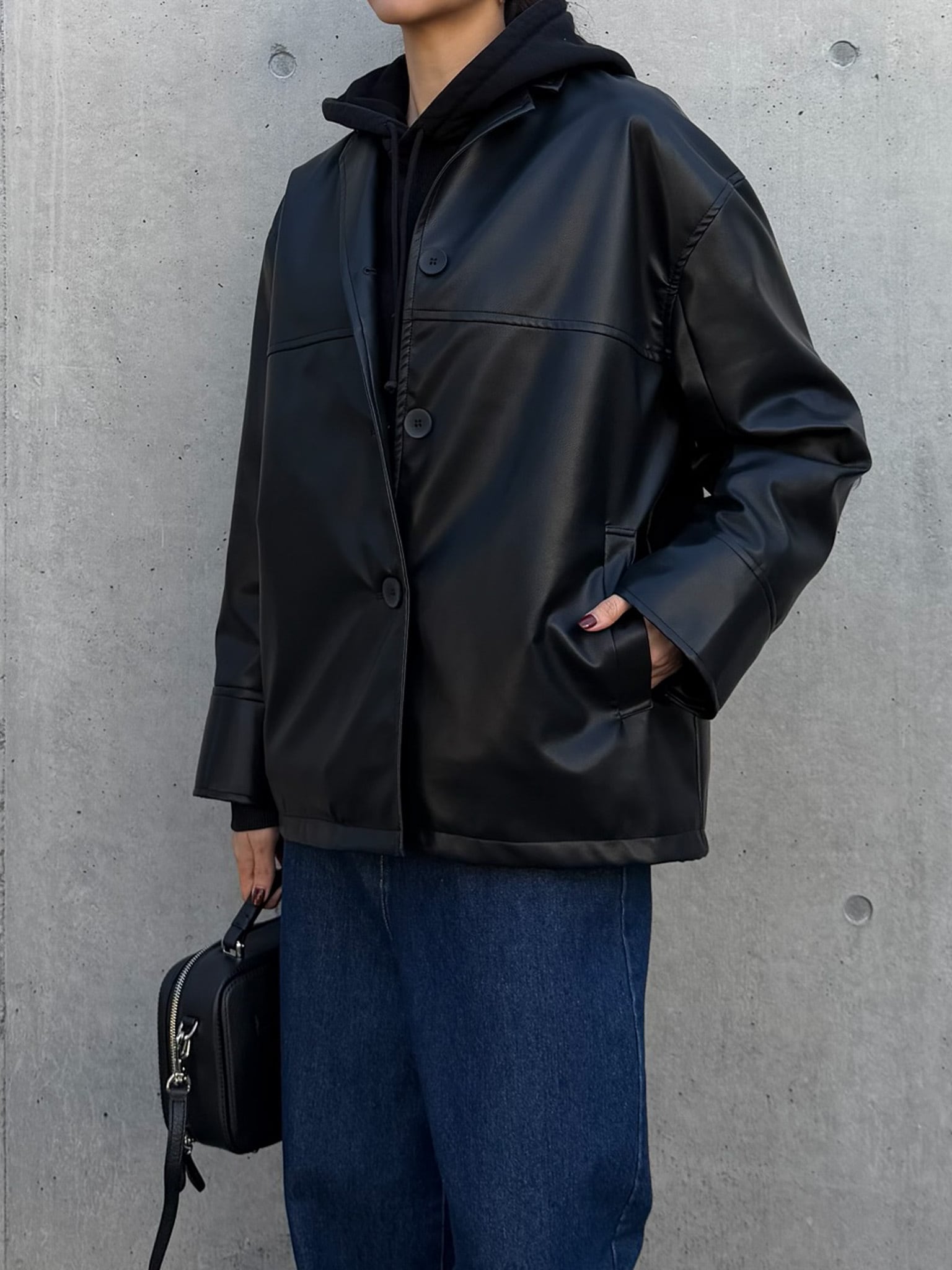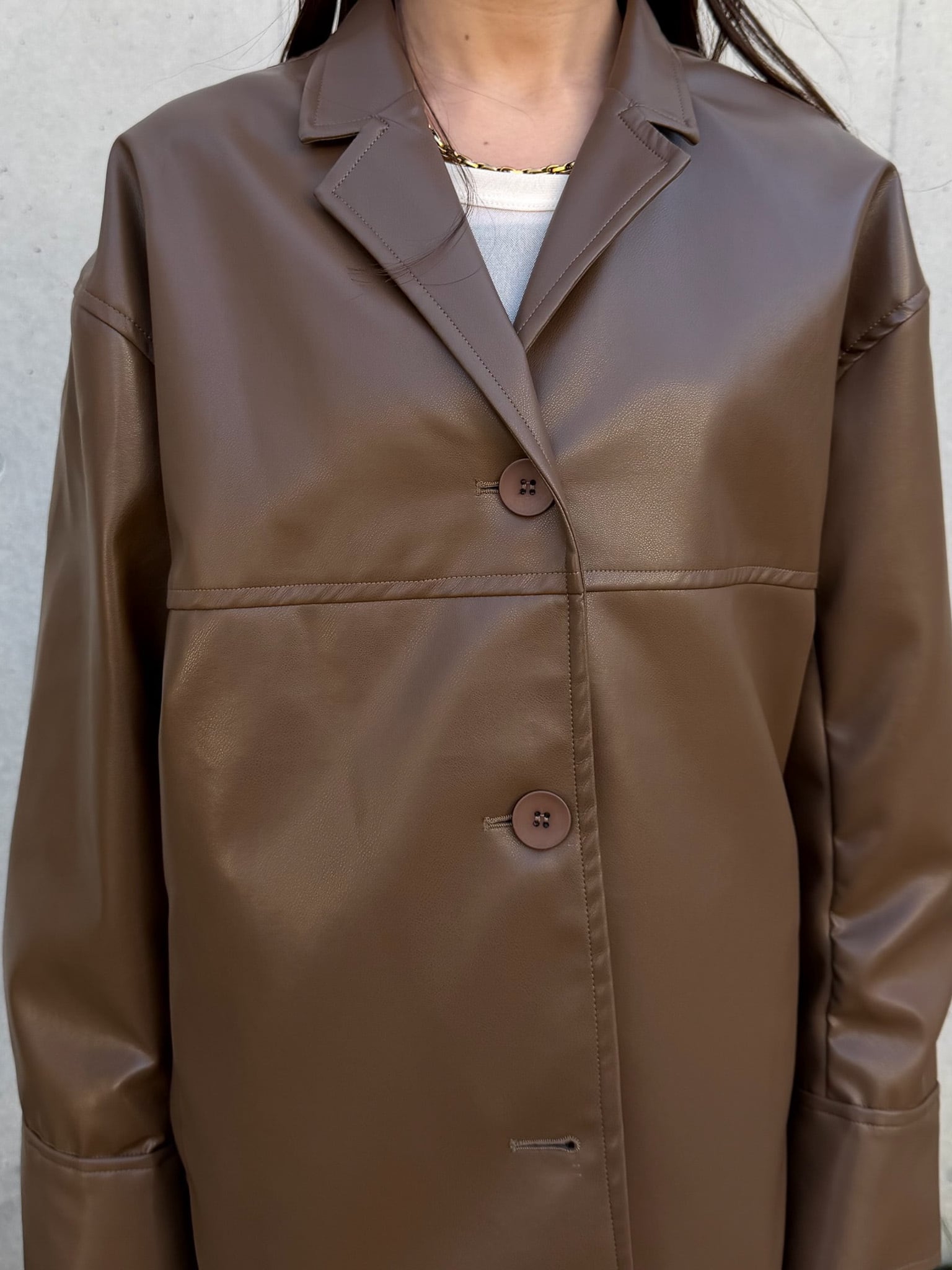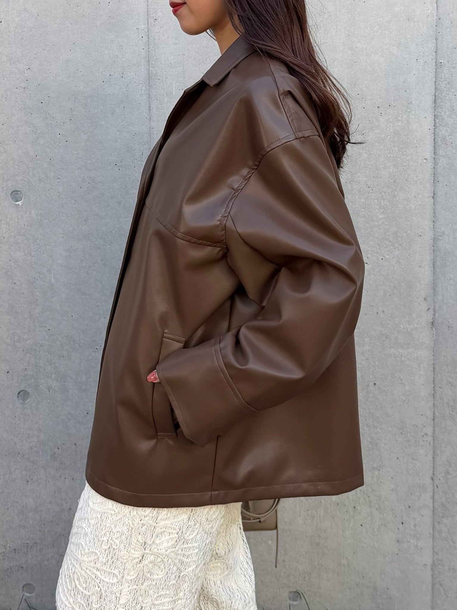 高級感のあるフェイクレザー素材を使用。柔らかくゆったりとしたシルエットで、軽やかな着心地を実現しました。シャツのようにコンパクトな襟デザインが、ジャケット特有の堅苦しさを抑え、デイリーに気軽に羽織れる一着です。