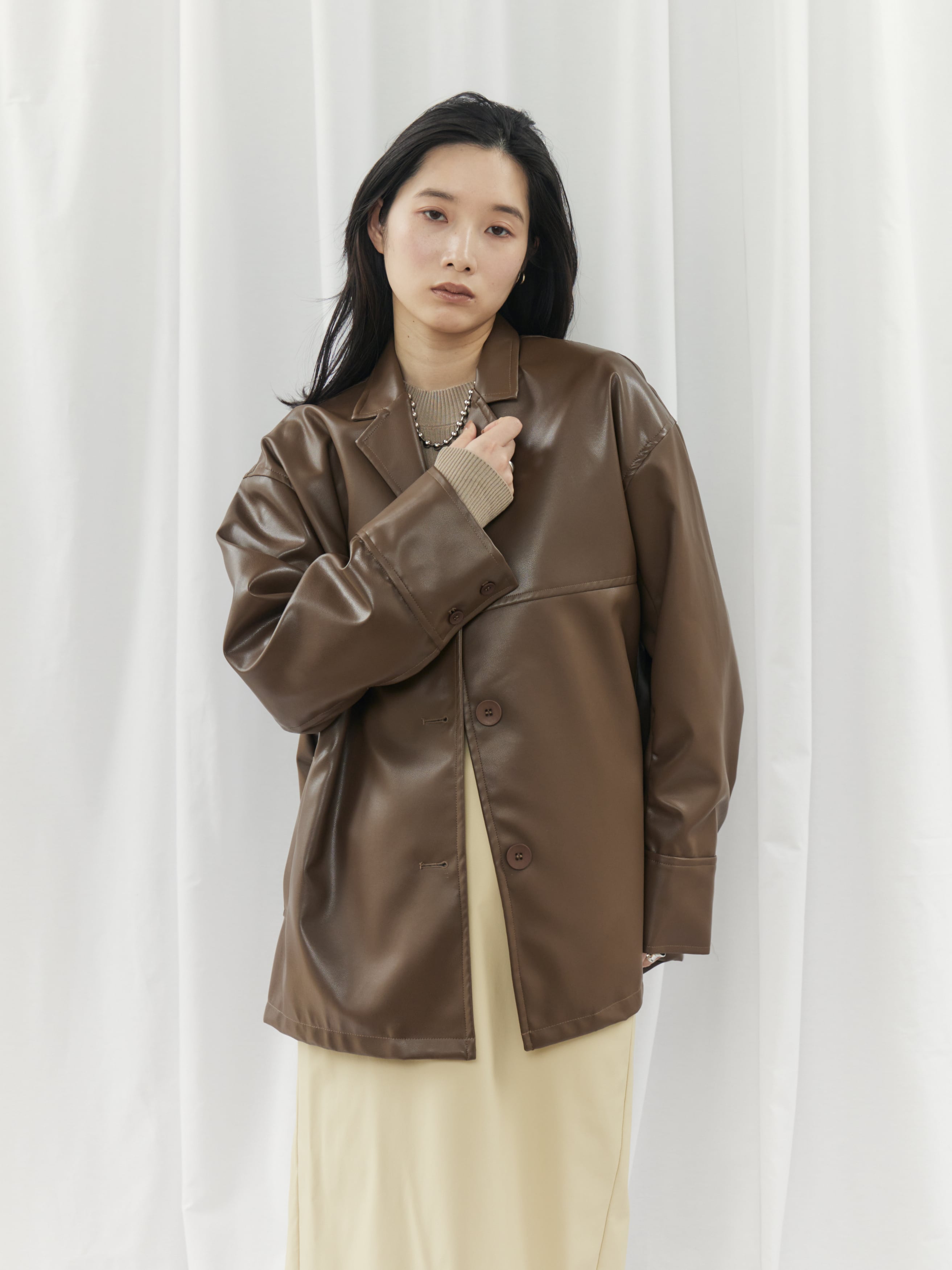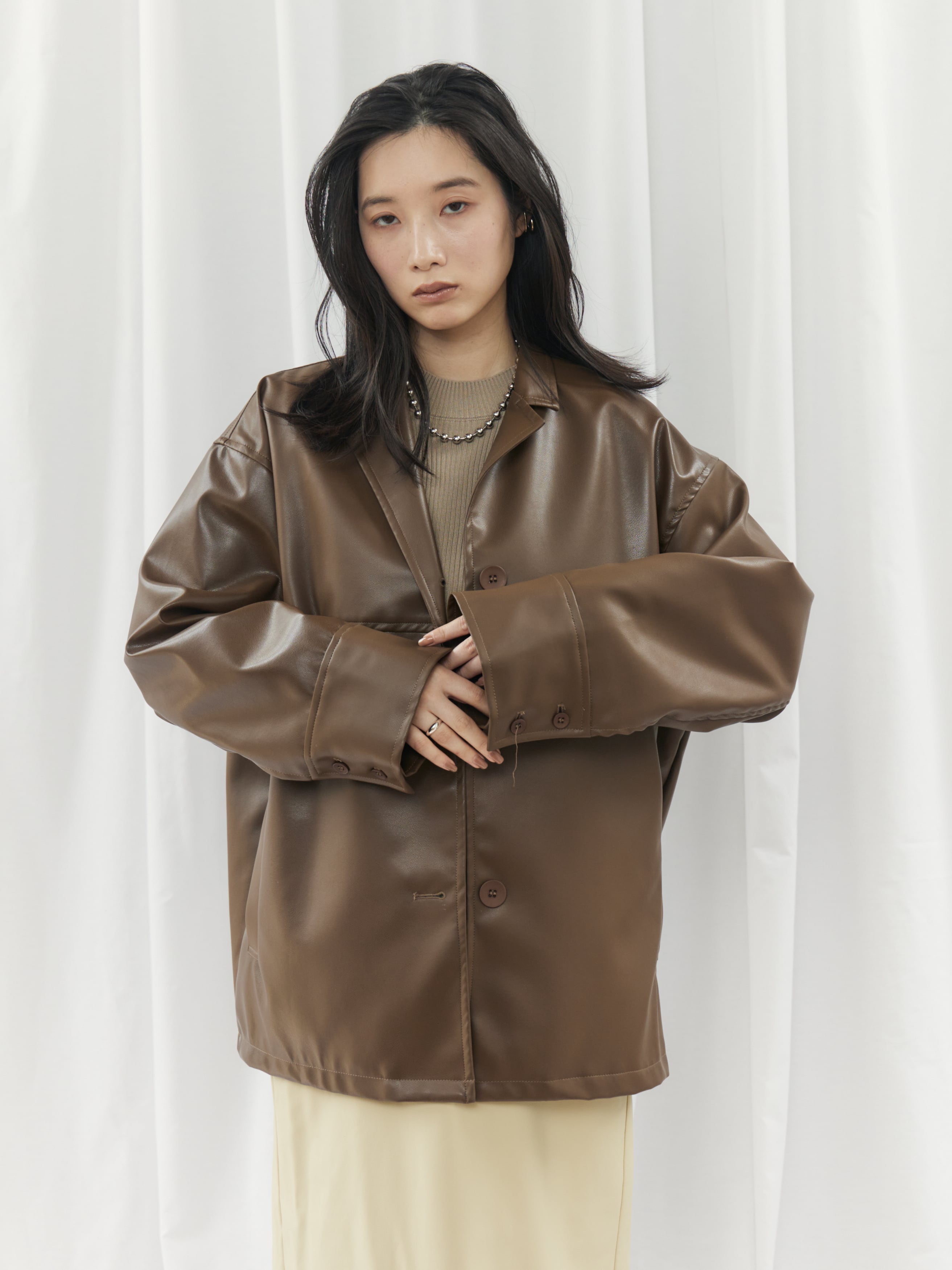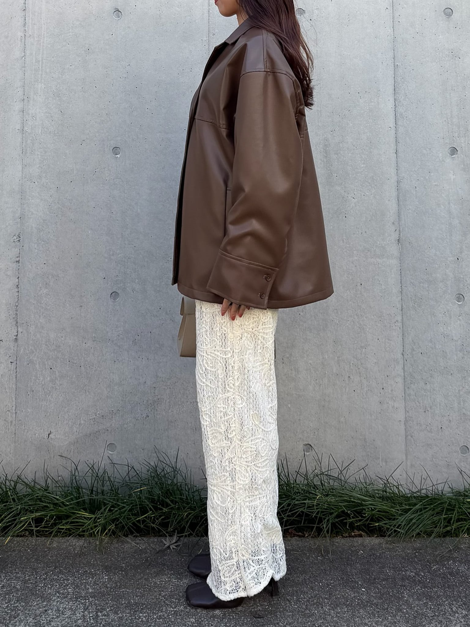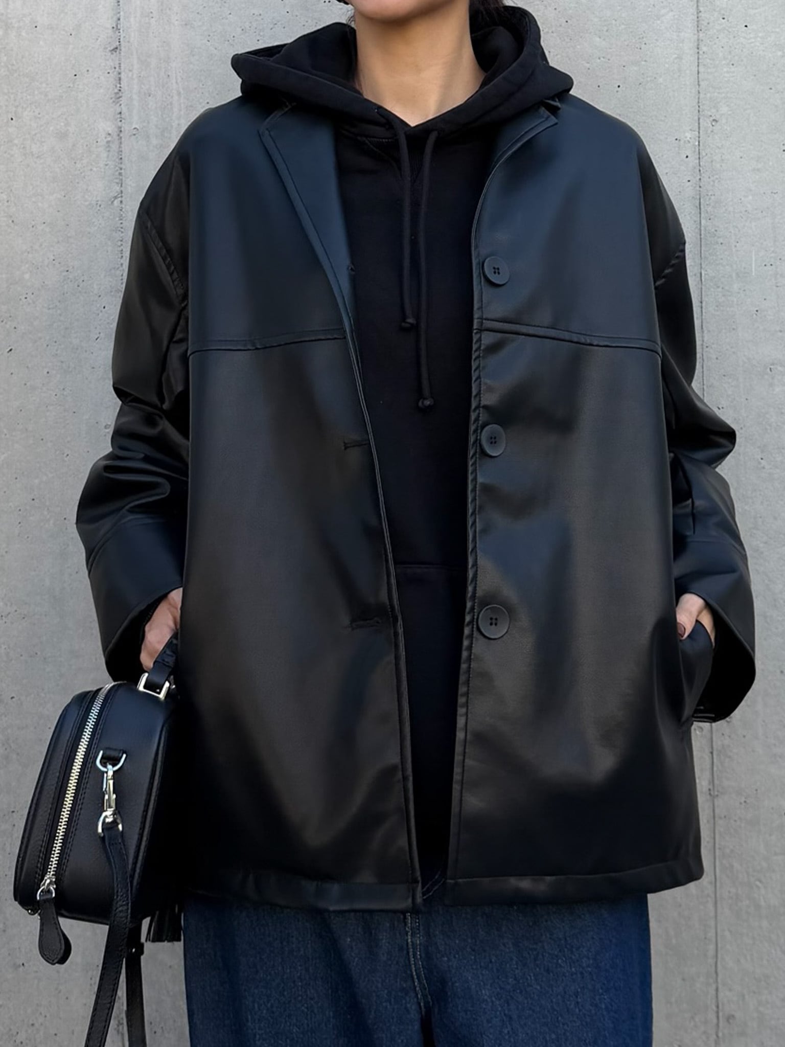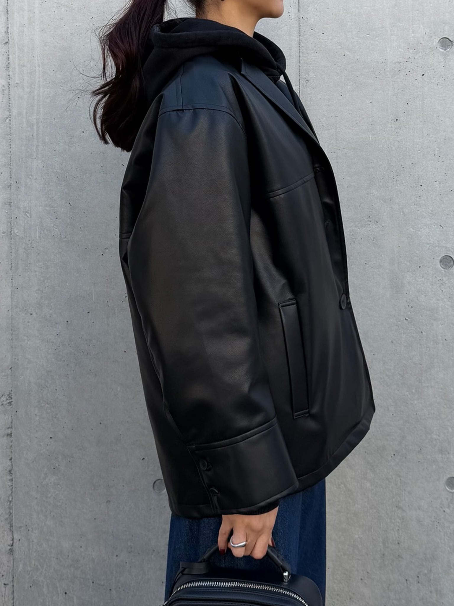 高級感のあるフェイクレザー素材を使用。柔らかくゆったりとしたシルエットで、軽やかな着心地を実現しました。シャツのようにコンパクトな襟デザインが、ジャケット特有の堅苦しさを抑え、デイリーに気軽に羽織れる一着です。
